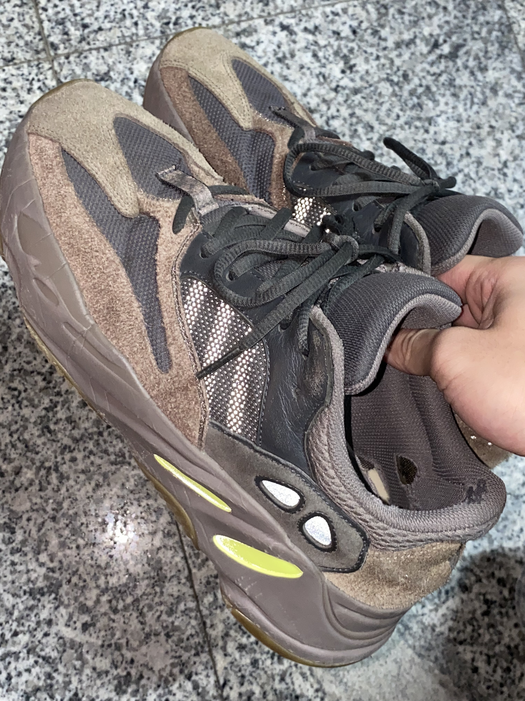 真的很喜欢yeezy700这个鞋型,感觉椰子出的每一款鞋有很有特点🤩喜欢的人很喜欢,不喜欢的看都不看一眼.虽然初代的白灰配色也很好看,但是我还是更喜欢低饱和一点的颜色,所以就买了紫薯色. 鞋子的外观很新奇,鞋底的这个两个绿色的反光洞洞就是一个很亮眼的小点缀.鞋底挺高的,穿上都快190了🤤 整体穿起来很舒适,而且特别好搭配,尺码我选的是正常码,个人感觉没必要买大一码.内衬是一个很头疼的问题,我的这...