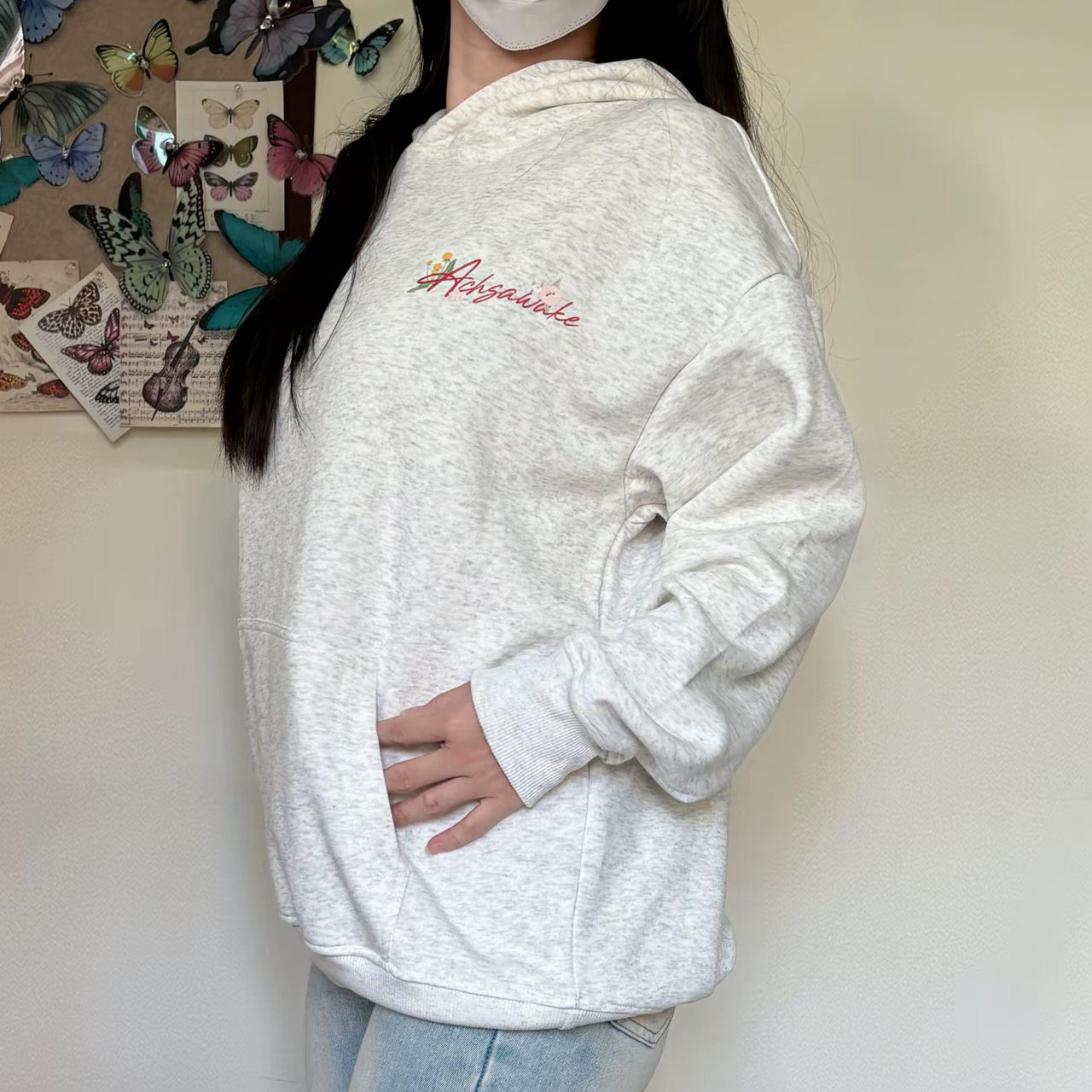 不得不说我对卫衣就没有不下手的DACHS AWAKE 白花灰连帽卫衣搭配牛仔裤,简约休闲,搭配短裙可爱甜妹~ 加绒冬天内搭秋衣外搭棉服也可以轻松过冬!,宽松版型简约又减龄!印花复古又百搭加绒卫衣就是看着冷实际暖系列哈哈😂 图片来源于@怪兽来了
