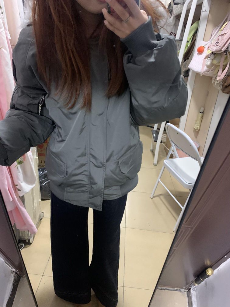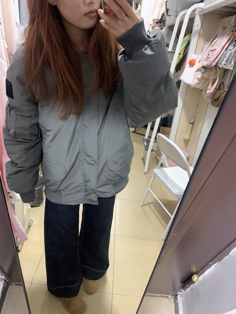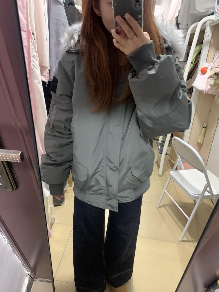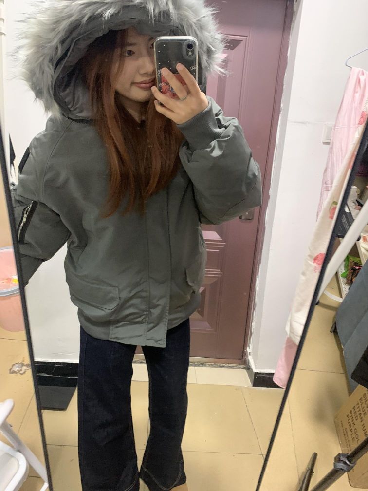 偏灰绿色的工装派克服 很显白 而且很有质感!我觉得很好好看哎 然后室友都说比上一件好看 毛领也挺舒服的 这个颜色也很耐脏!里面穿一件衣服很暖和 !