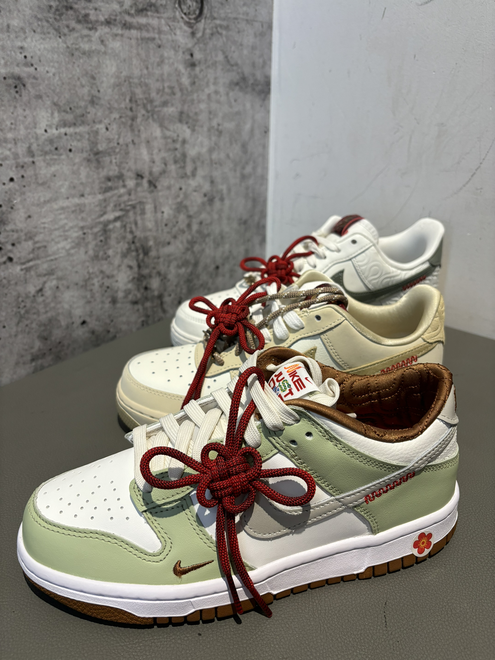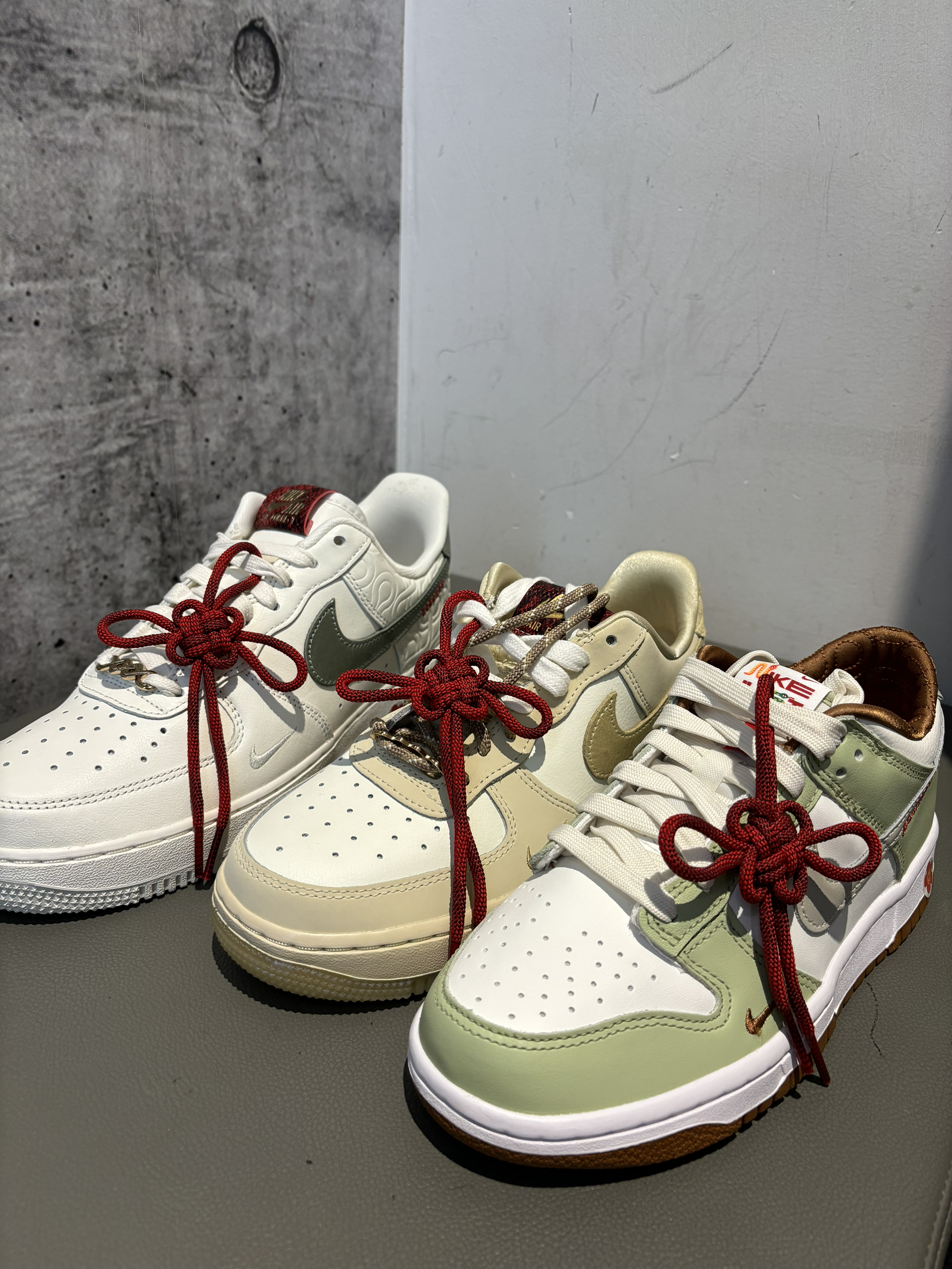 中国结元素拉满的三双耐克板鞋 空军一号两双一双女生,一双男生 当然两个版本属于男生女生都可以穿的 你更喜欢哪个配色? 小青龙还是小黄龙,白龙还是更有实力皮质更好 小麦色空军一号细节没有那么多 dunk还是很清爽,学生党很适合 小姐姐应该喜欢芥末绿色,上脚很轻盈你更喜欢哪个?