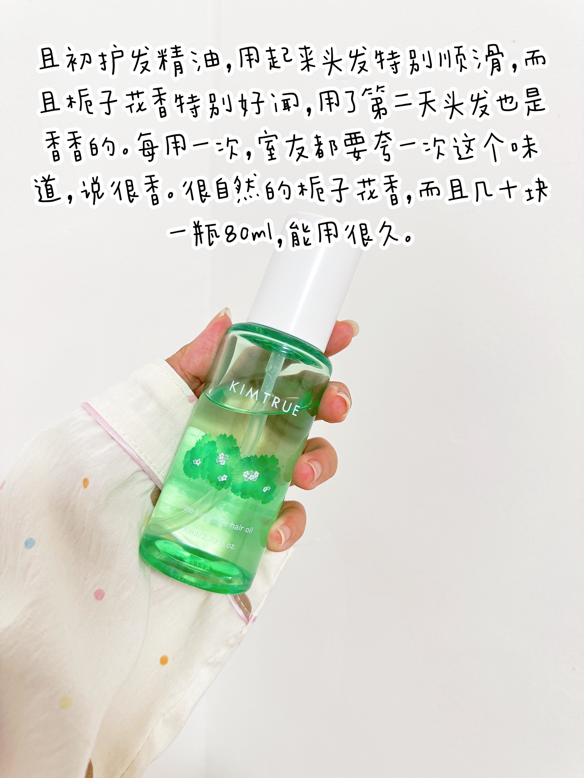 全程🈚️广 本人自用 性价比超高的一款护发精油,一瓶就可以改善毛躁发质,让你的头发细软柔顺。 不油腻,好吸收,使用后可以让头发更加順滑飘逸。 我喜欢绿色瓶得栀子花香,轻盈丝柔,清澈栀子香前调味道有青草绿叶类似的清新香味 中调味道有一种白色小花栀子🌹 后调是一种甜美浓郁的味道有一点点香味还带有点木质调不同寻常的舒适甜美❤️ 除此之外还有其他五种味道,都特别好闻。用了之后一整天头发都是香香的...