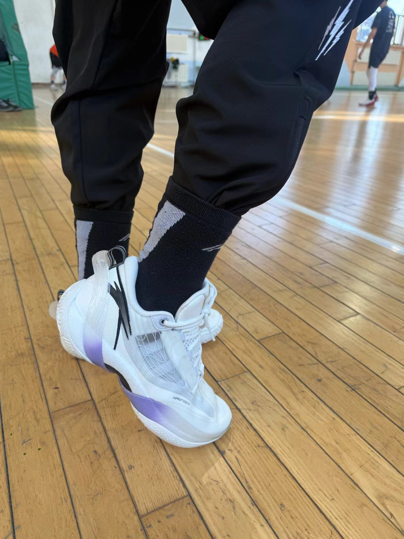 一双鞋对于射手来说最重要的是什么? 我觉得是跑动中的滚动感!可以说安踏三分雨这双鞋场地滚动感方面做的很好,用前后的落差以及鞋前段上翘来找到向前的动力,可以说有点跑鞋的感觉了! 第二个就是它的氮科技中底调教的非常软弹,也有助于射手跑动中鞋子所提供的缓震,让射手跑出位置基本就等于得分了! 在保护性方面,鞋面强度是很够用的,而且鞋楦包裹感很强,脚在里面不会有挤压感,哪怕是宽脚,高脚背也不会有压力。后跟的...