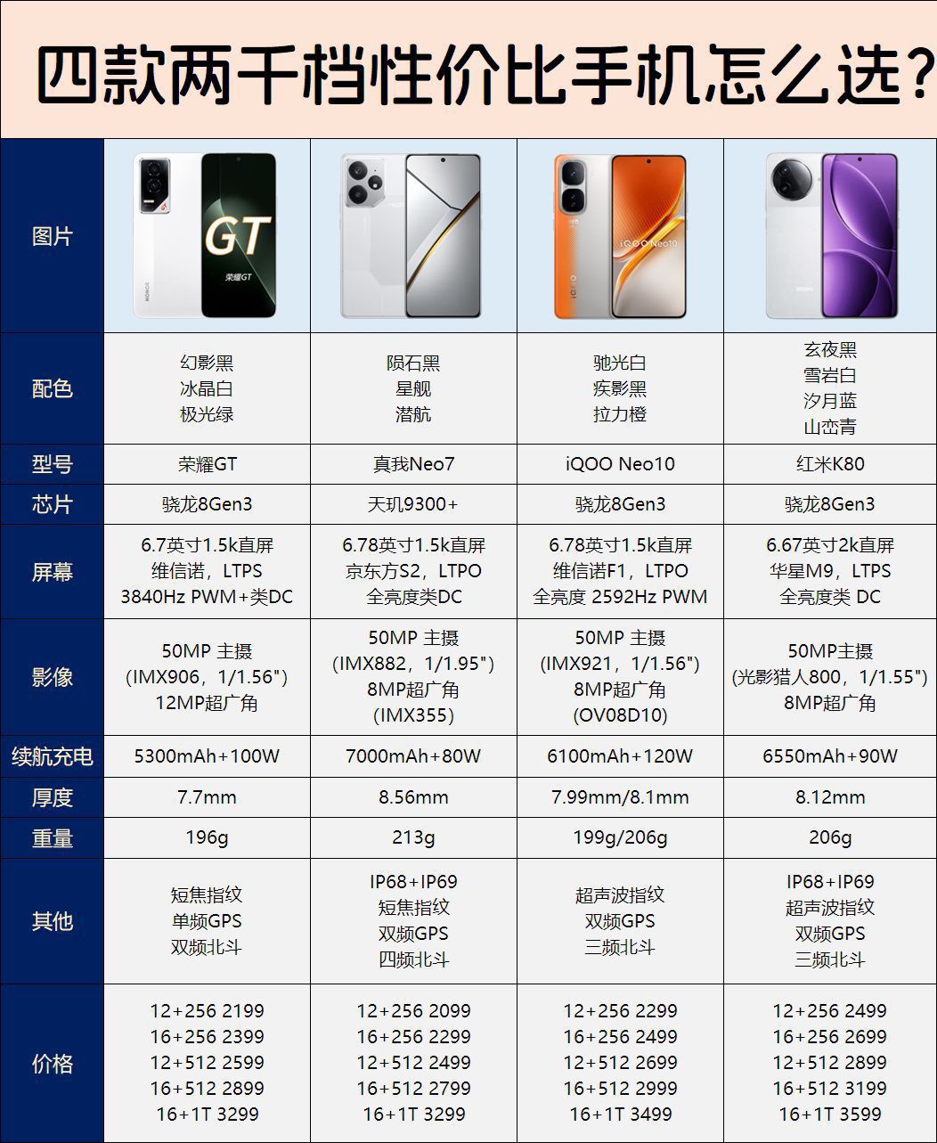 近期热门的四款两千元档性价比手机怎么选?红米k80,iQOONeo10,真我Neo7,荣耀GT 红米有2k屏、IP68+IP69、超声波指纹、金属中框; iQOONeo10有超声波指纹; 真我Neo7有7000mAh大电池、IP68+IP69;