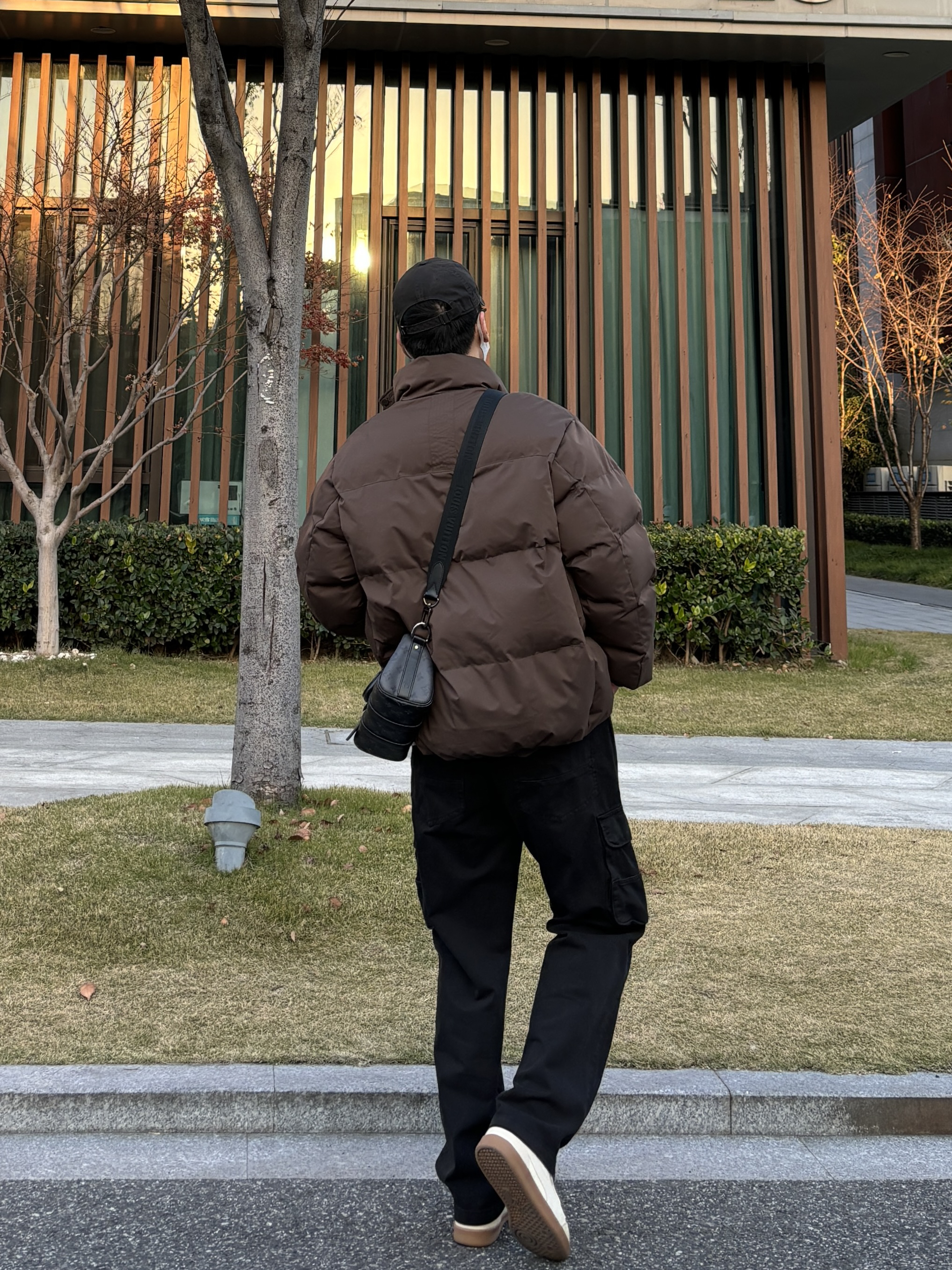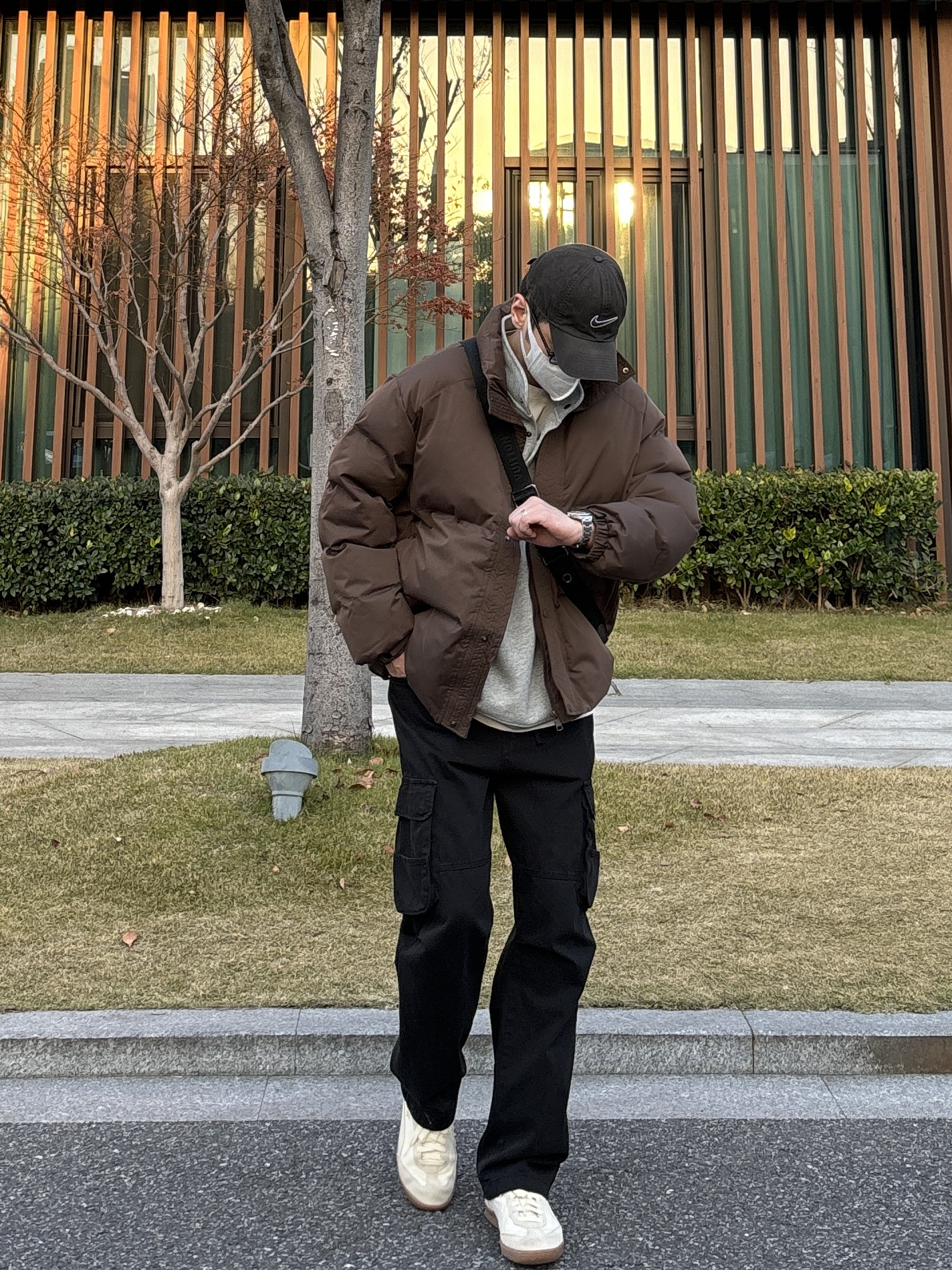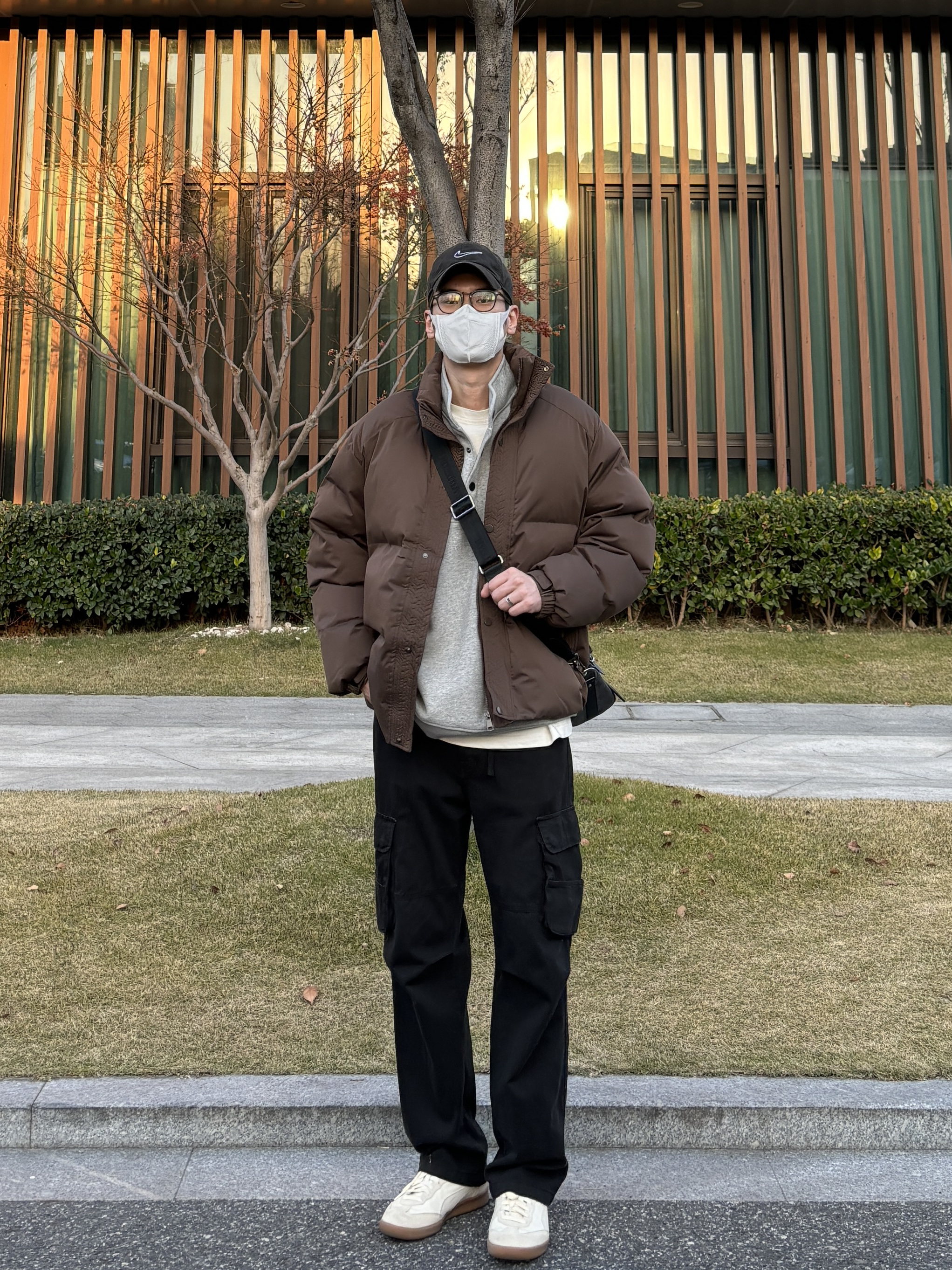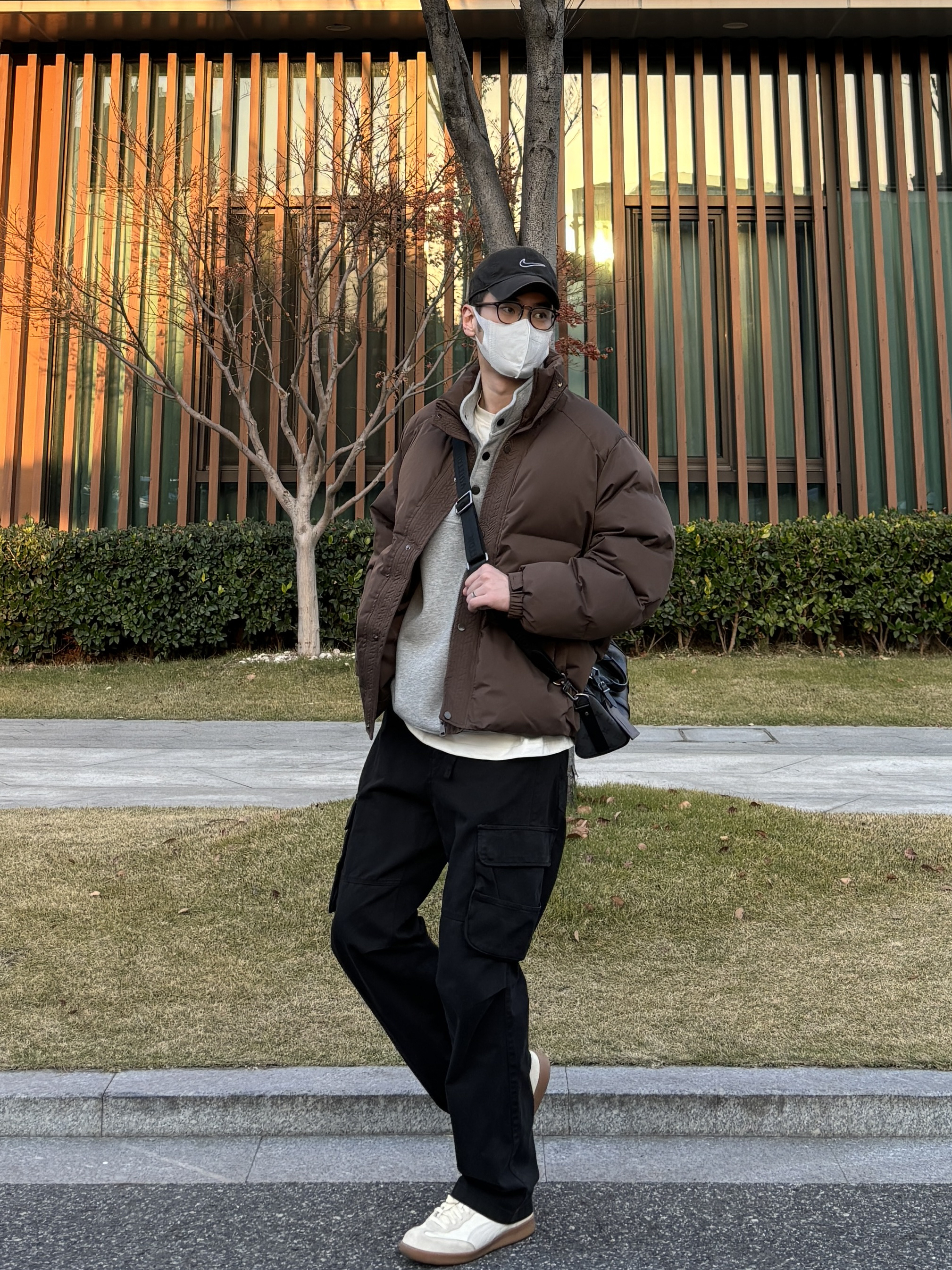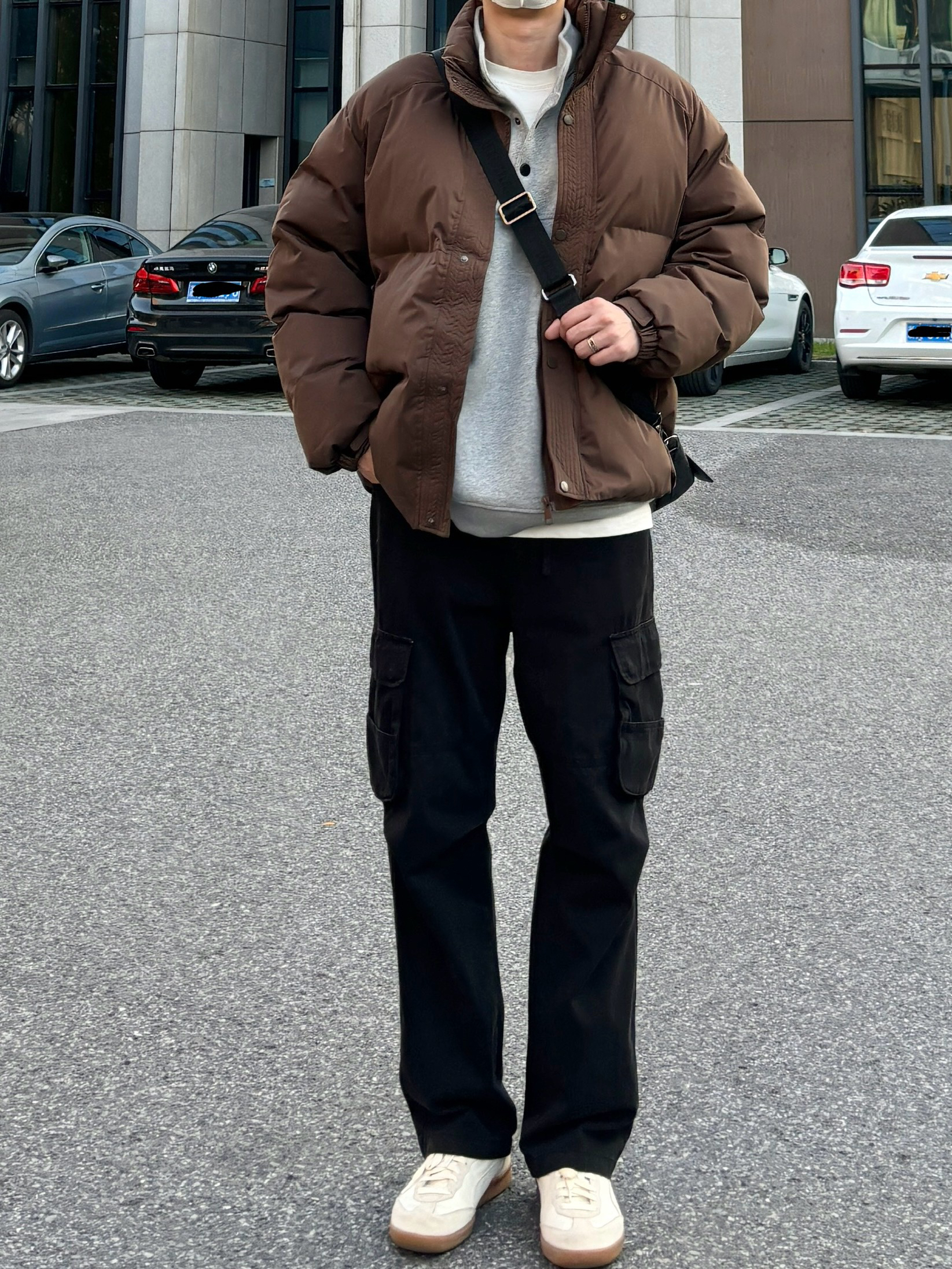 今天这套先用浅灰色重磅开胸纽扣卫衣做内搭 ⬇️ 裤子选择简约百搭的黑色直筒做旧多口袋工装裤 ⬇️ 鞋子上脚清爽干净的米白色皮质拼接德训鞋 ⬇️ 接着套上咖啡色宽松阔版加厚保暖立领棉服 ⬇️ 最后背一个精致的皮质斜挎包 - 今日搭配 衣服裤子:NICE LILI 鞋子:puma liga
