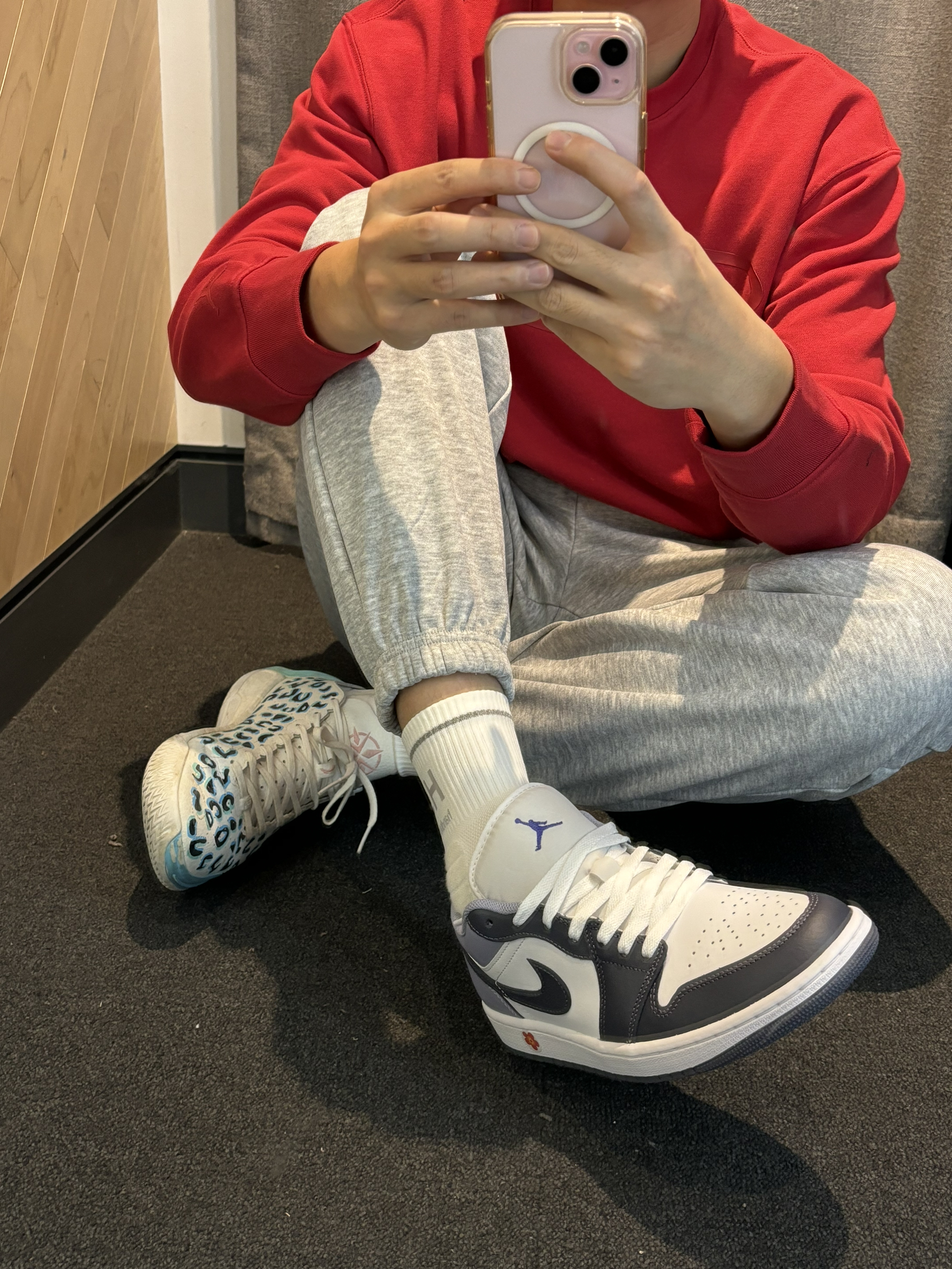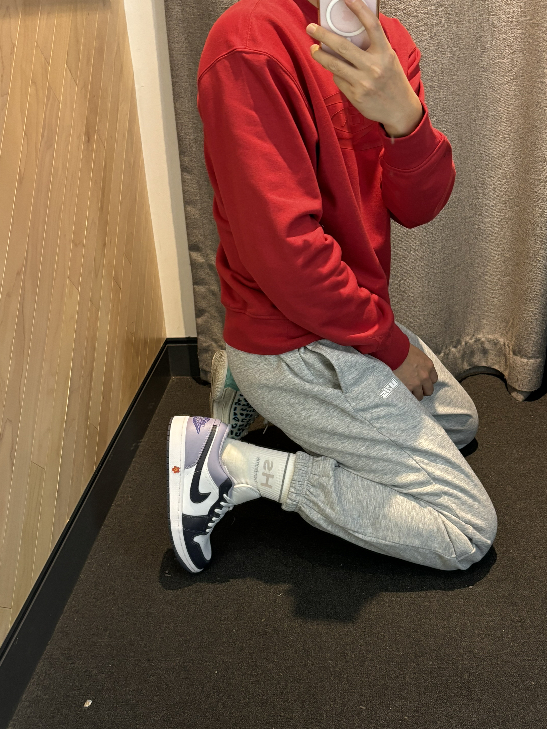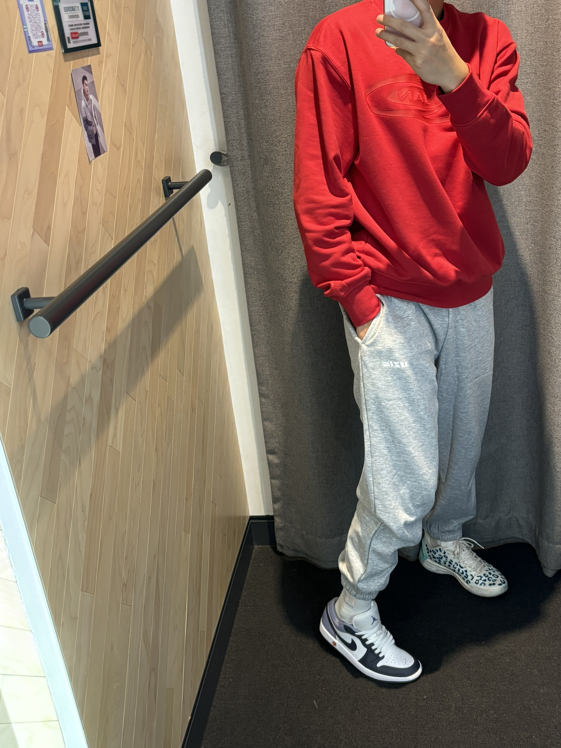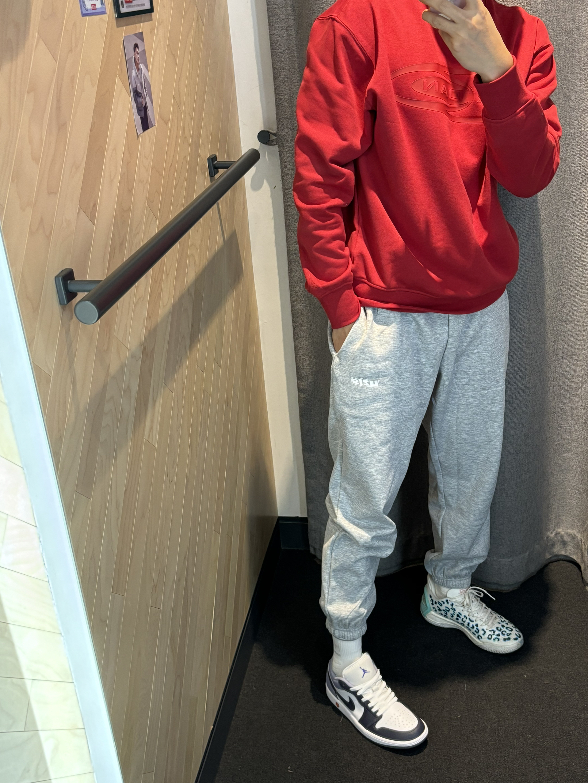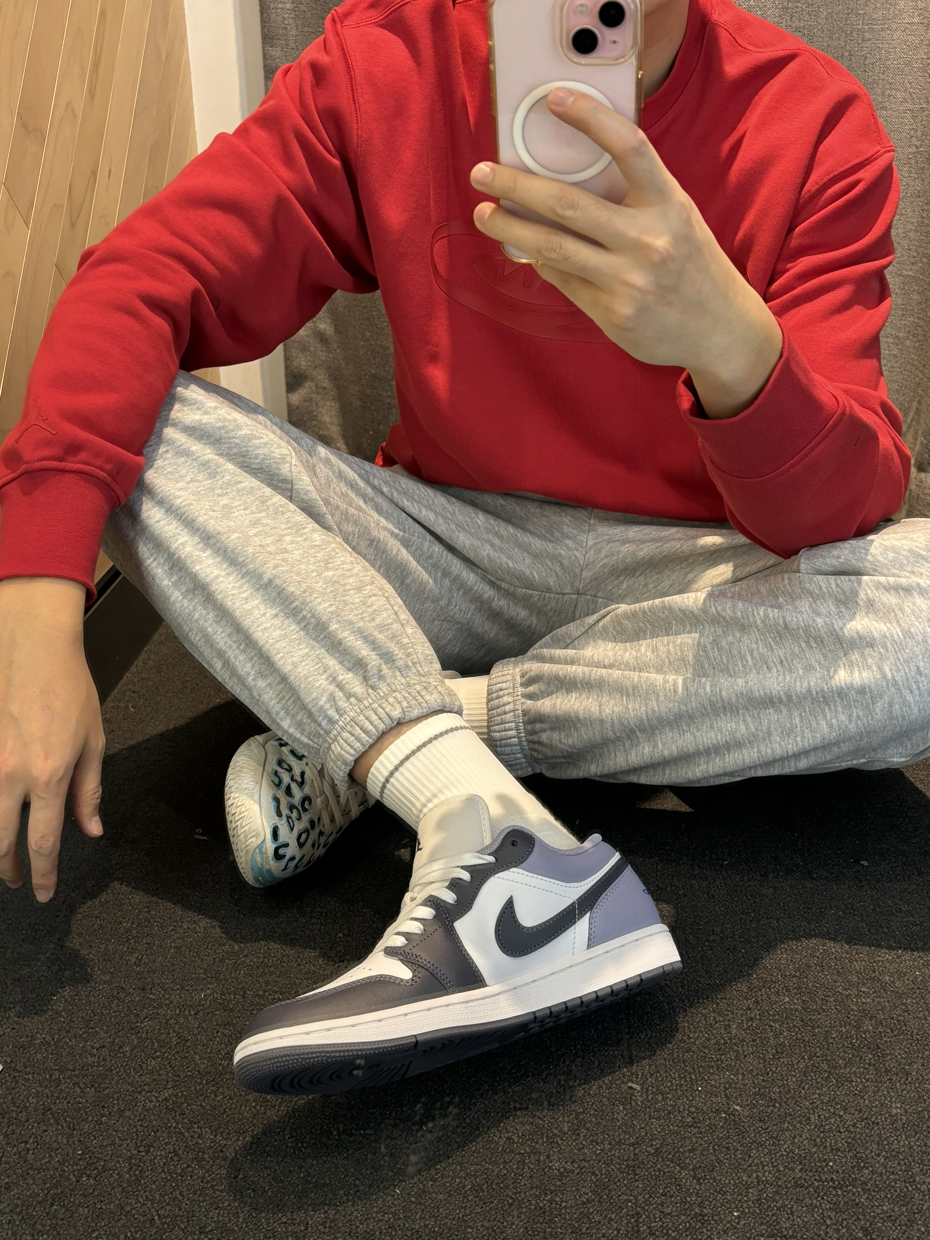 今年渐变色的aj1低帮还真的少 这个配色有一说一试真的适合我 今年穿搭还是喜欢红色 大红大紫这个寓意还是很不错的 打工人通勤穿最近就可以穿 卫衣就带加绒 搭配灰色束脚裤就可以 aj1low今年还是出的比较少 你喜欢这一身吗?