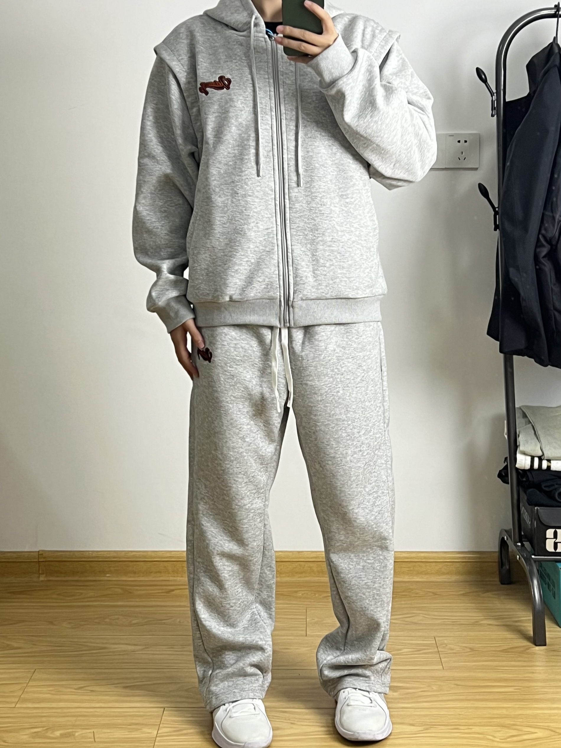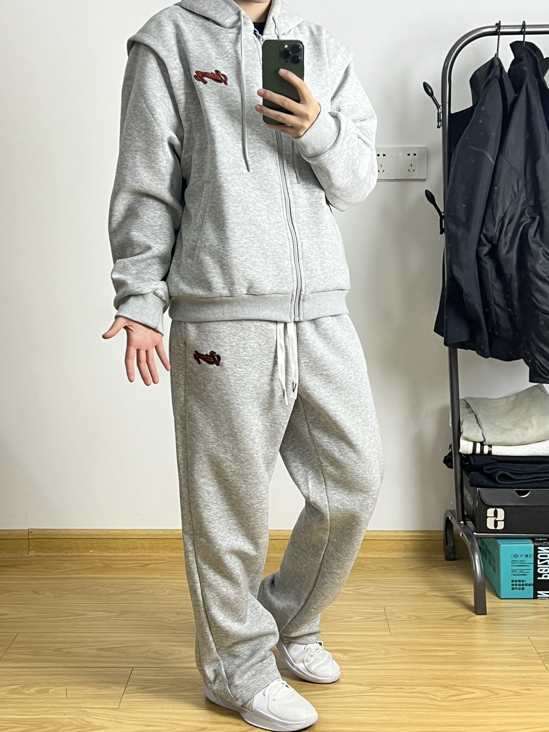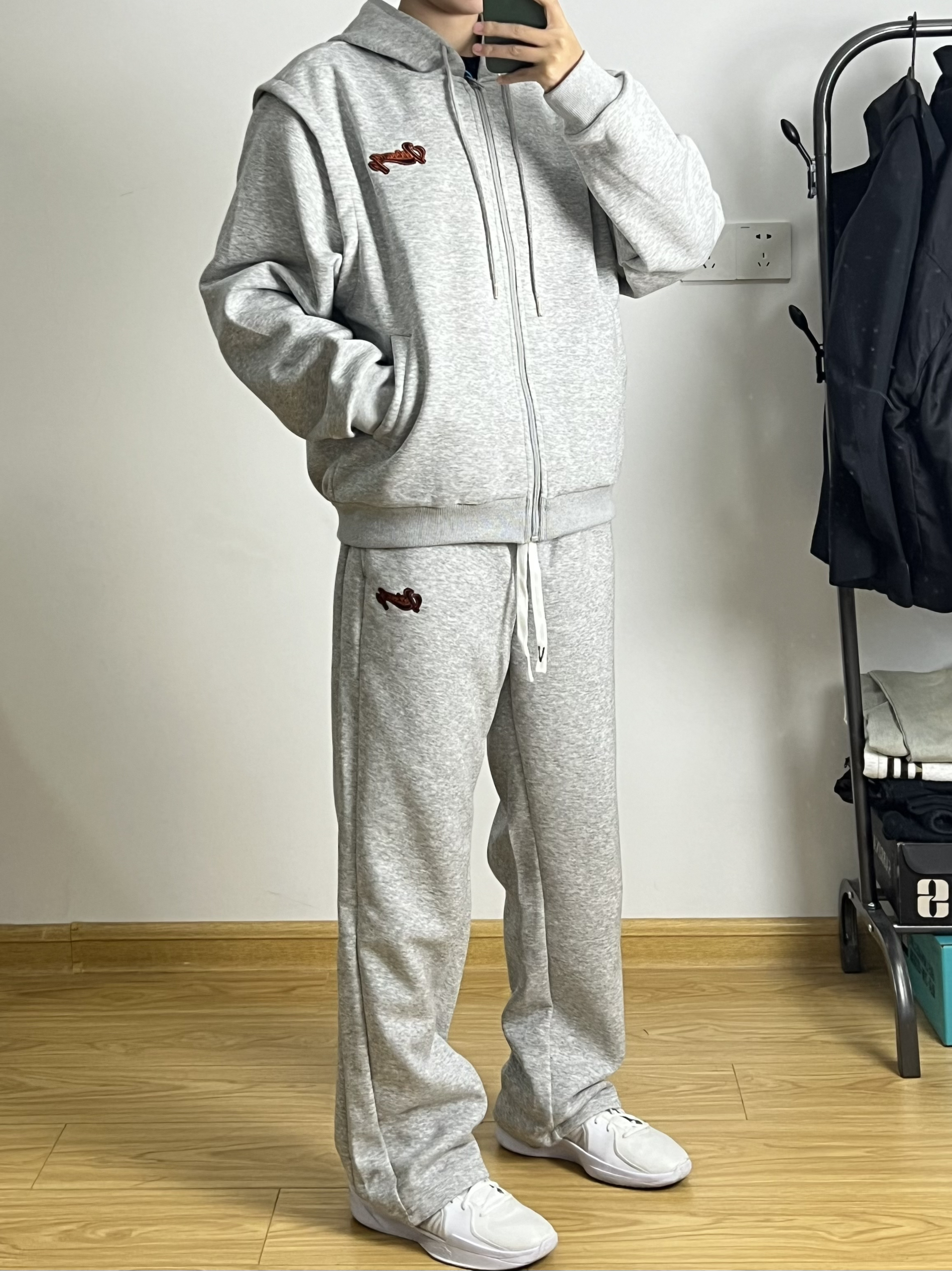 身高|体重:168/95 简约干净的运动套装真的很好穿 宽松版型落肩袖设计很修饰身材 灰色极简大方很有高级感 再来一双白色银钩篮球鞋 真的太酷啦