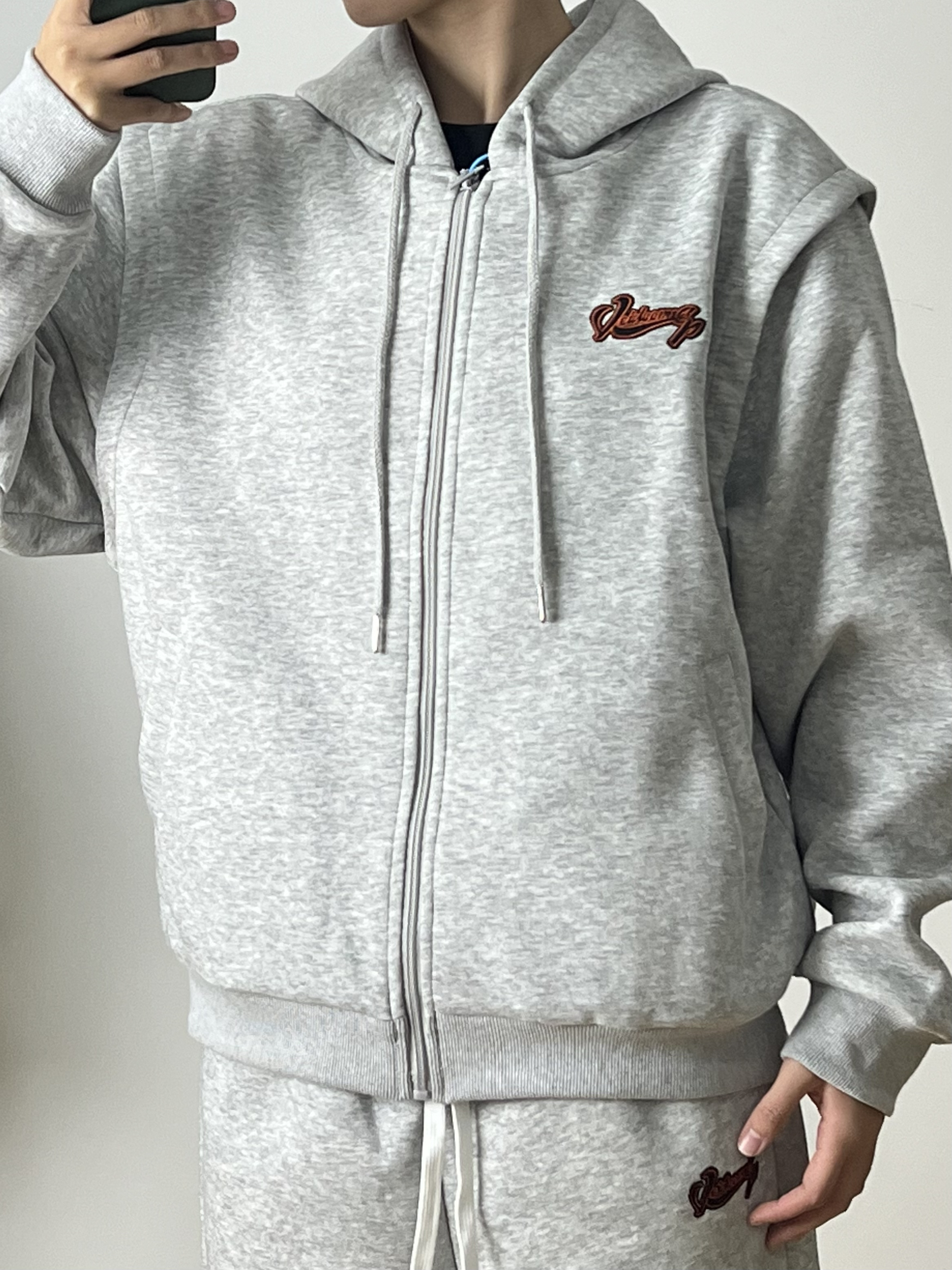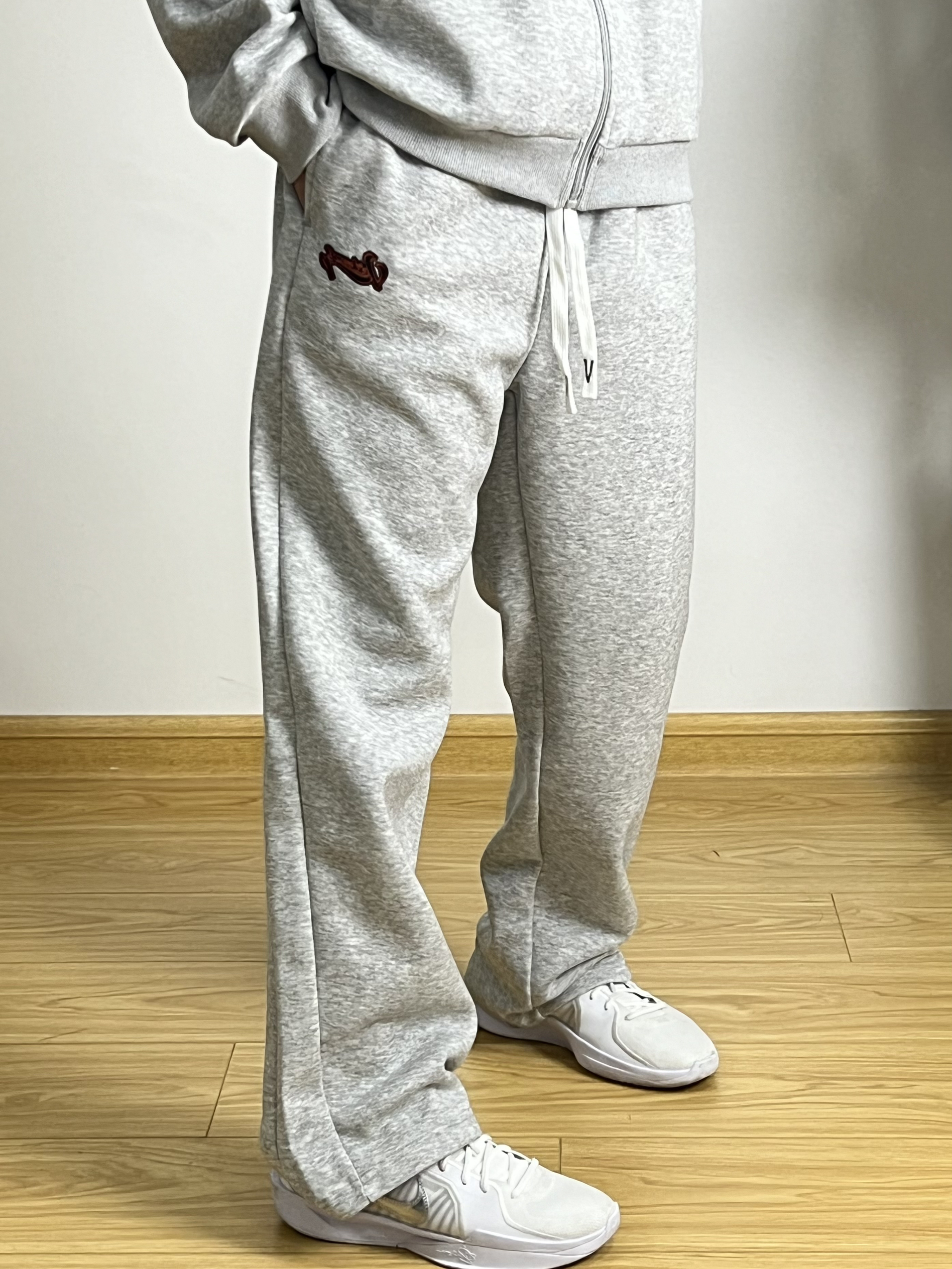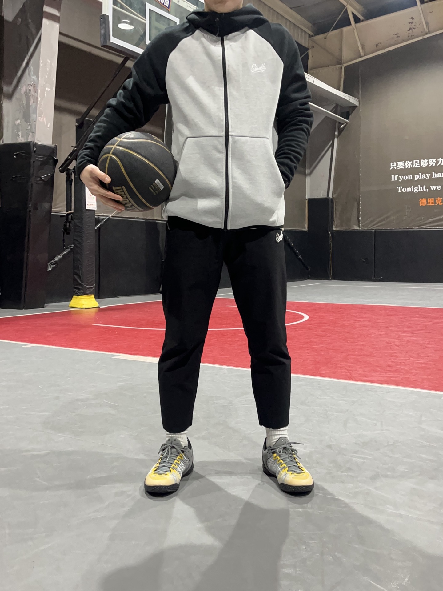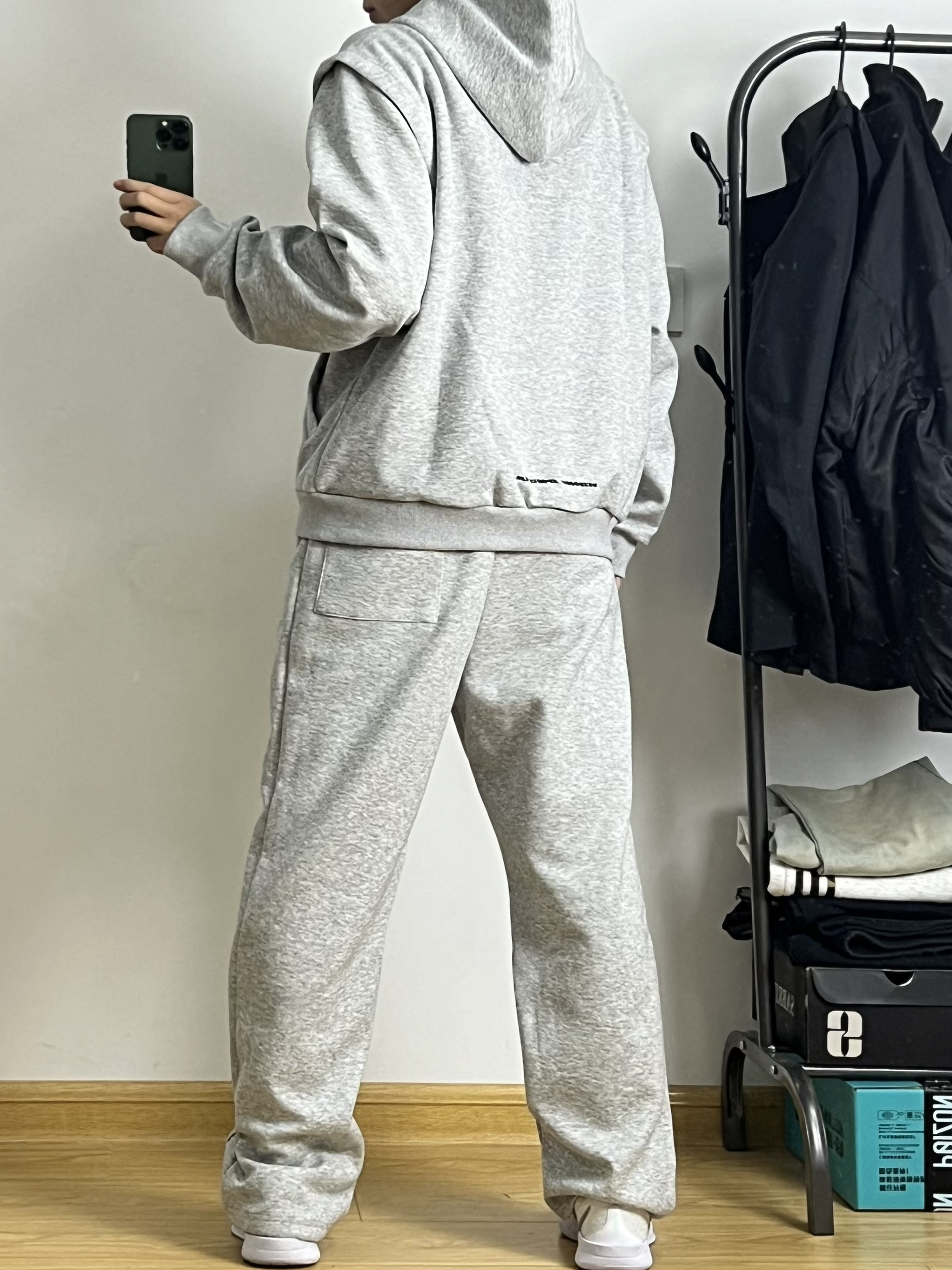 身高|体重:168/95 简约干净的运动套装真的很好穿 宽松版型落肩袖设计很修饰身材 灰色极简大方很有高级感 再来一双白色银钩篮球鞋 真的太酷啦