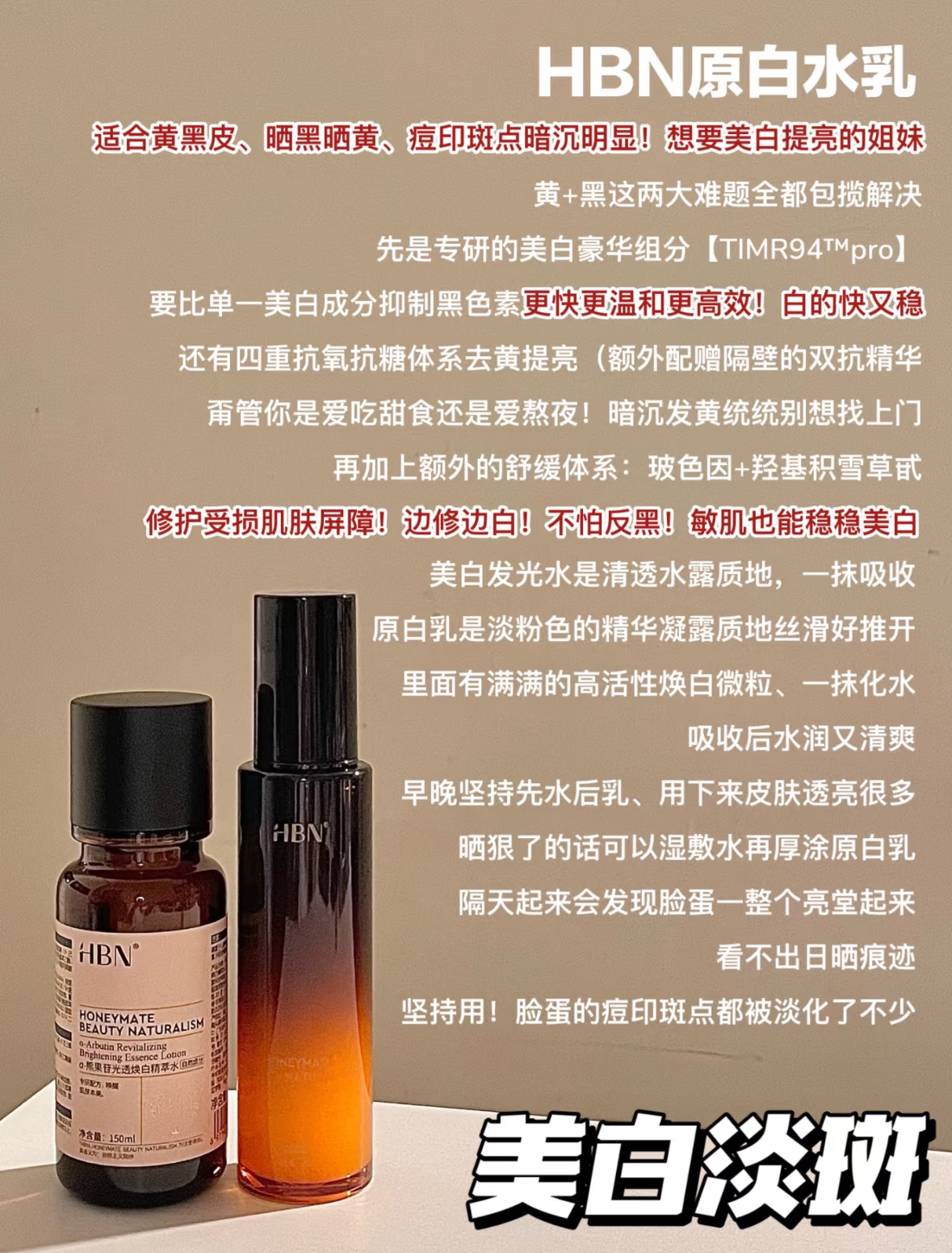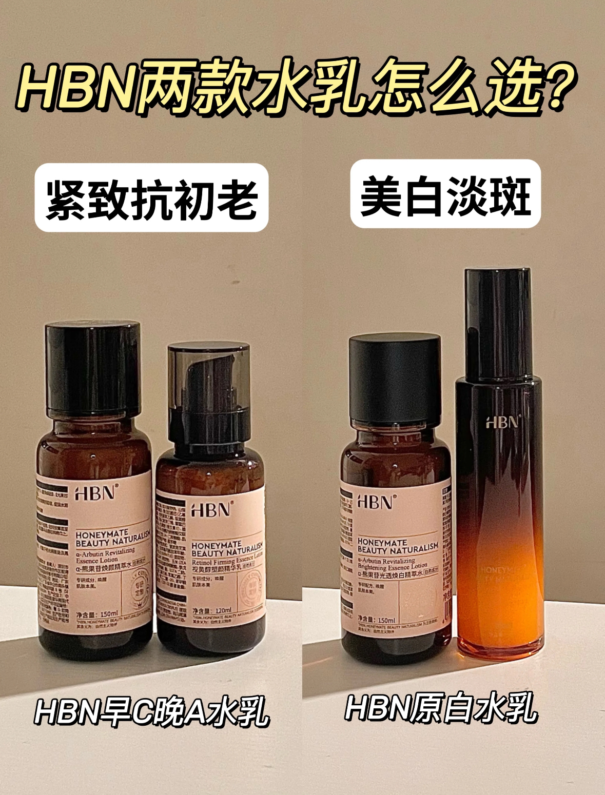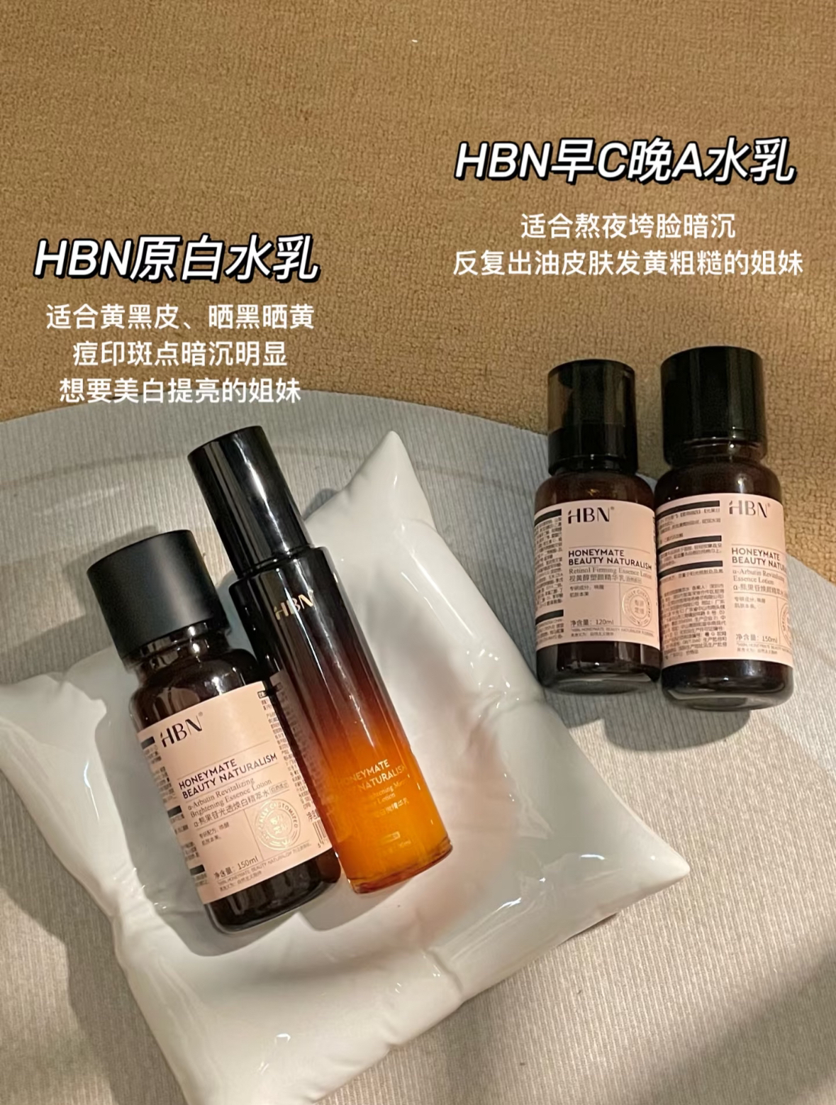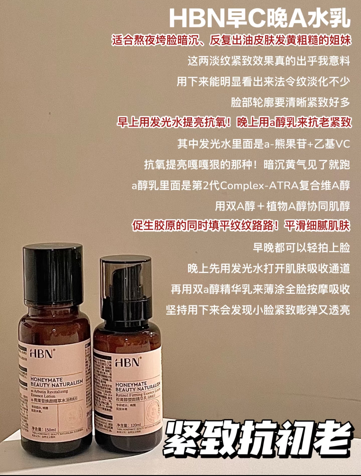 本篇笔记关联了HBN 熊果苷早C晚A护肤套装【水+乳】 提拉紧致焕亮祛斑淡纹 【2.0】发光水150ml+精华乳120ml、HBN 特证版三重蛋白护肤套装 提拉紧致弹润美白祛斑焕亮不反黑促弹 发光水150ml+原白乳90ml等商品,为用户提供真实的使用体验和购买参考。
