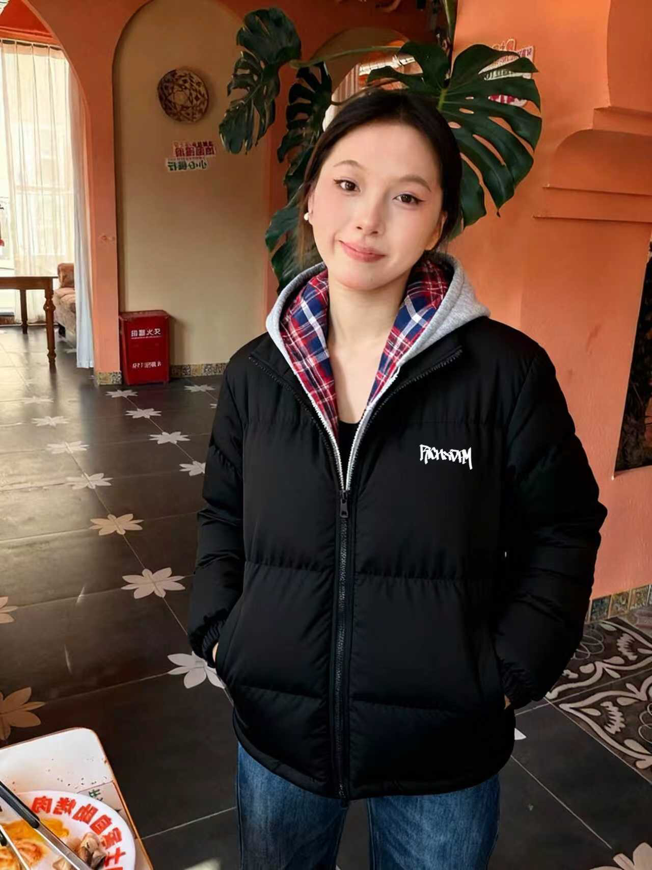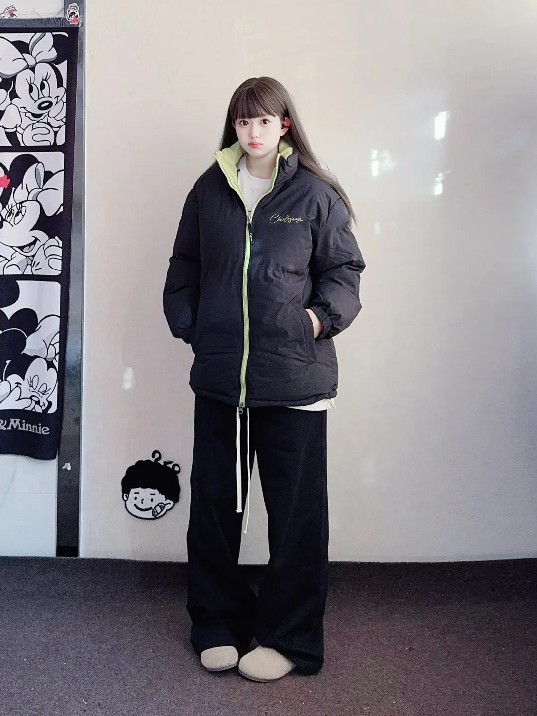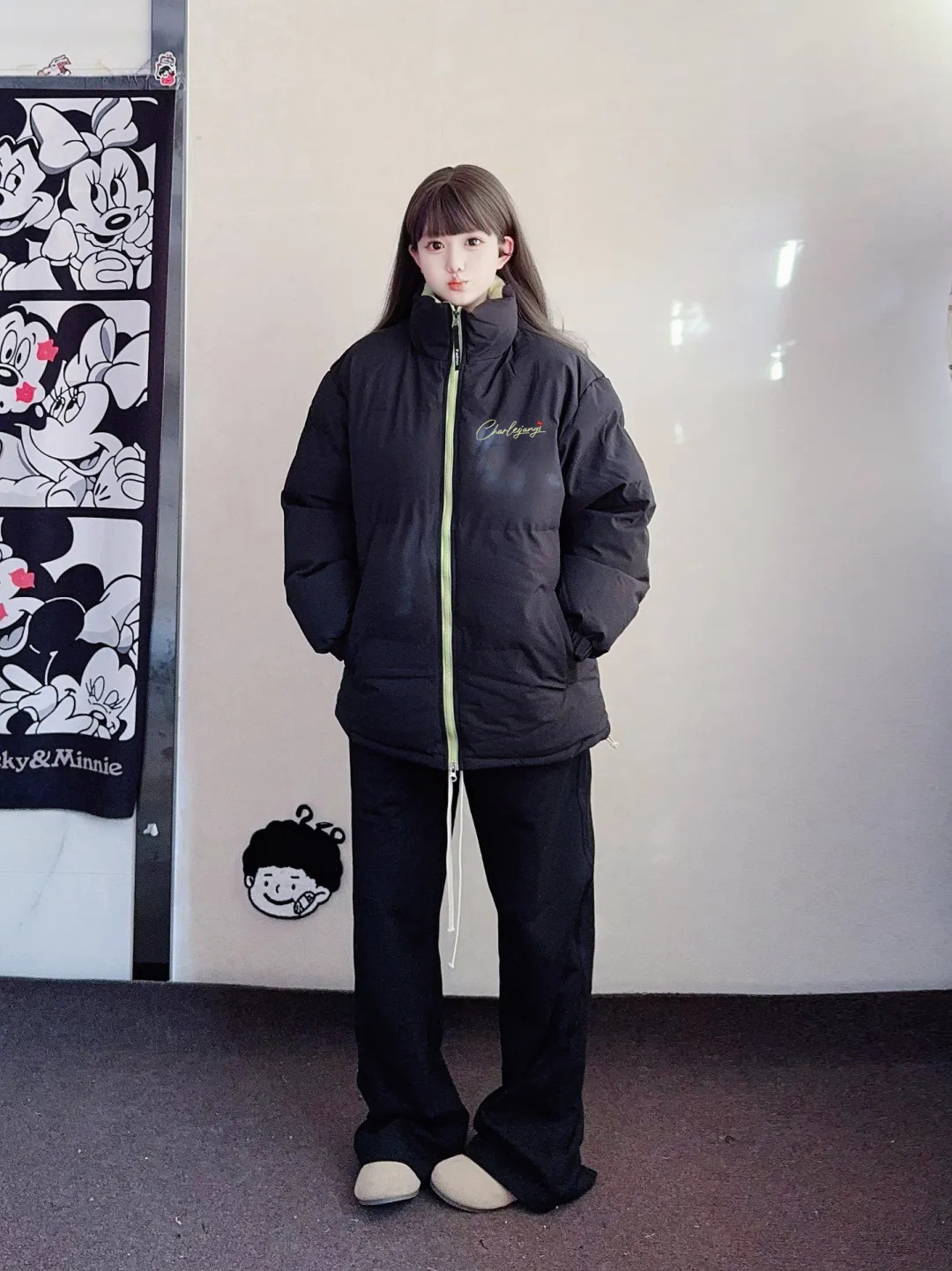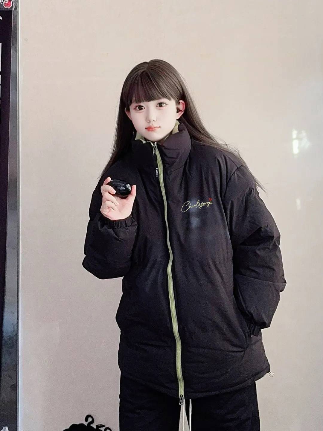第一次尝试带着点拼色设计的棉服,简直是不要太好看了,果绿色和黑色的拼色还是第一次见,竟然也不会违和,主体黑色系和基础款式,让整件棉服变得特别的百搭,上面的字母图案也很好看,轻松穿出休闲街头的冬季穿搭