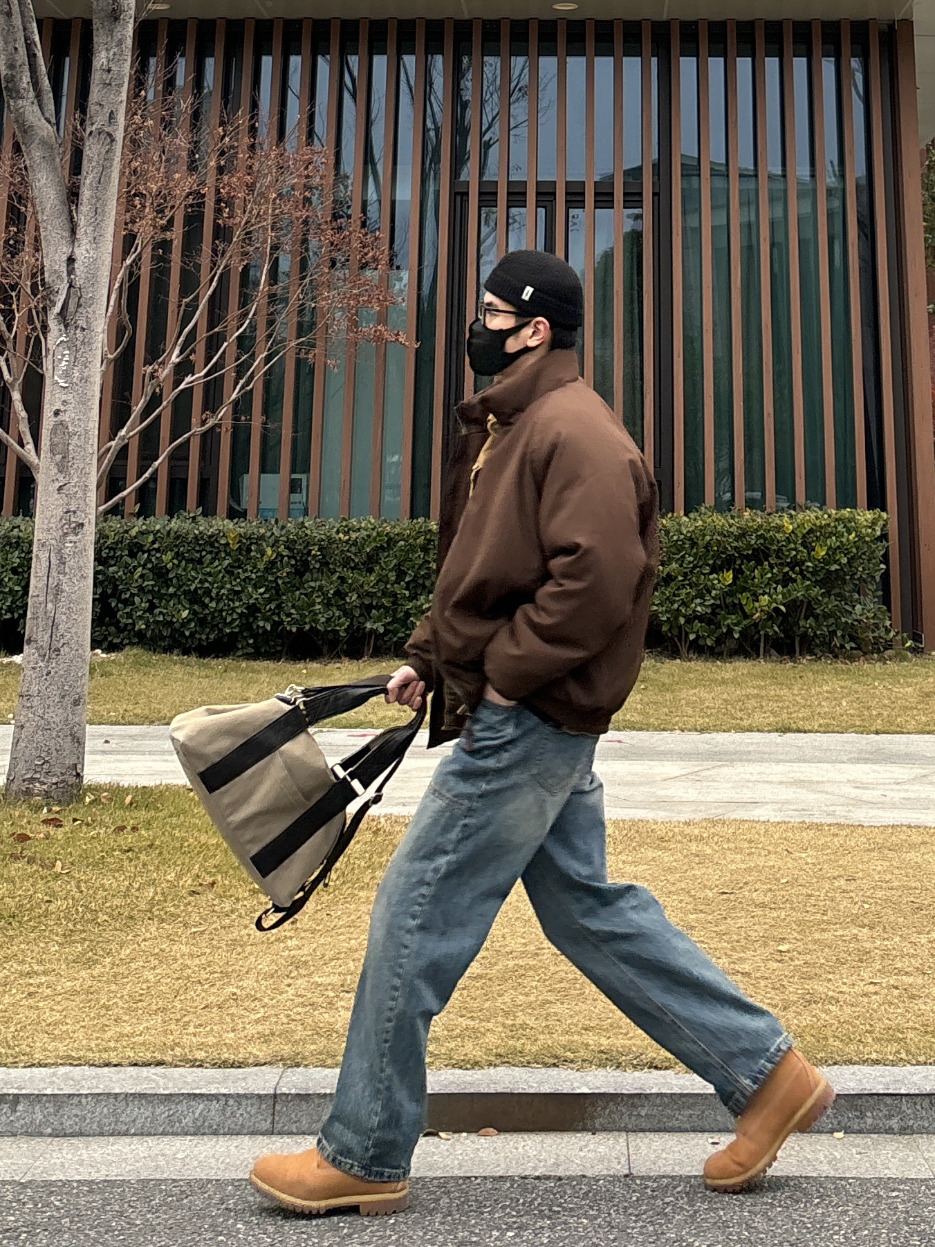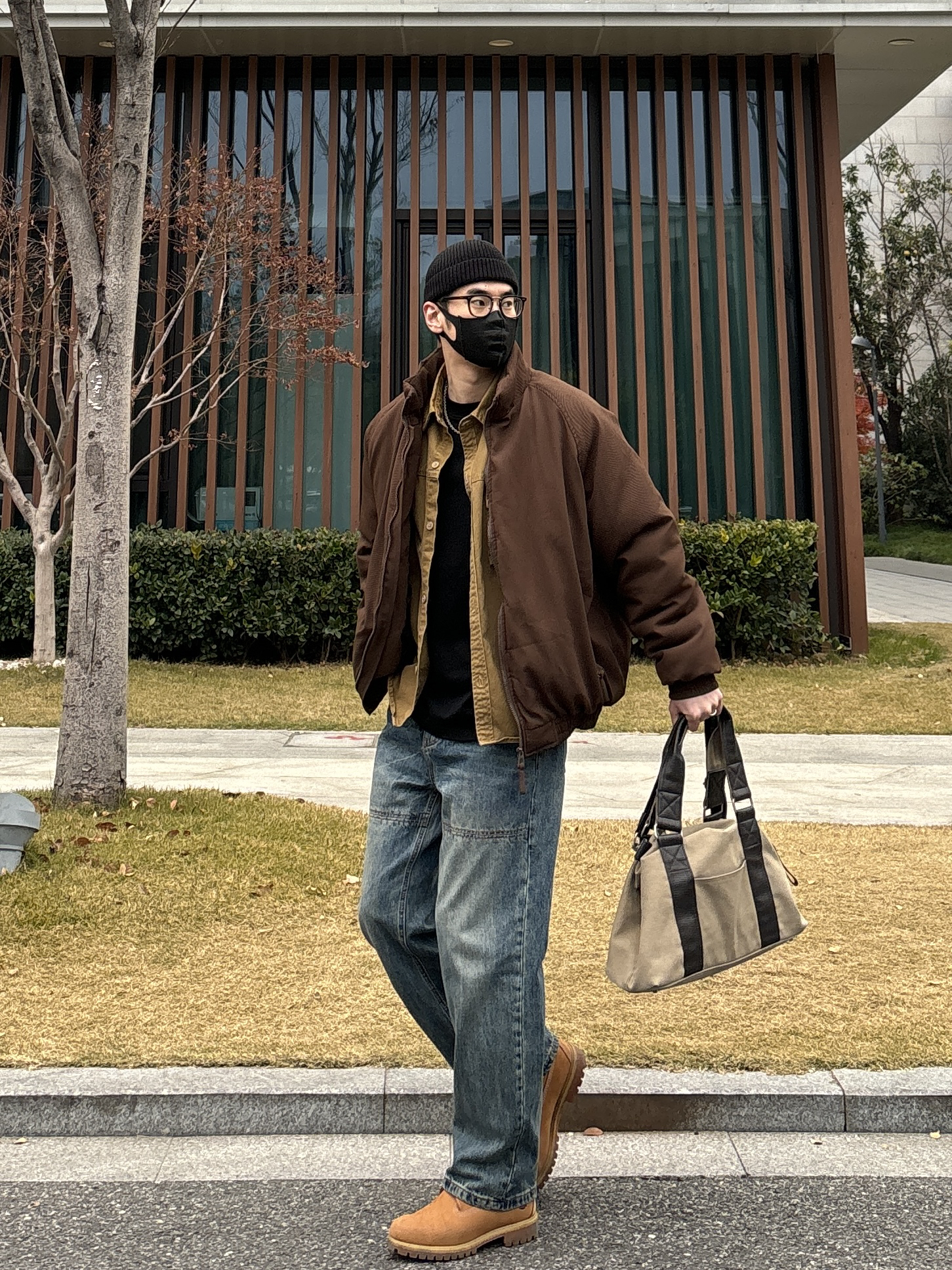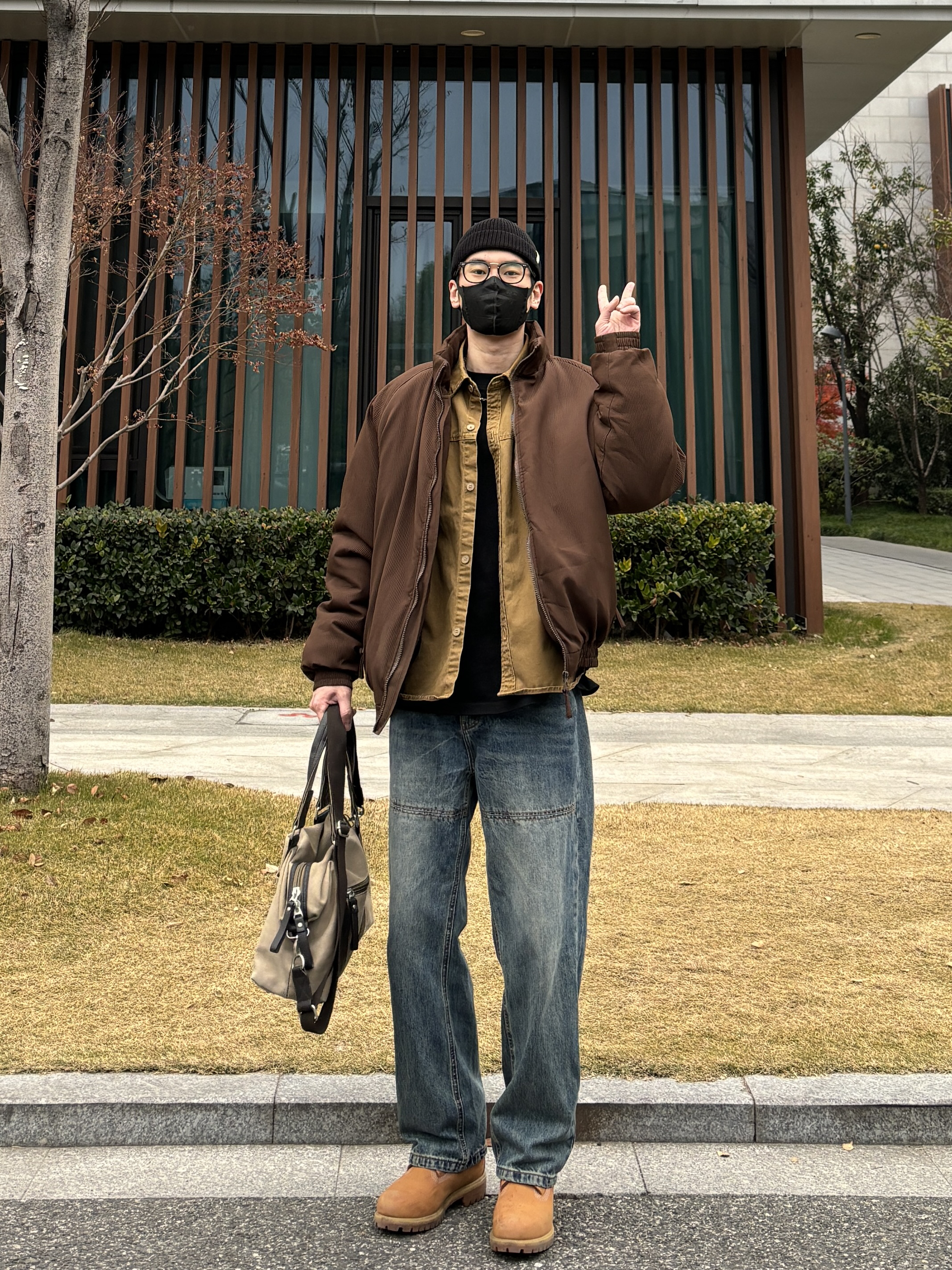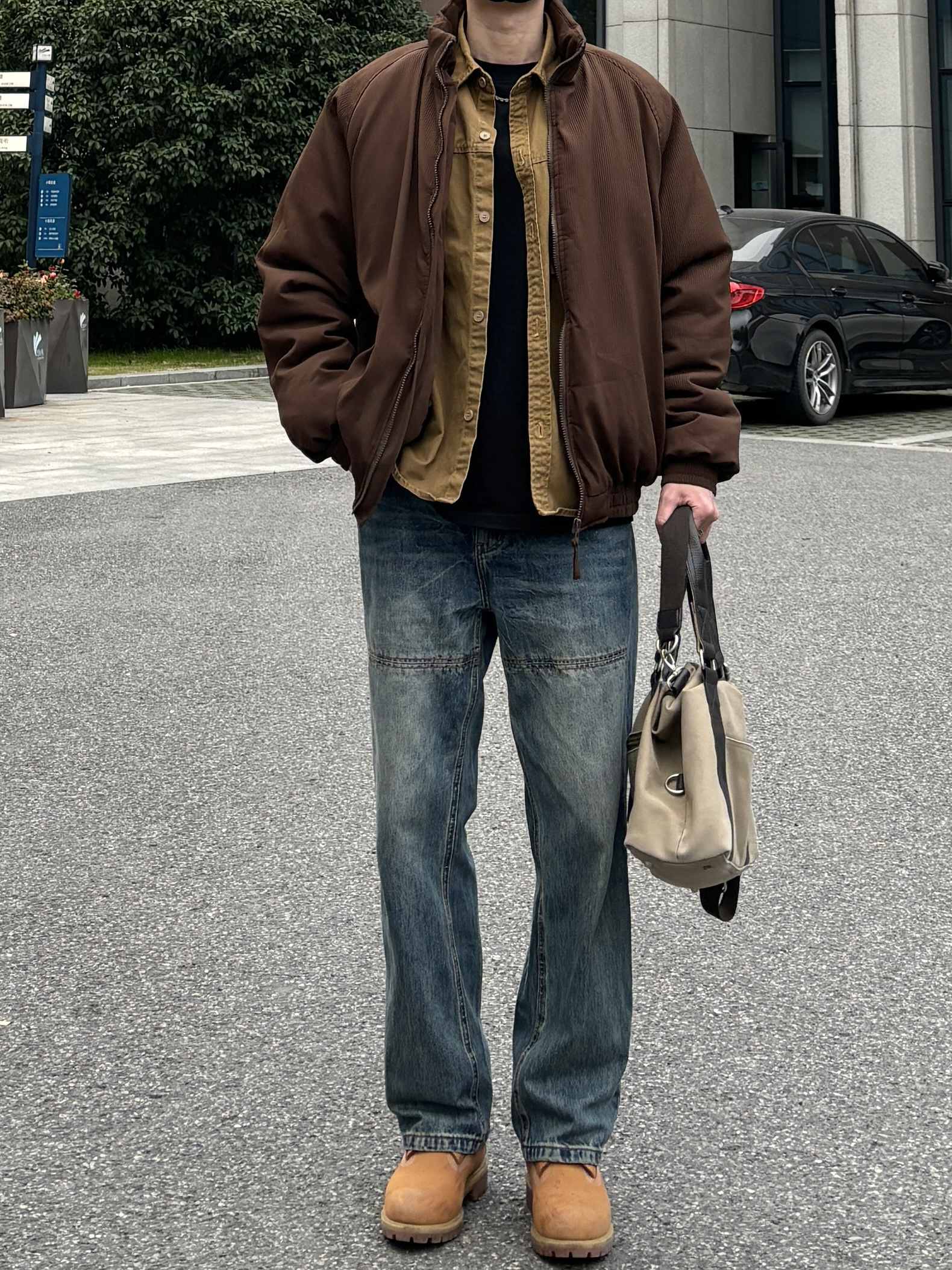 今天这套先用卡其色做旧工装衬衫做叠穿 ⬇️ 裤子选择不挑腿型的蓝色水洗直筒拼接牛仔裤 ⬇️ 鞋子上脚冬季必备的timberland大黄靴 ⬇️ 接着套上咖啡色宽松阔版插肩袖立领棉服 ⬇️ 最后拿一个大容量帆布斜挎手提包 - 今日搭配 衣服裤子:NICE LILI 鞋子:timberland
