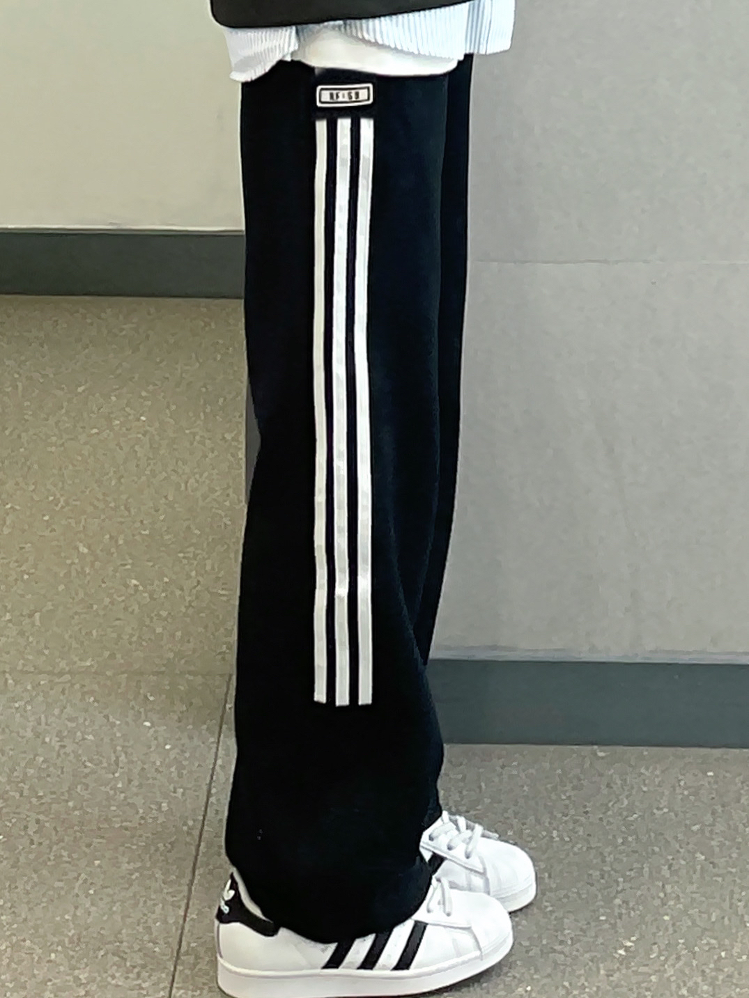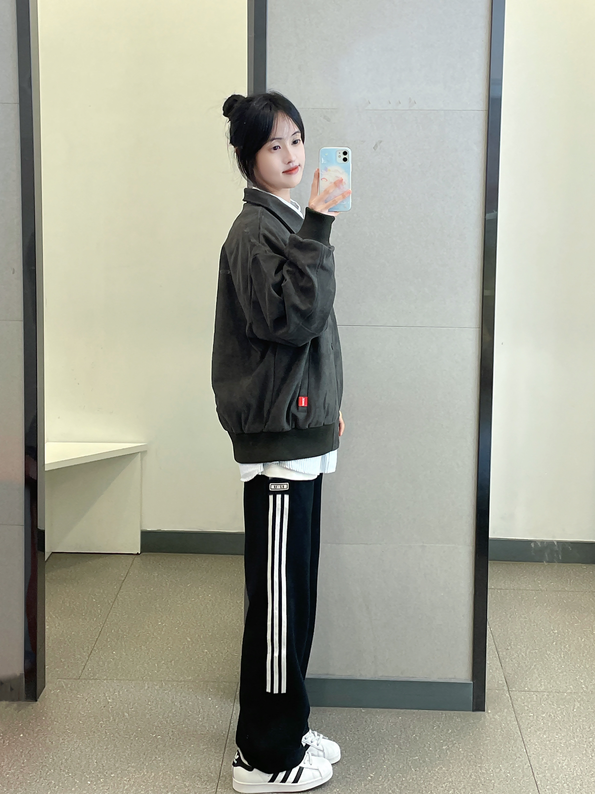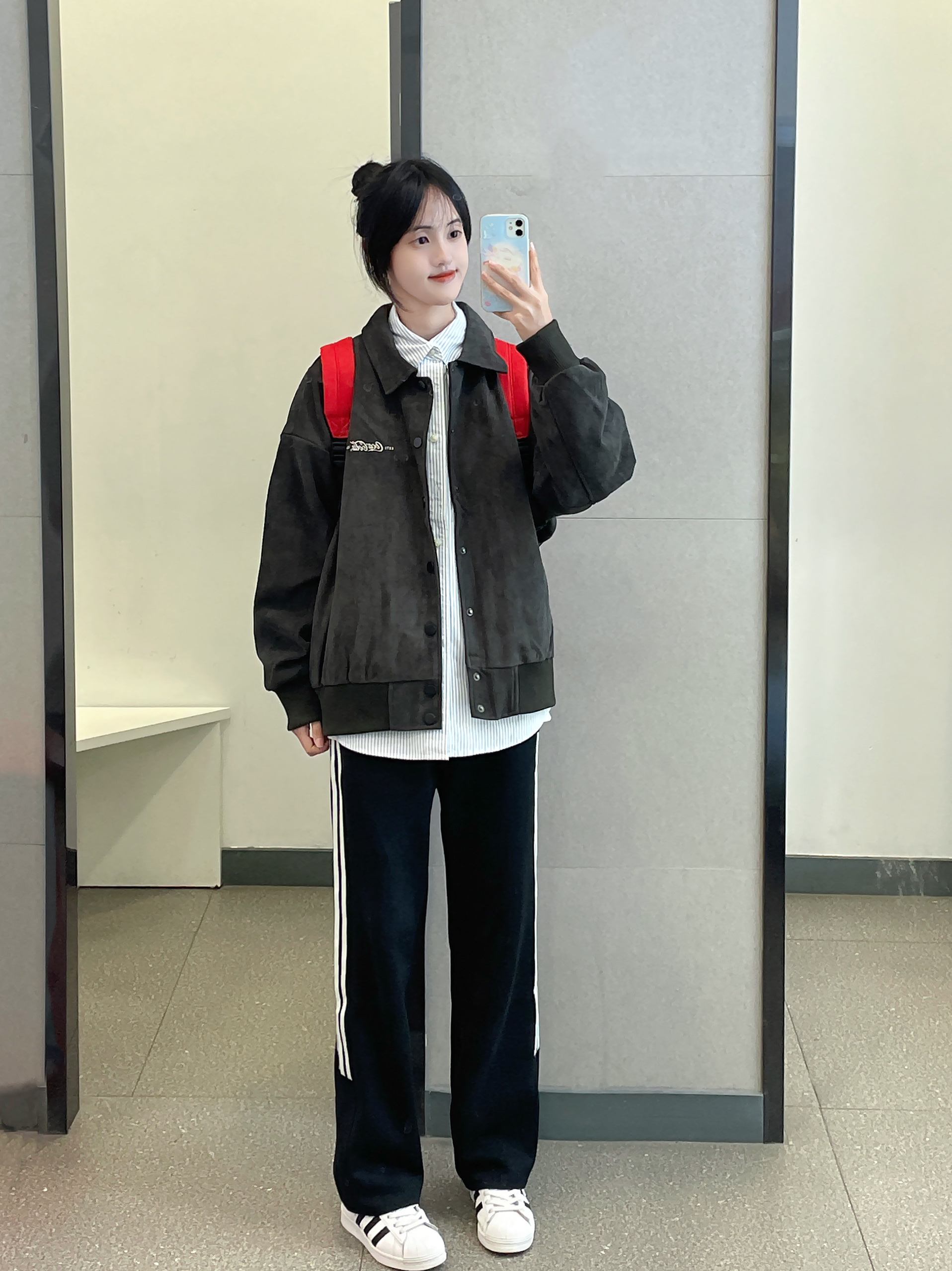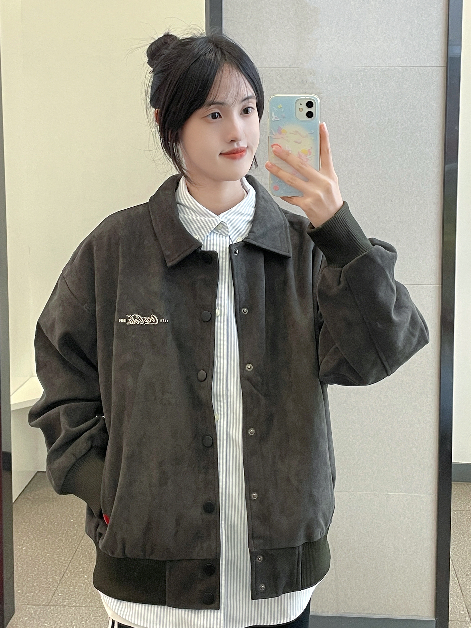 👔 :可口可乐麂皮夹克 叠穿了蓝色条纹衬衫 👖 :coldstone黑白条纹裤
