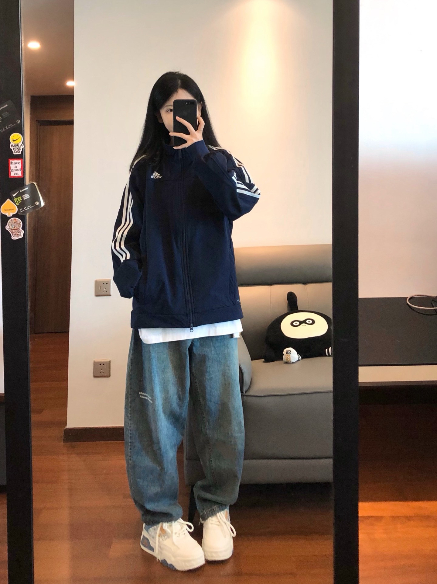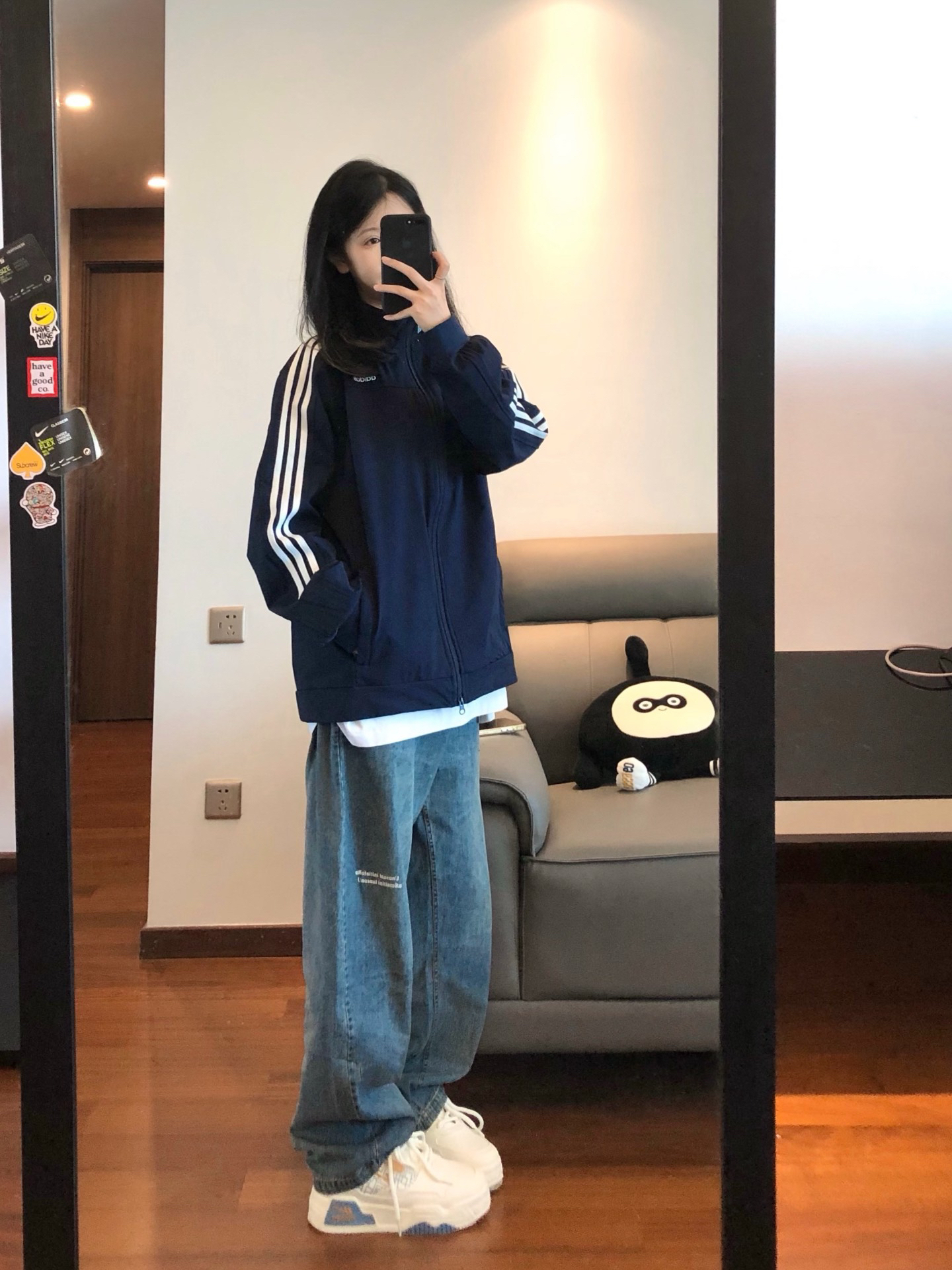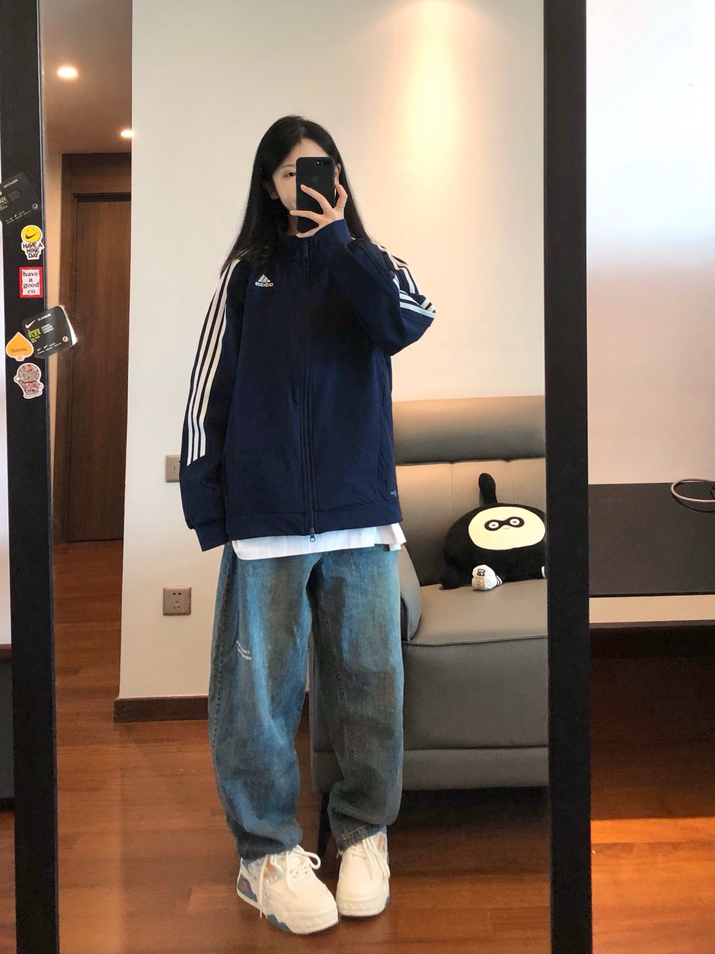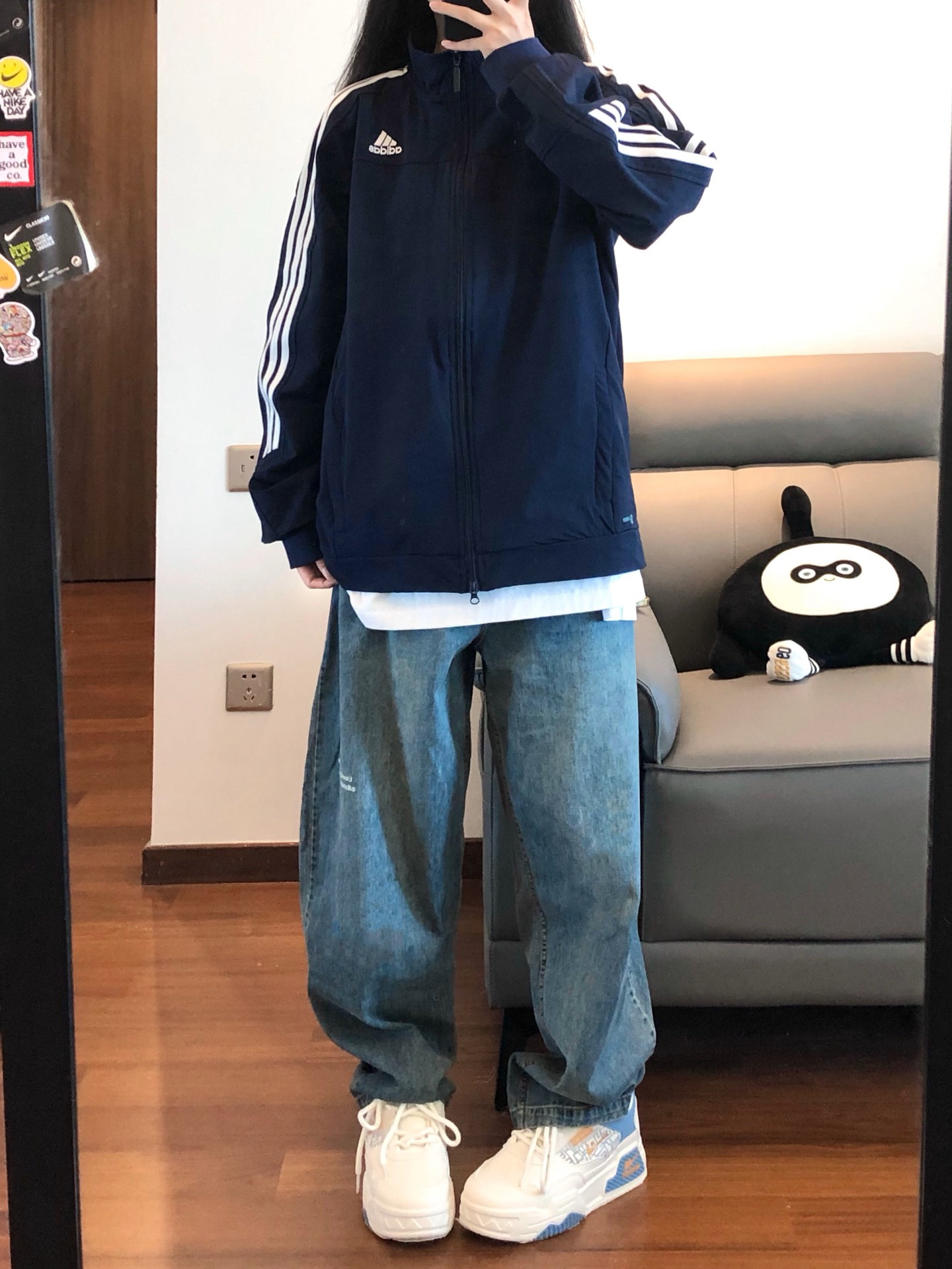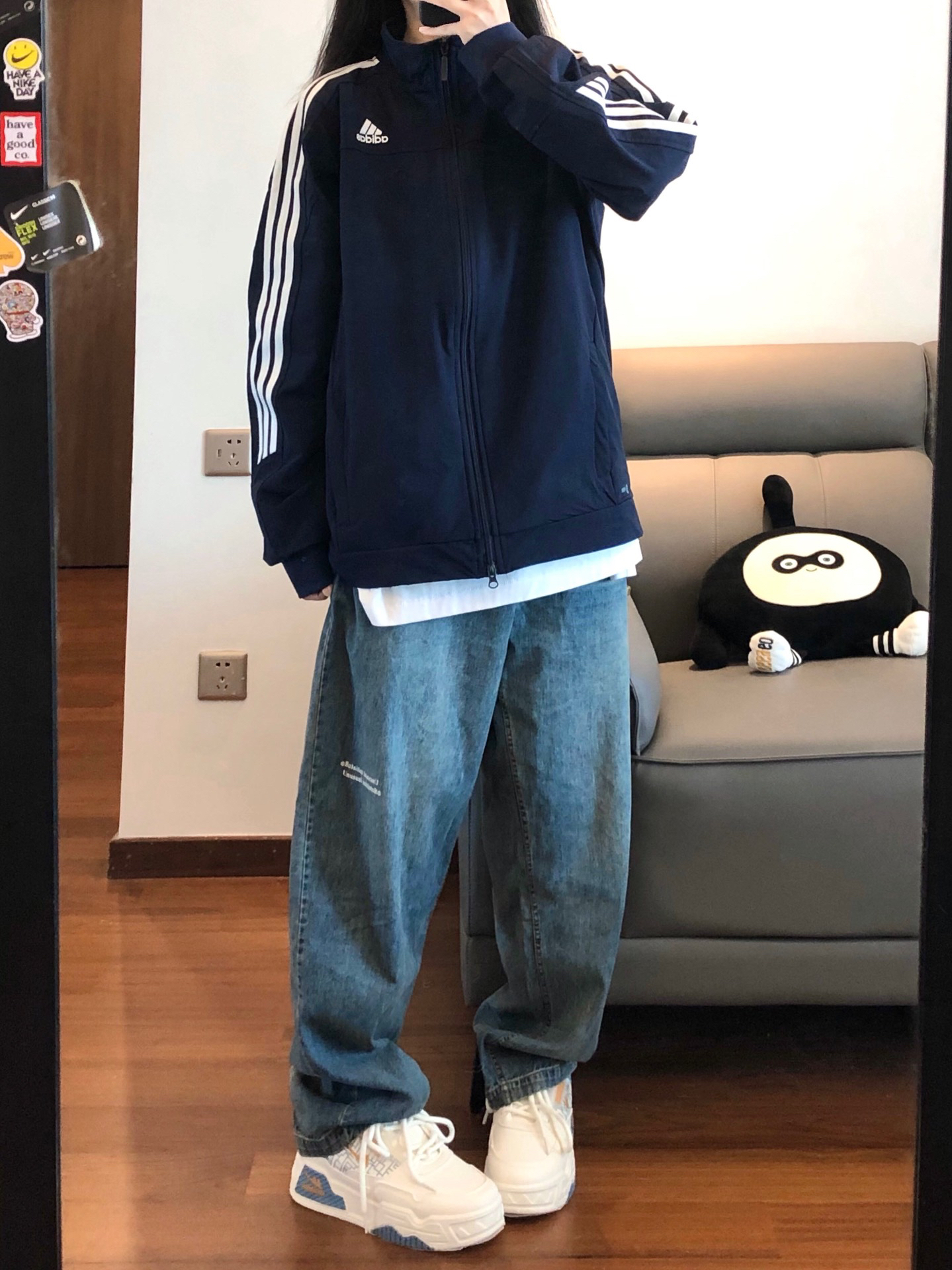 哈哈哈没毛病 这一身校服穿搭真的是经典不过时 Adidas外套+宽松牛仔裤+回力板鞋👟 主打一个休闲舒服 . 白蓝拼接的回力厚底板鞋 真嘟很好穿 鞋子很轻很舒服 学生党上班族日常这么穿既舒服又帅气 秋冬天厚底面包鞋真的很香