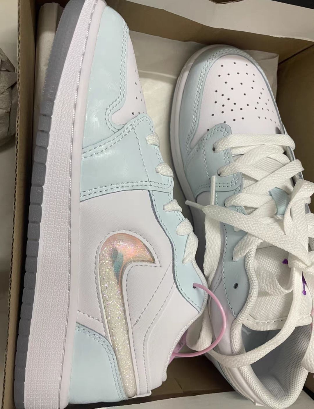 本篇笔记关联了Air Jordan 1 板鞋 运动休闲鞋 复古潮流支撑合成革 大童/冰川蓝/白色/紫罗兰色等商品,为用户提供真实的使用体验和购买参考。