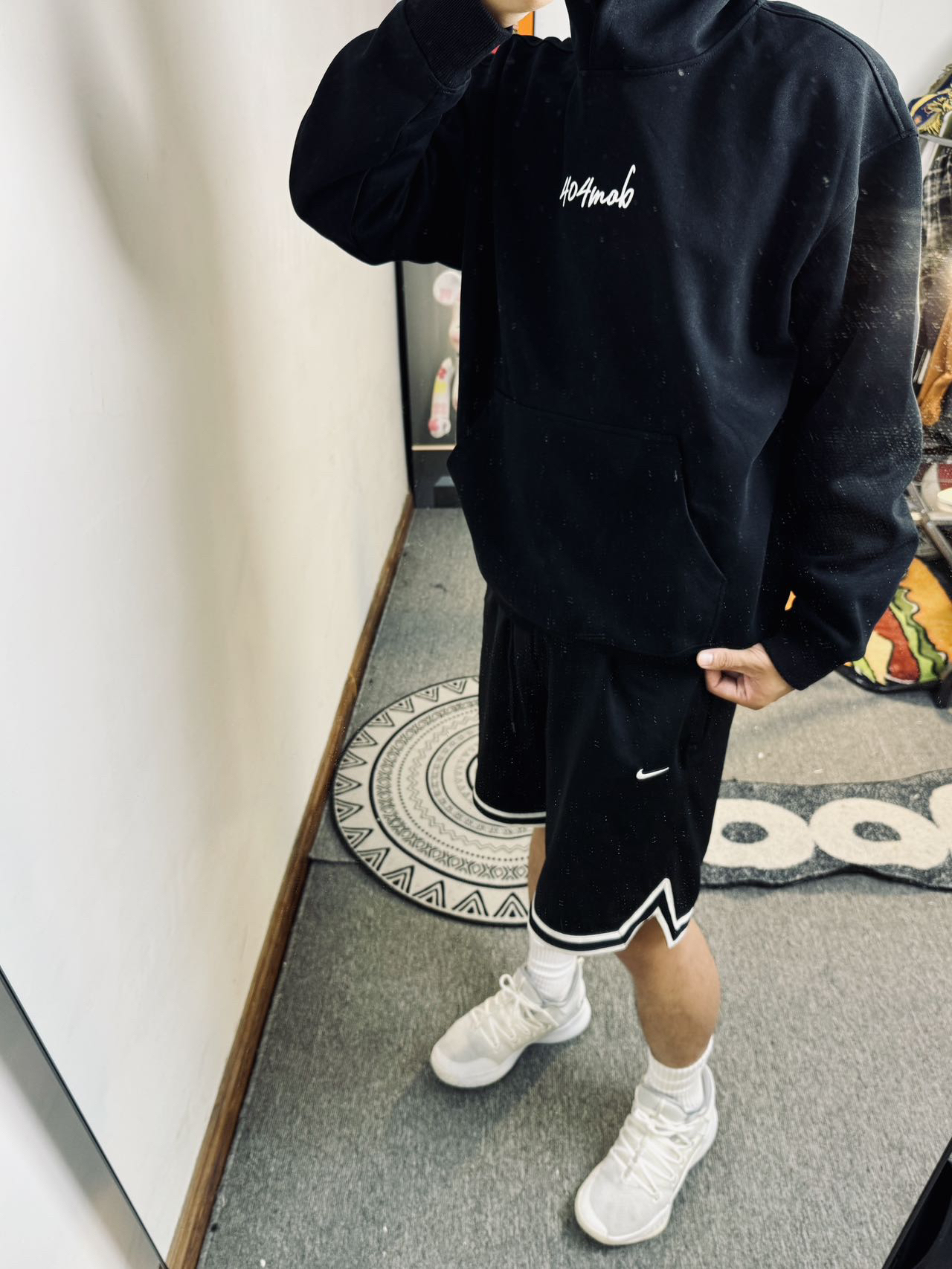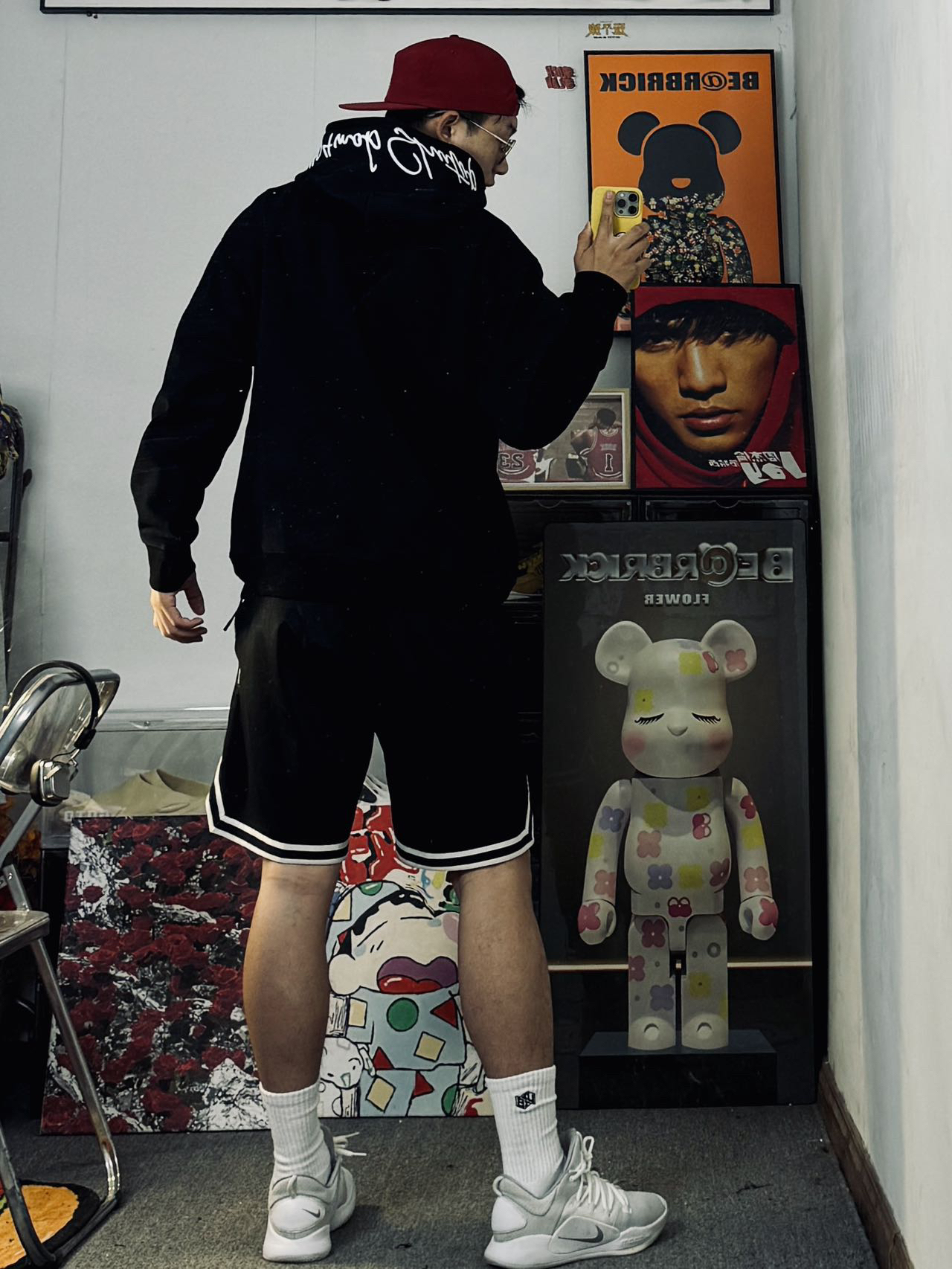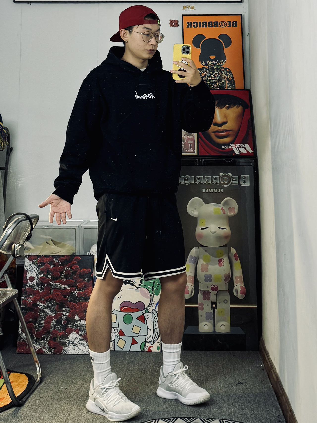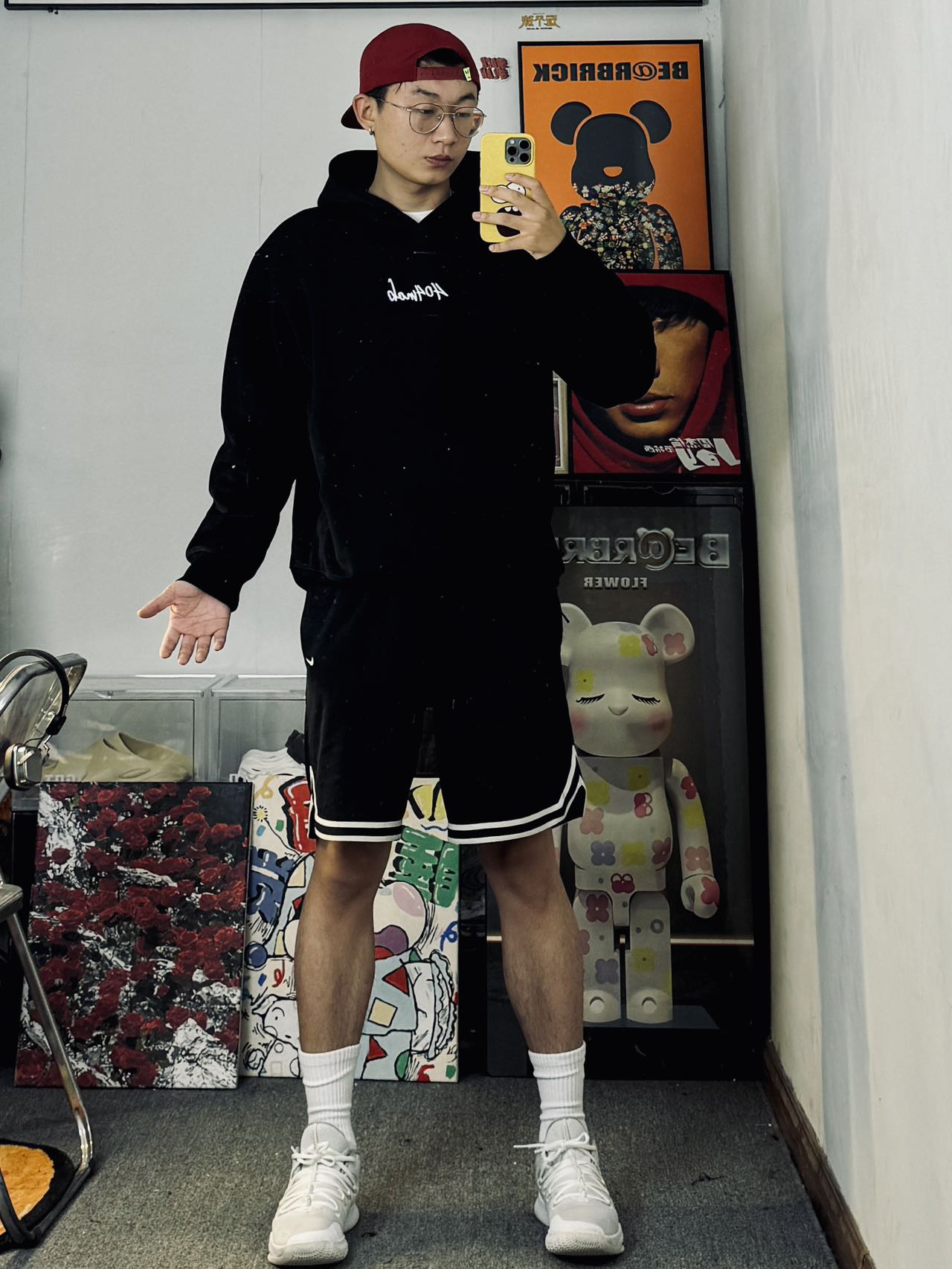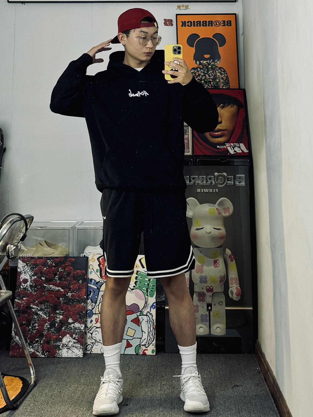 冰美式今日穿搭 兄弟们又到了穿卫衣打球的季节 上衣穿了一件黑色连帽卫衣 基础色搭配起来就是好穿 再配上一条同色系的运动短裤 简约清爽 少年感满满 配上一双白色的篮球鞋 出去打球了 兄弟们哈哈哈