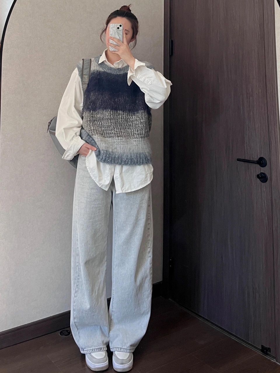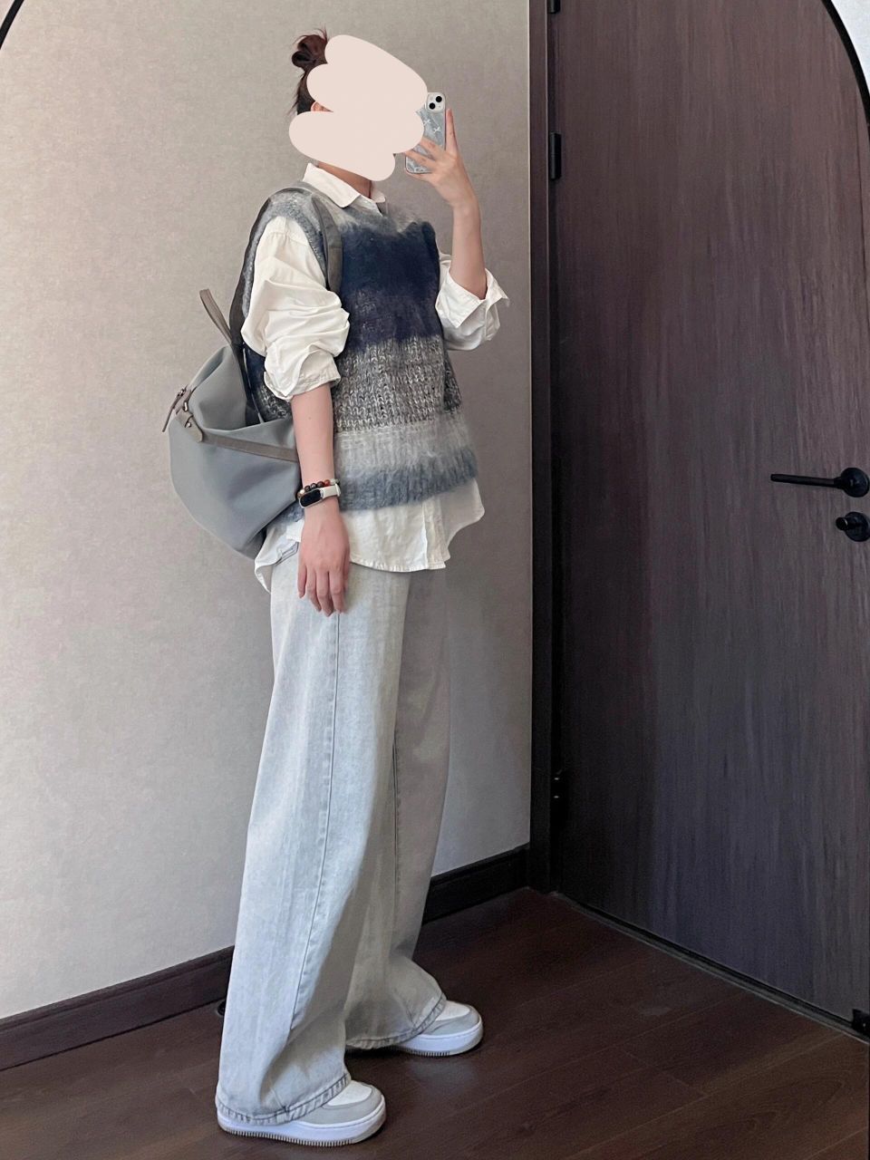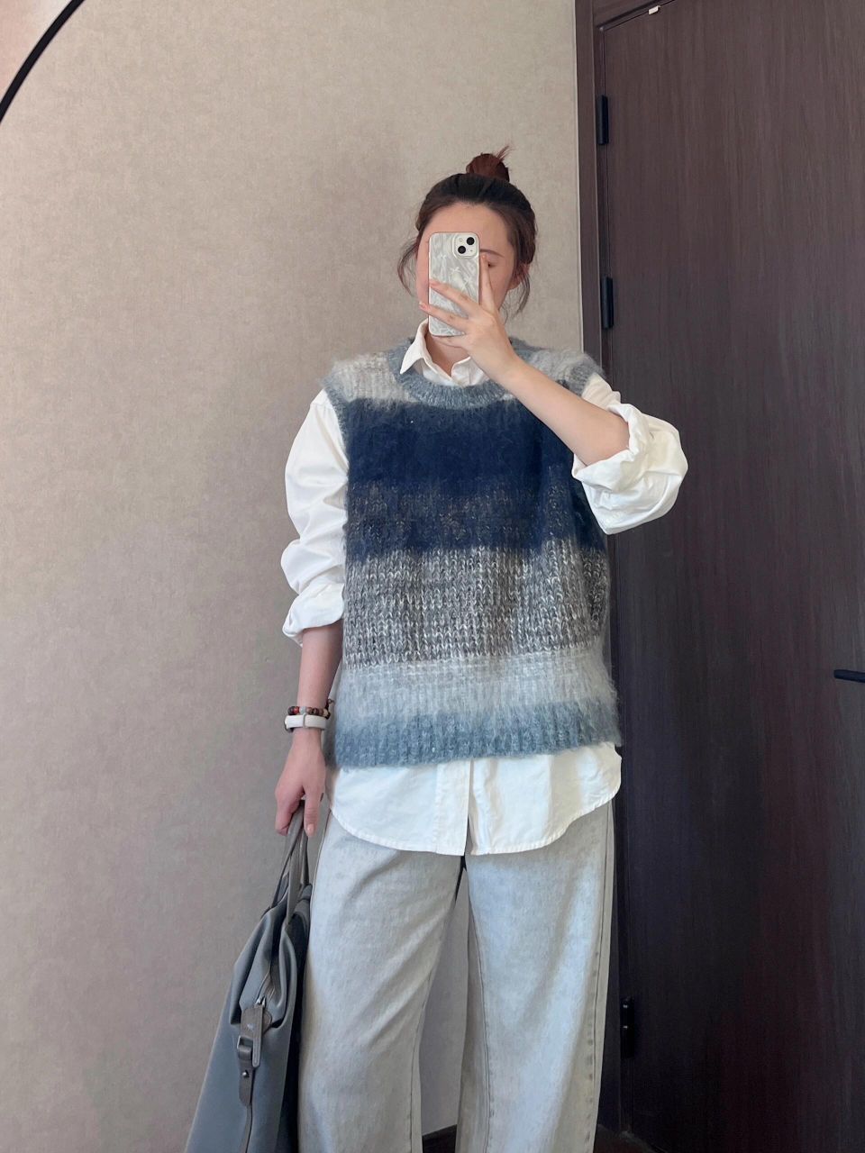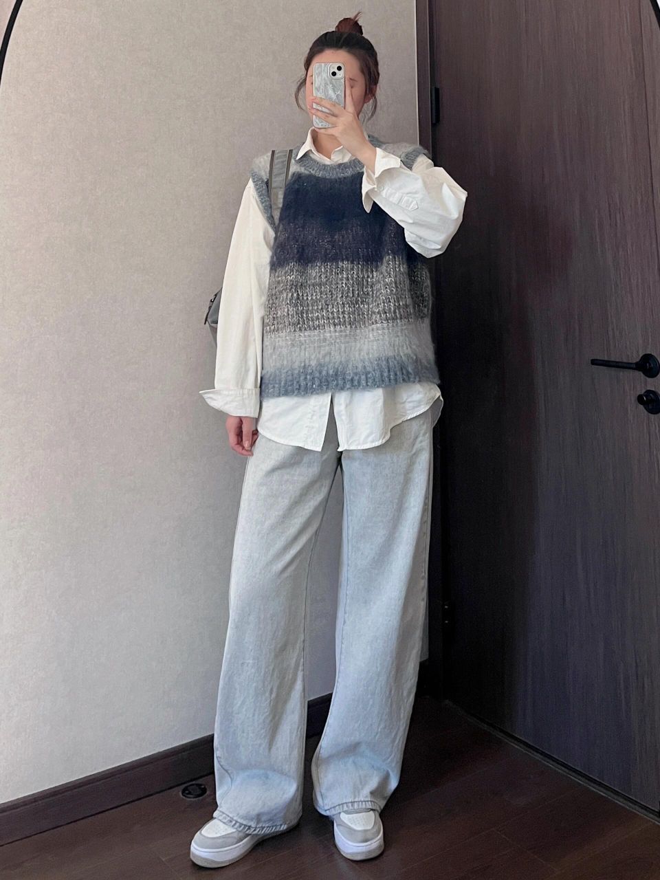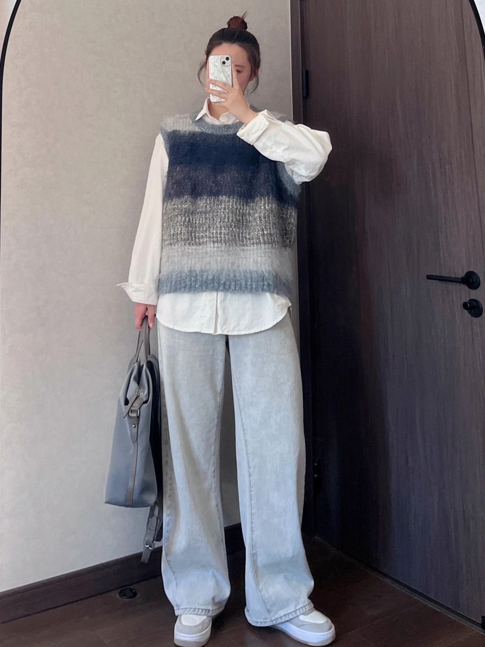 马甲是蓝灰色渐变,绒绒的有点厚度的那种,适合单穿或者冬天穿羽绒服奥,太单薄的外套会有点压不住~ ➕浅蓝色牛仔裤➕灰色双肩包,干净的少年感啊~