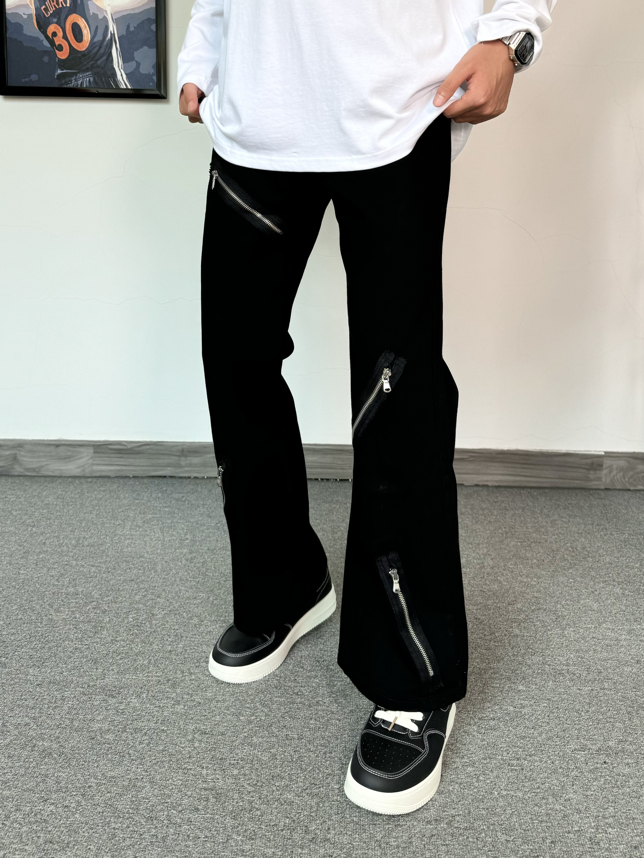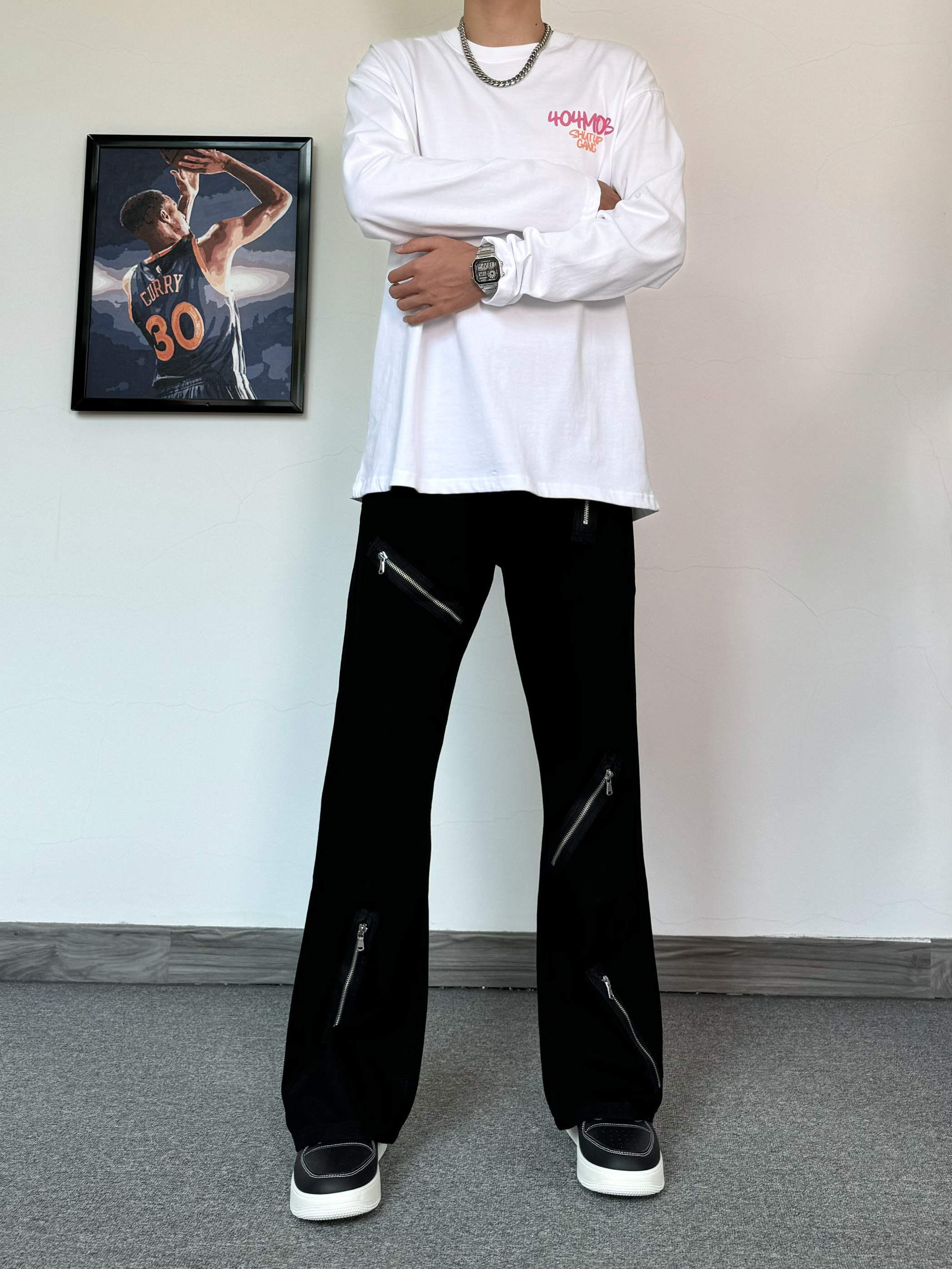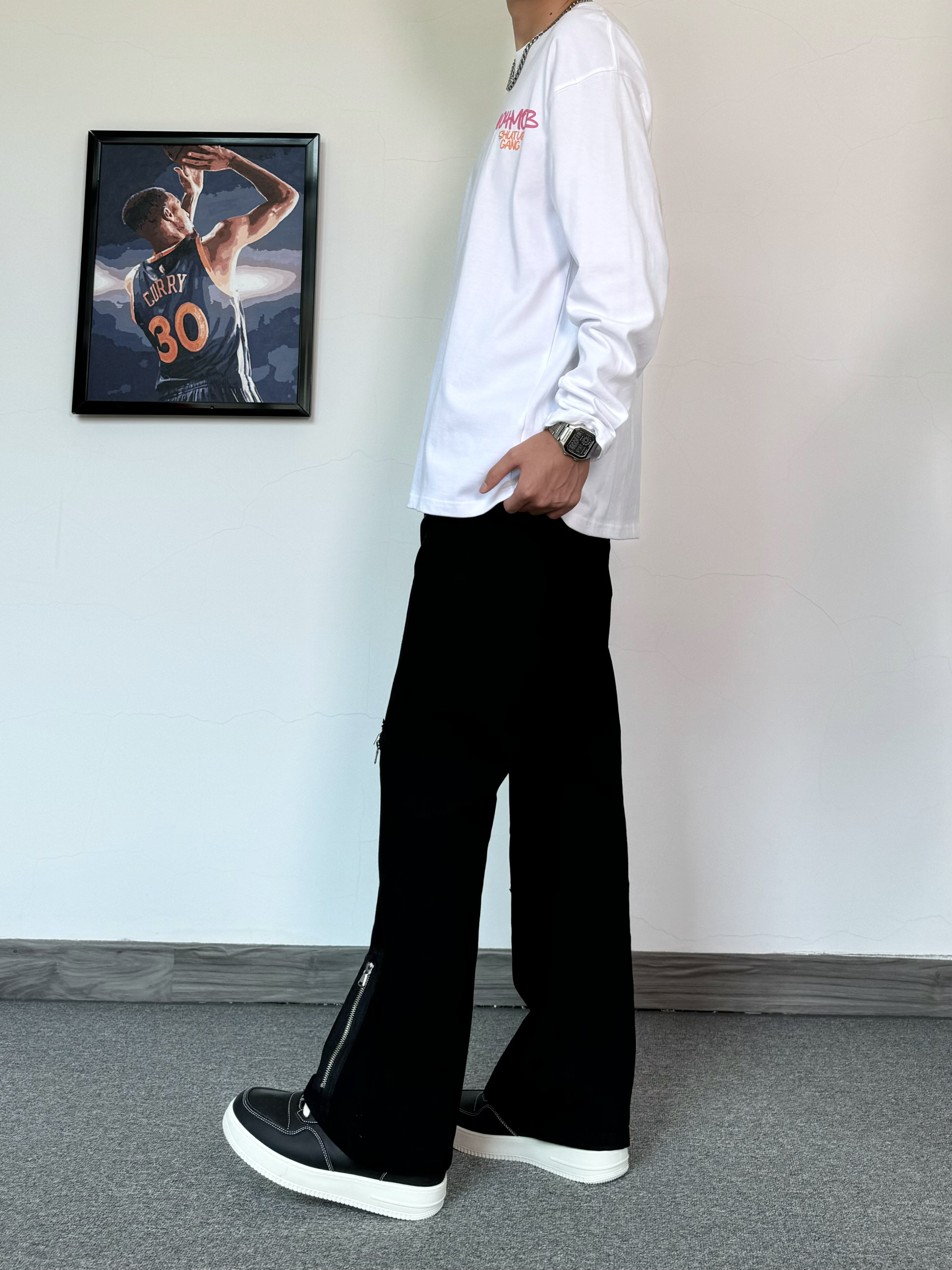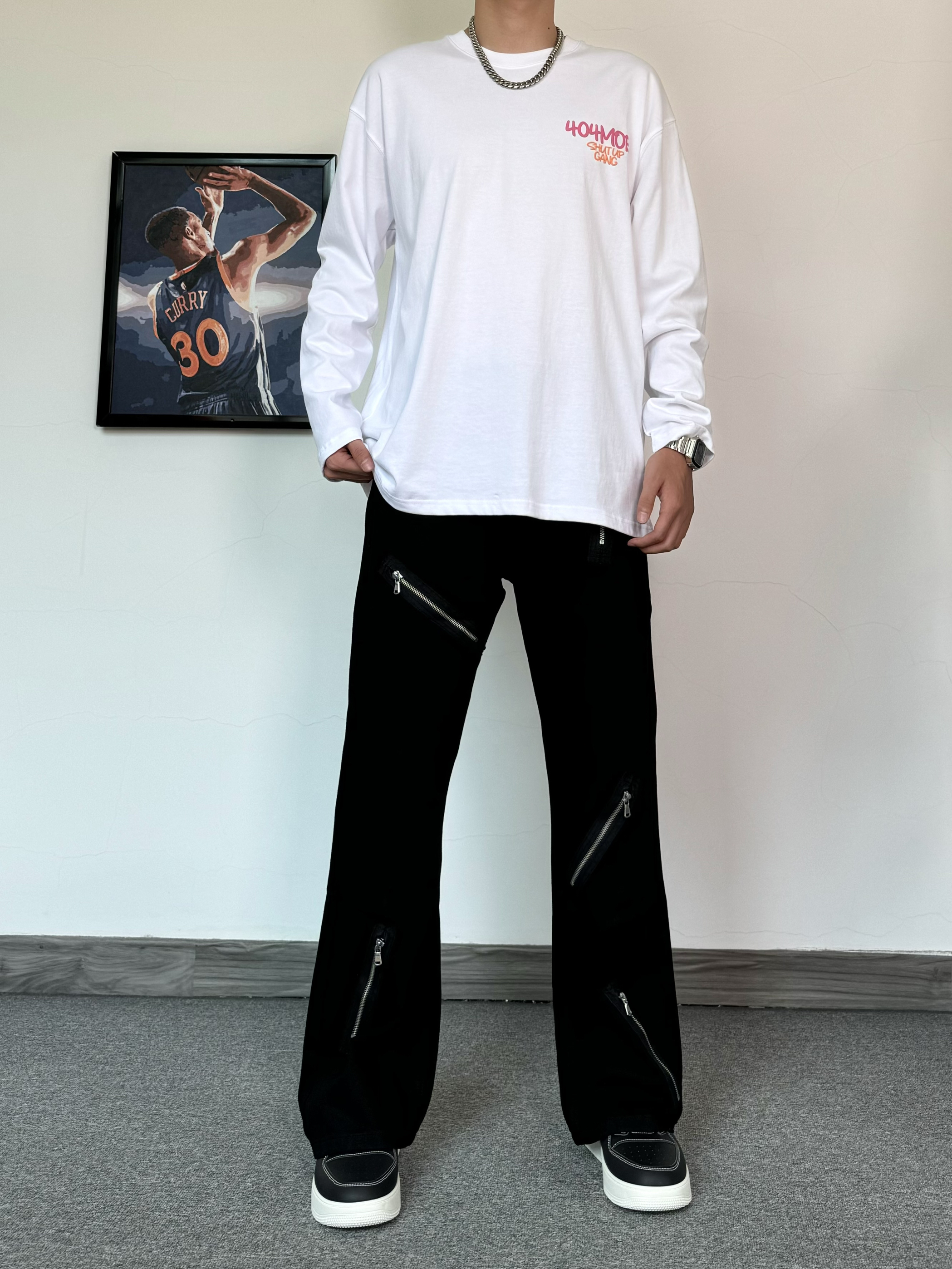 简约T恤真的是穿不腻~ 发泡印花质感满满 搭配微喇版型黑色牛仔裤 拉链设计也是很细节 搭配厚底板鞋 增高效果直接拉满!
