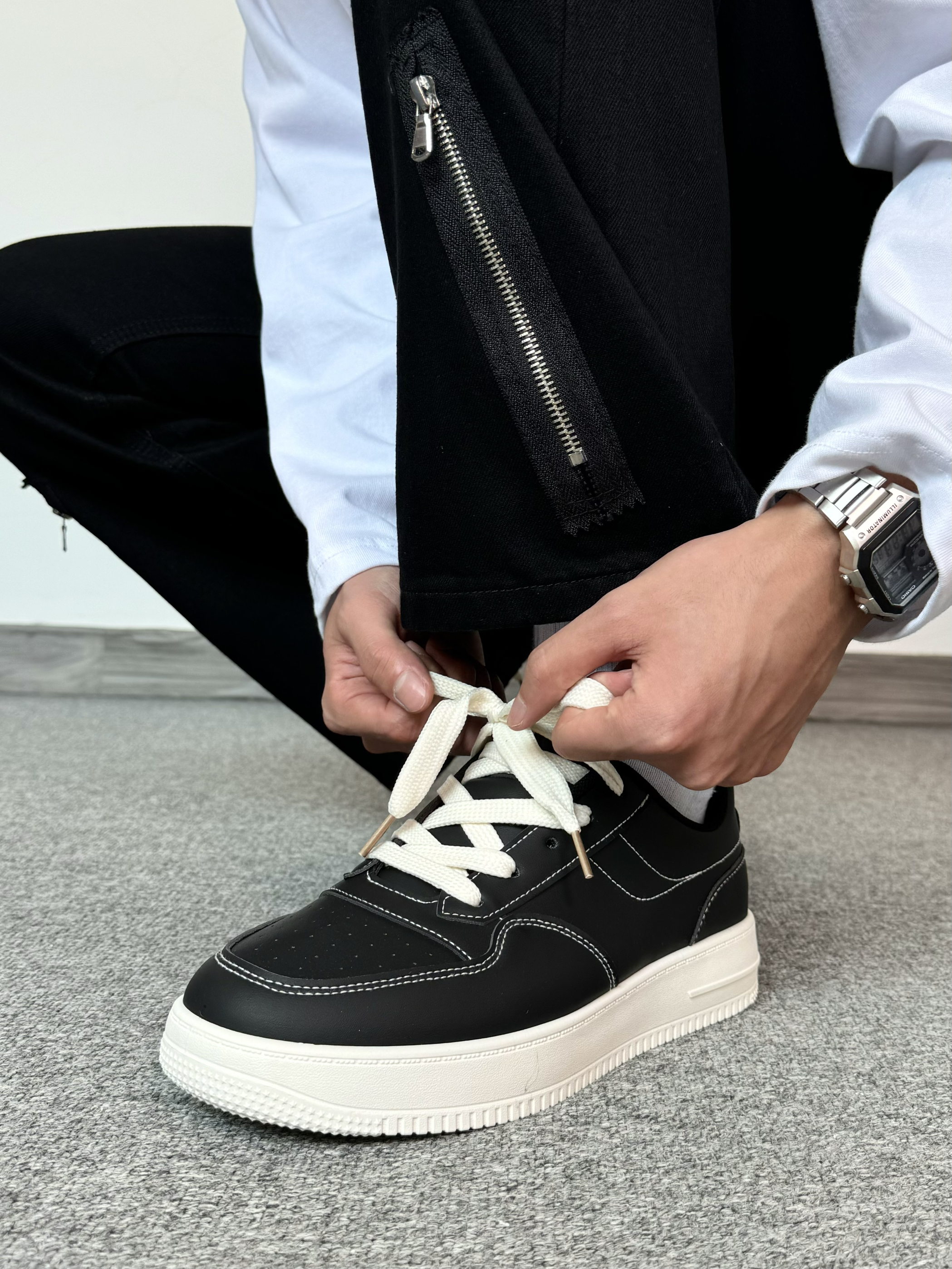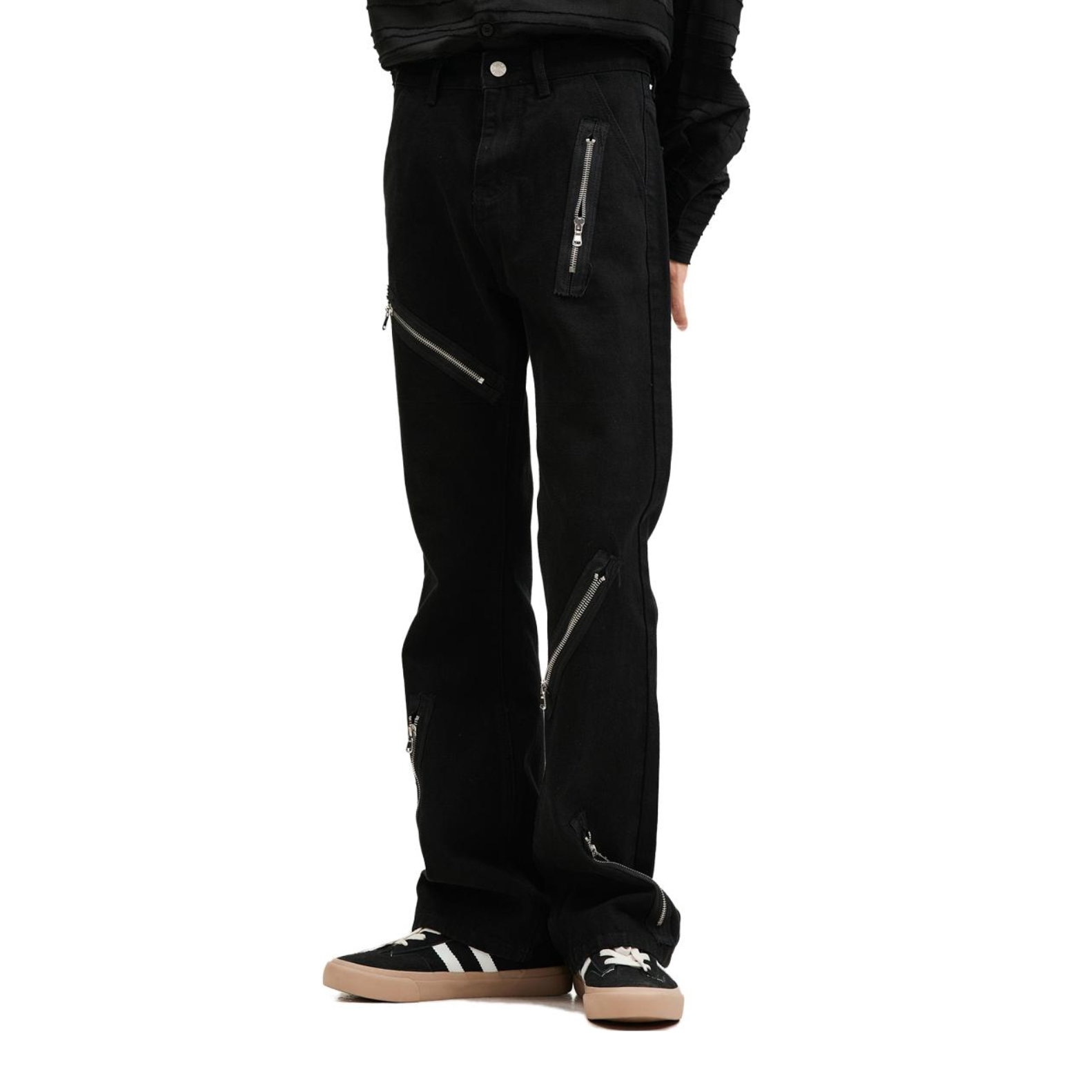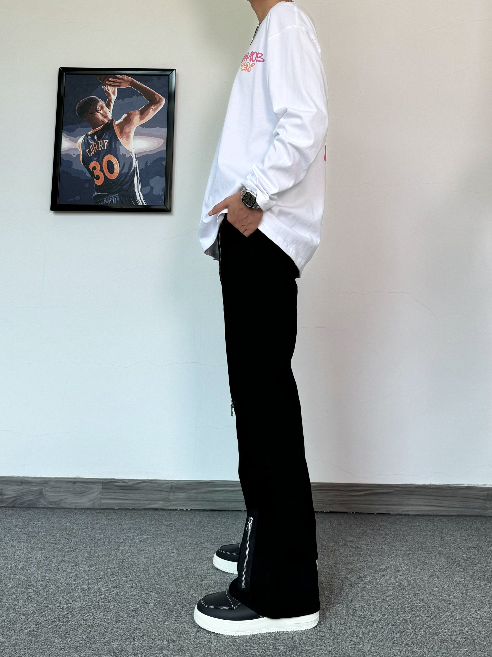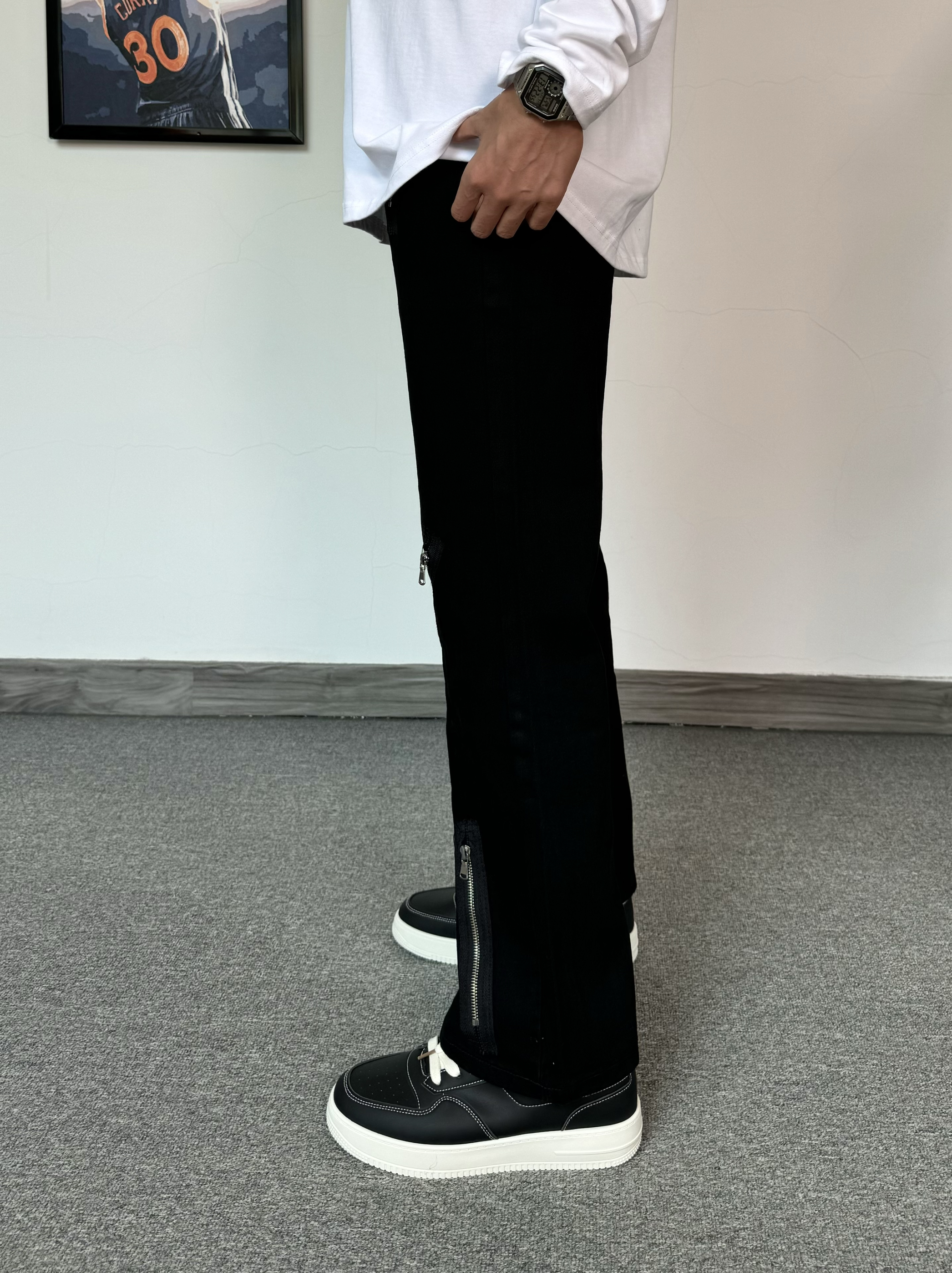 简约T恤真的是穿不腻~ 发泡印花质感满满 搭配微喇版型黑色牛仔裤 拉链设计也是很细节 搭配厚底板鞋 增高效果直接拉满!