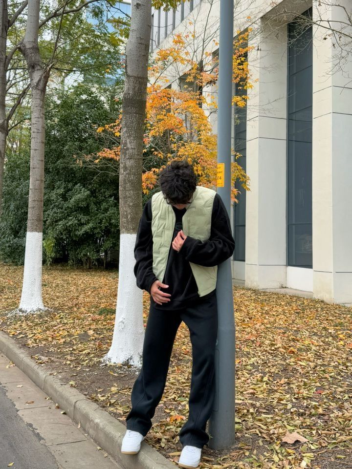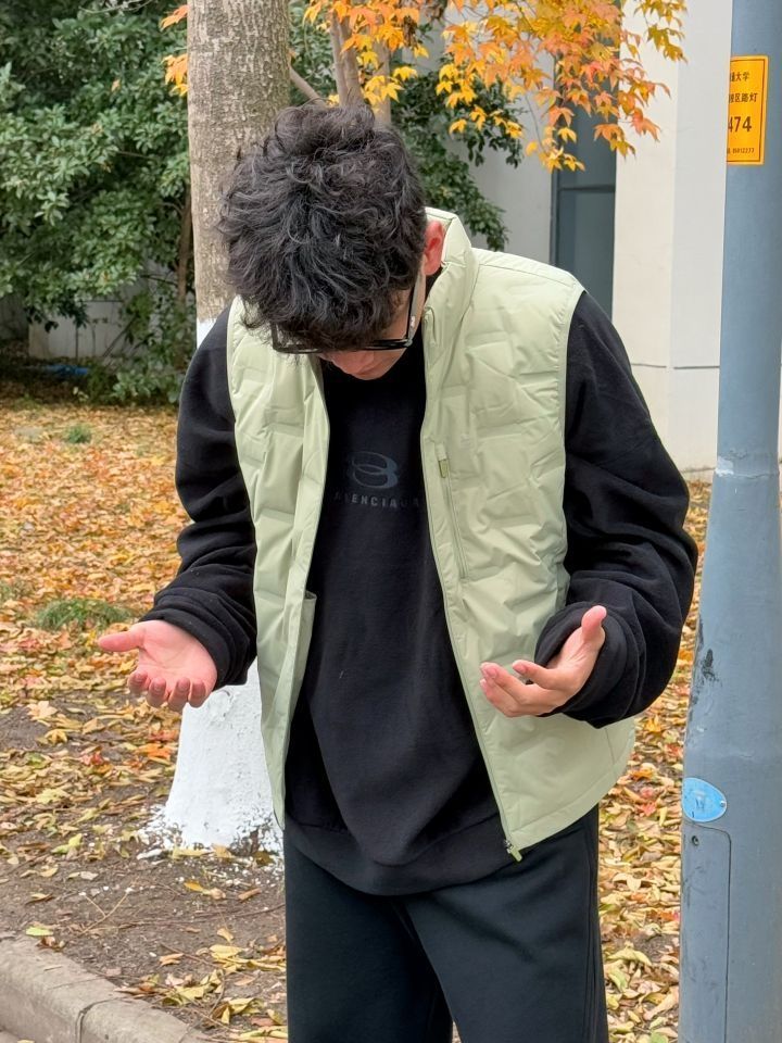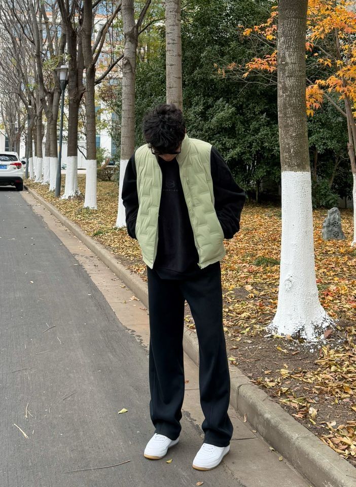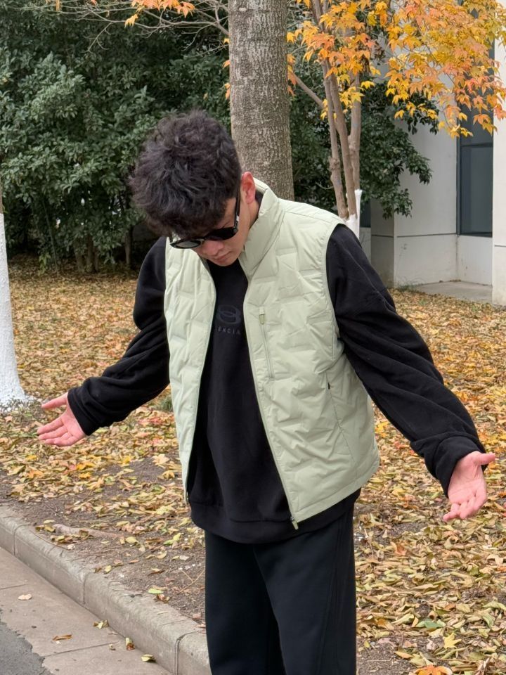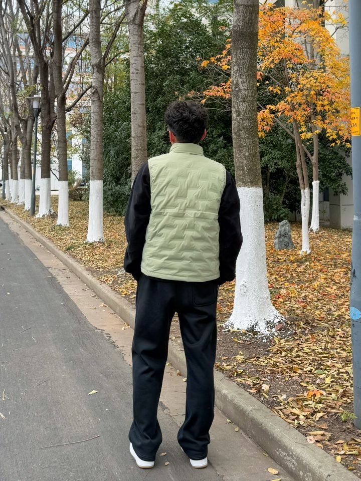 今天上身的是来自 BANANA IN 蕉内 的羽绒马甲,低饱和的浅绿色,看着就是冬日的温柔感 轻薄又保暖,叠穿黑色抓绒卫衣,质感刚刚好,显得干净又有层次感✨ 上身很好看 嘎嘎出片 非常适合日常通勤和出去旅游 搭配空军一号,简单又不会出错,清爽的白鞋和整体色调呼应得很到位!走在落叶小道上,随意一站都带着点生活的惬意和悠然🎨~