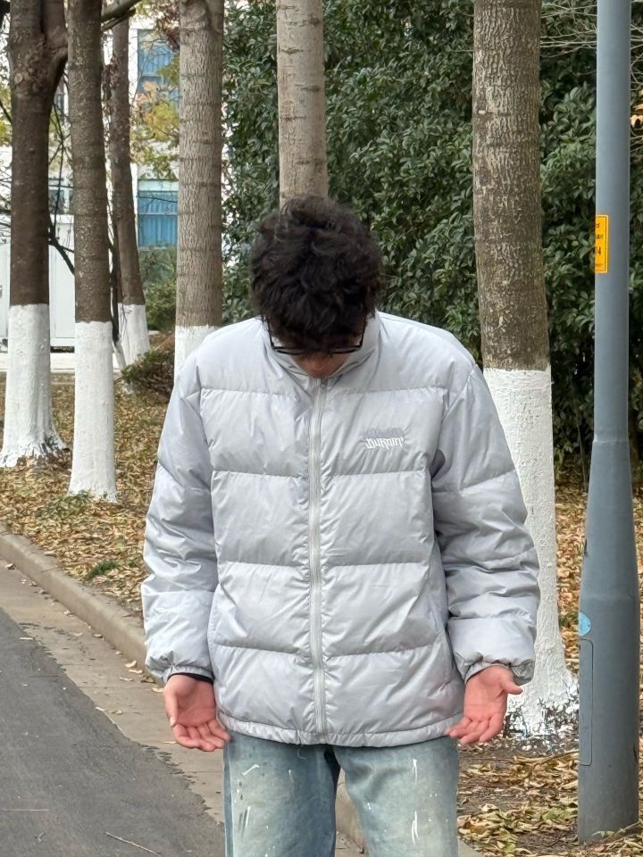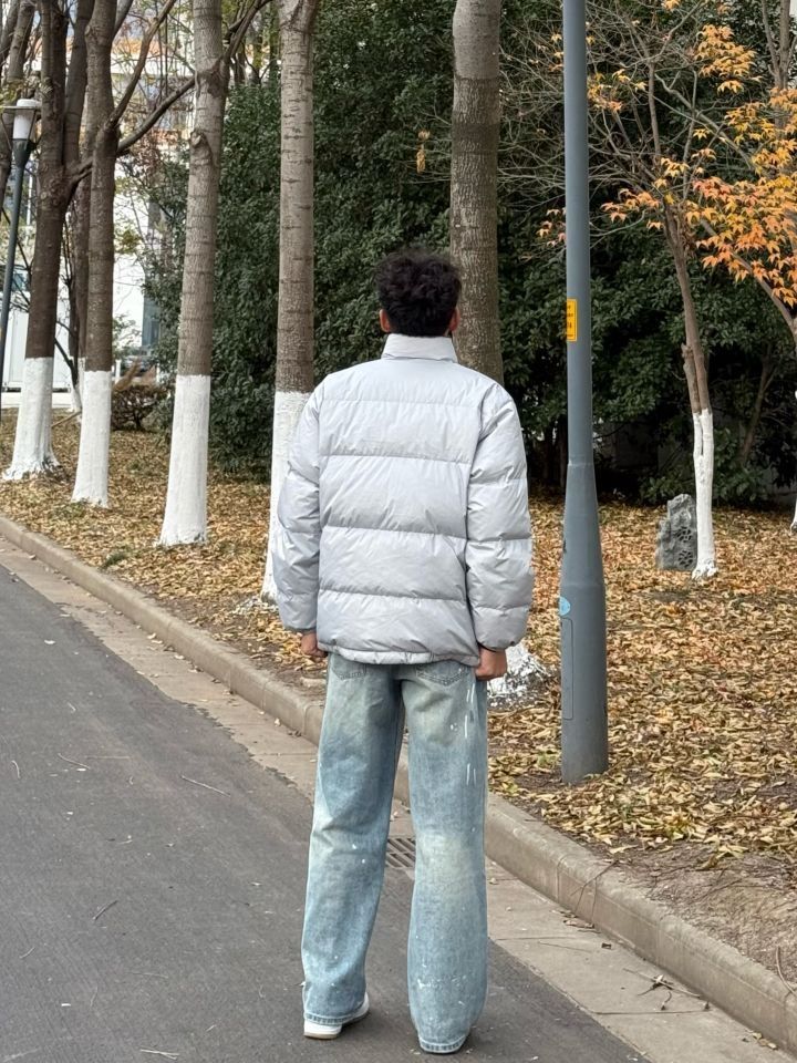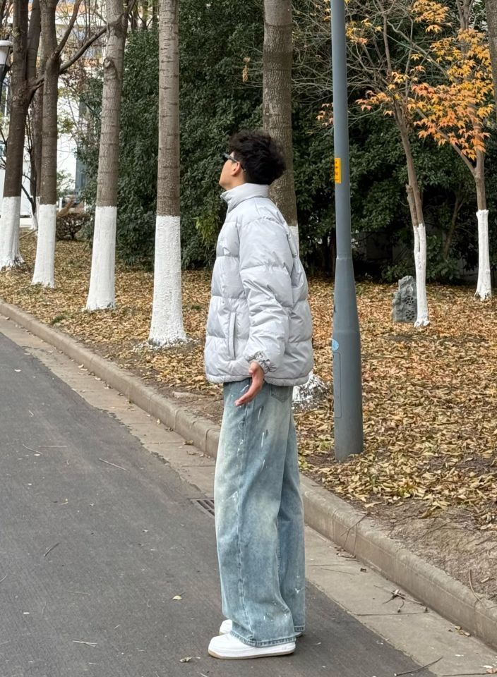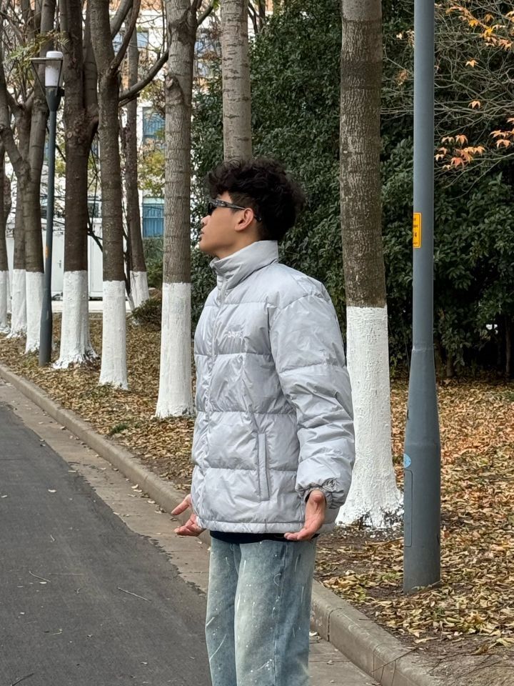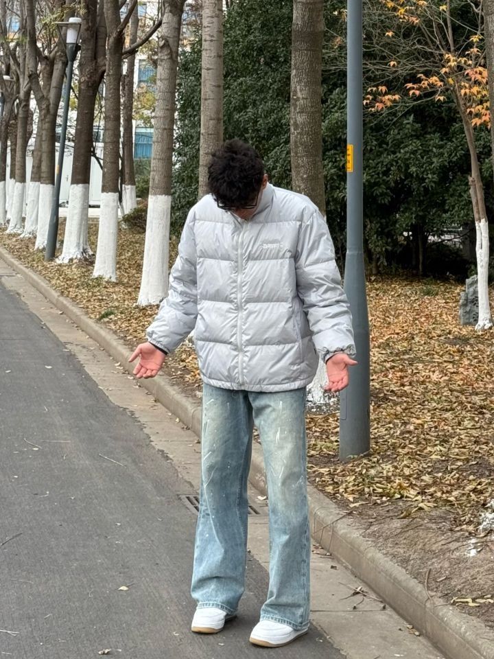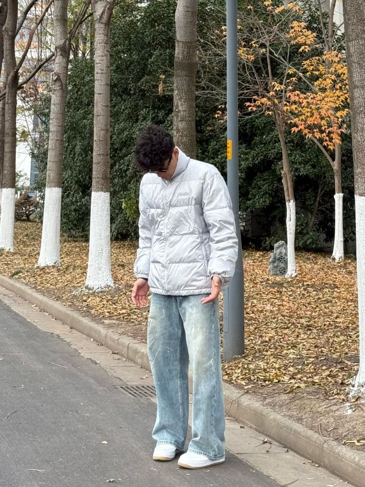 今天上身的是 BURNIN 家的羽绒服,这款羽绒服采用亮面灰色材质,低调又带有些许未来感,轻便不失保暖性能,刚刚好适配冬日户外穿搭。刺绣logo位于胸前,细节拉满,轻松提升整体质感 裤子的泼漆设计让整套穿搭更添街头艺术氛围,版型宽松不拘束,行走间彰显随性和舒适 经典百搭的Air Force 1低帮板鞋,白色外观与整体穿搭协调呼应,同时橡胶鞋底提供稳固支撑,无论日常出街还是轻运动都很有感觉