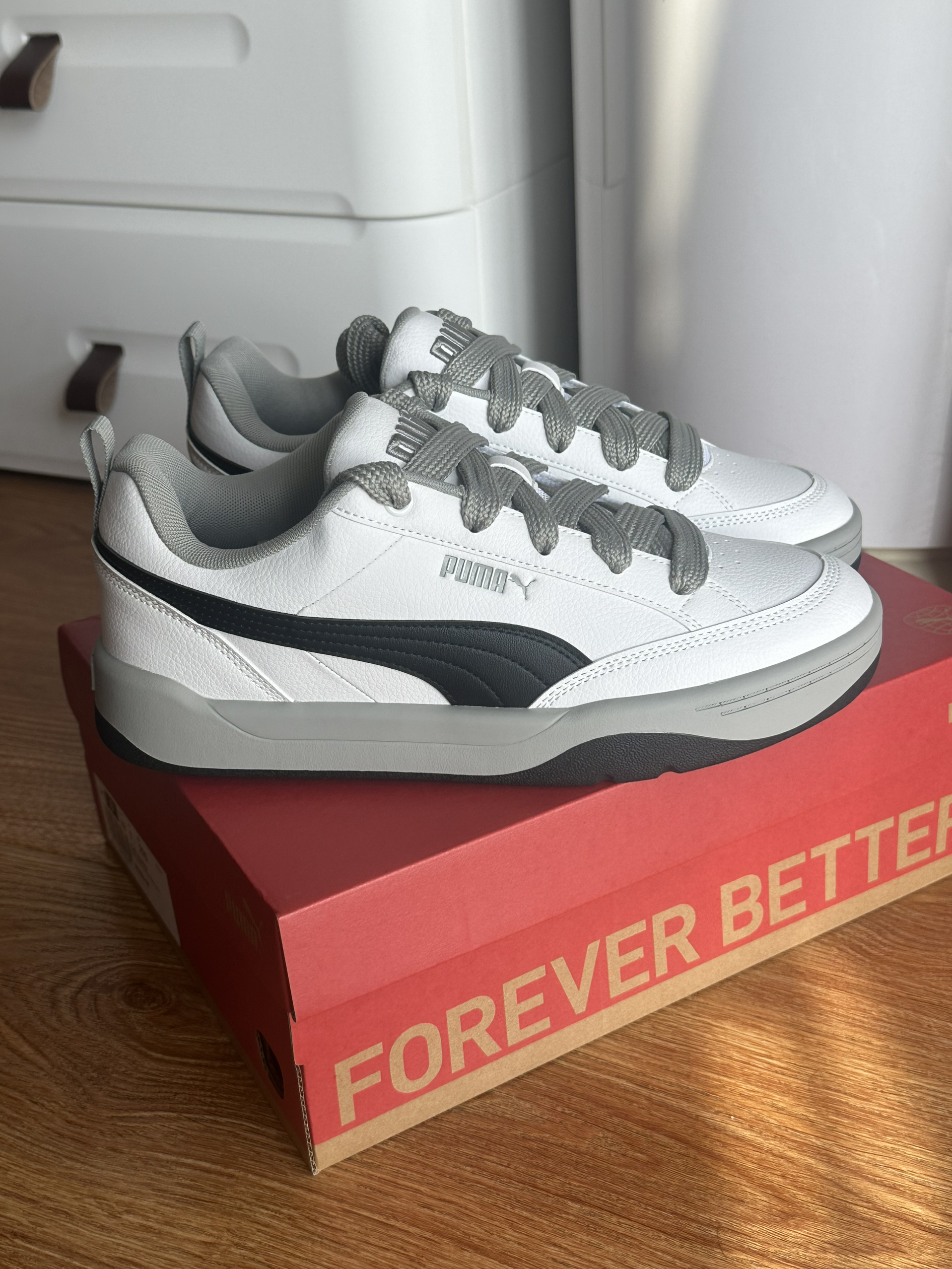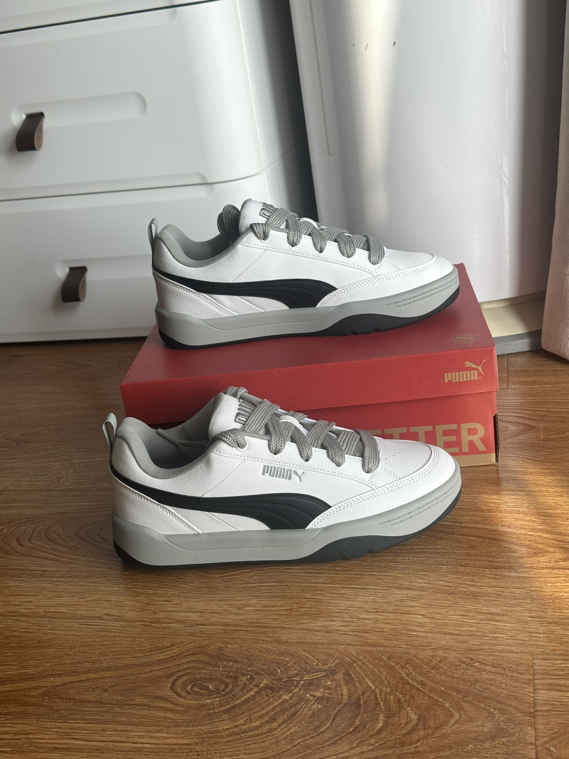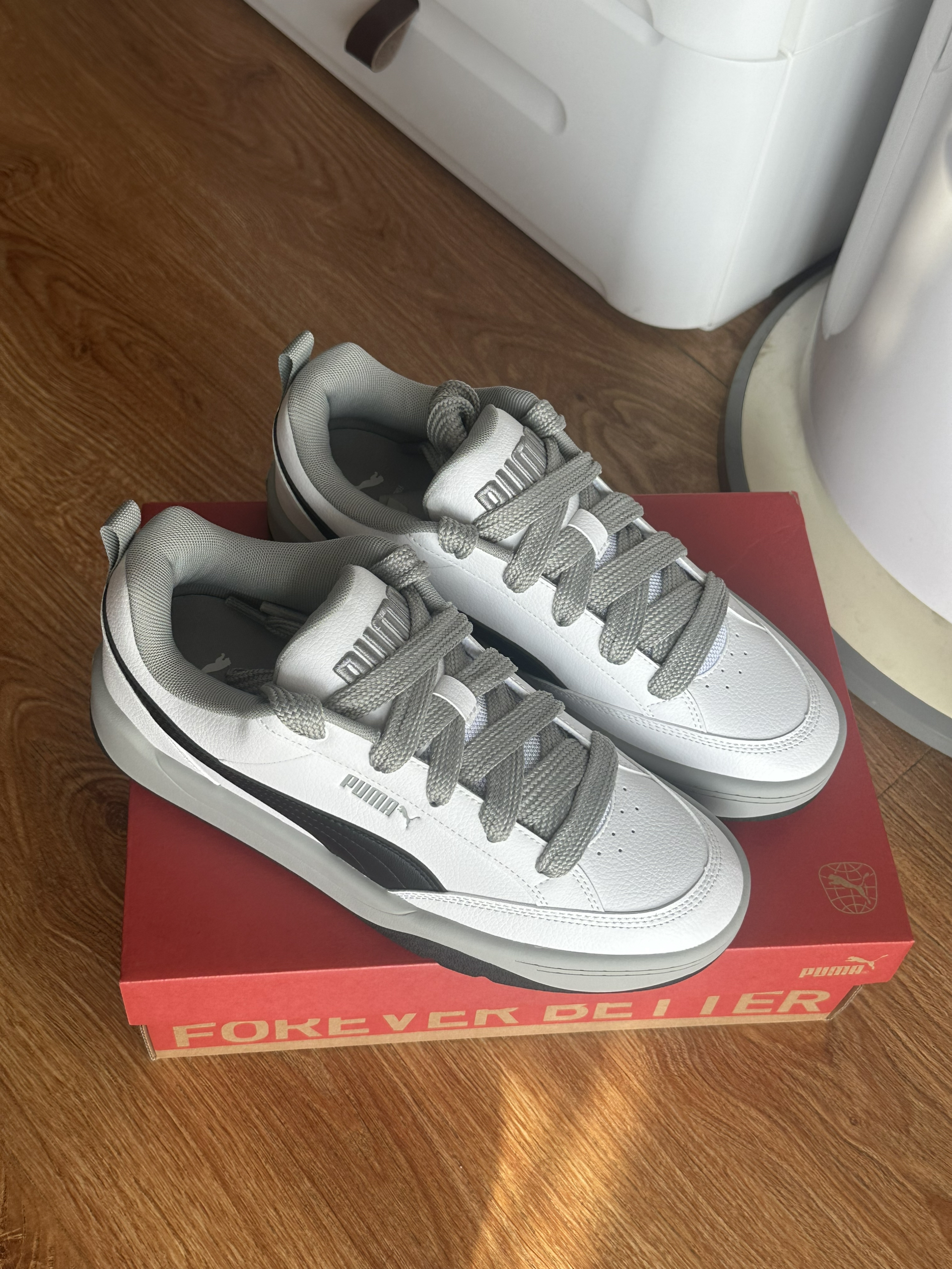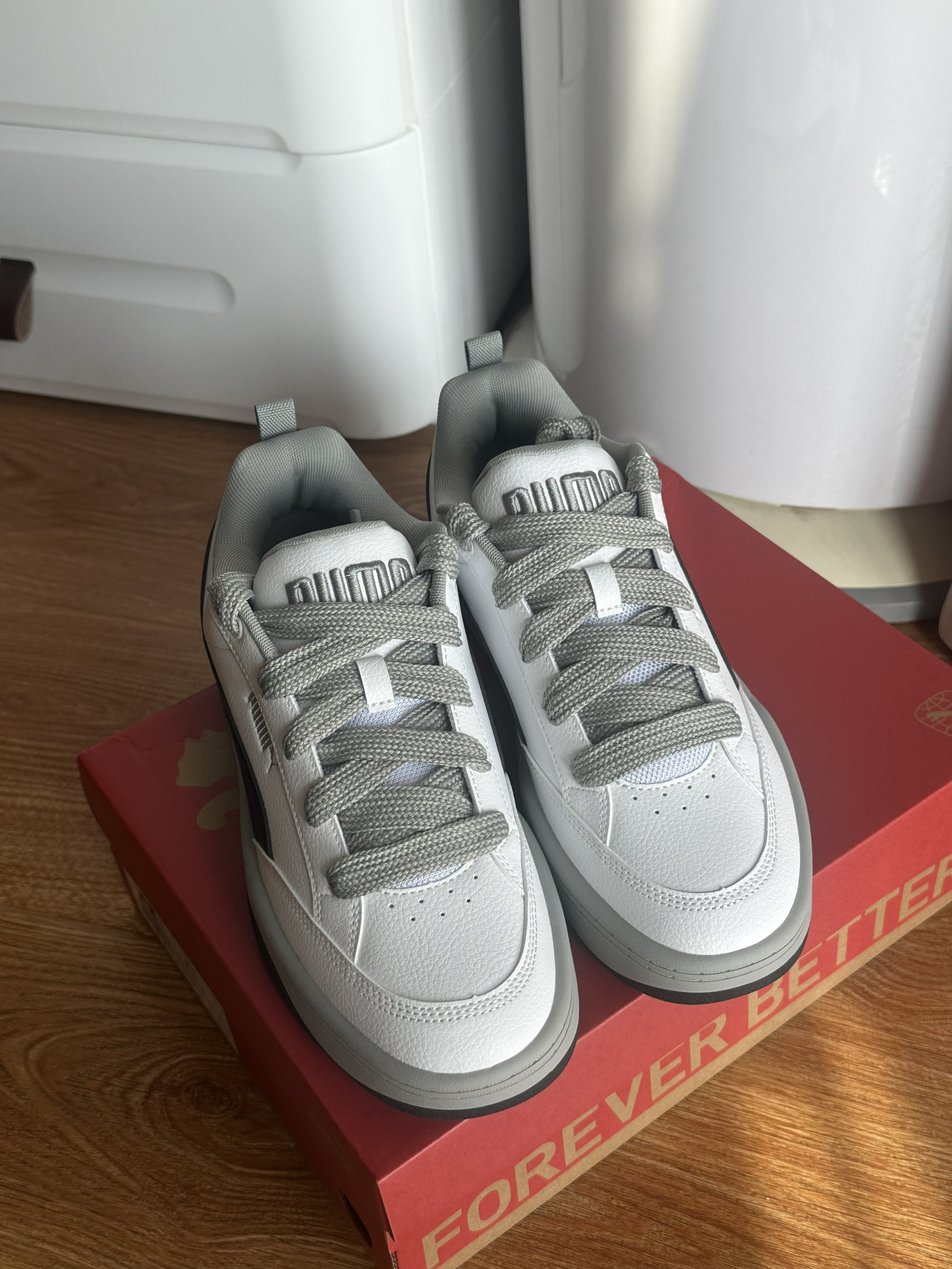 哈喽 今日分享puma板鞋 经典的黑白灰设计 粗粗的鞋带有种特别的感觉 时髦又有松弛感,颜色搭配的恰到好处 有一点增高的设计,男女同款 我个人是非常喜欢这双设计的 搭配起来也不费力, 牛仔裤,卫裤,运动裤,工装裤, 女生甚至可以瑜伽裤,小裙子