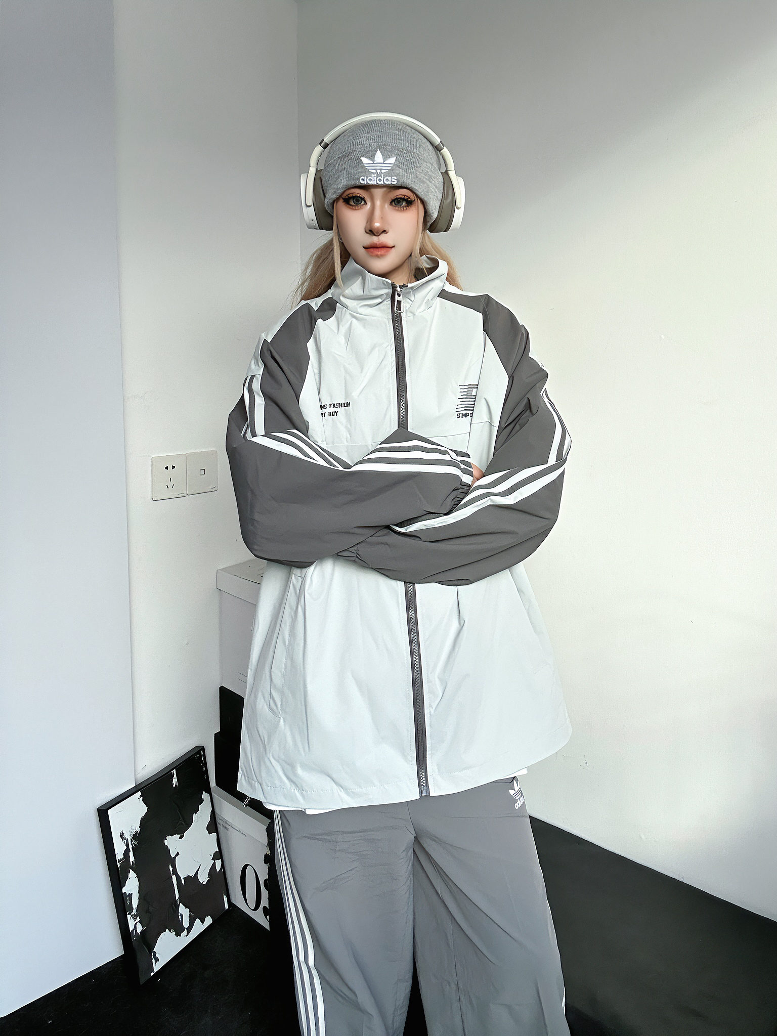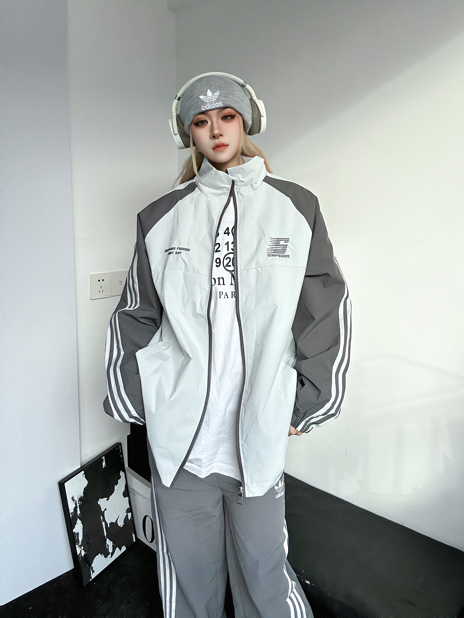 今日上身辛普森一家夹克外套 雾霾蓝拼接灰色很高级 袖子的三条杠赔礼休闲感满满 搭配阿迪条杠的阔腿裤 这套三条杠休闲套装绝了