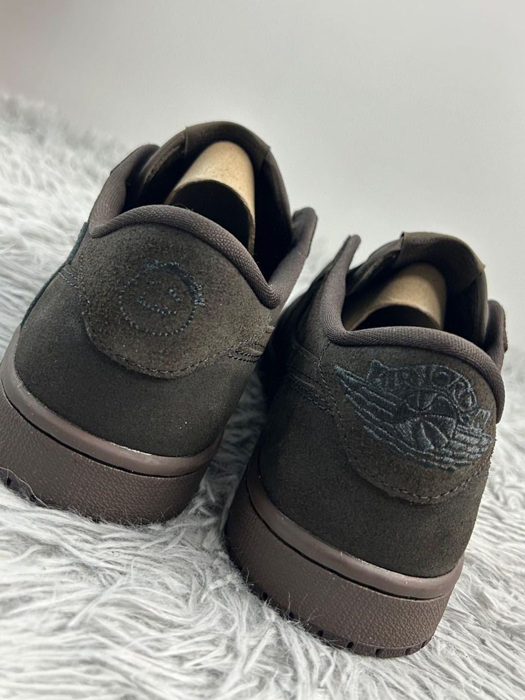 各位对本次AJ1倒钩9.0的配置已经相当熟悉,超高辨识度的棕色,以及经典的Travis Scott式设计方式。 鞋面和中底全部纯色丝绒摩卡色调打造,确实是适合秋冬搭配,但颜值就见仁见智了......鞋面采用丝绒摩卡色为基调,同时使用了全新的麂皮材质打造,Swoosh则以黑色荔枝皮革搭配。