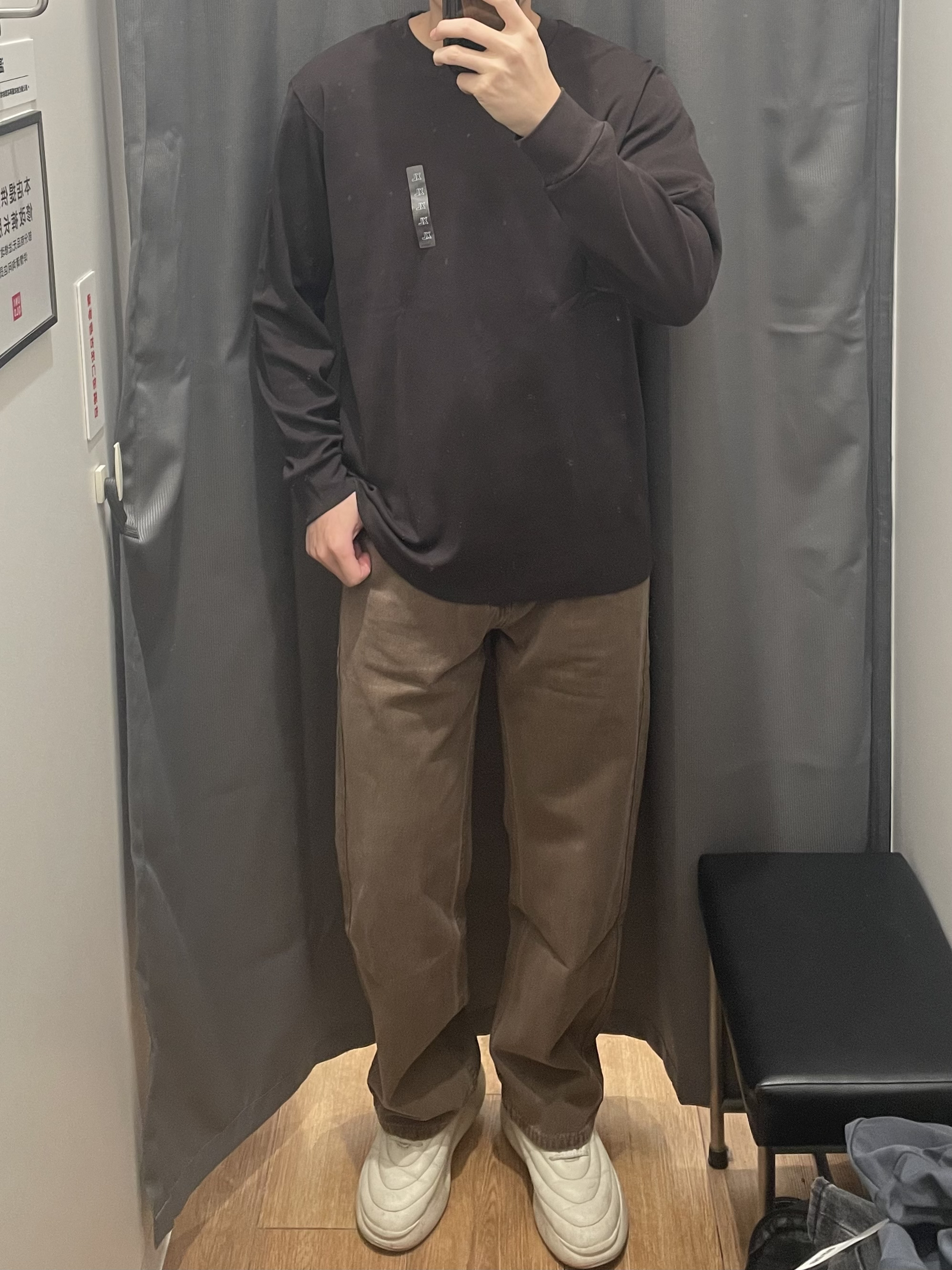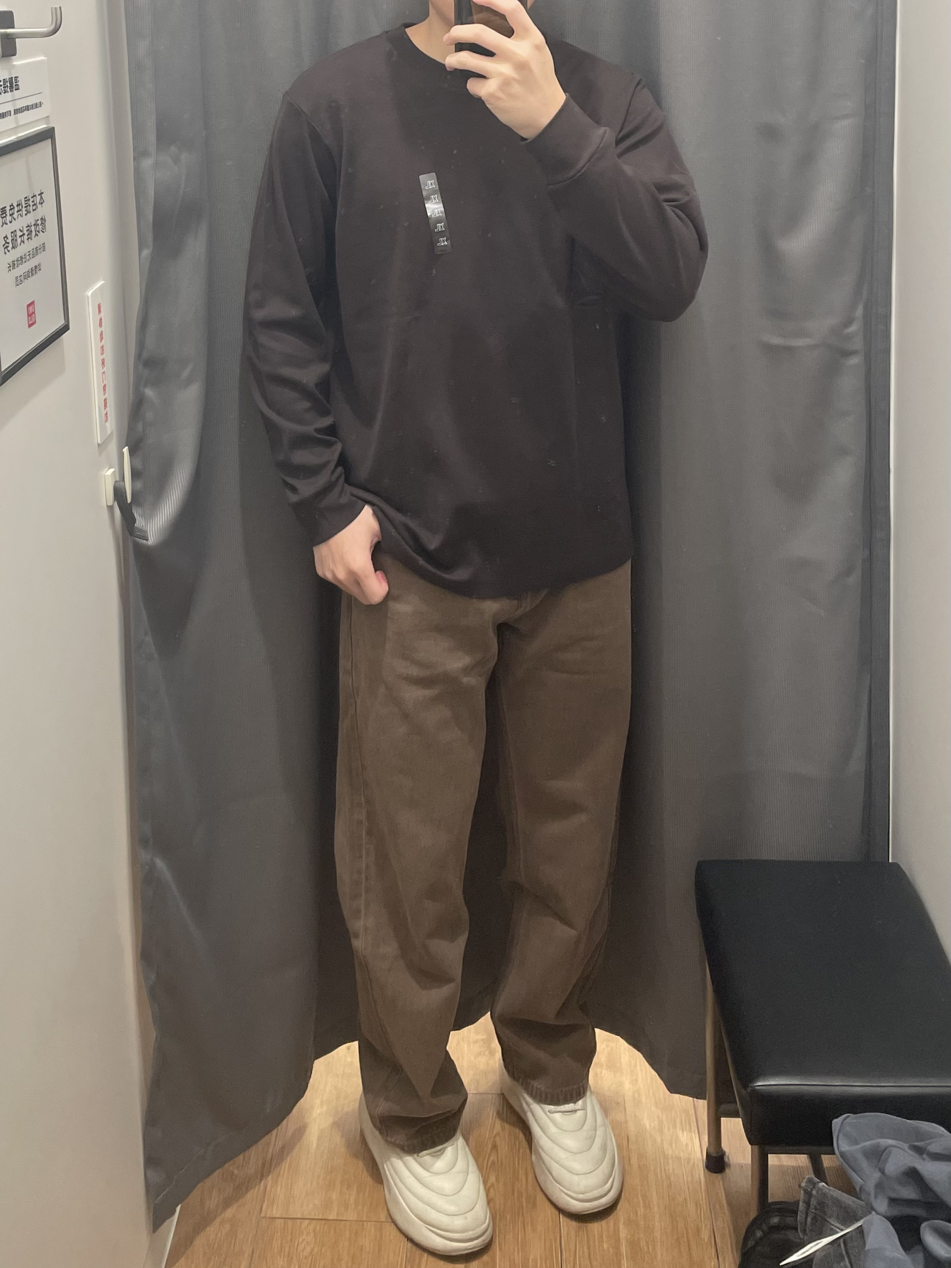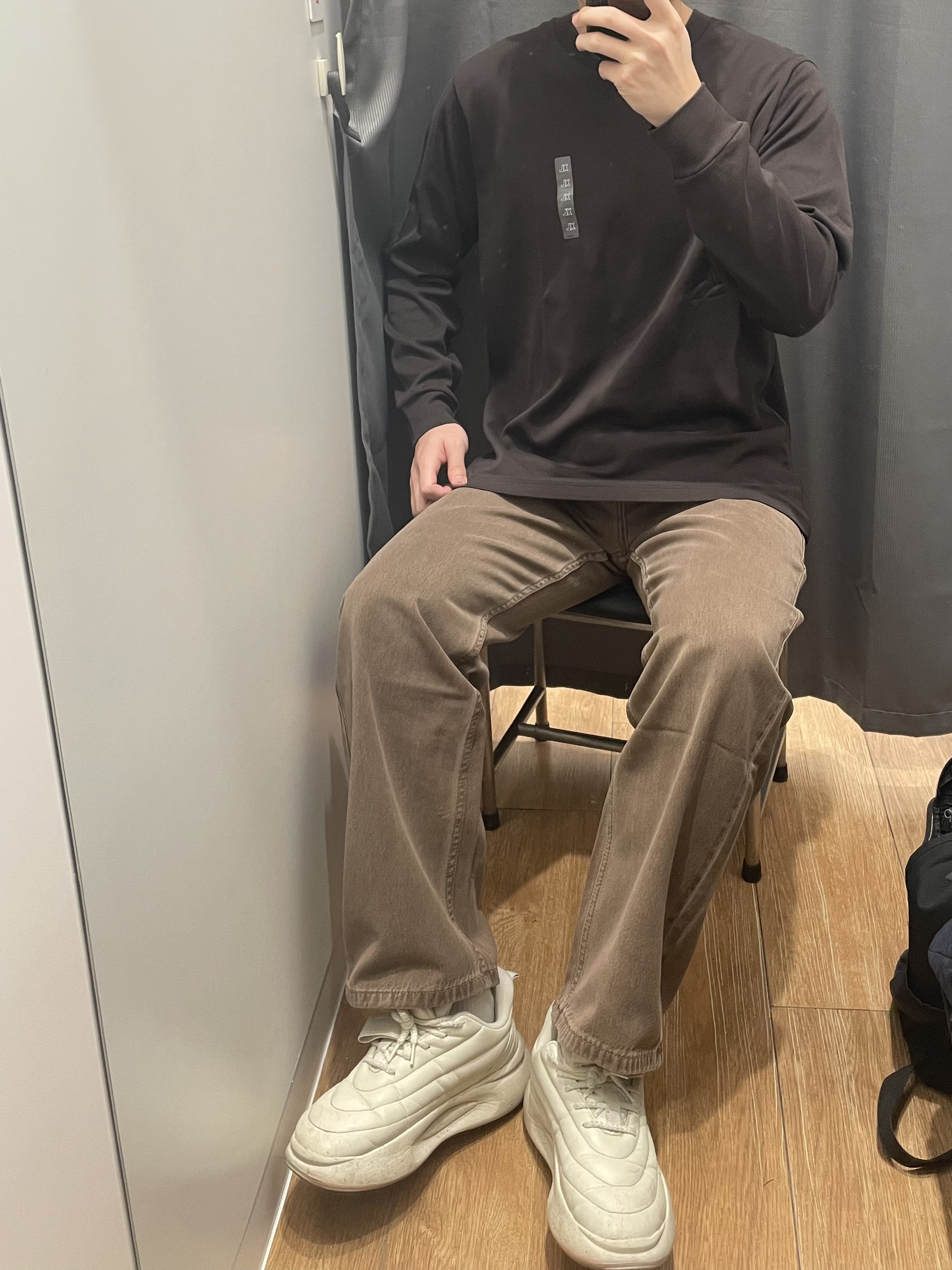 优衣库同色系穿搭怎么能不好看呀!! 深卡其牛仔裤 复古系!校园风满满‼️ 搭配优衣库的深棕色长袖!同色系公式穿搭真的好可!!