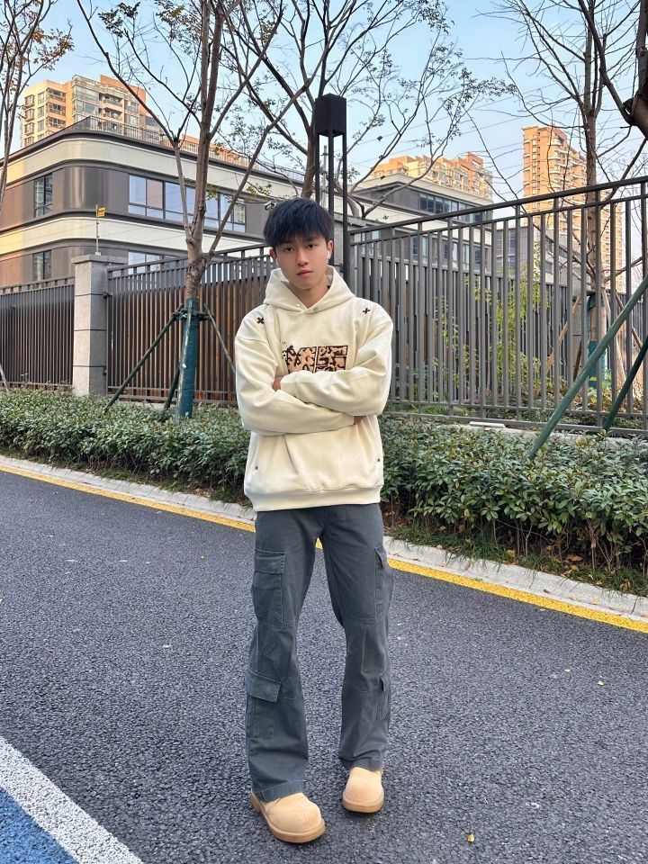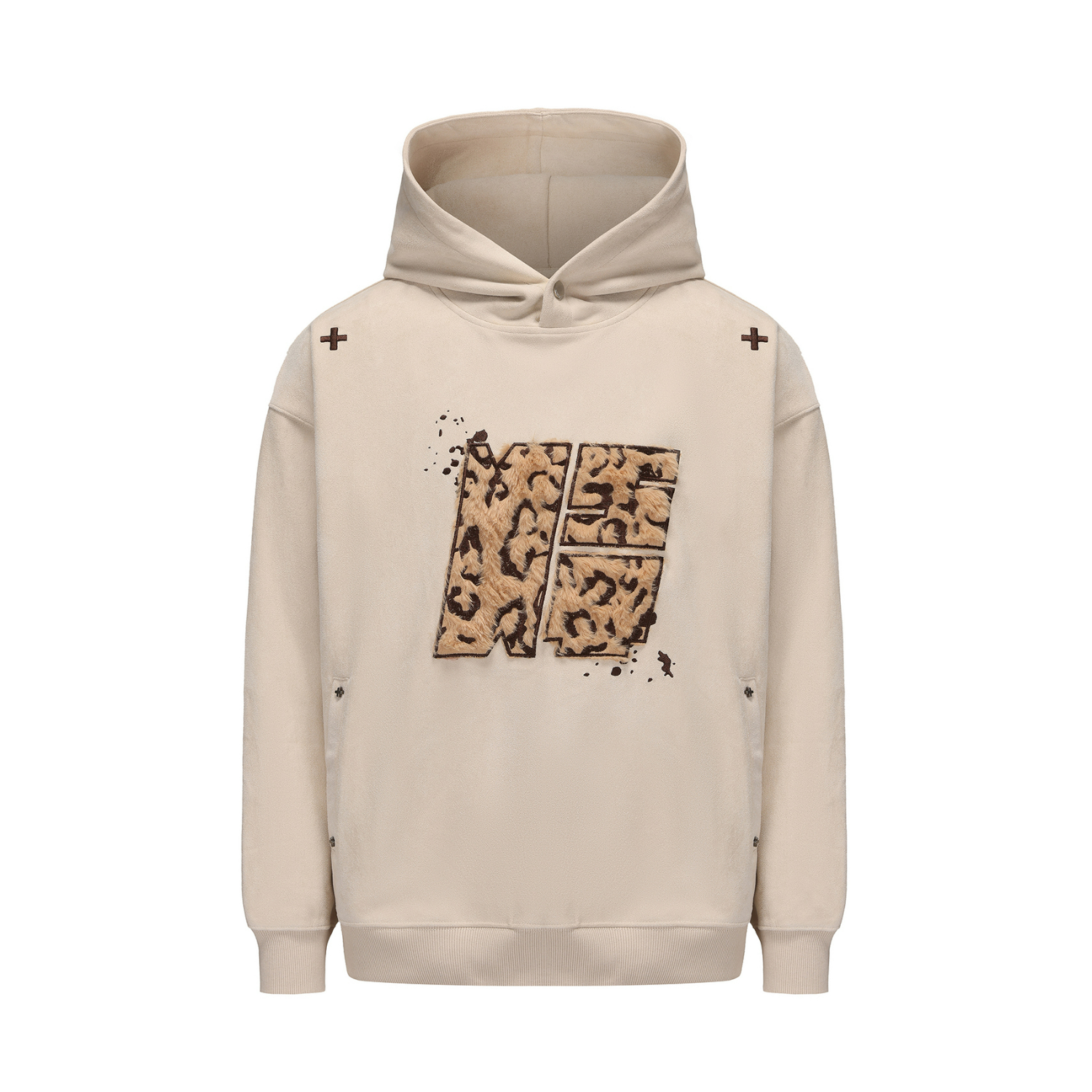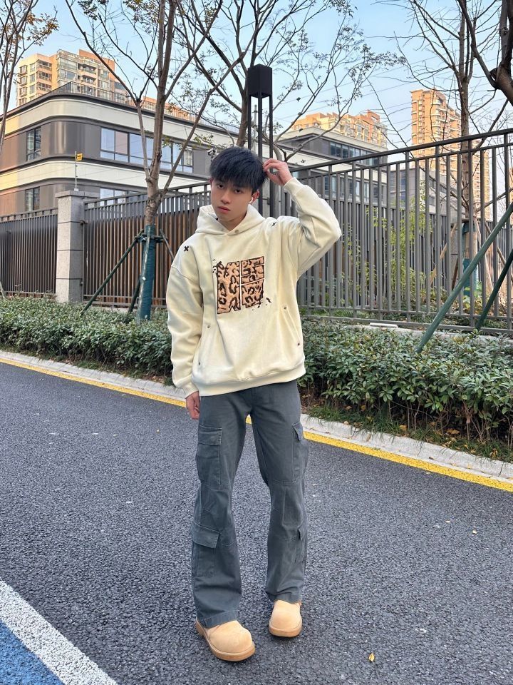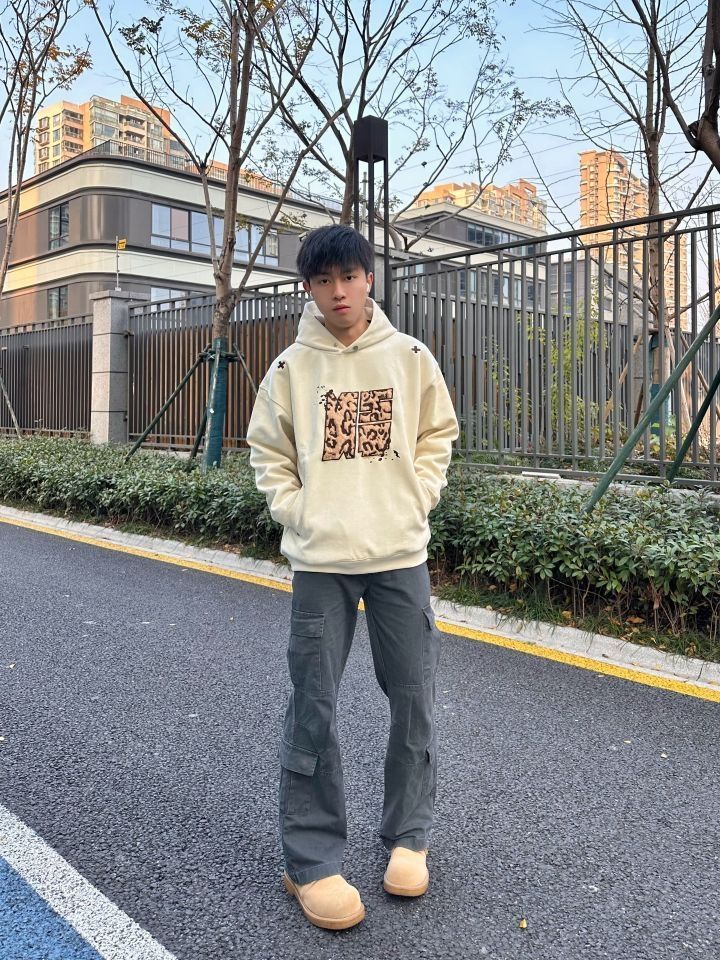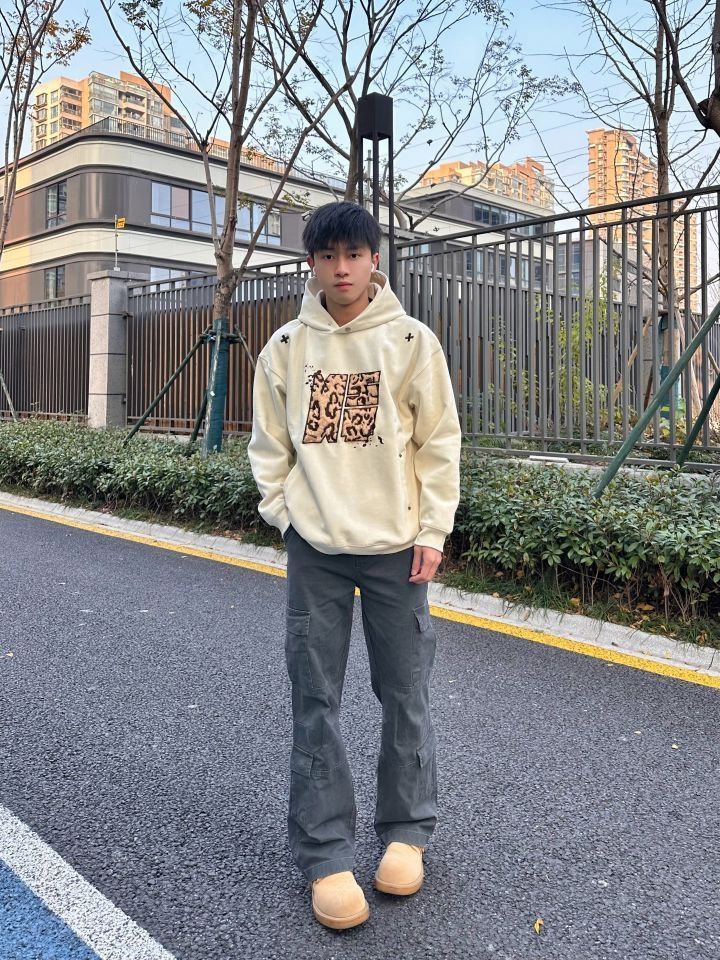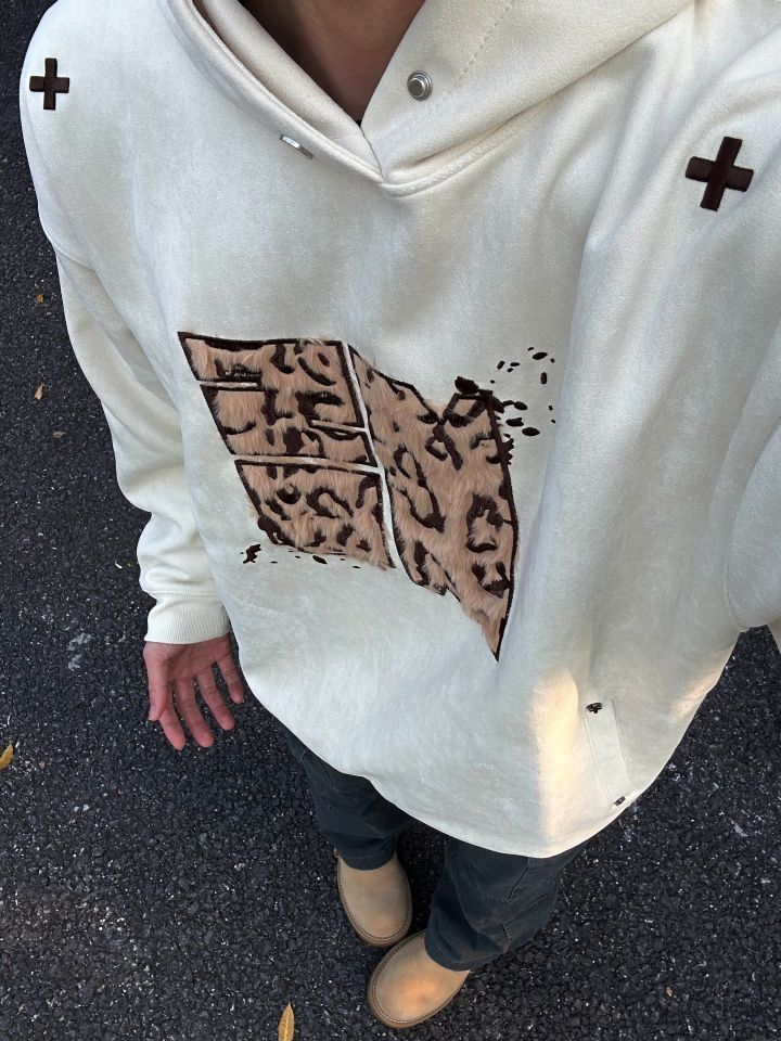 今天的穿搭非常有层次感 上身的卫衣来自 NSTNEW START 麂皮面料 宽松版型 胸口大贴布刺绣 动物豹纹的感觉 前后“➕”刺绣真的很好看诶 领口做了小纽扣设计 冬天冷可以扣上 一件能多穿实用的单品 在秋冬天很需要