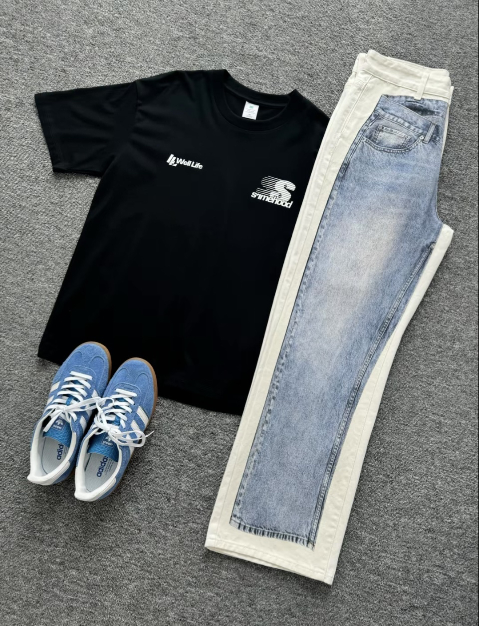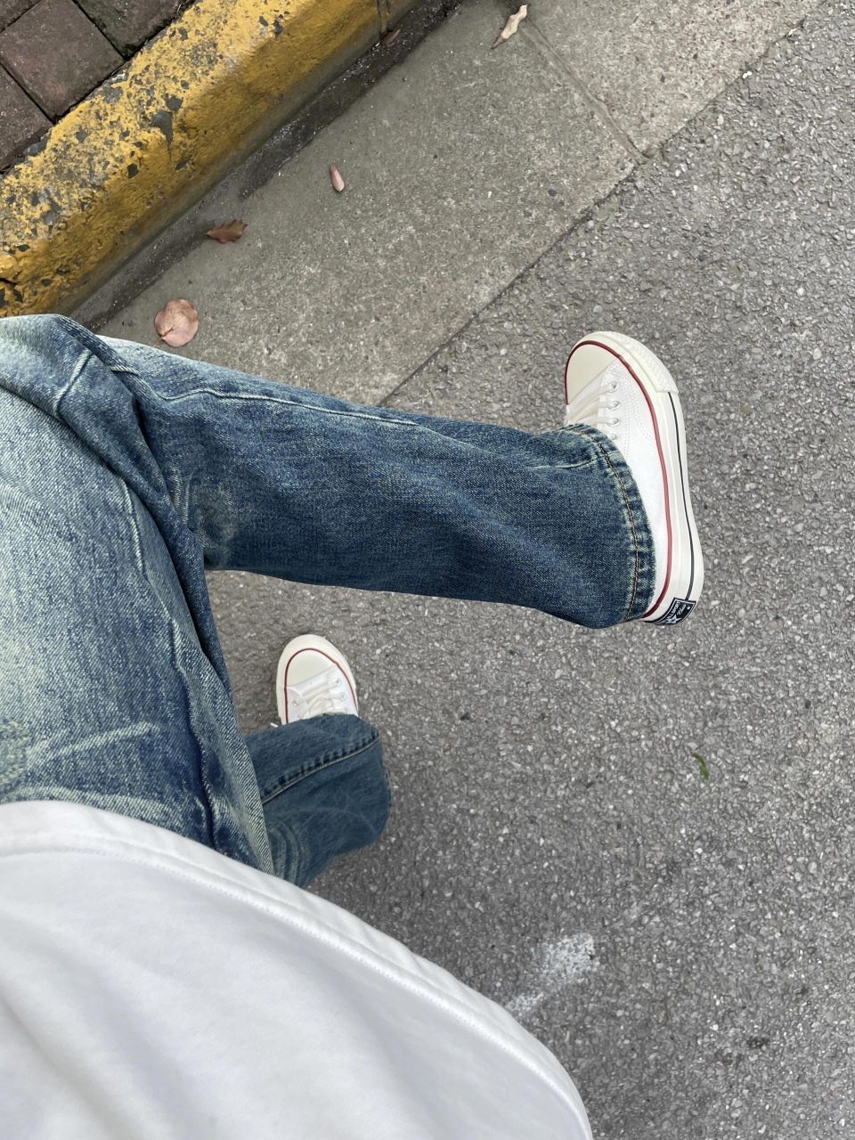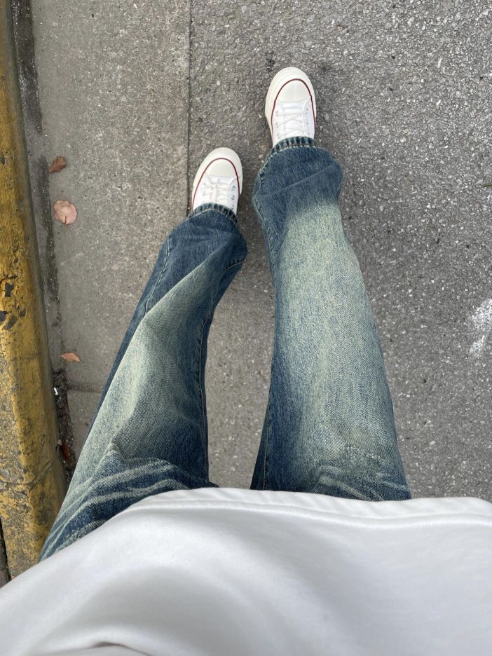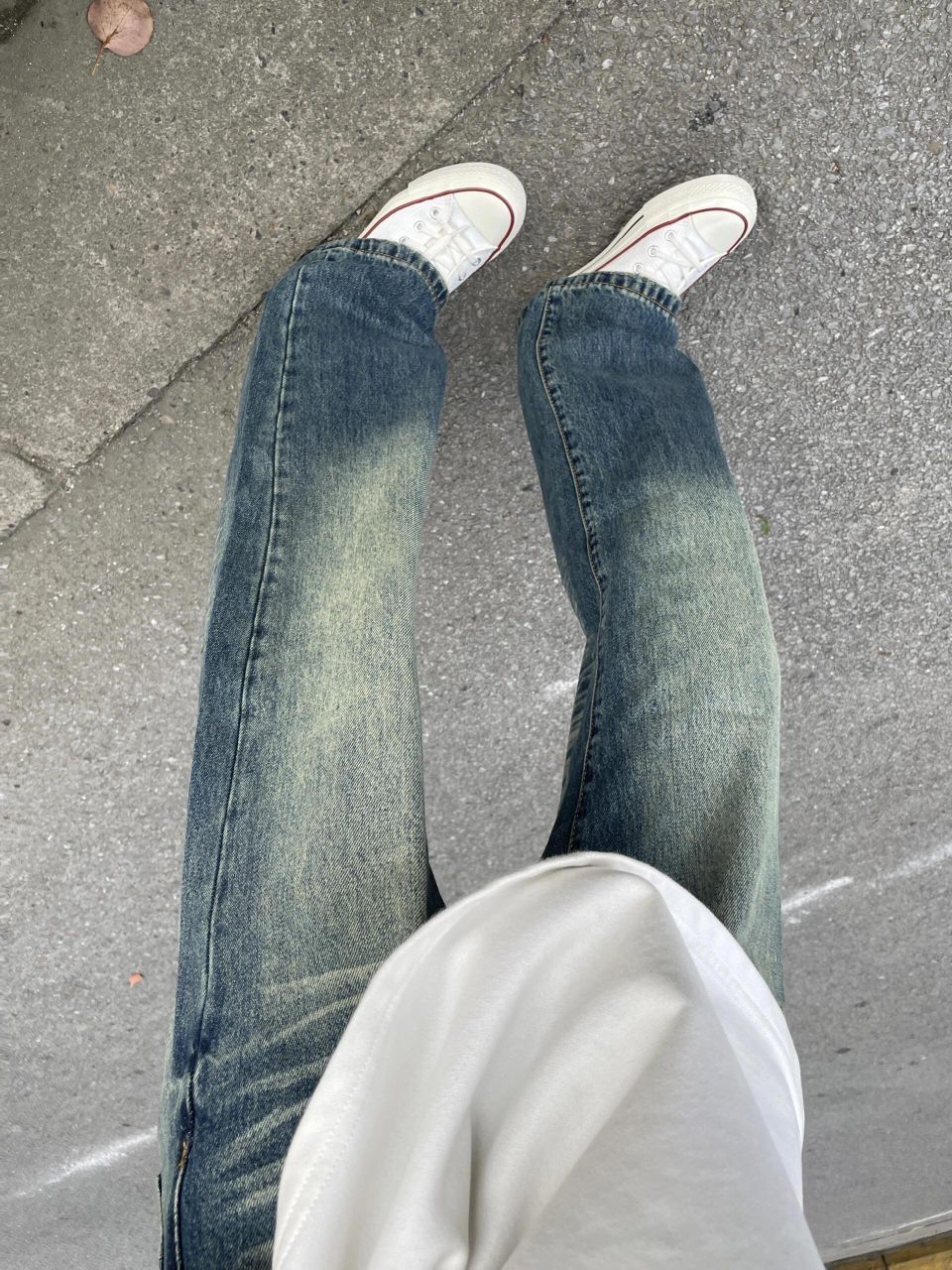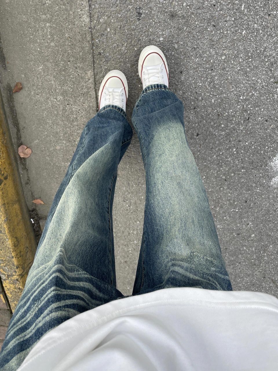 最近疯狂喜欢穿的一条复古牛仔裤 版型好好显瘦又显高 裤腿处纹理设计很喜欢 日常搭配个白帆布嘎嘎好看!