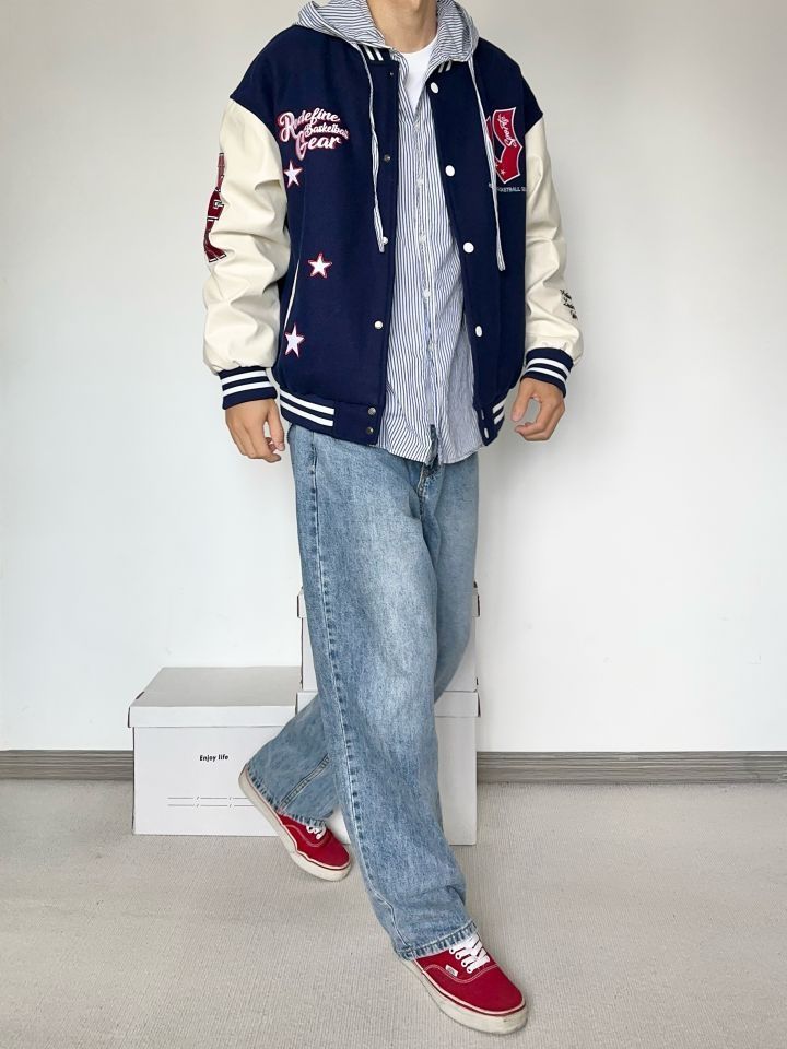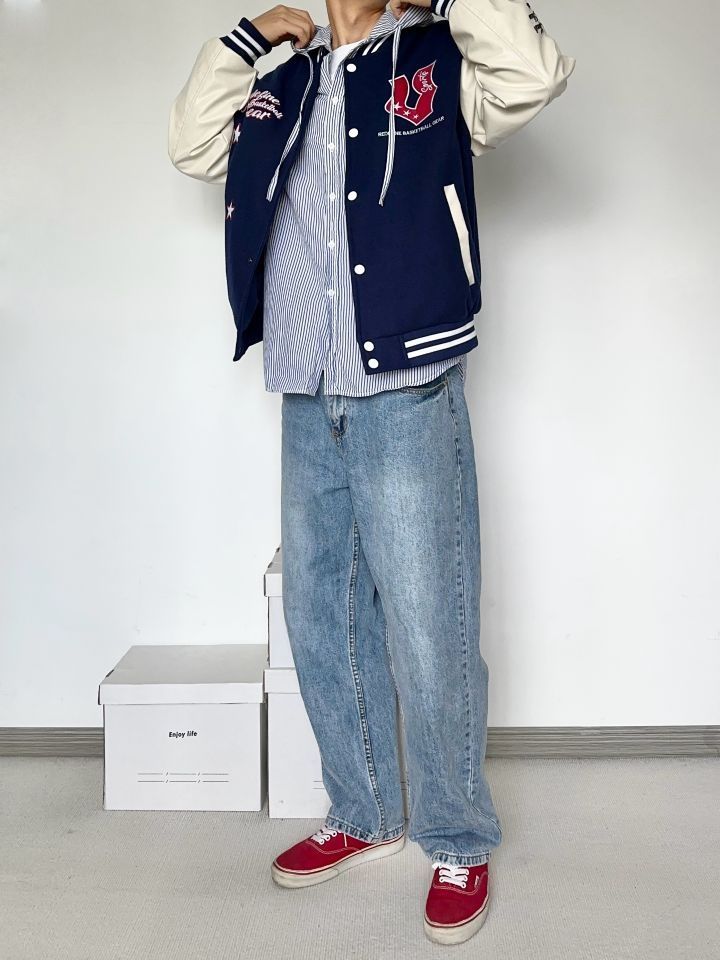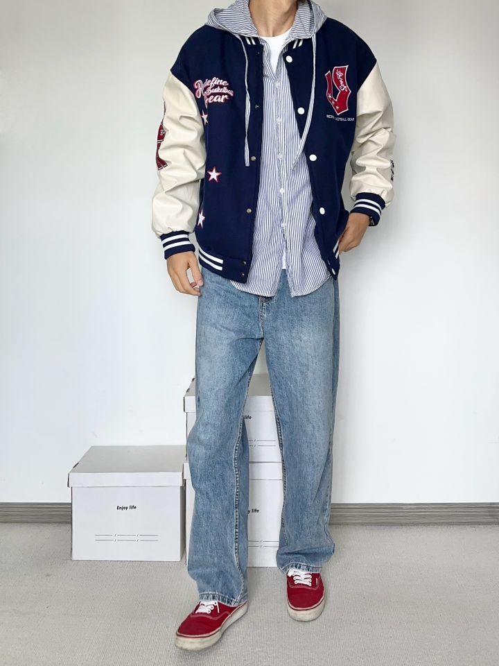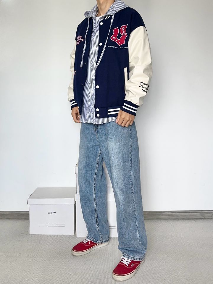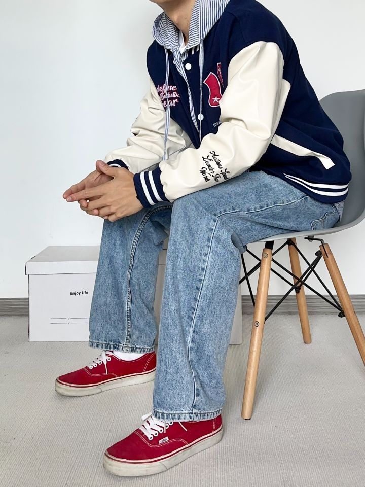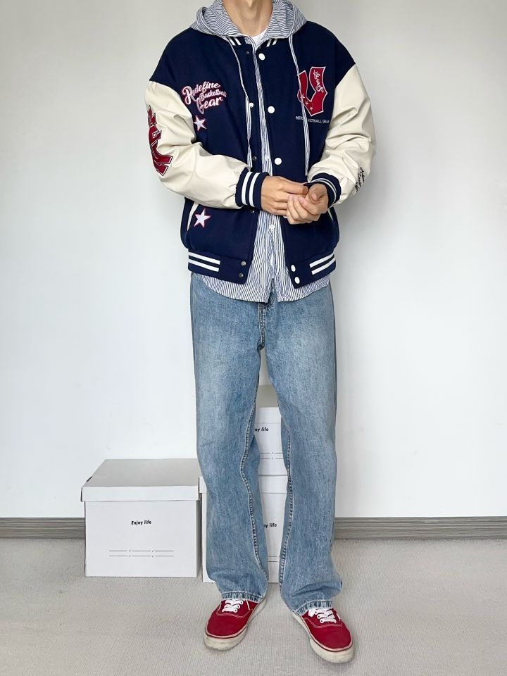 万万没想到两位数有这质量 真的卷 藏青色够美式复古味 微宽松的版型 天冷加个厚卫衣也是OK的 牛仔裤依旧很能打 上脚一双红色vans来个小呼应
