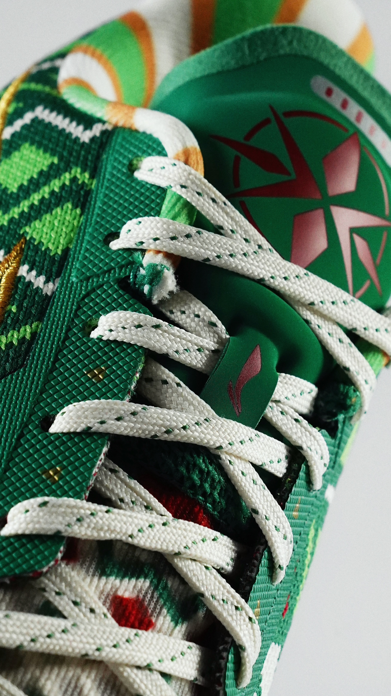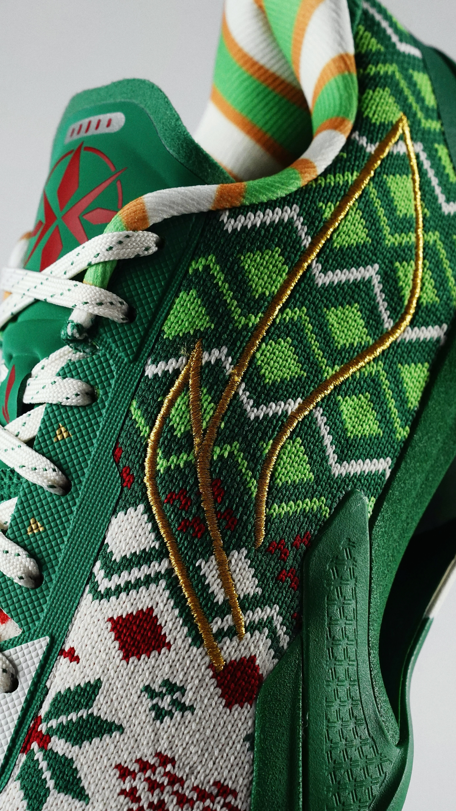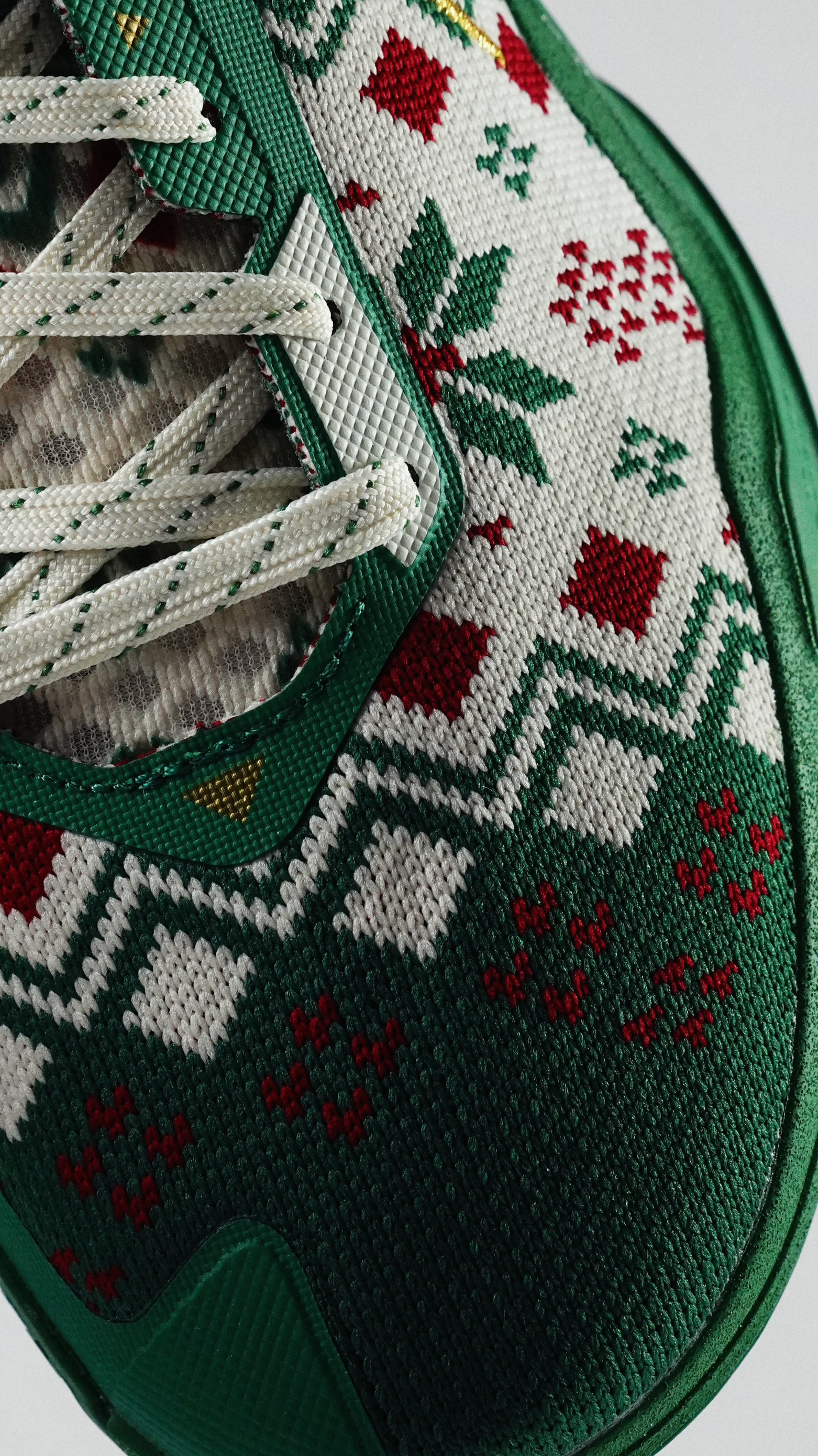 今年圣诞节配色也有非常多的选择,各种主题、配色,都挺有意思的,那想要一双特别一点的,我觉得就是利刃5的毛衣配色了。 那这双利刃5,以圣诞毛衣为灵感,整体使用绿色打造,鞋面融入毛衣经典的格纹,细节点缀红色,金色,圣诞氛围感拉满了。