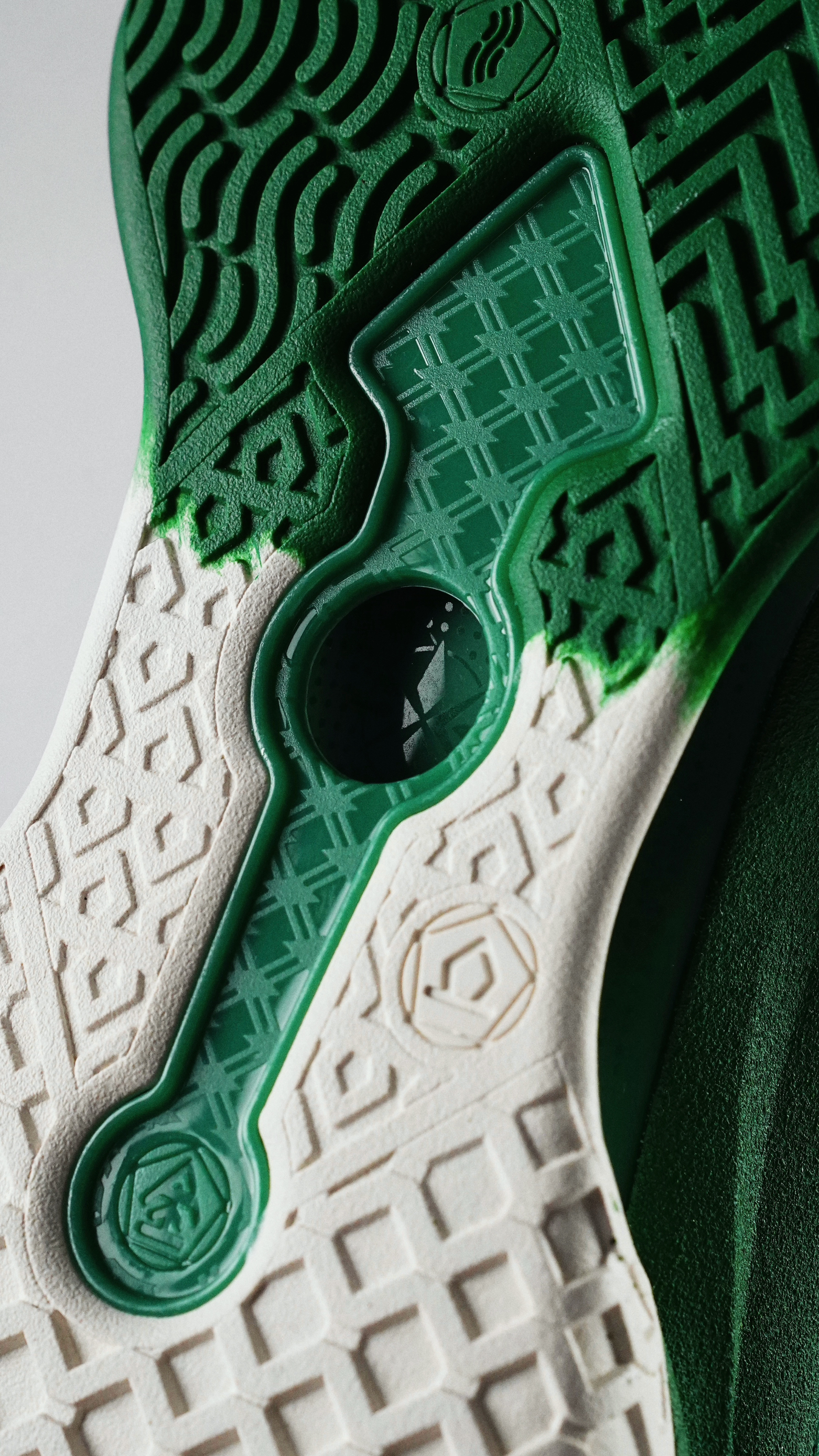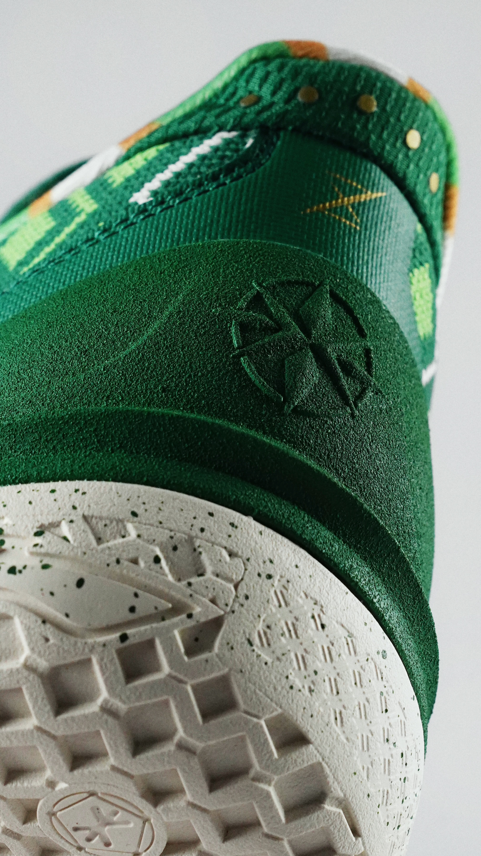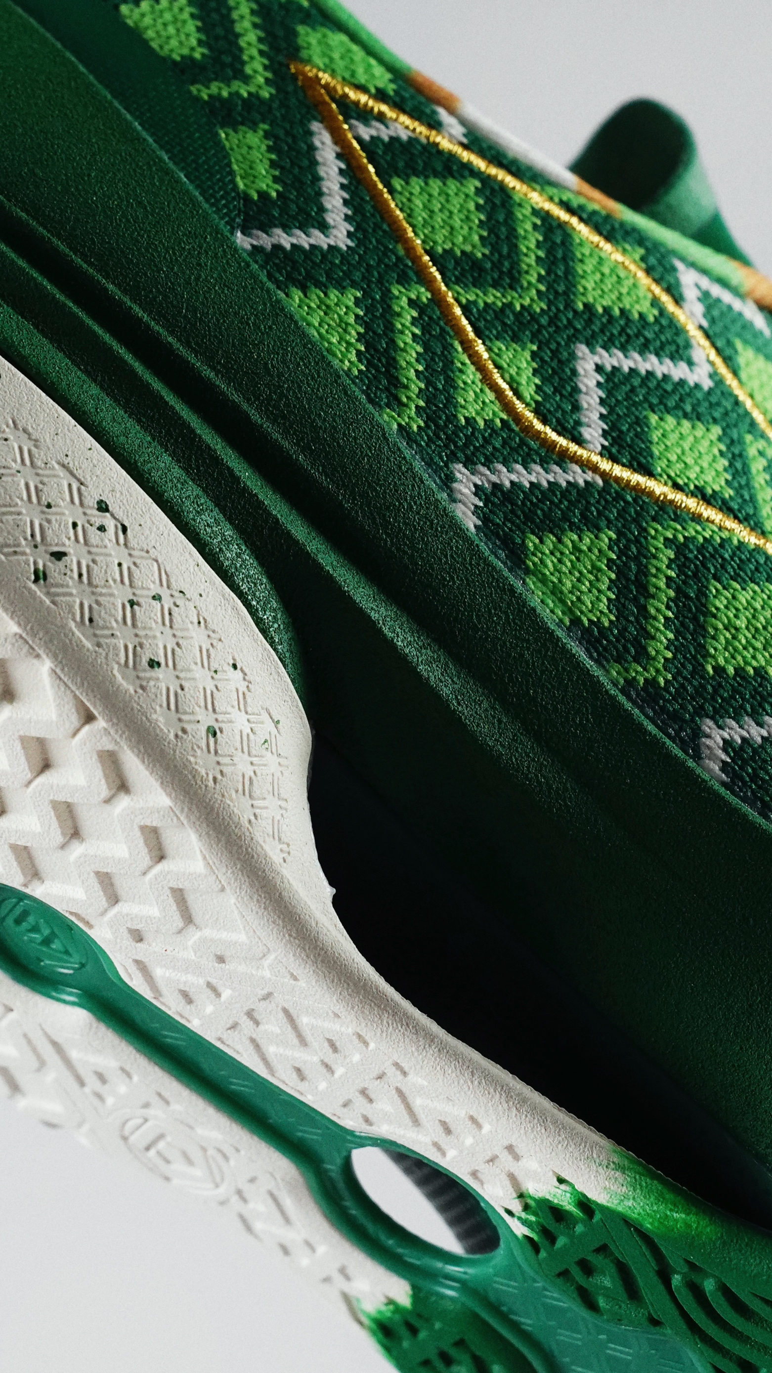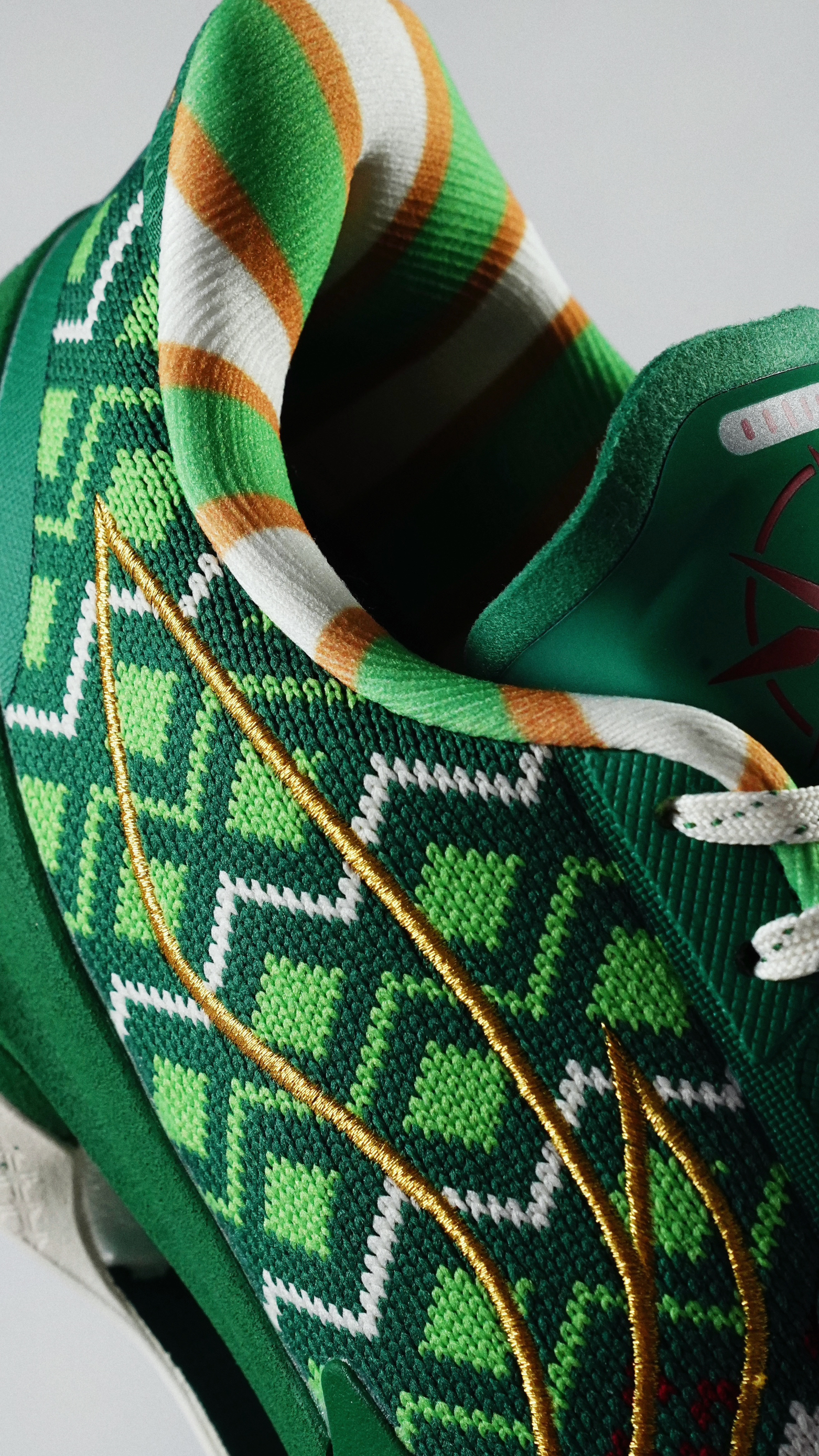 今年圣诞节配色也有非常多的选择,各种主题、配色,都挺有意思的,那想要一双特别一点的,我觉得就是利刃5的毛衣配色了。 那这双利刃5,以圣诞毛衣为灵感,整体使用绿色打造,鞋面融入毛衣经典的格纹,细节点缀红色,金色,圣诞氛围感拉满了。