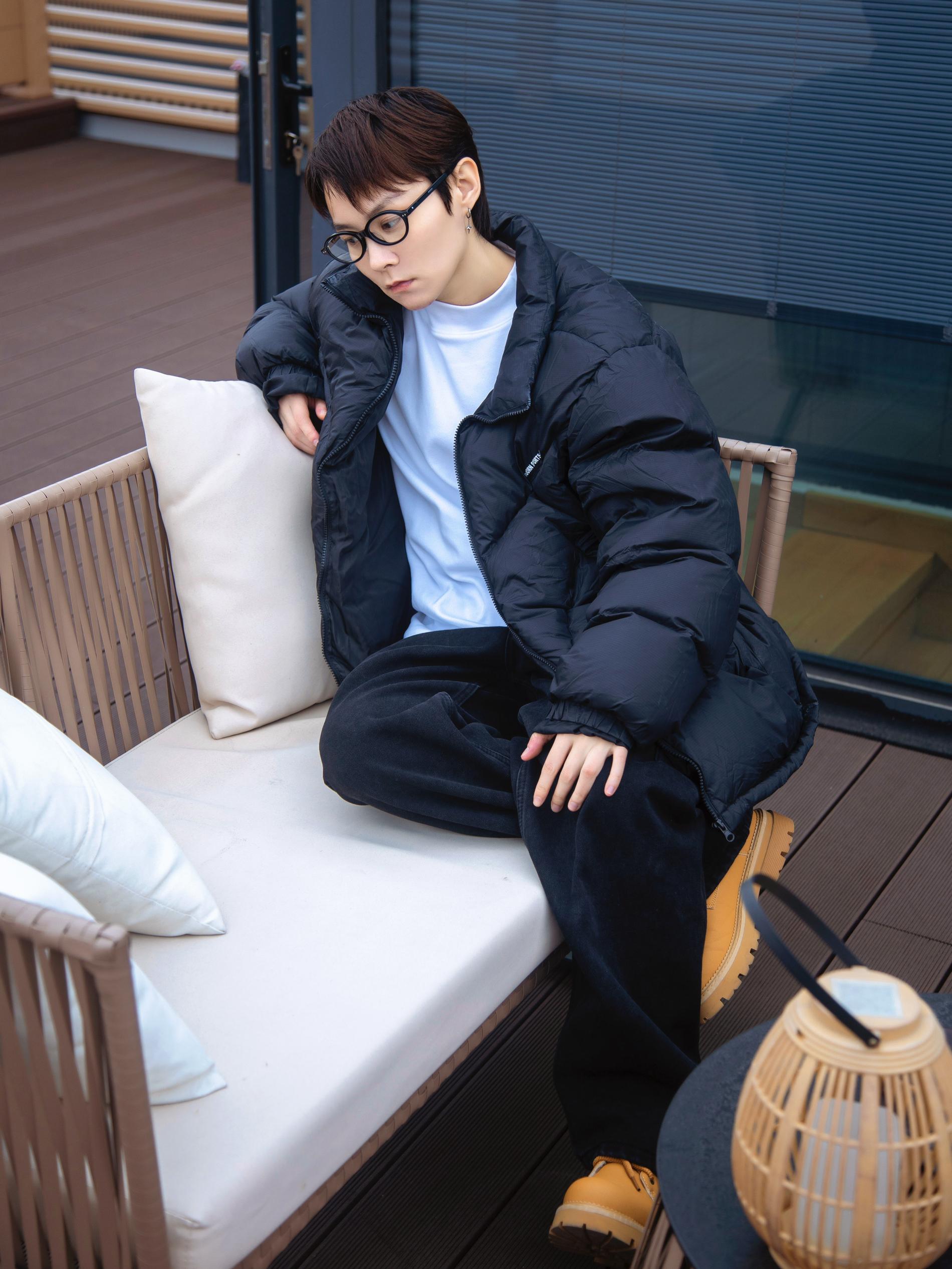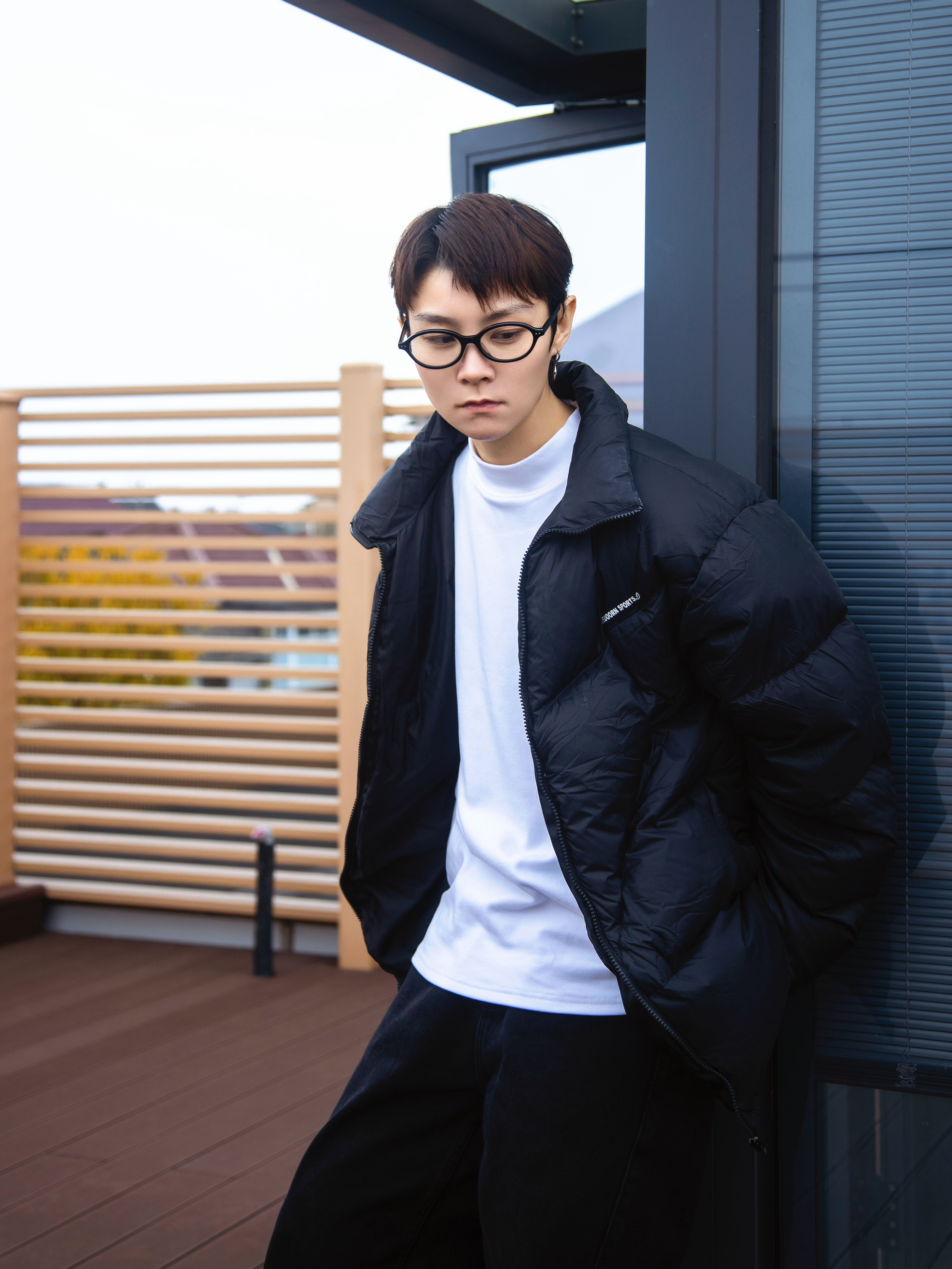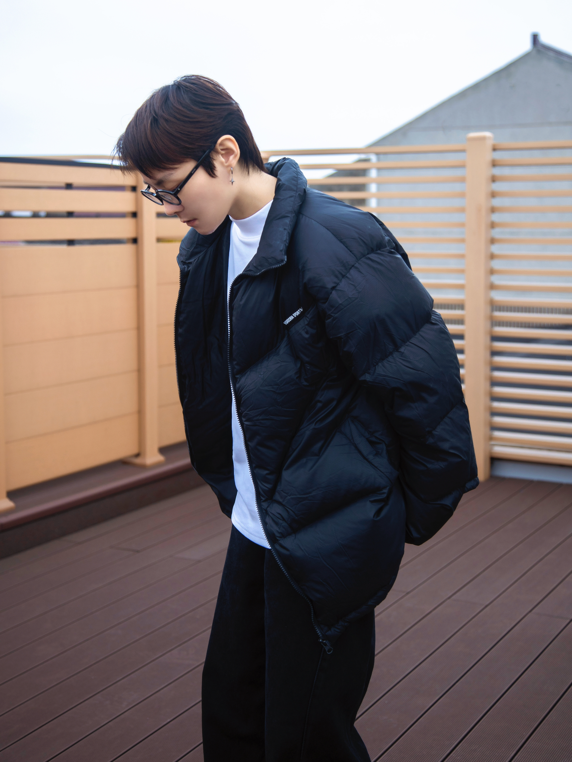 时髦上班族的穿搭 基础色不会错 白色德绒T恤打底暖和又不臃肿 外搭一件黑色羽绒服 oversize一点的版型更显街头感 搭一条黑色宽松牛仔裤 有垂感的弯刀裤腿设计显高级 摆脱打掉那就加点配饰 配一副斯文的黑框眼镜 复古小框修饰脸型提升气质 蛮轻巧的戴起来不累耳朵 点缀一下 从书呆子变身韩系 这一套搭配好看不费力 适合时髦的早八人