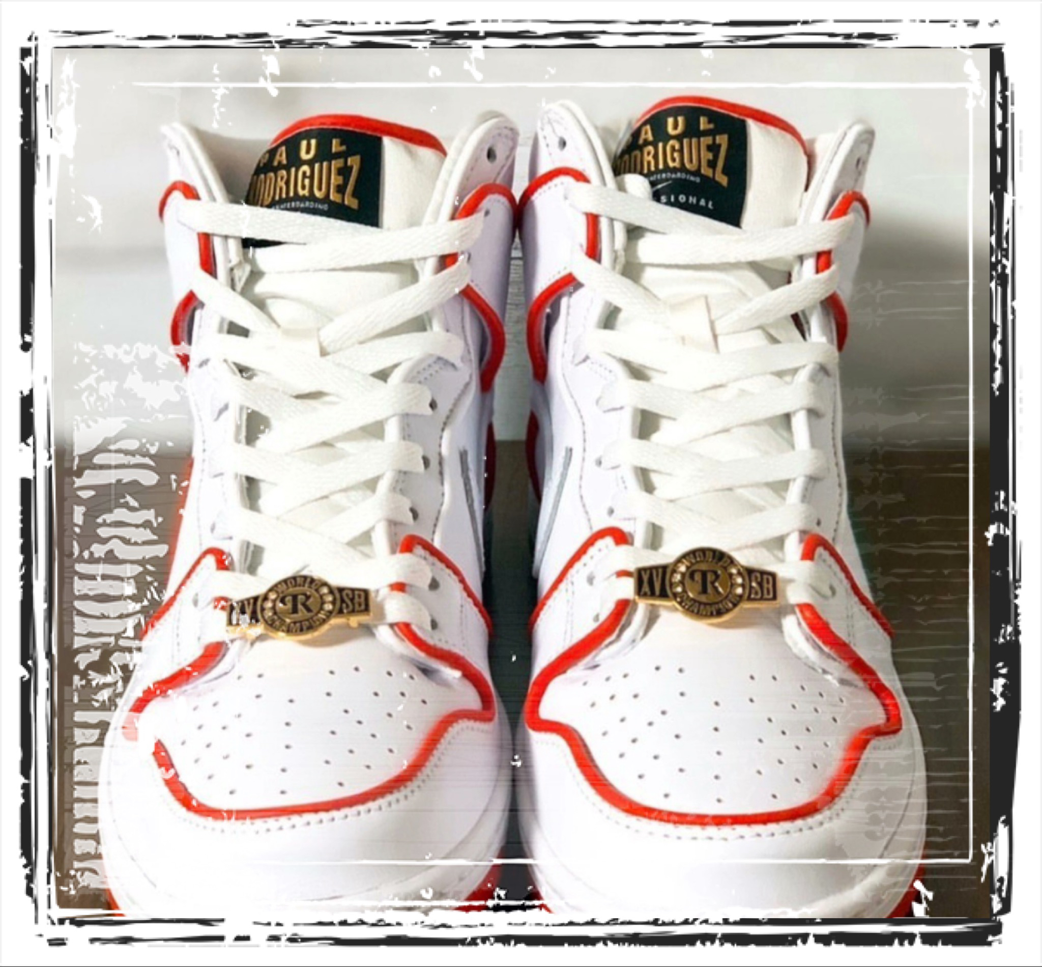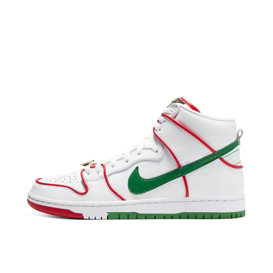 Nike SB 脑洞大开的为他打造了一双拳击主题的 Paul Rodriguez x Nike SB Dunk High 联名鞋款。 这双鞋以纯白色为基底,红色包边勾勒外轮廓,绿色 Swoosh Logo 装饰,外底红绿双色呼应,整体风格颇有几分圣诞节配色的气质。 鞋头位置还带有一个特别的拳击金腰带,刻有 XV、R 等标识,应该与保罗与 Nike 的合作年份等信息有关。 鞋舌还带有 P...
