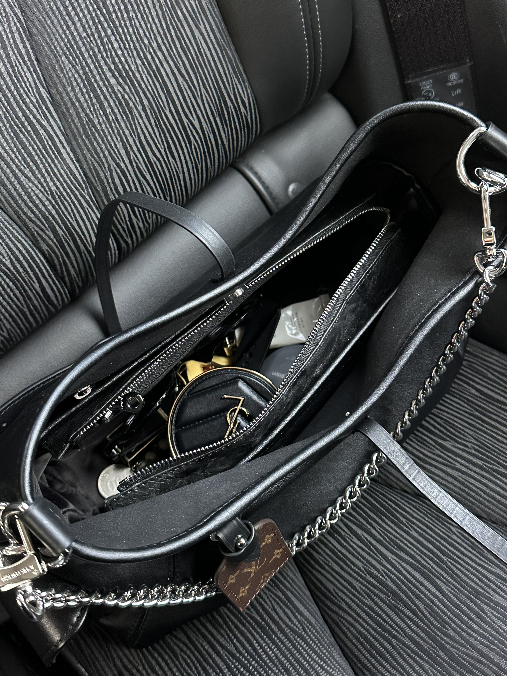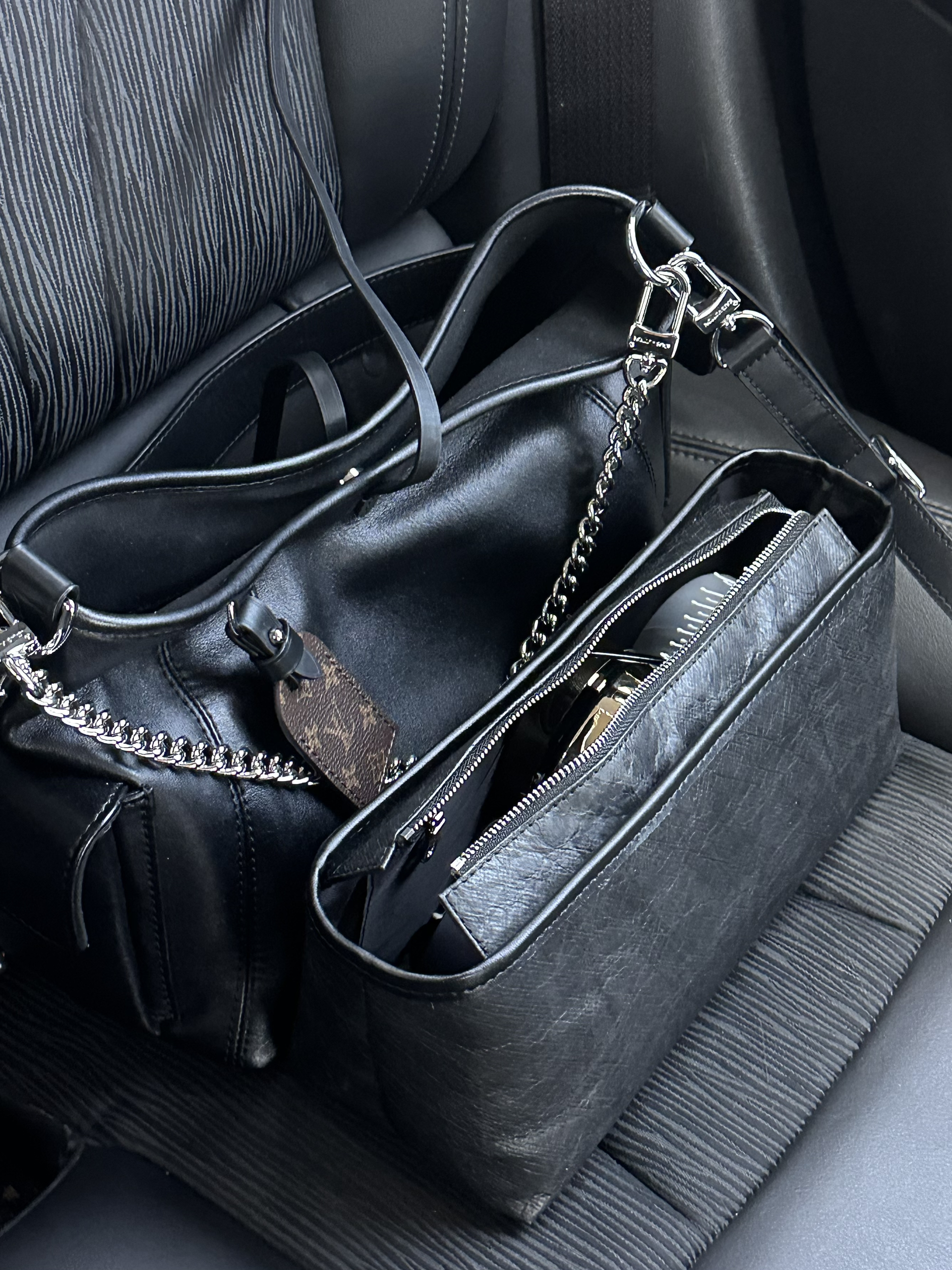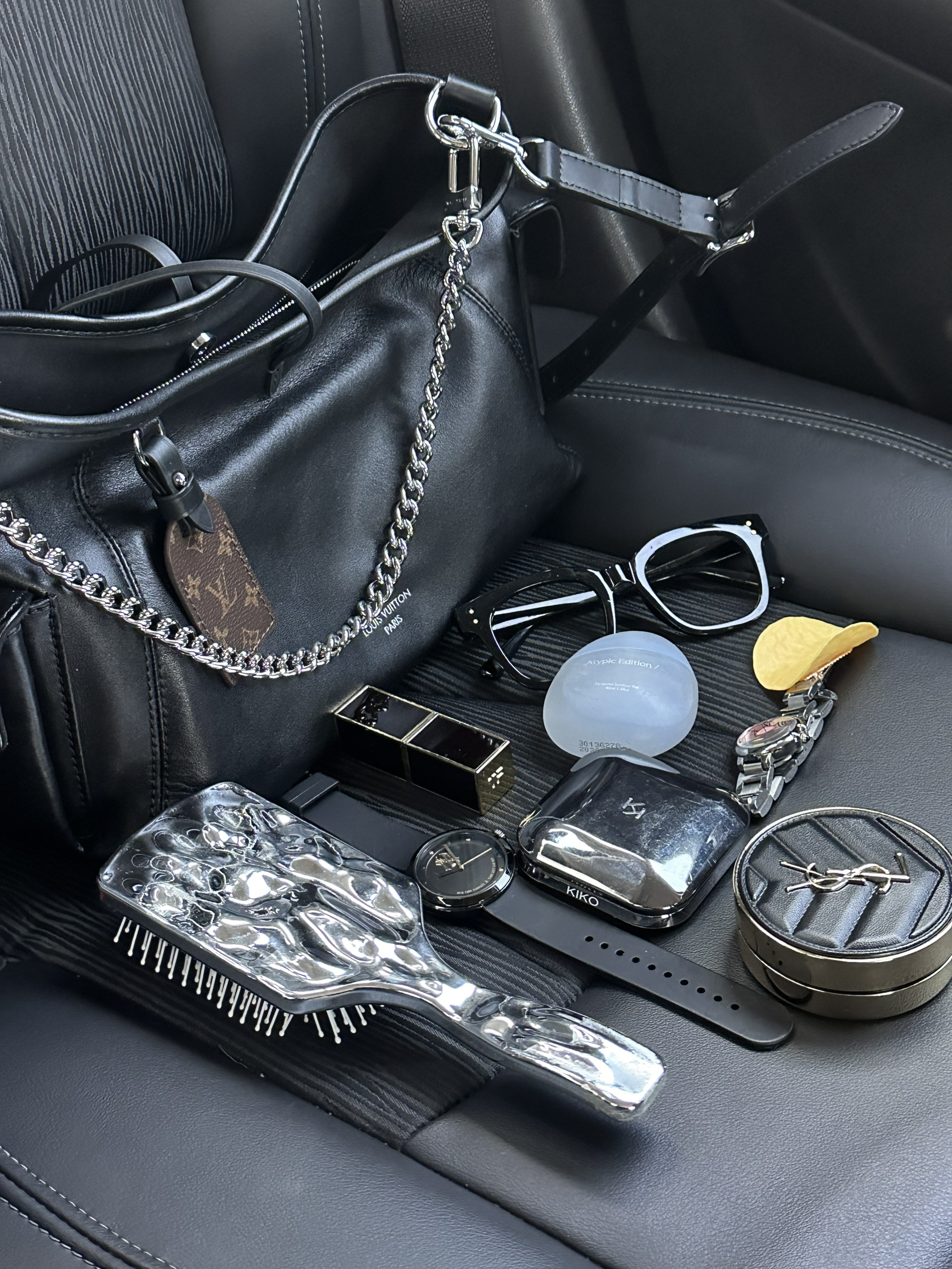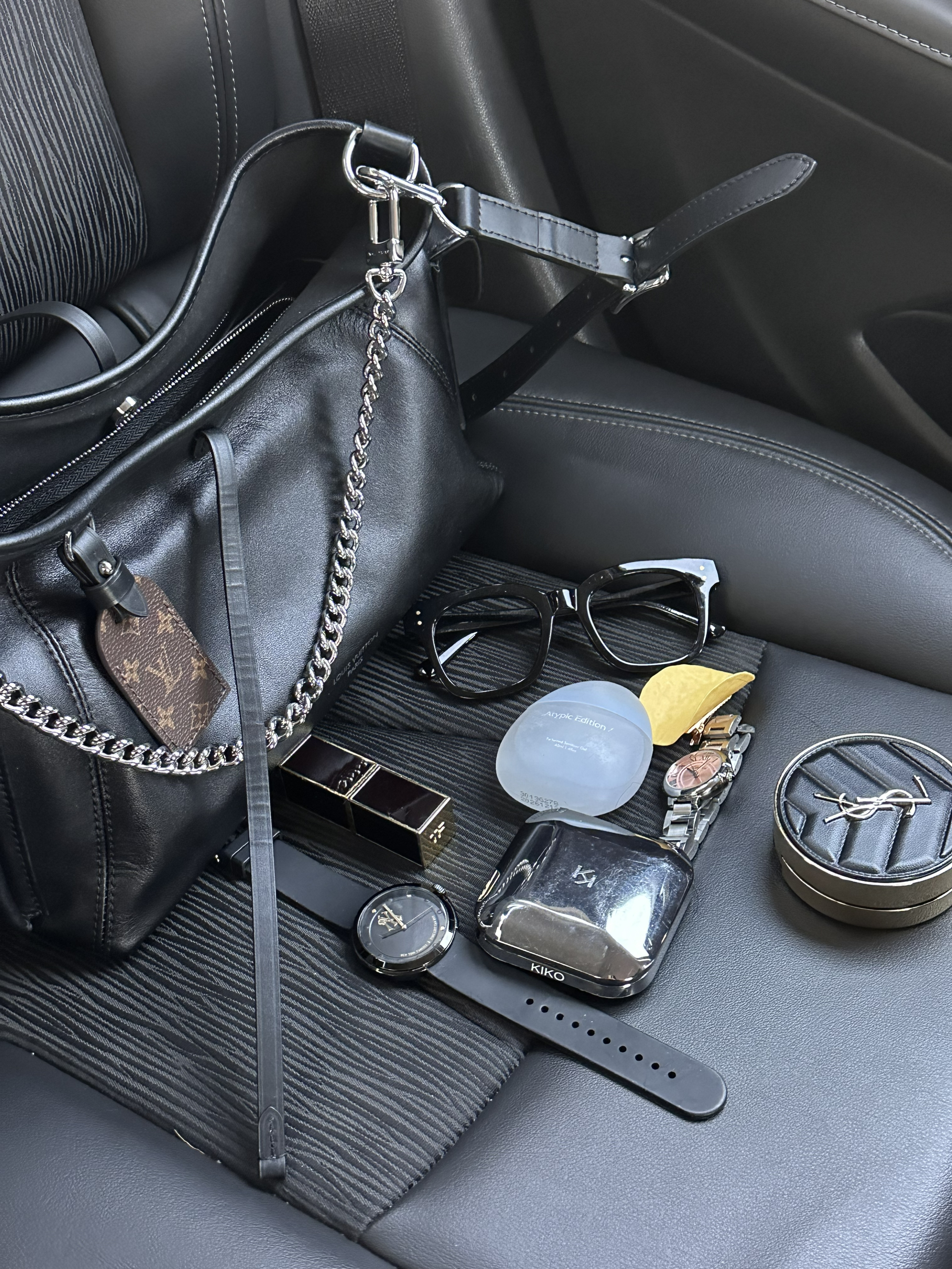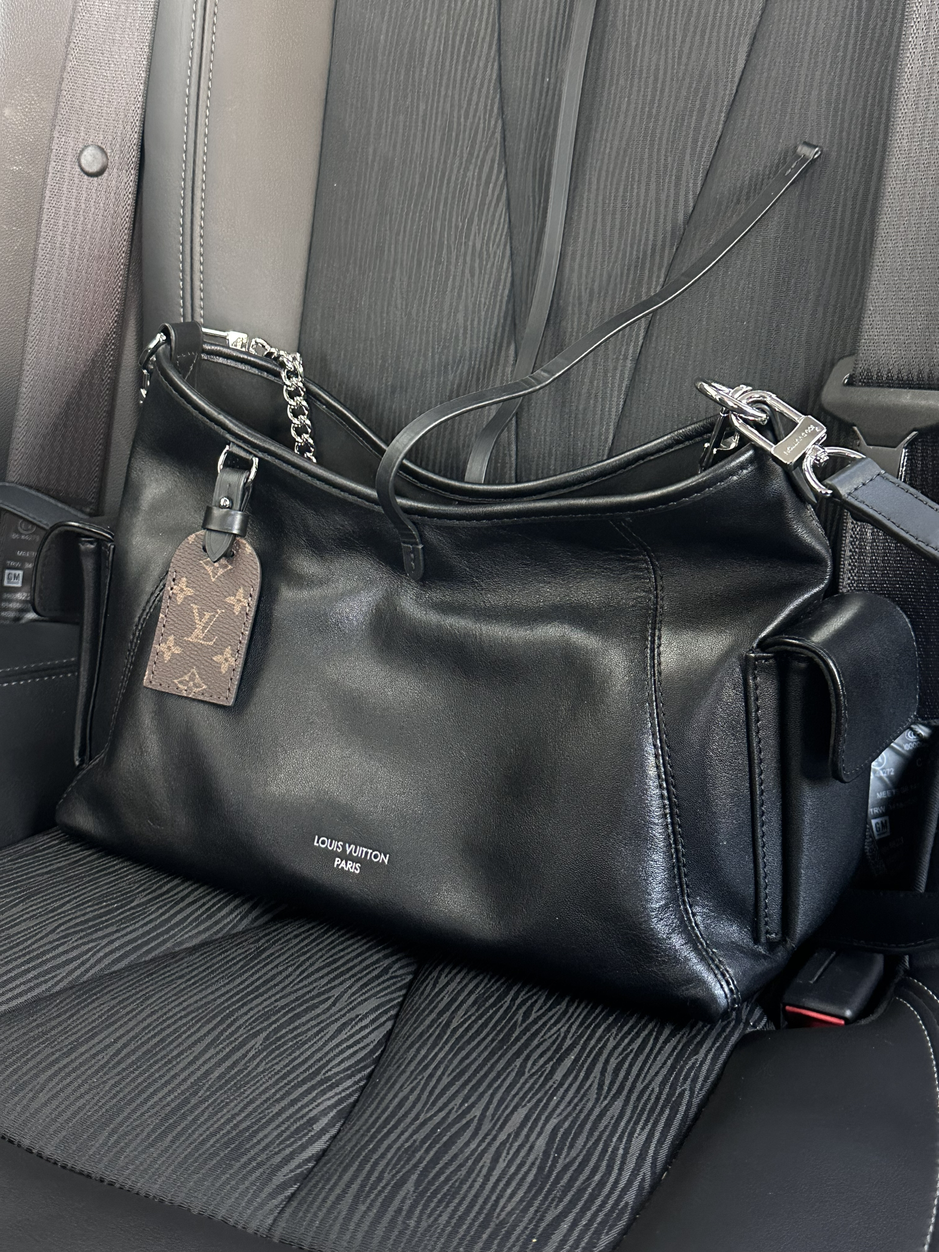 Lv carryall 小羊皮款也太棒了吧 我入手的是小号 整体全黑的配色搭老花肩带 小羊皮整体质感在线 我还给他搭配了个内胆 包包版型立体好看了 而且内胆是分层设计 放东西也不怕乱了