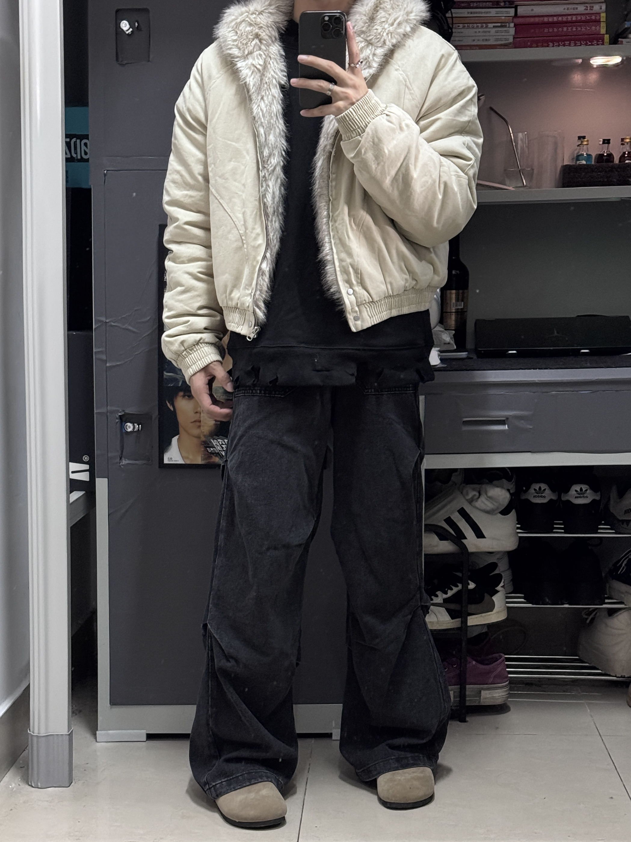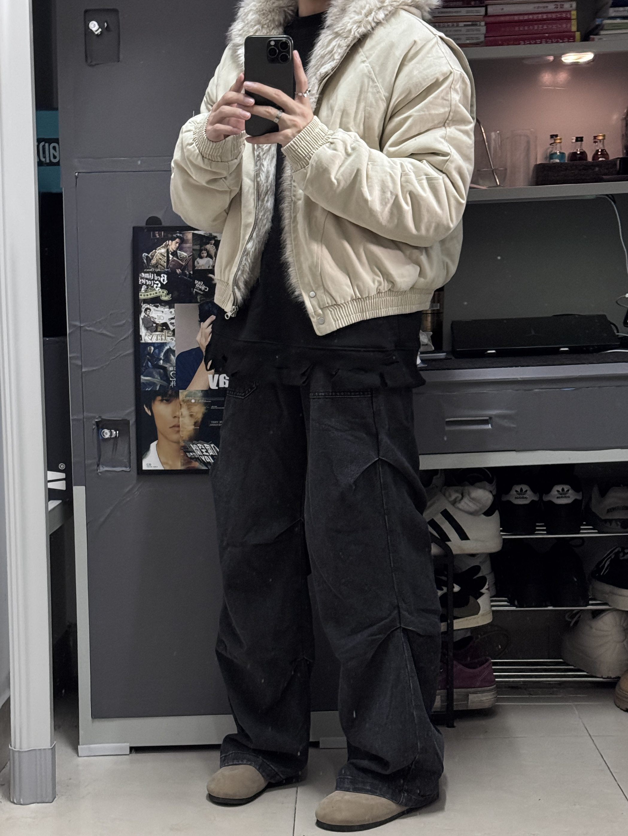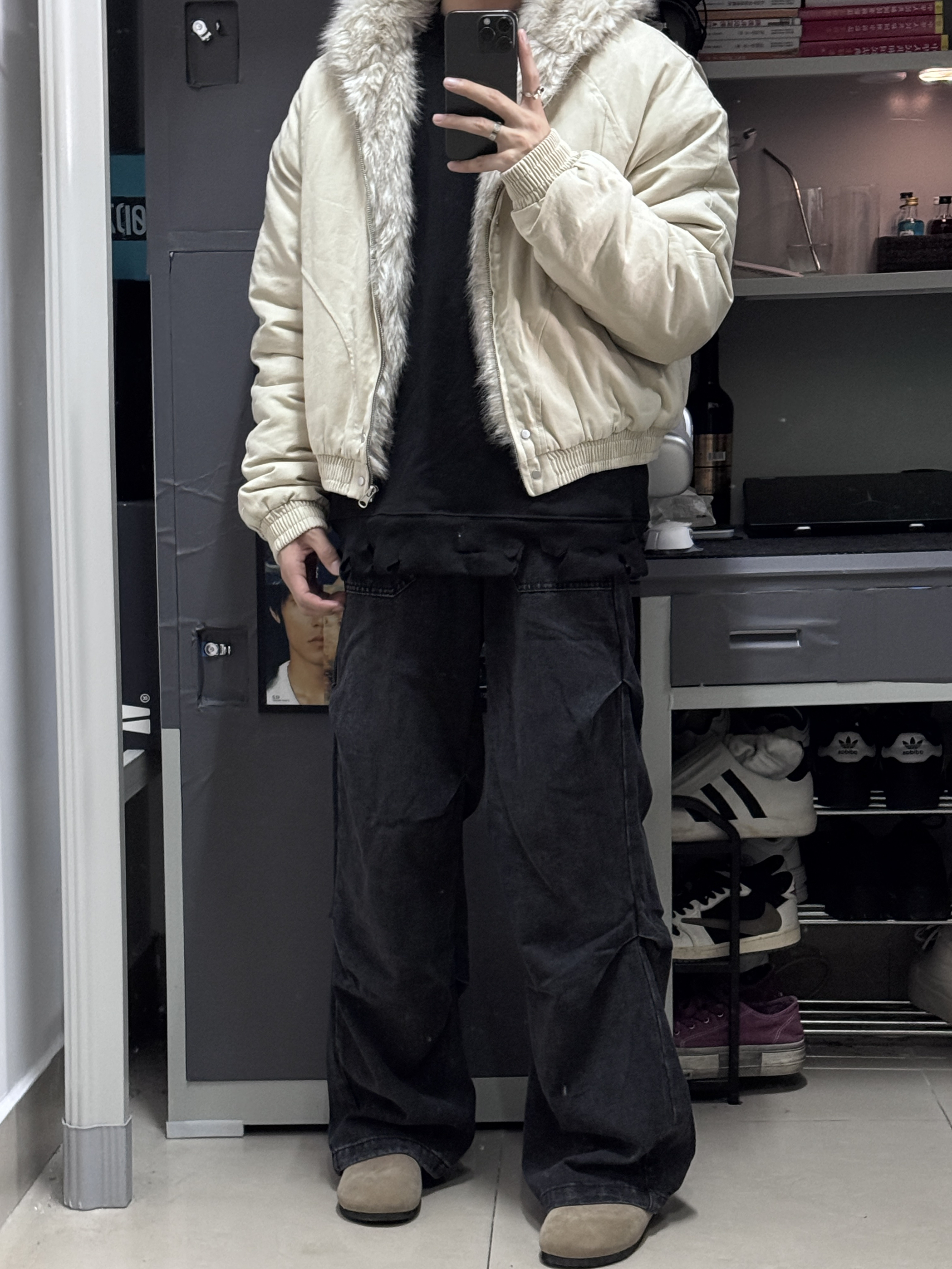 👔上身了一件卡其色的座山雕外套,平替版本更合适我这种学生党,不过穿起来挺帅的! 👖裤子搭配了一件褶皱设计的直筒裤,直筒版型不挑身材,大腿粗腿都能轻松驾驭,穿起来很有型!