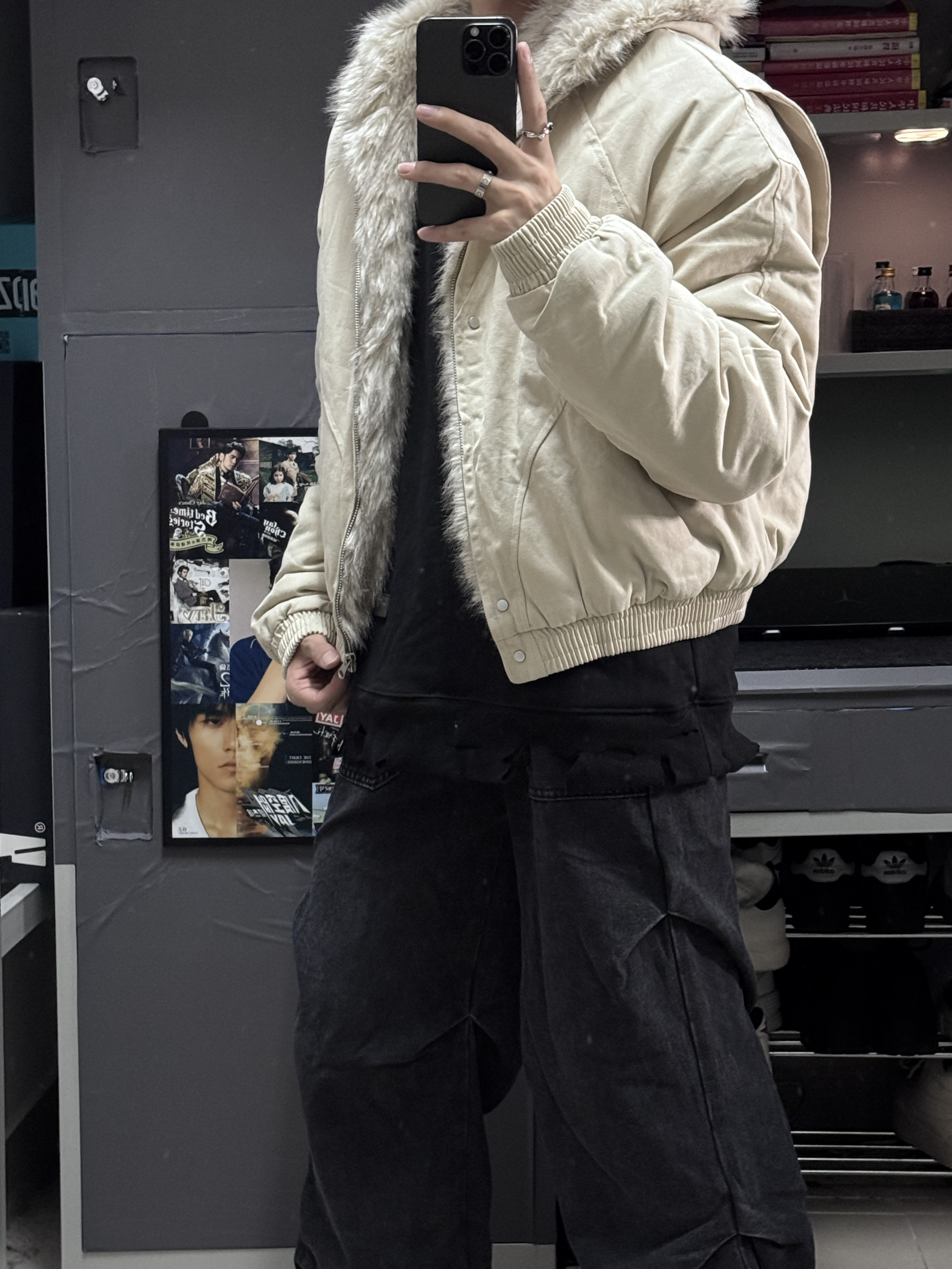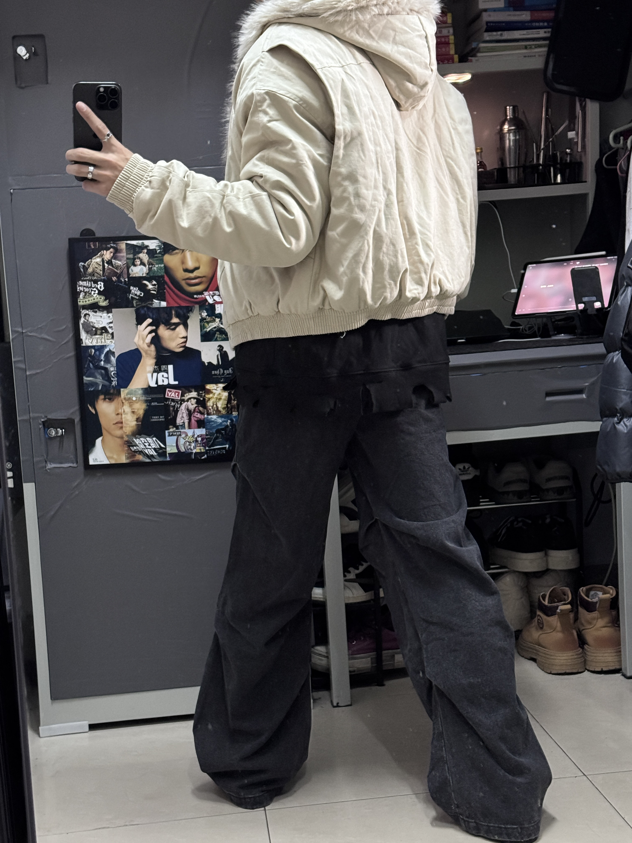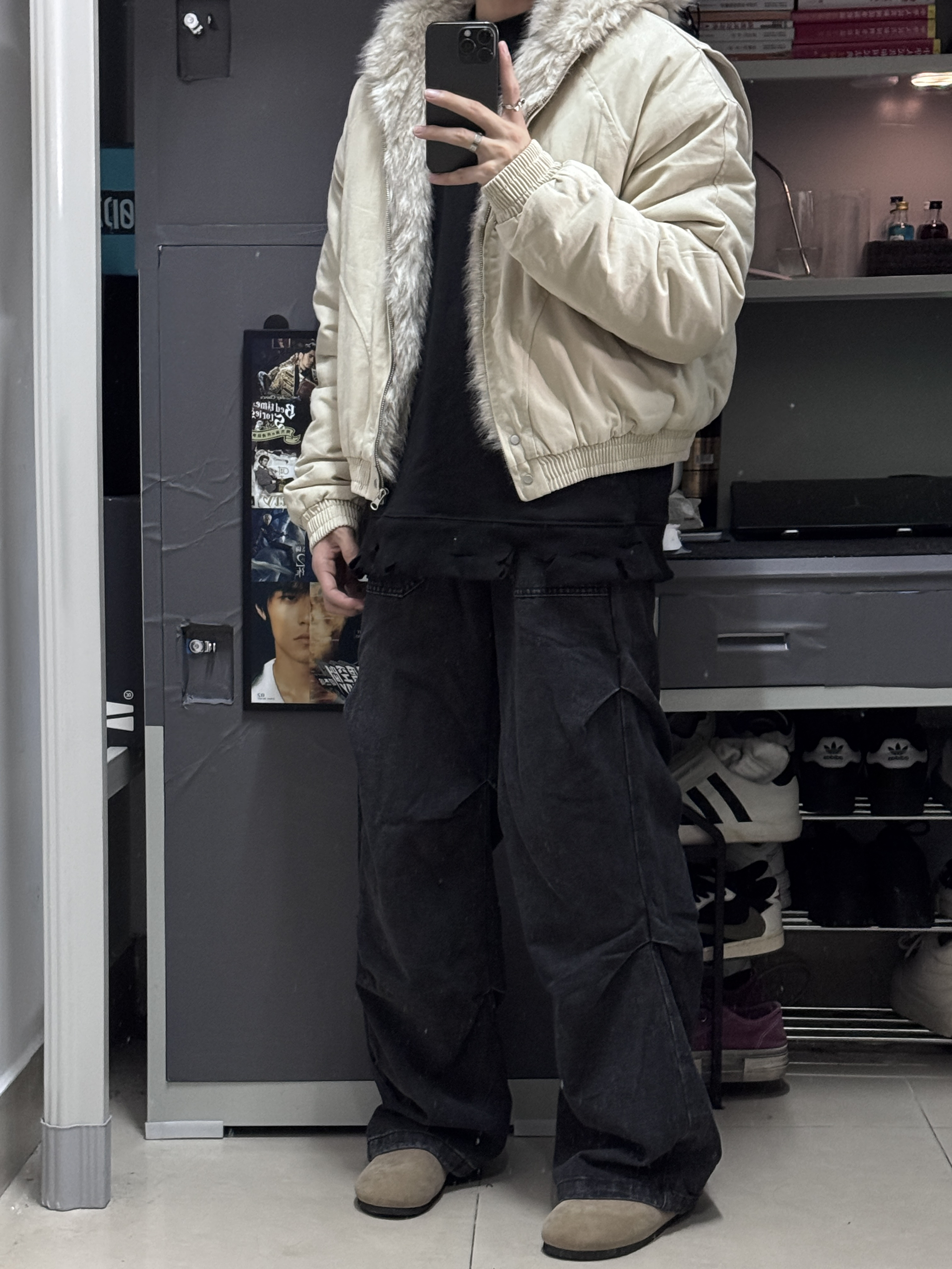👔上身了一件卡其色的座山雕外套,平替版本更合适我这种学生党,不过穿起来挺帅的! 👖裤子搭配了一件褶皱设计的直筒裤,直筒版型不挑身材,大腿粗腿都能轻松驾驭,穿起来很有型!