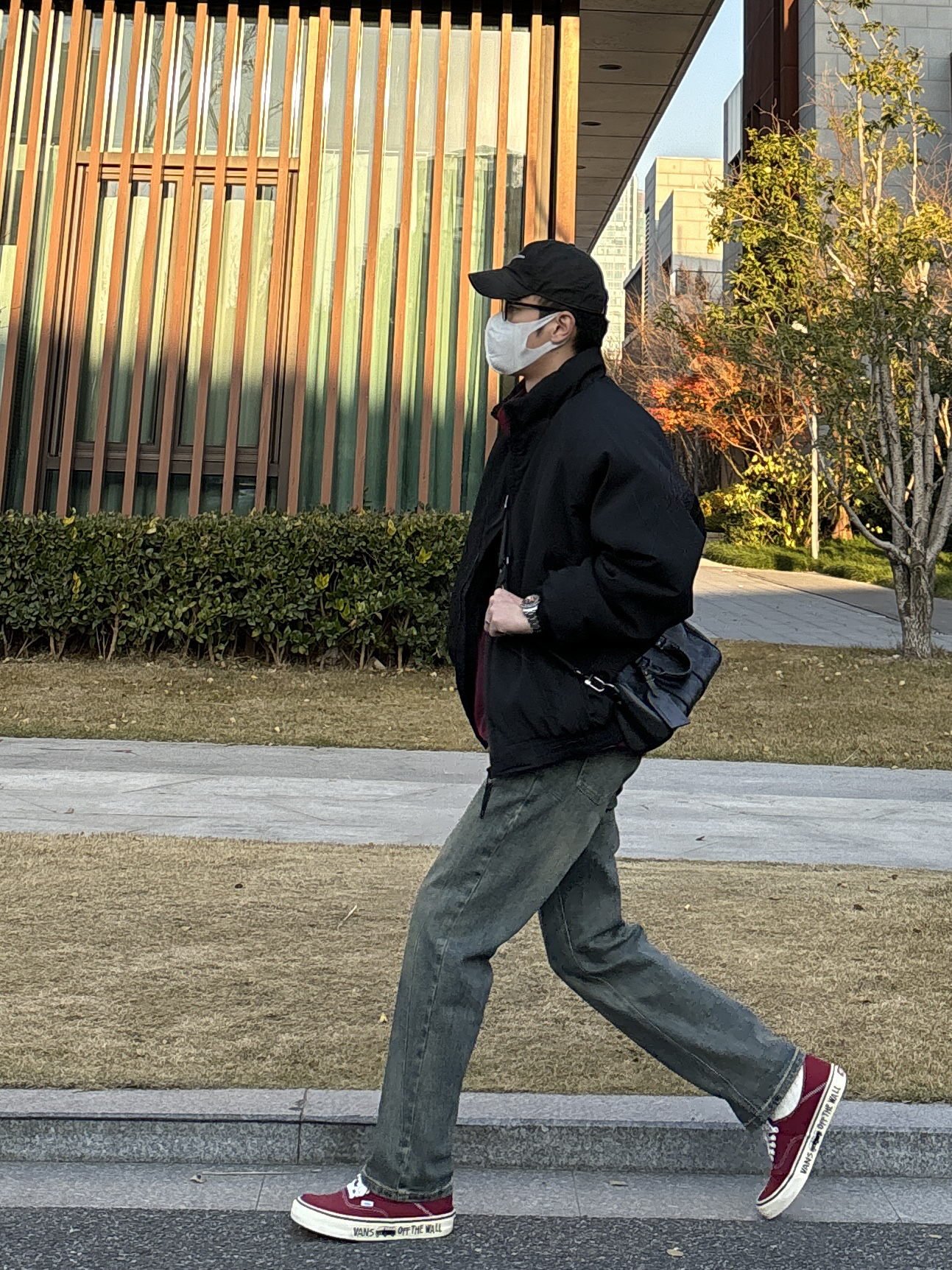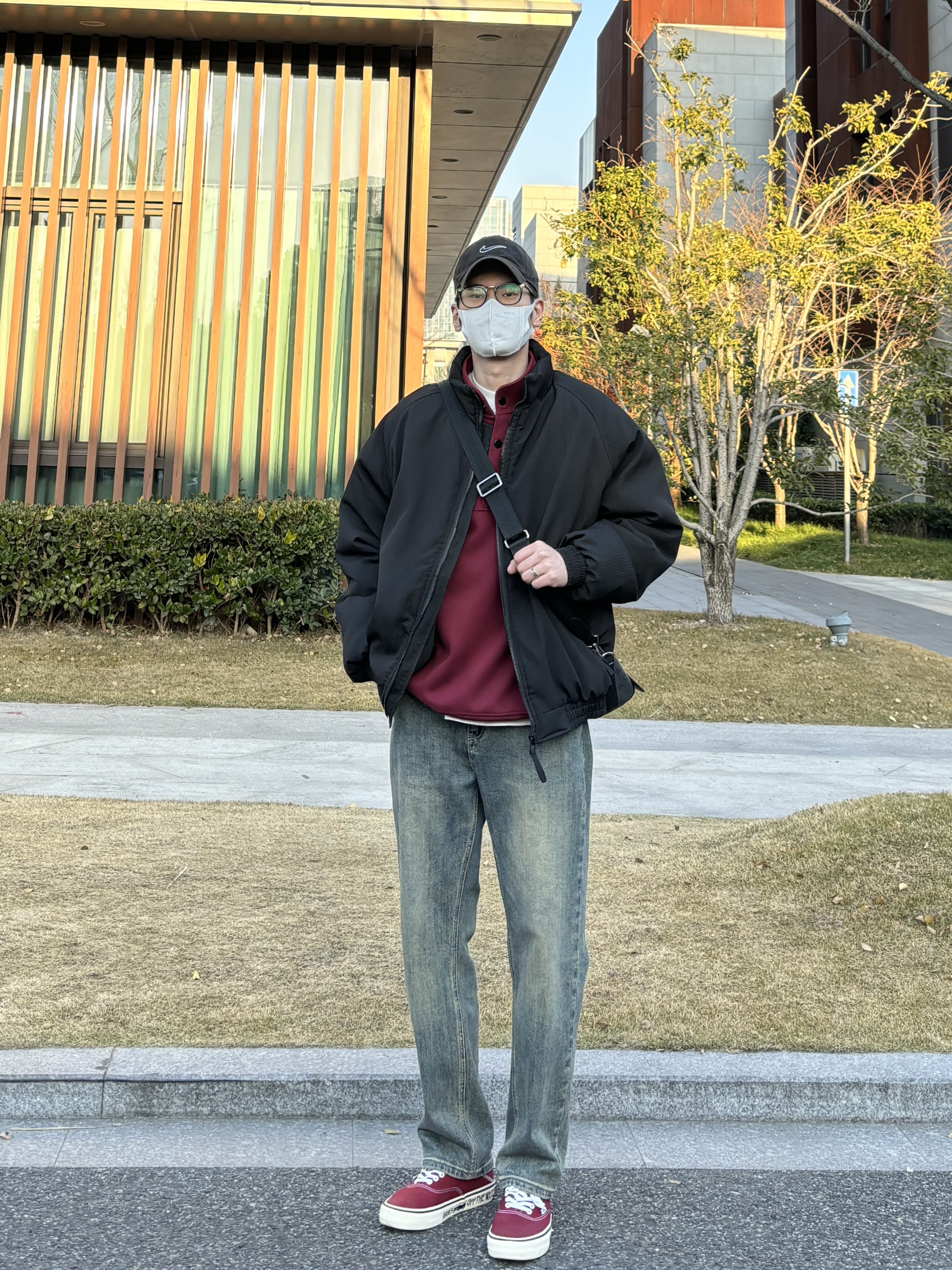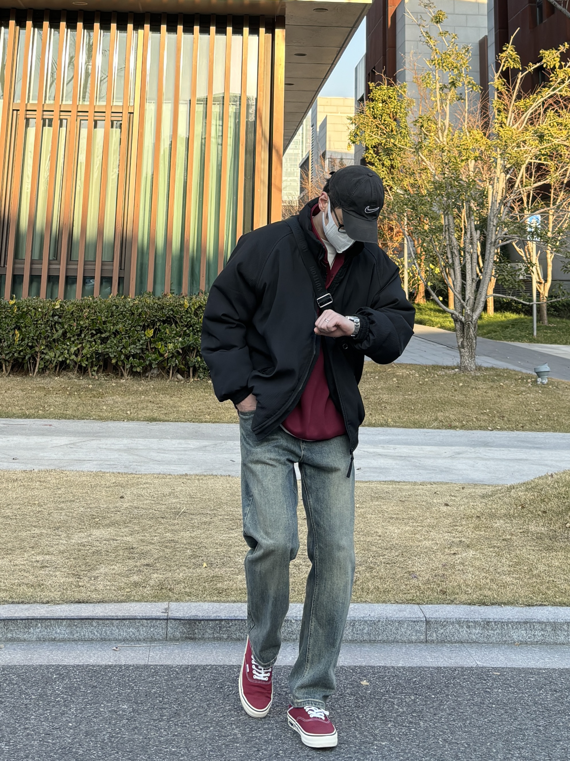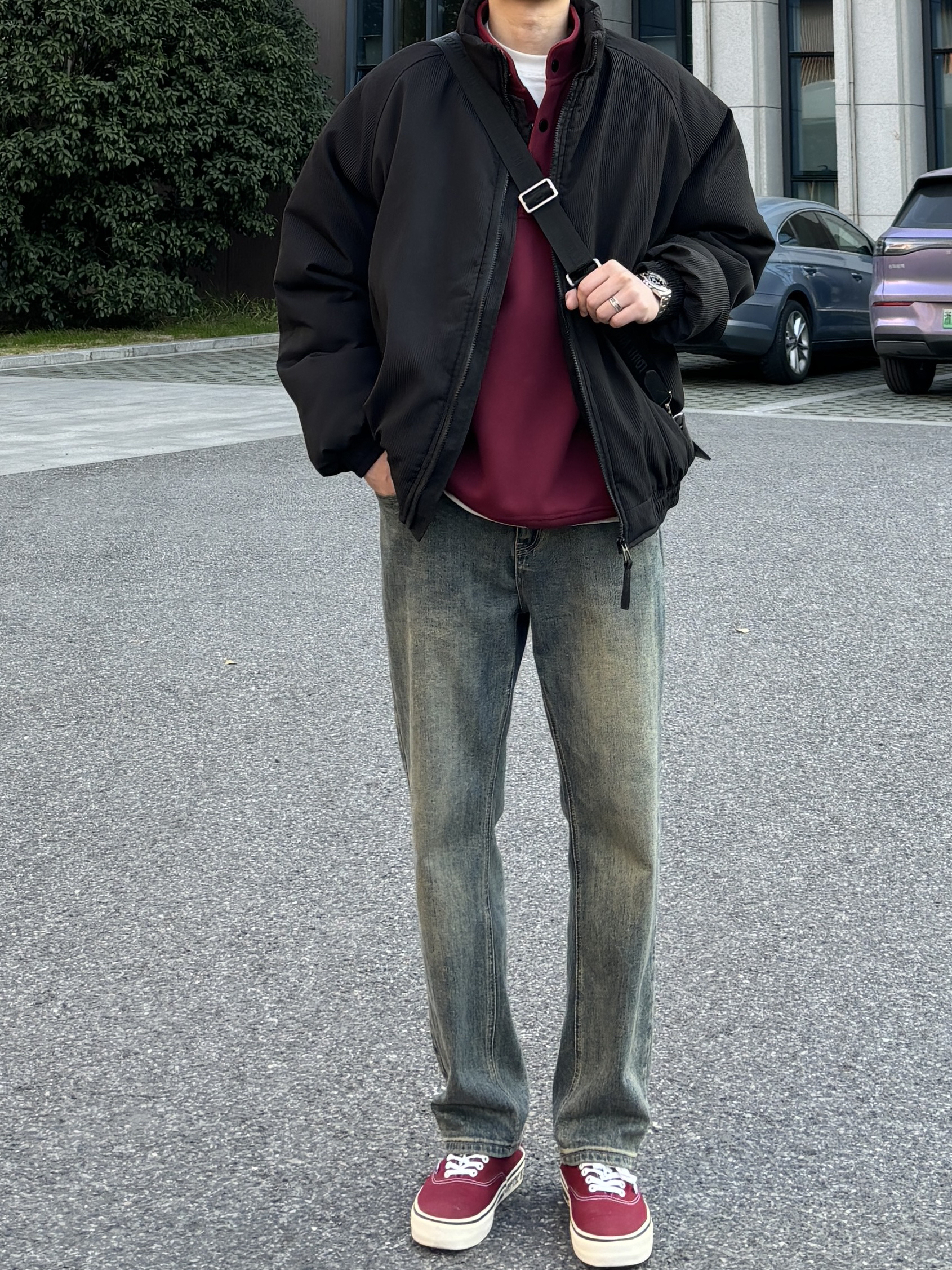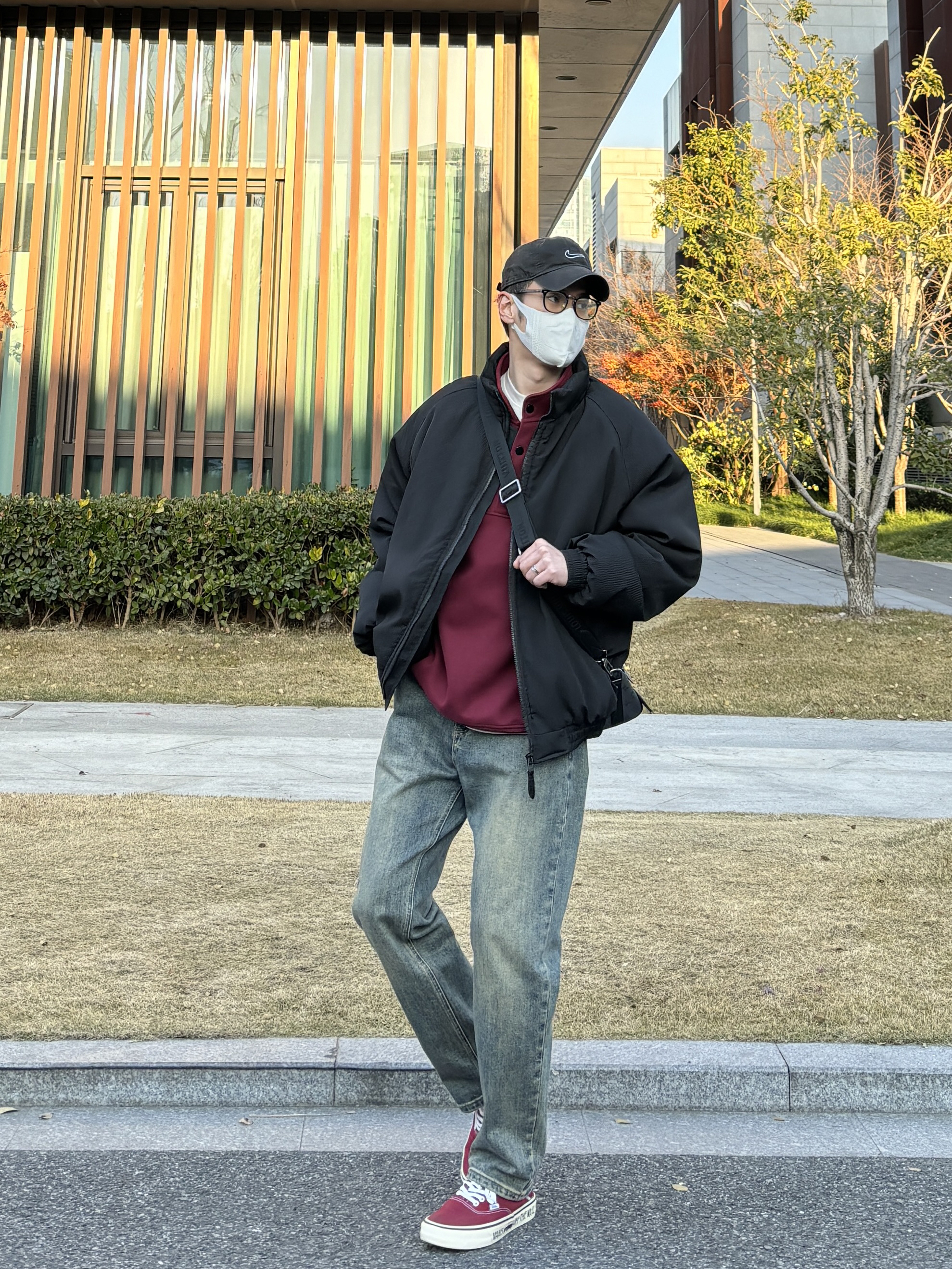 今天这套先用酒红色重磅开胸卫衣做内搭 ⬇️ 裤子选择简约大方的水洗直筒牛仔裤 ⬇️ 鞋子上脚街头味十足的vans红校车 ⬇️ 接着套上黑色宽松阔版插肩袖立领棉服夹克 ⬇️ 最后背一个精致的皮质斜挎包 - 今日搭配 衣服裤子:NICE LILI 鞋子:VANS红校车