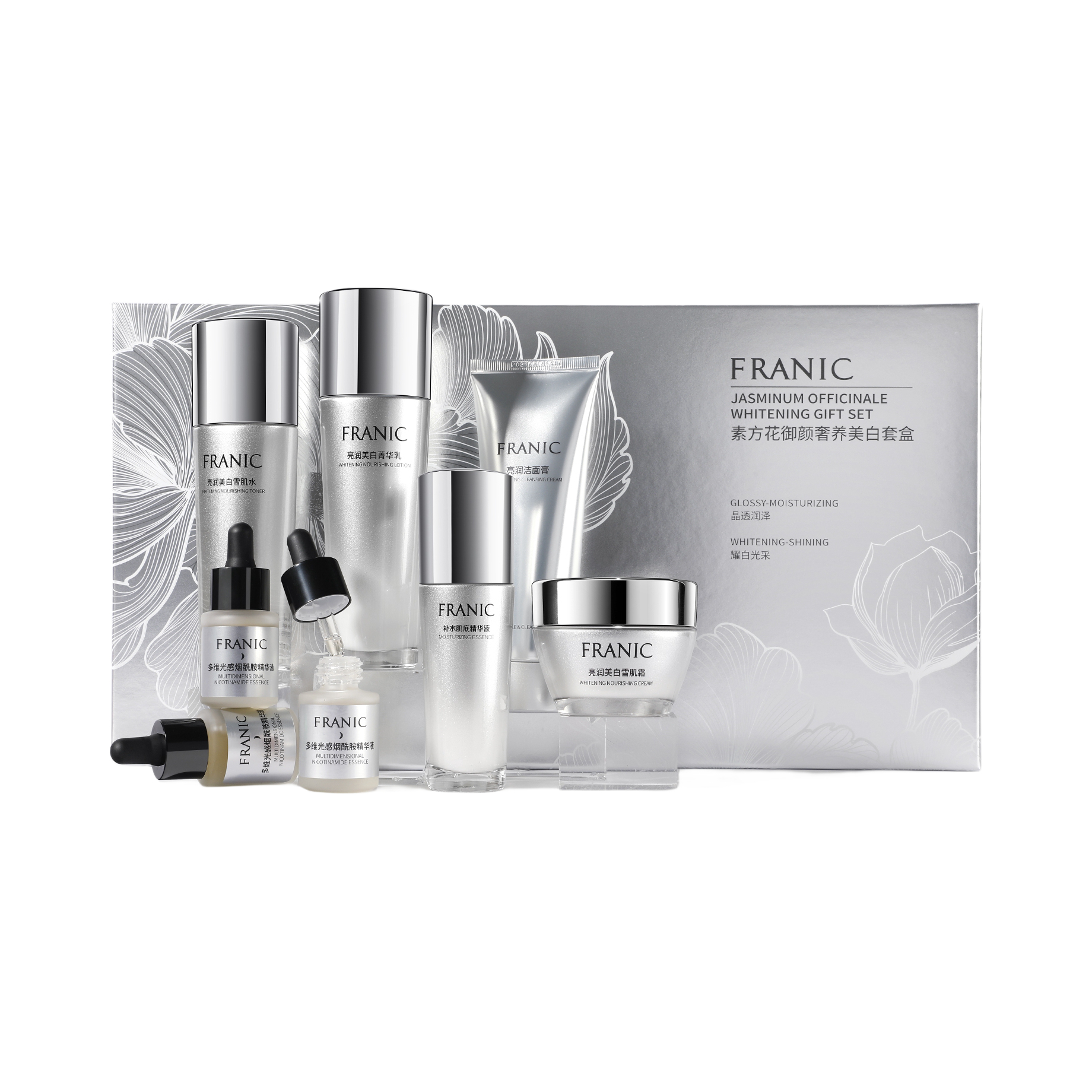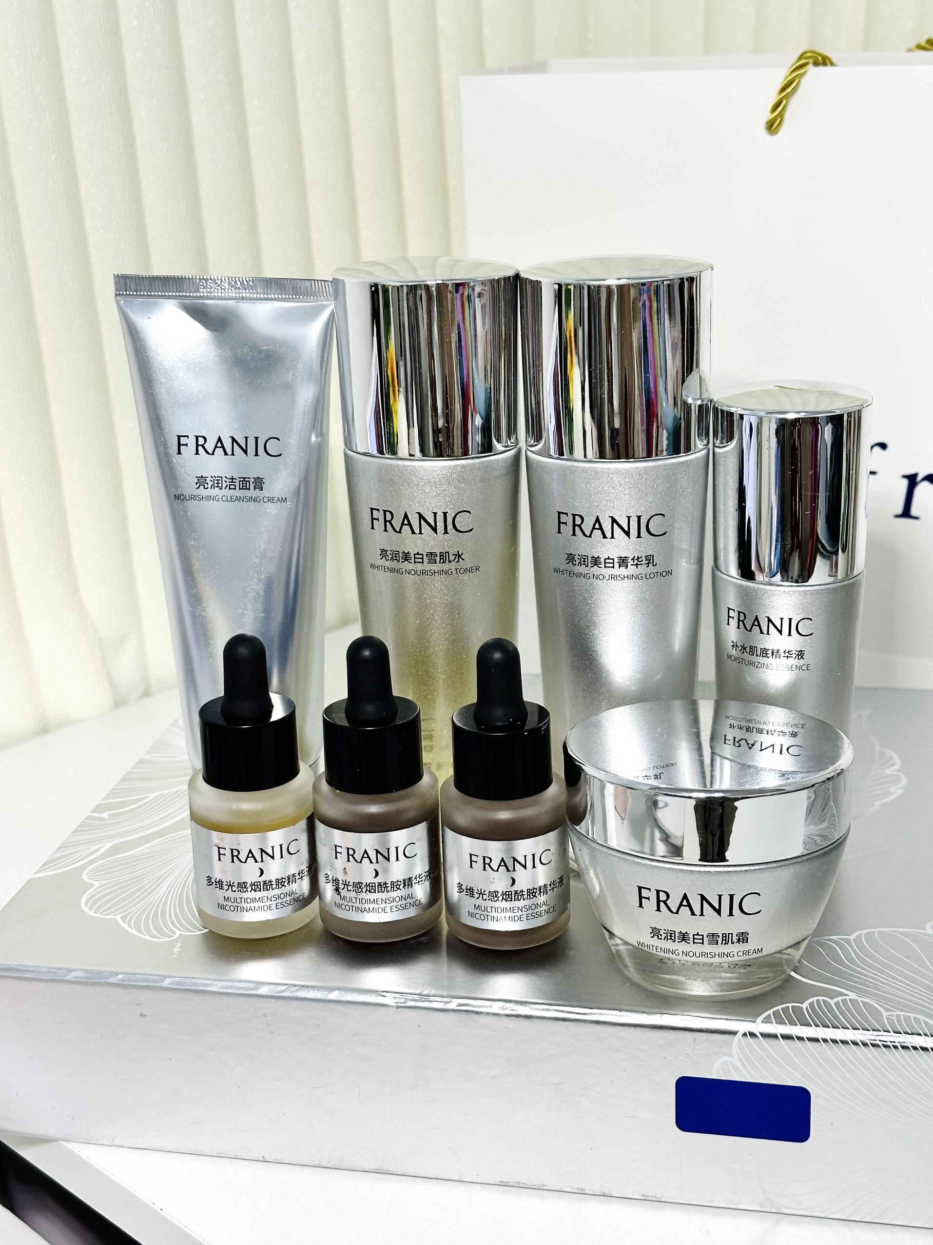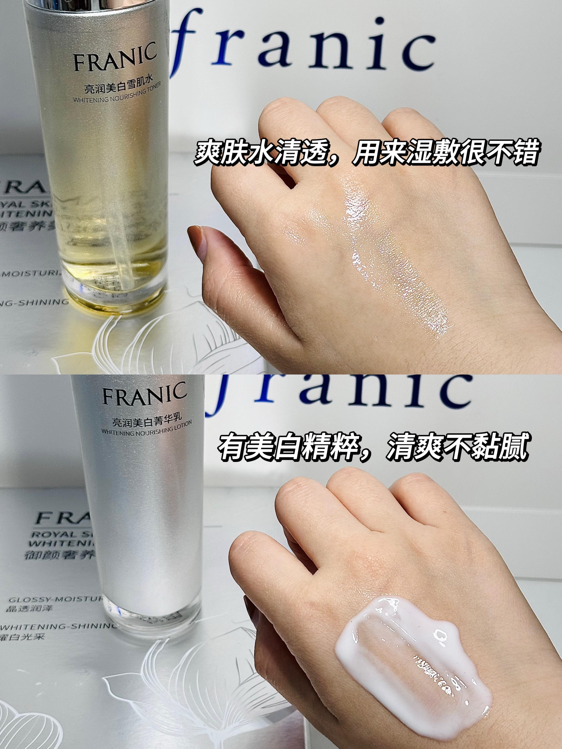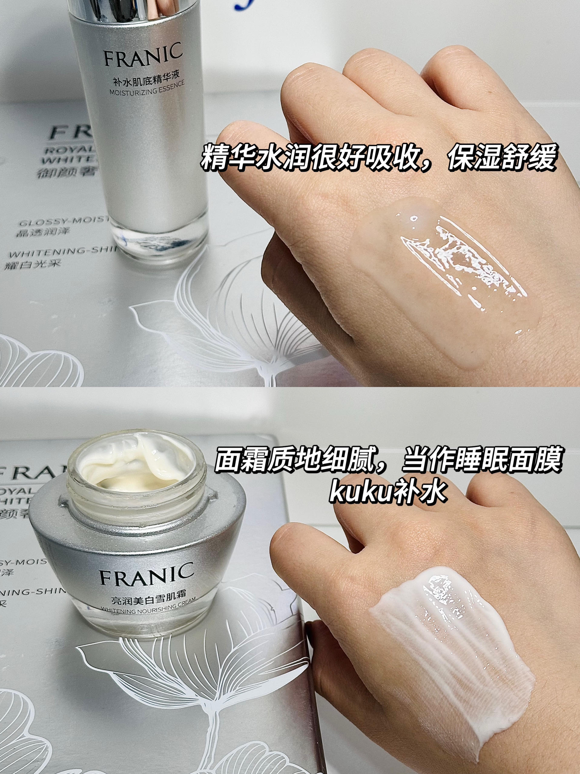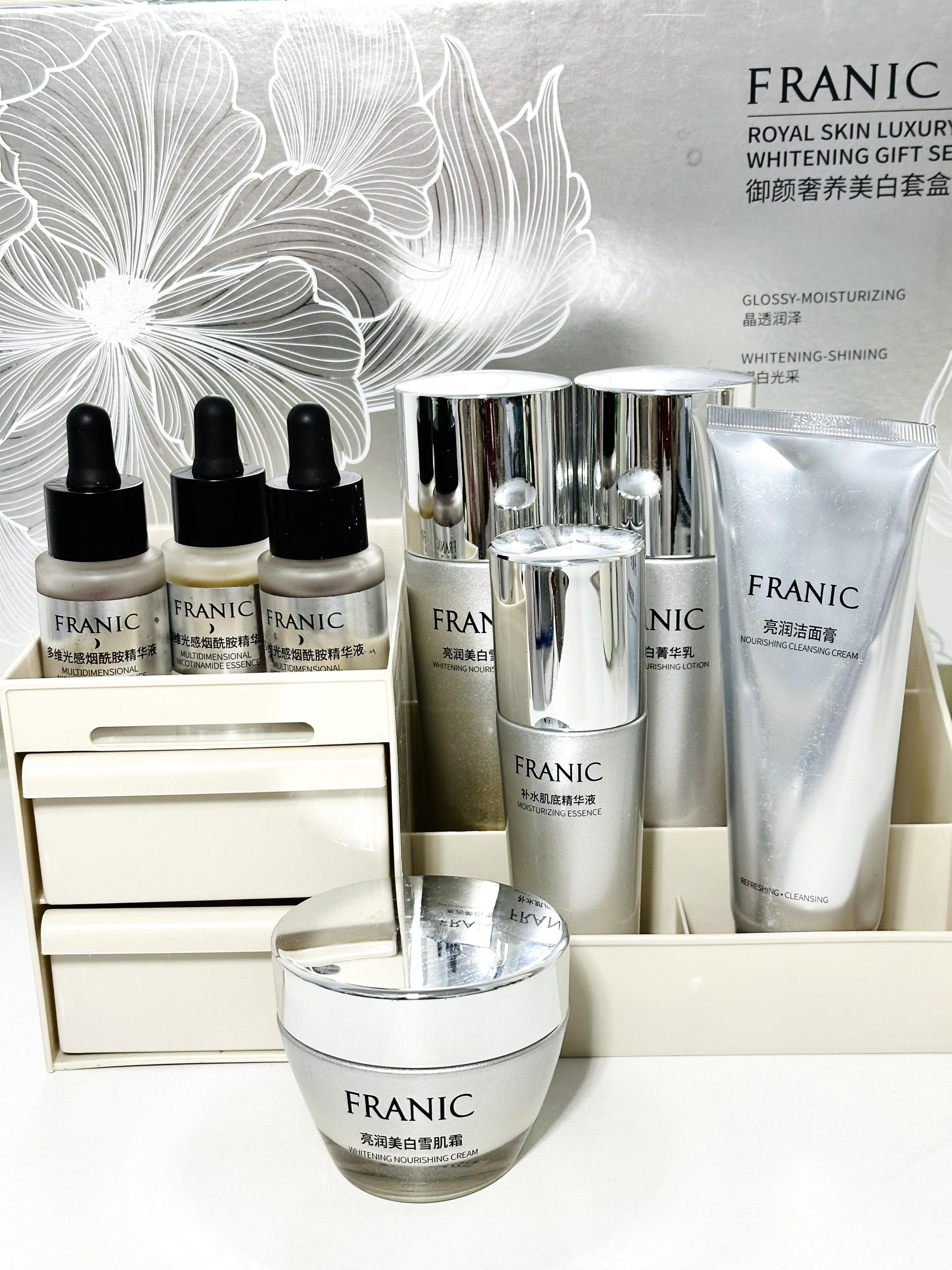 本篇笔记关联了Franic/法兰琳卡 素方花美白护肤套装 洁面120g+水110ml+乳110ml+补水精华50ml+霜55g+烟酰胺精华15ml*3等商品,为用户提供真实的使用体验和购买参考。