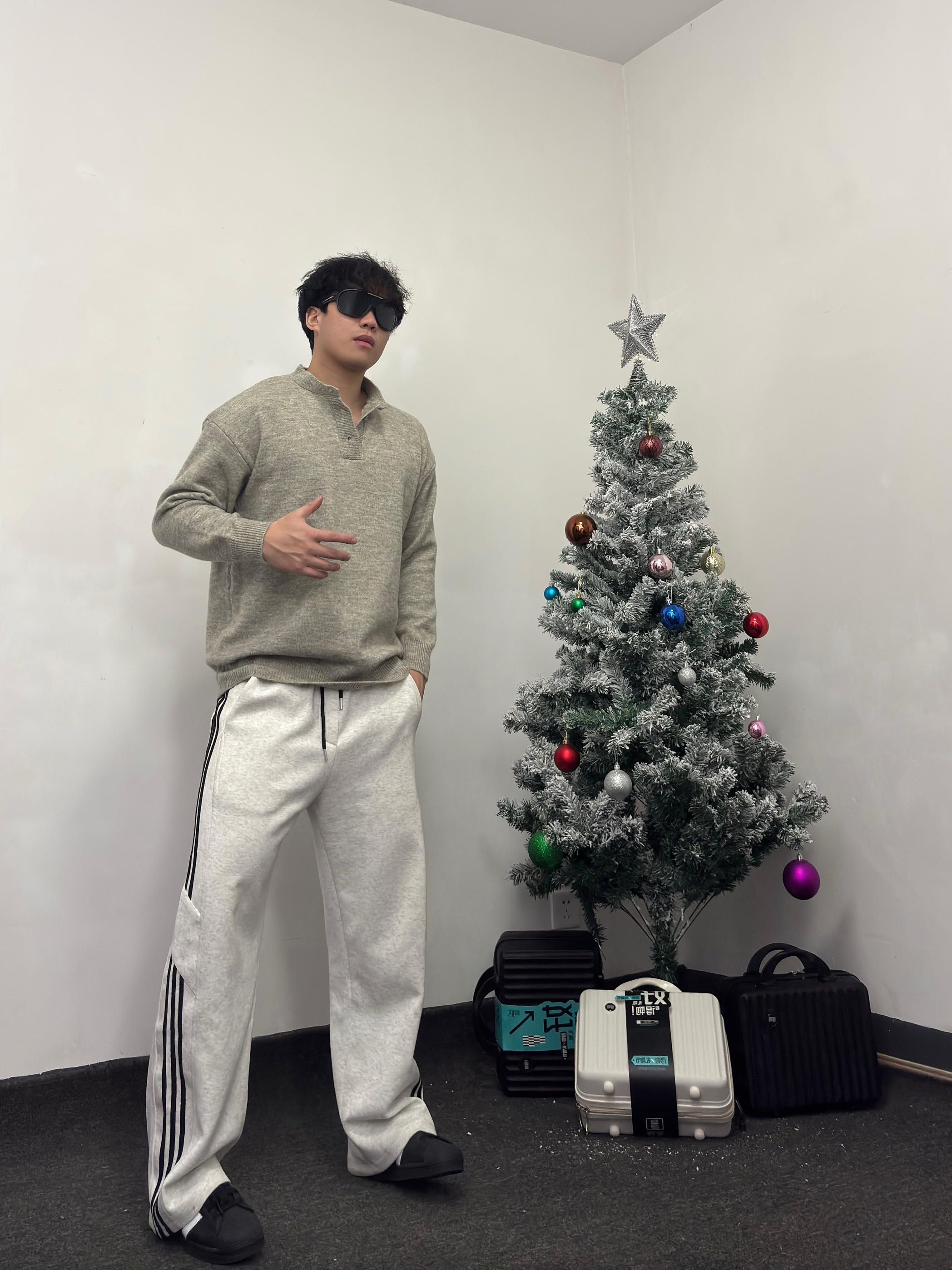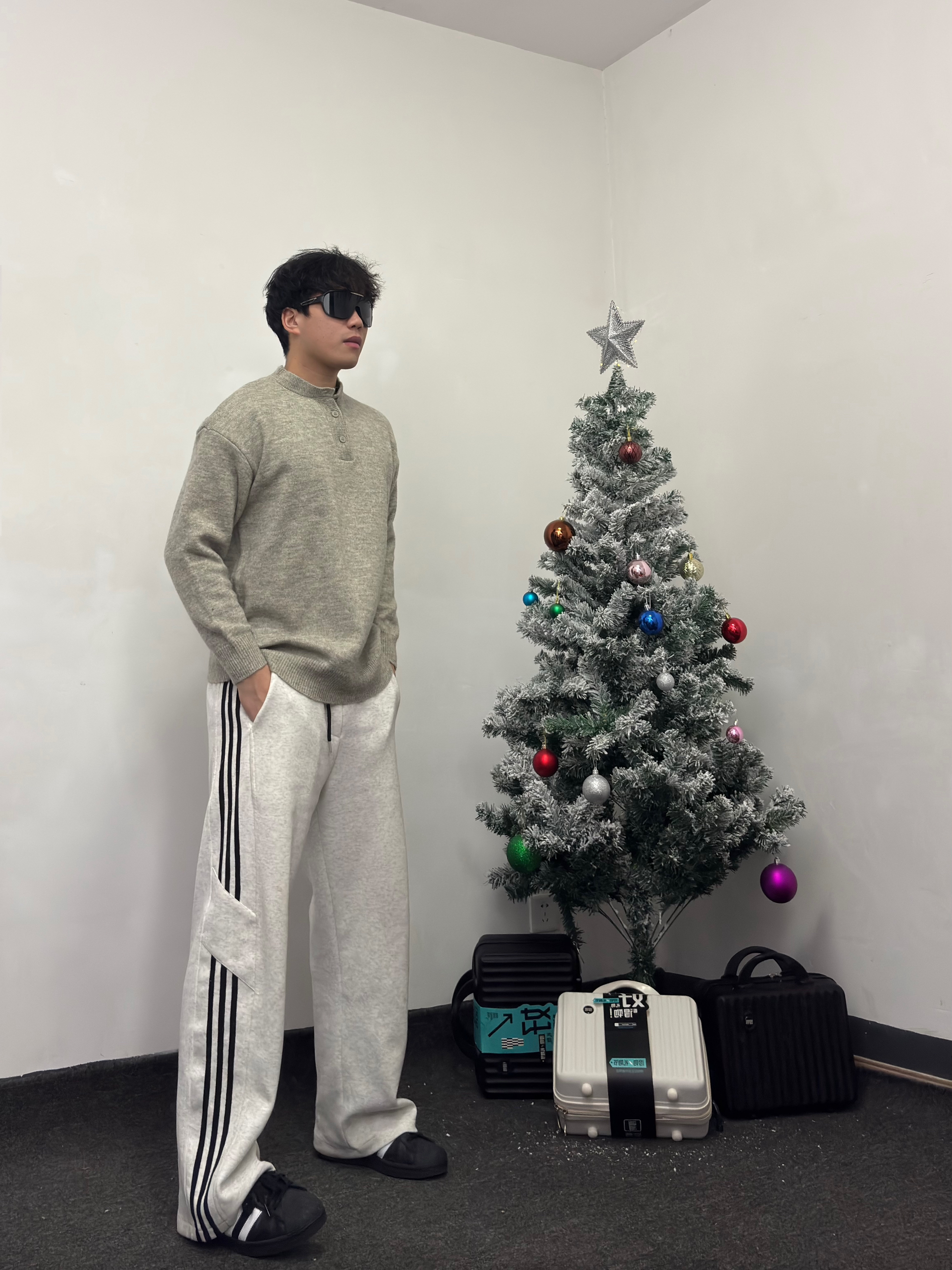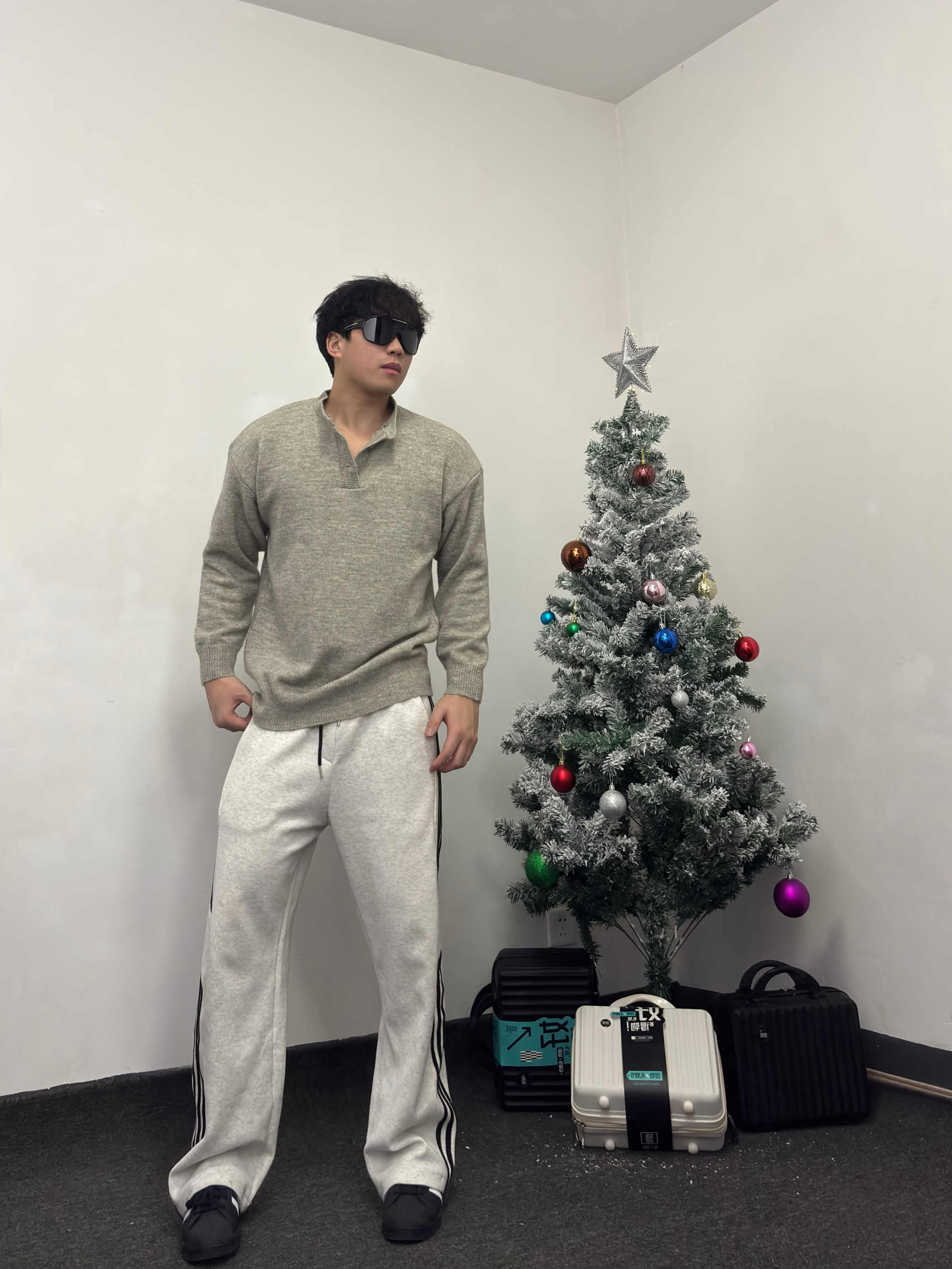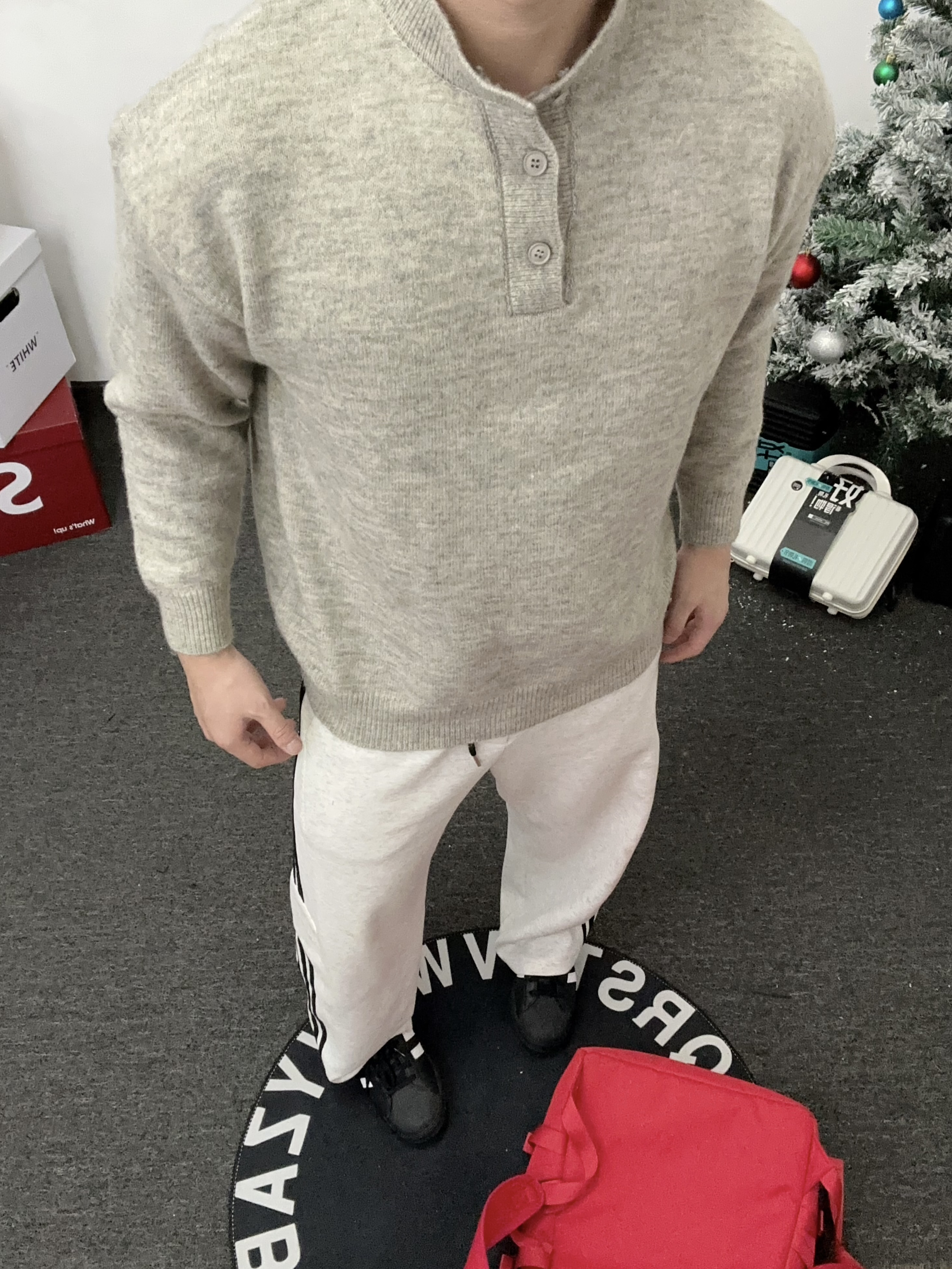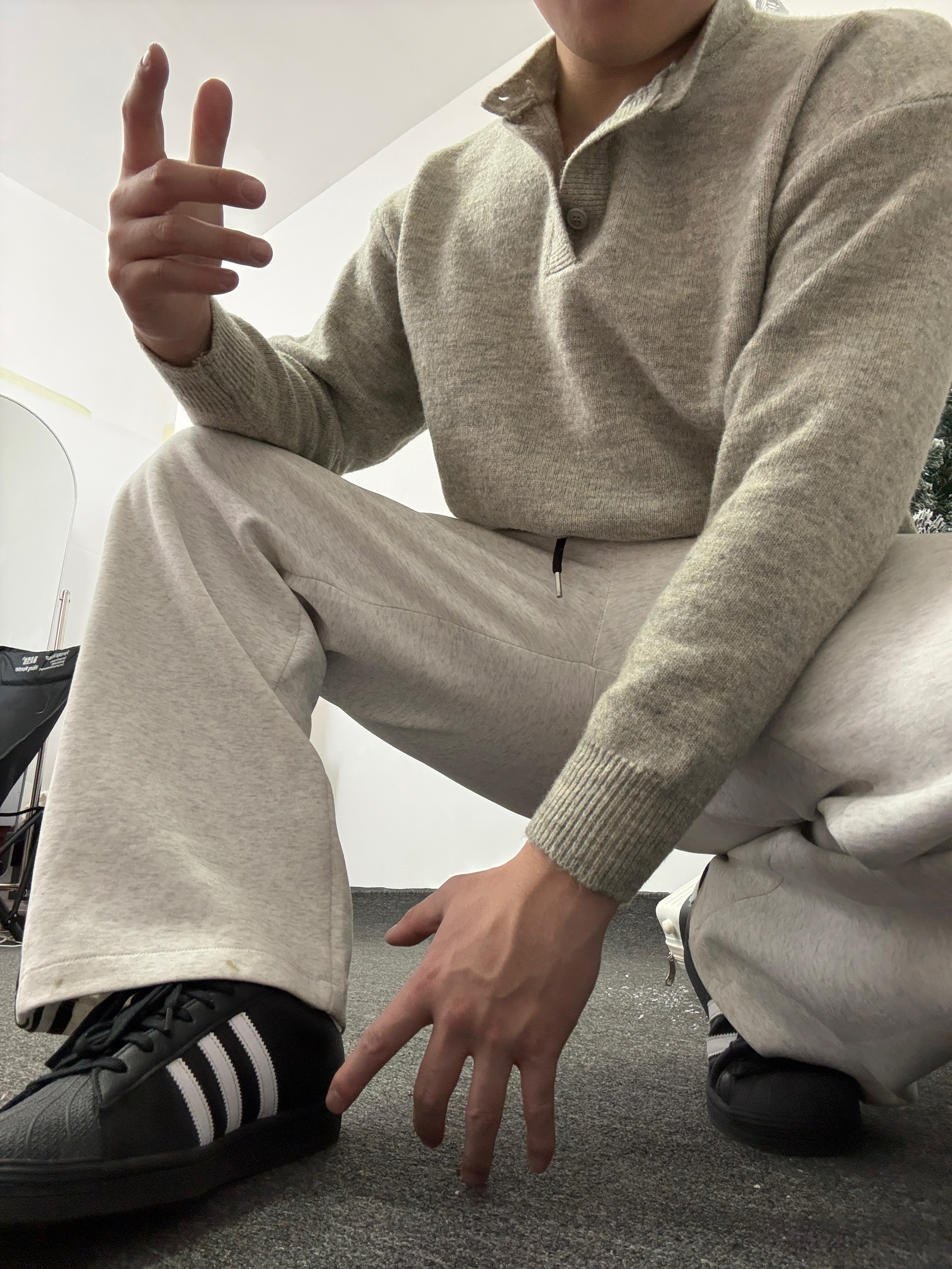 👔浅灰色纽扣领针织衫,整个复古又休闲的设计 颜色百搭且自带温柔滤镜 搭配上一条宽松休闲裤,柔软又舒适 还能轻松搭配出高级感~ 再搭配一双黑白经典贝壳头运动鞋,简约又复古 与裤子条纹呼应,增加整体统一感。 这套look无论是去咖啡馆闲聊、逛街拍照,还是日常通勤,都非常合适,温暖又有型!
