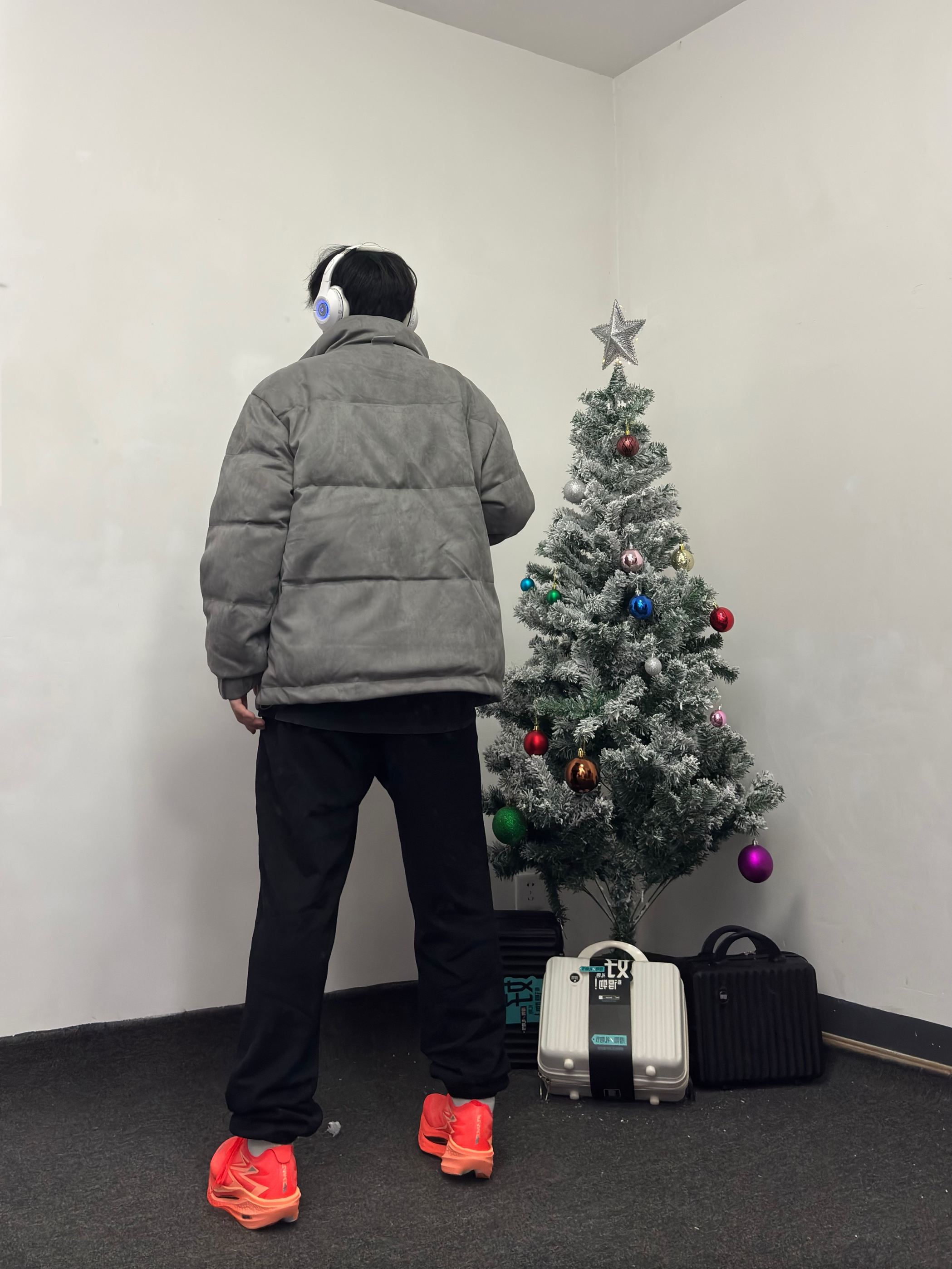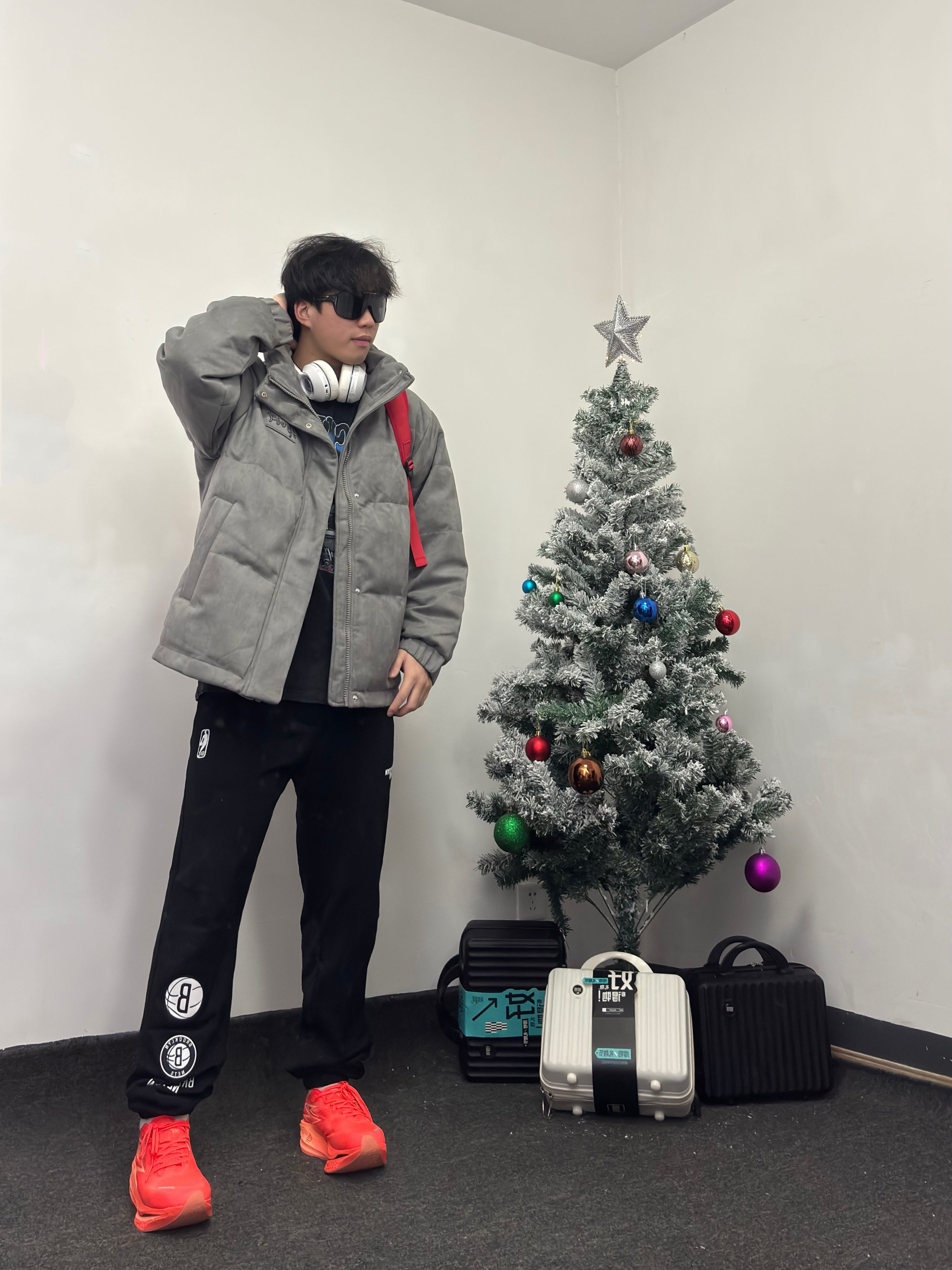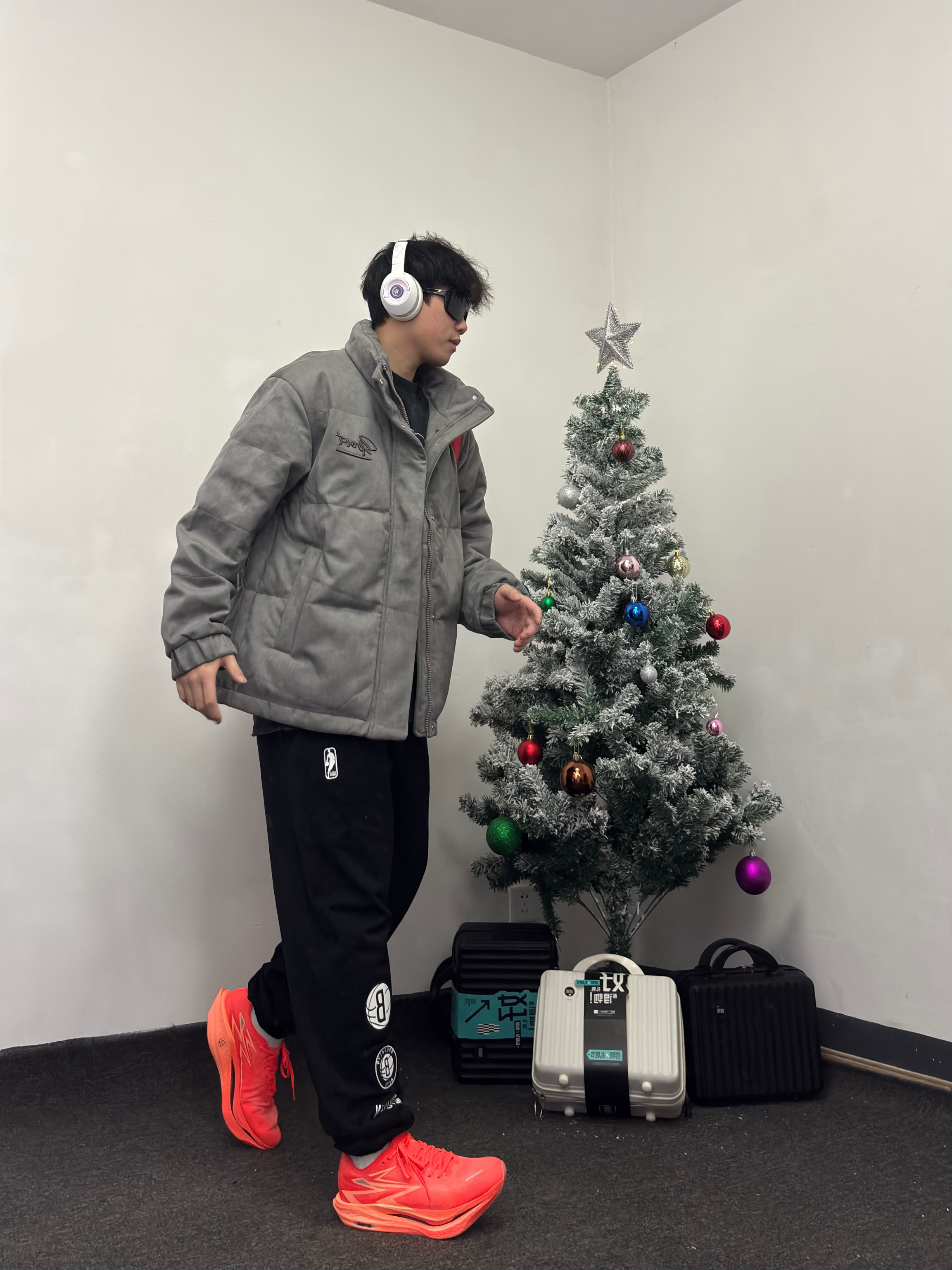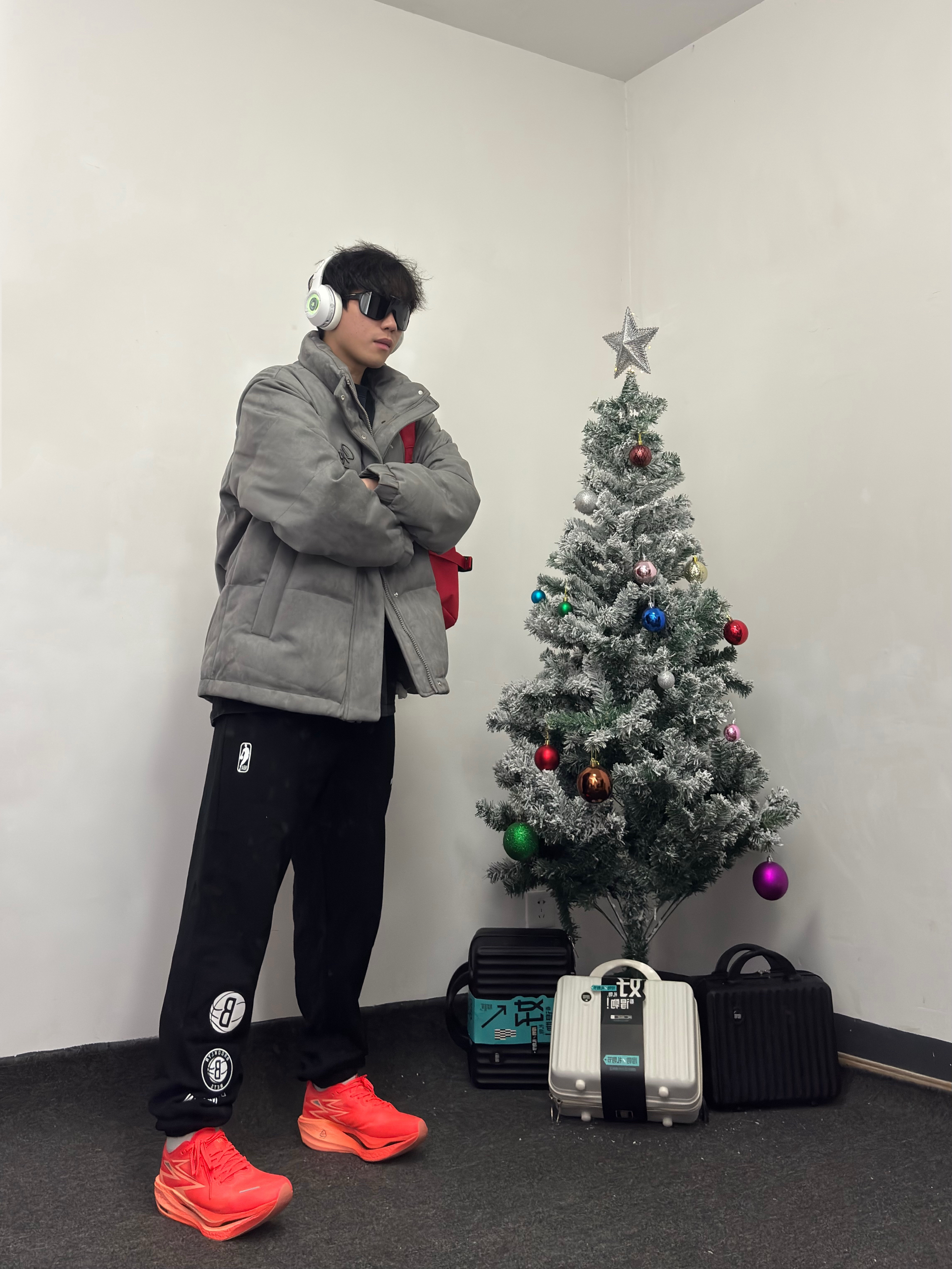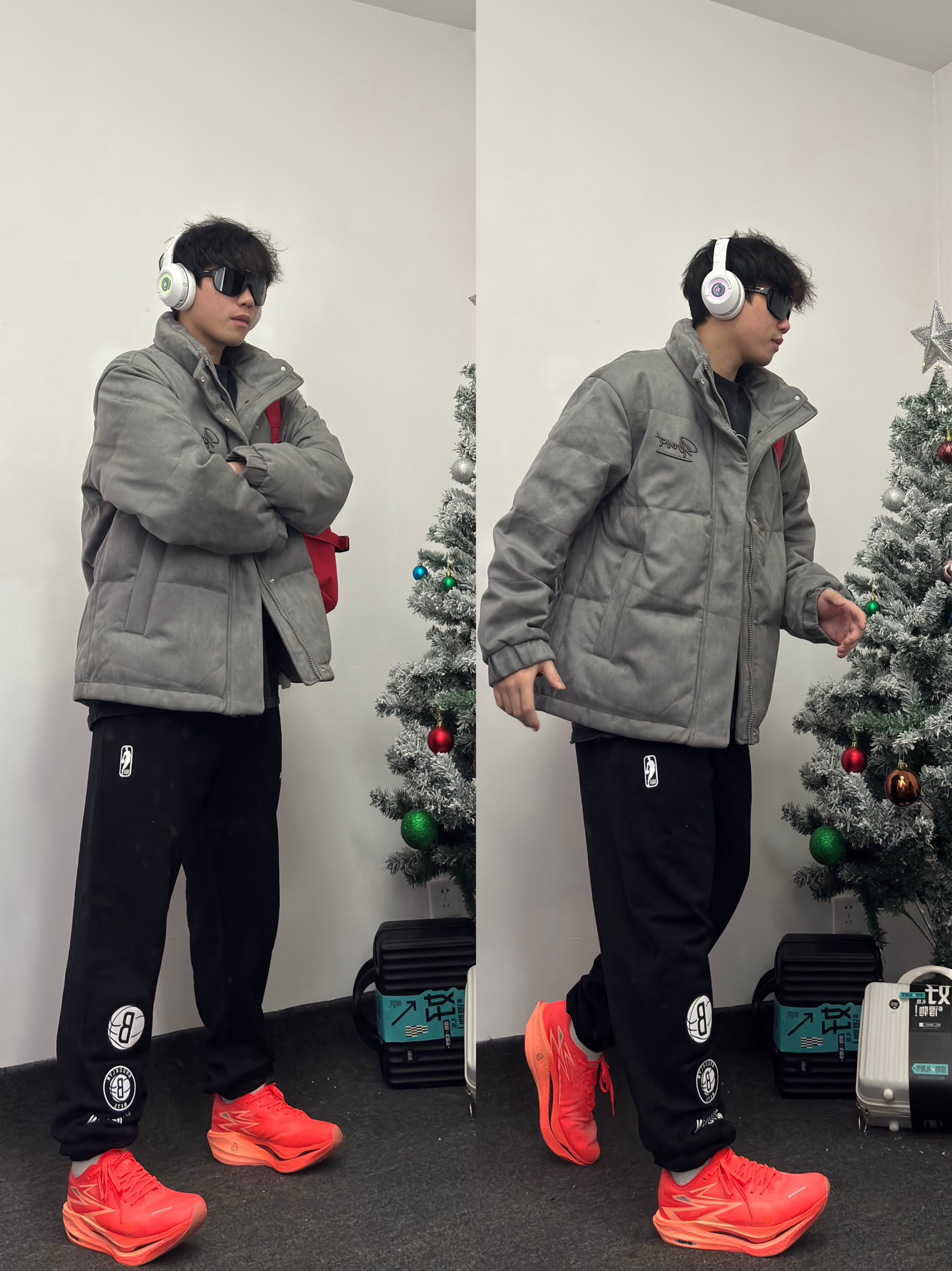 今日运动穿搭分享来咯~Bro 👔外套: 森马 灰色羽绒服,保暖性能拉满,蓬松度不错,搭配黑色内搭低调又酷感十足~ 裤子:NBA 联名黑色运动裤,经典的 Brooklyn Nets 标志,加上宽松剪裁,舒适又百搭🏀 鞋子:飞燃4红橙渐变运动鞋 这套灰黑调性下的亮色穿搭,舒适实用保暖,寒冬运动也能穿出自己的风格✅
