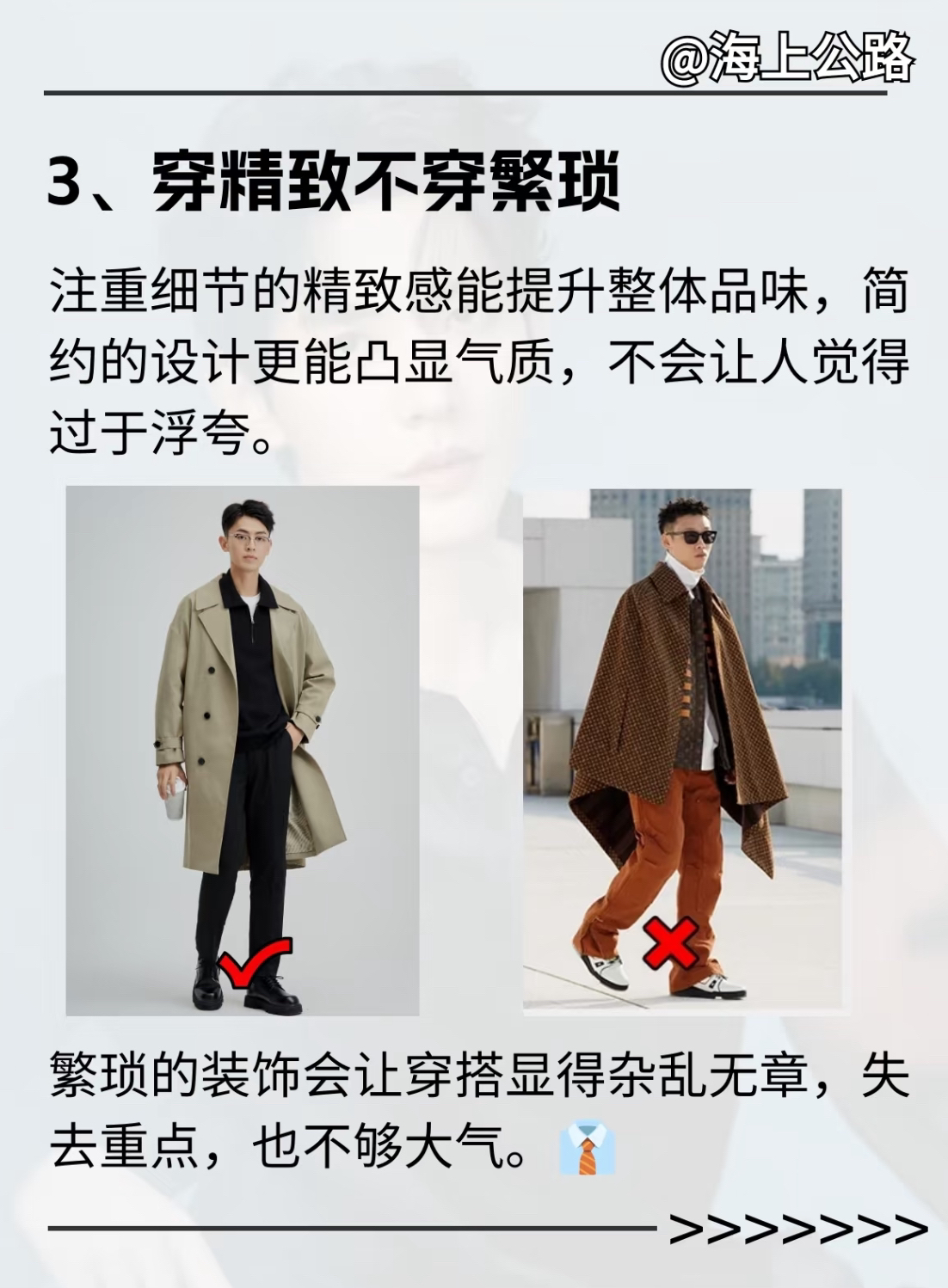 不选择原因:繁琐的装饰会让穿搭显得杂乱无章,失去重点,也不够大气。👔