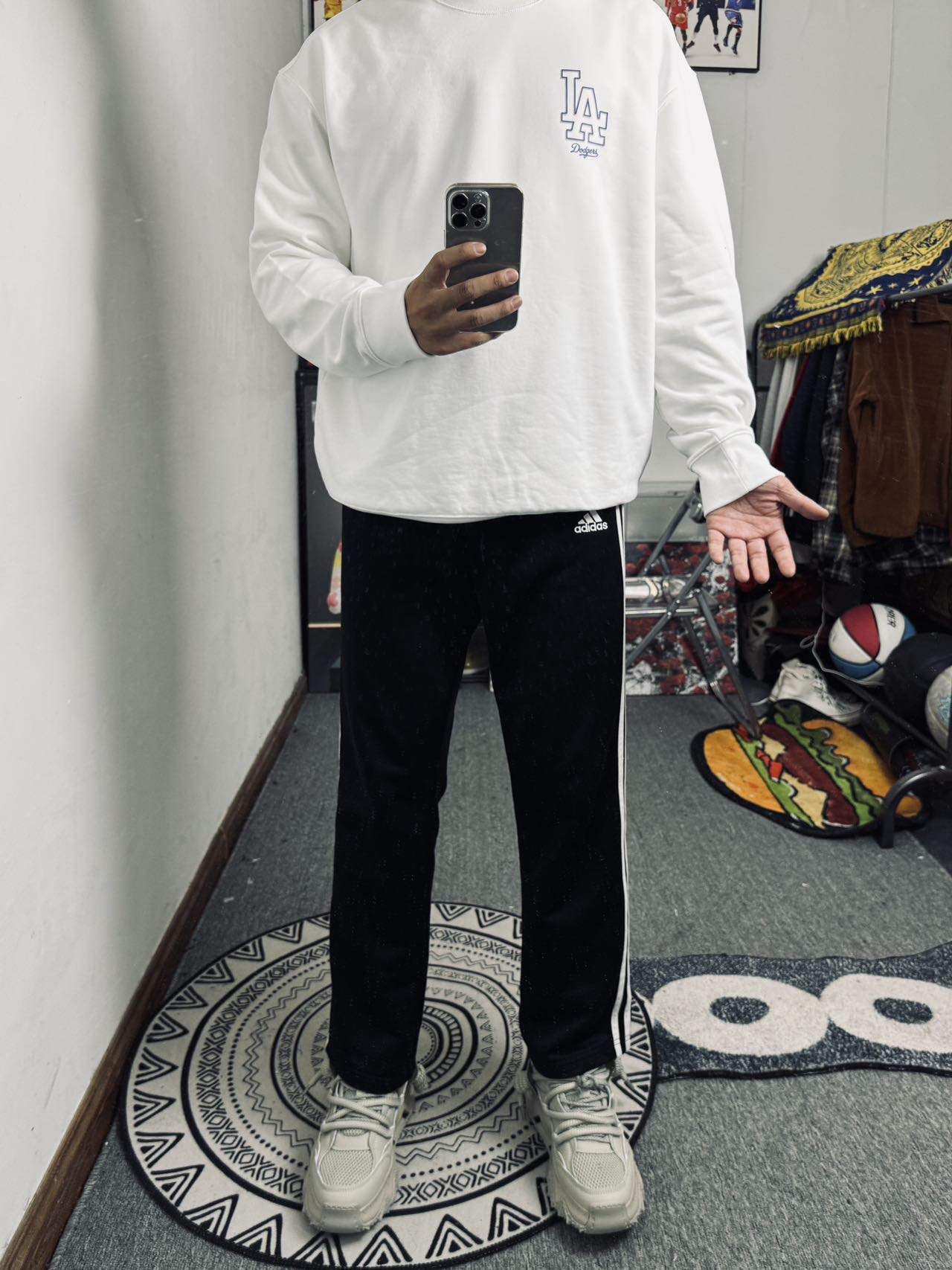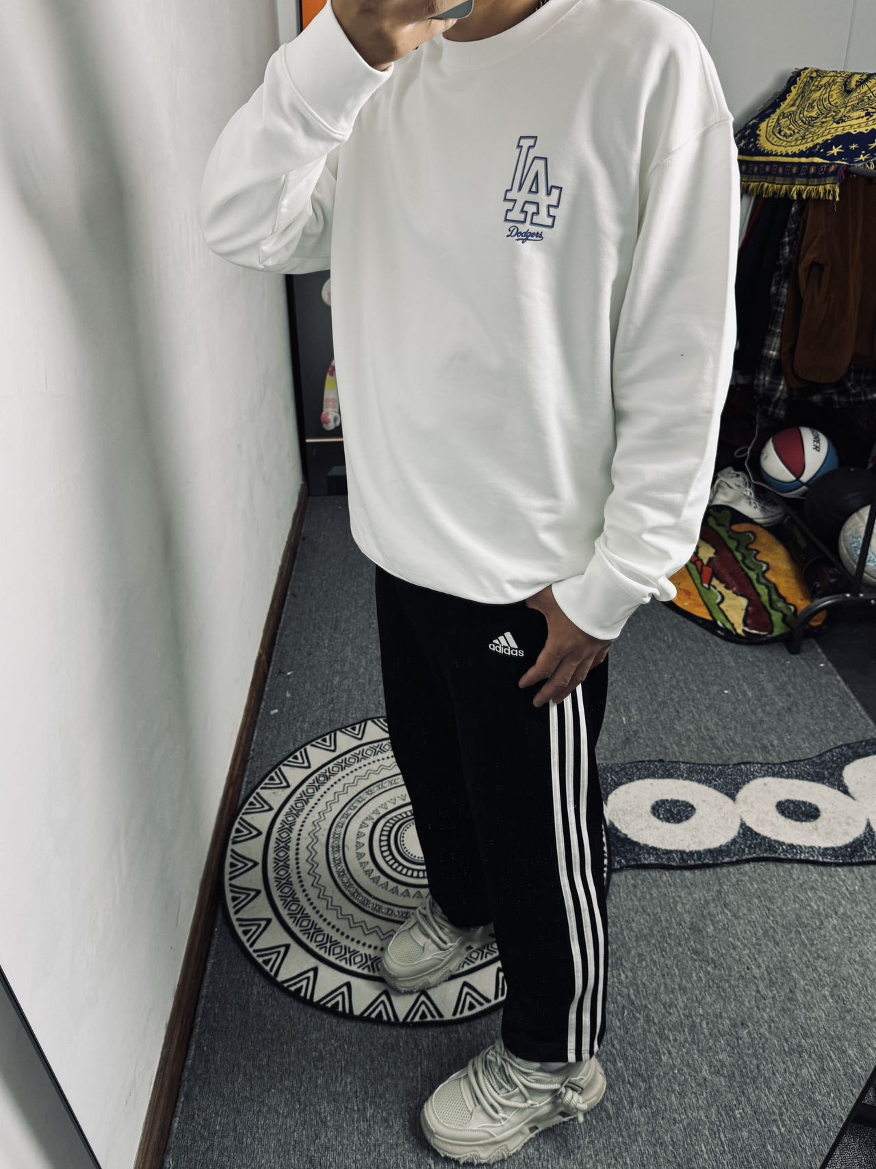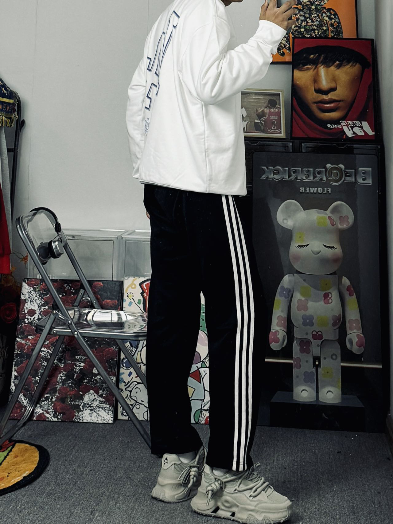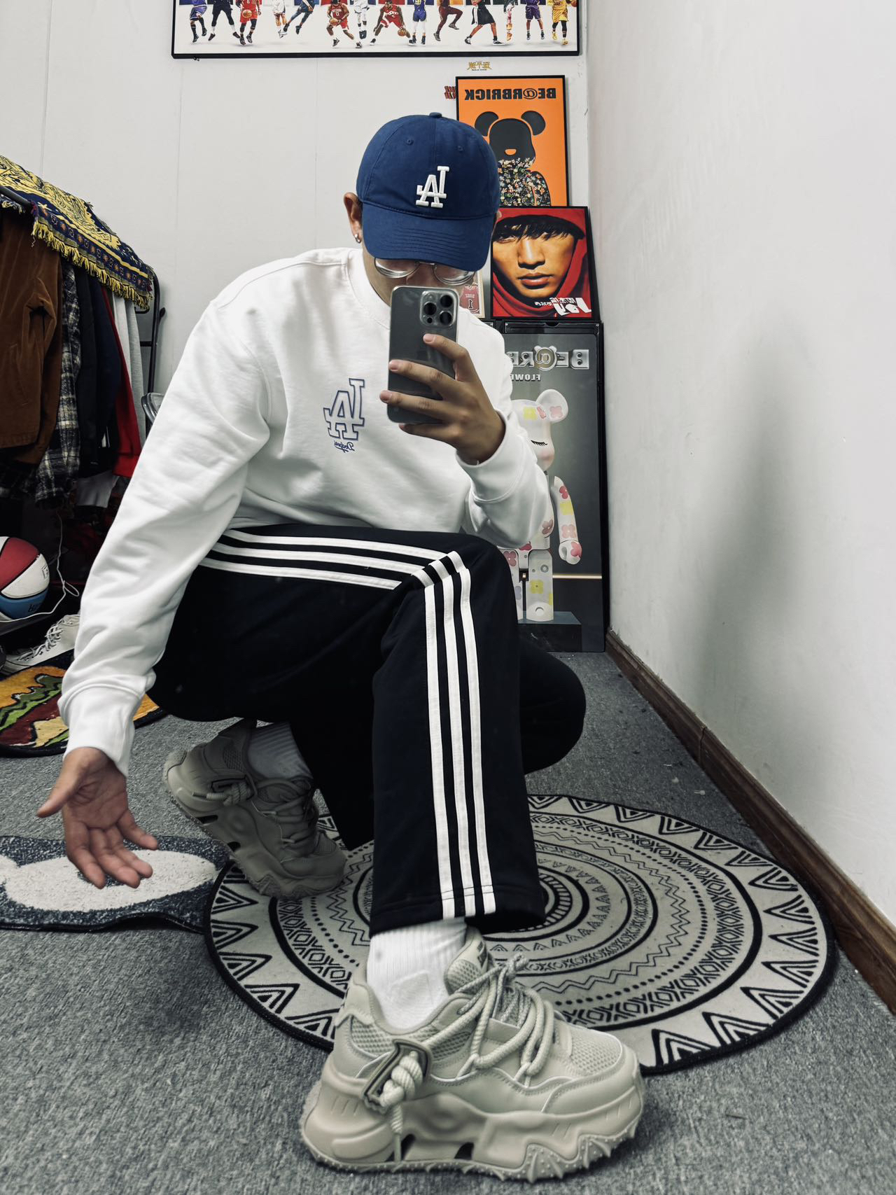 冰美式今日穿搭 👔上衣搭配了一件新款圆领卫衣 前面小Logo背后大logo的经典设计不过时‼️ — 👖条纹直筒裤 宽松版型舒适百搭 — 👟鞋子搭配了一双低帮老爹鞋 我个人喜欢这个大厚底设计 对我这种小个子比较友好🉐 雅杏色出门逛街也不容易撞色🔆 脏辫鞋带彰显个性✨