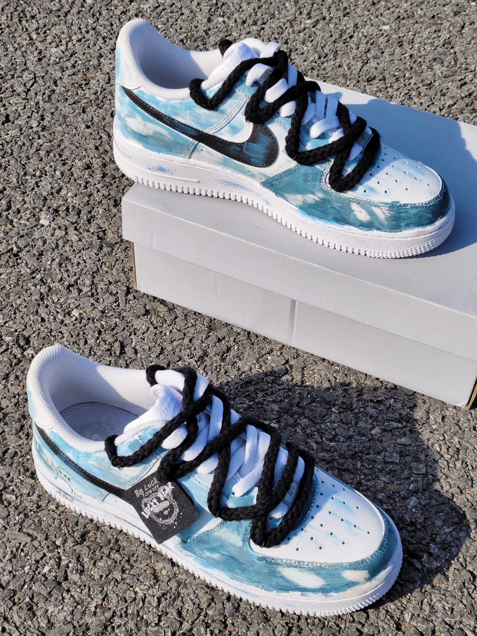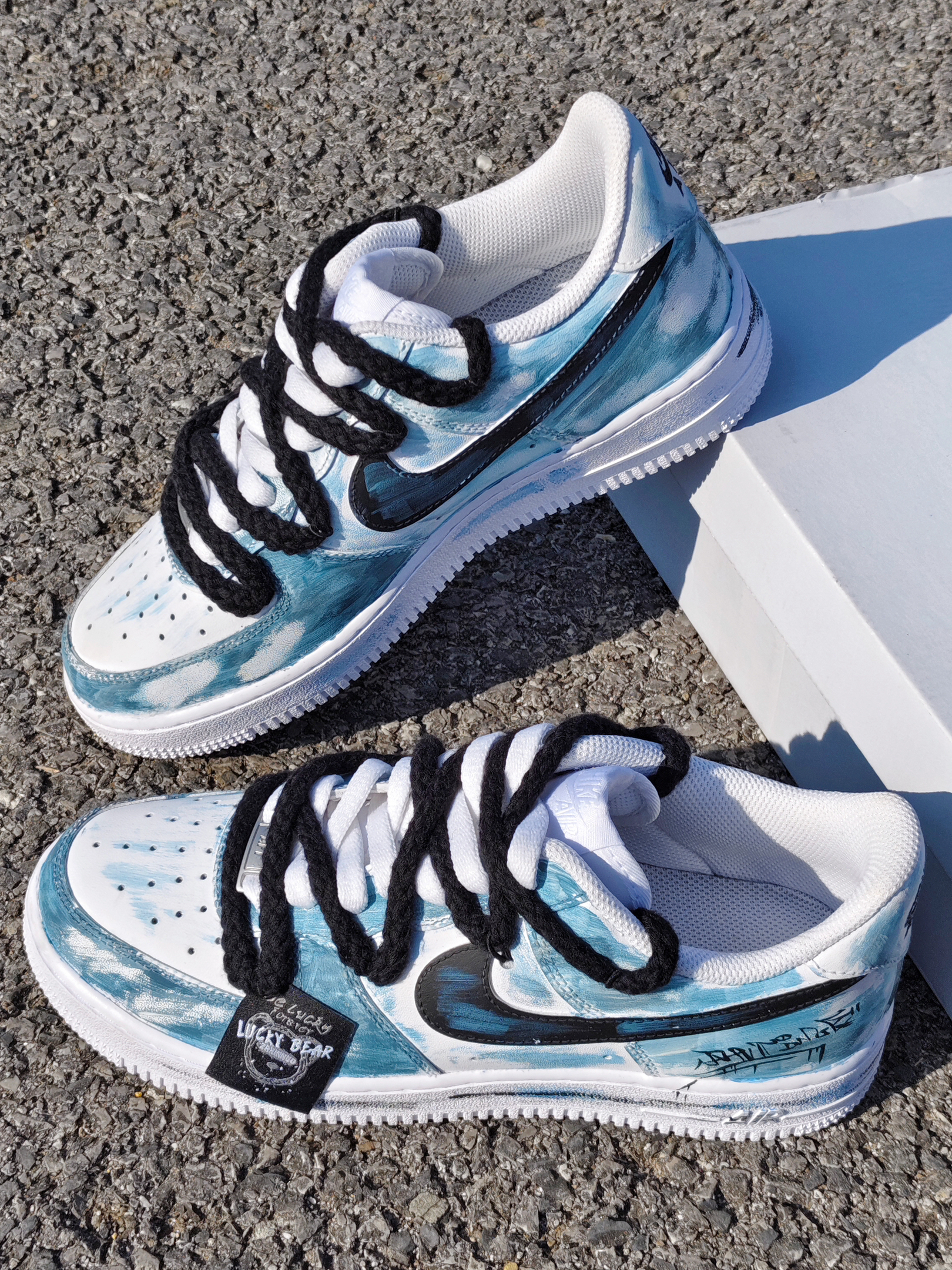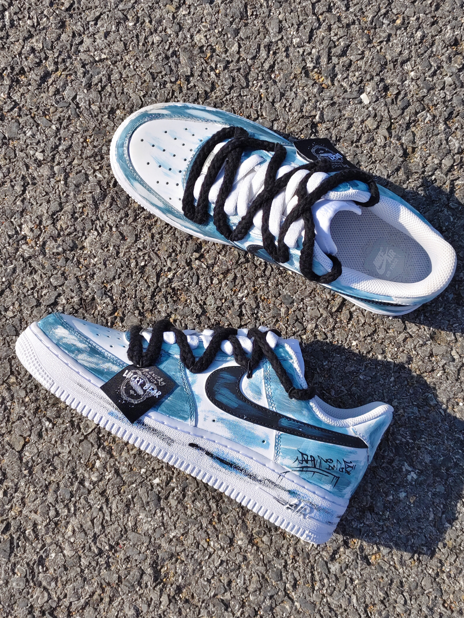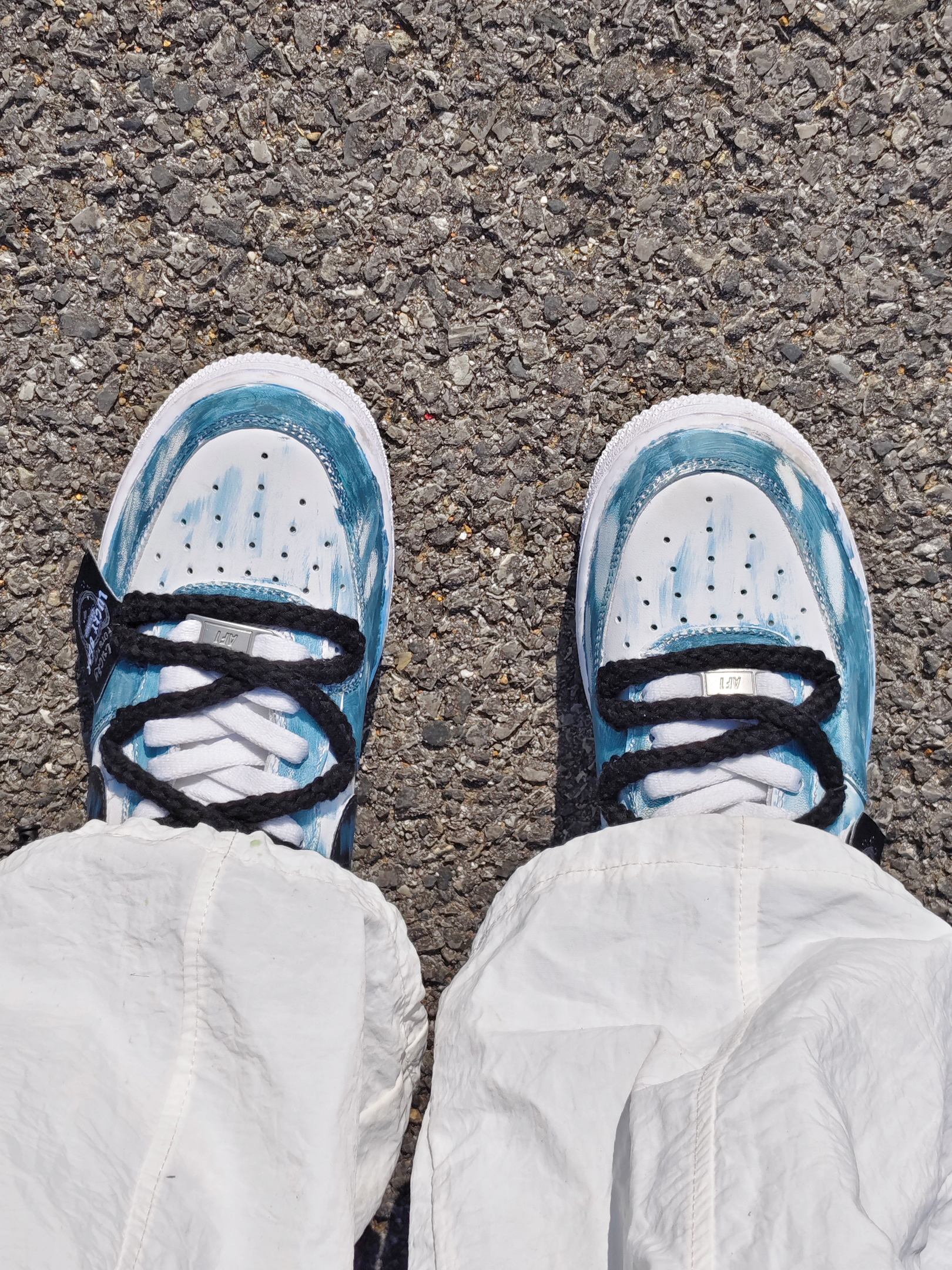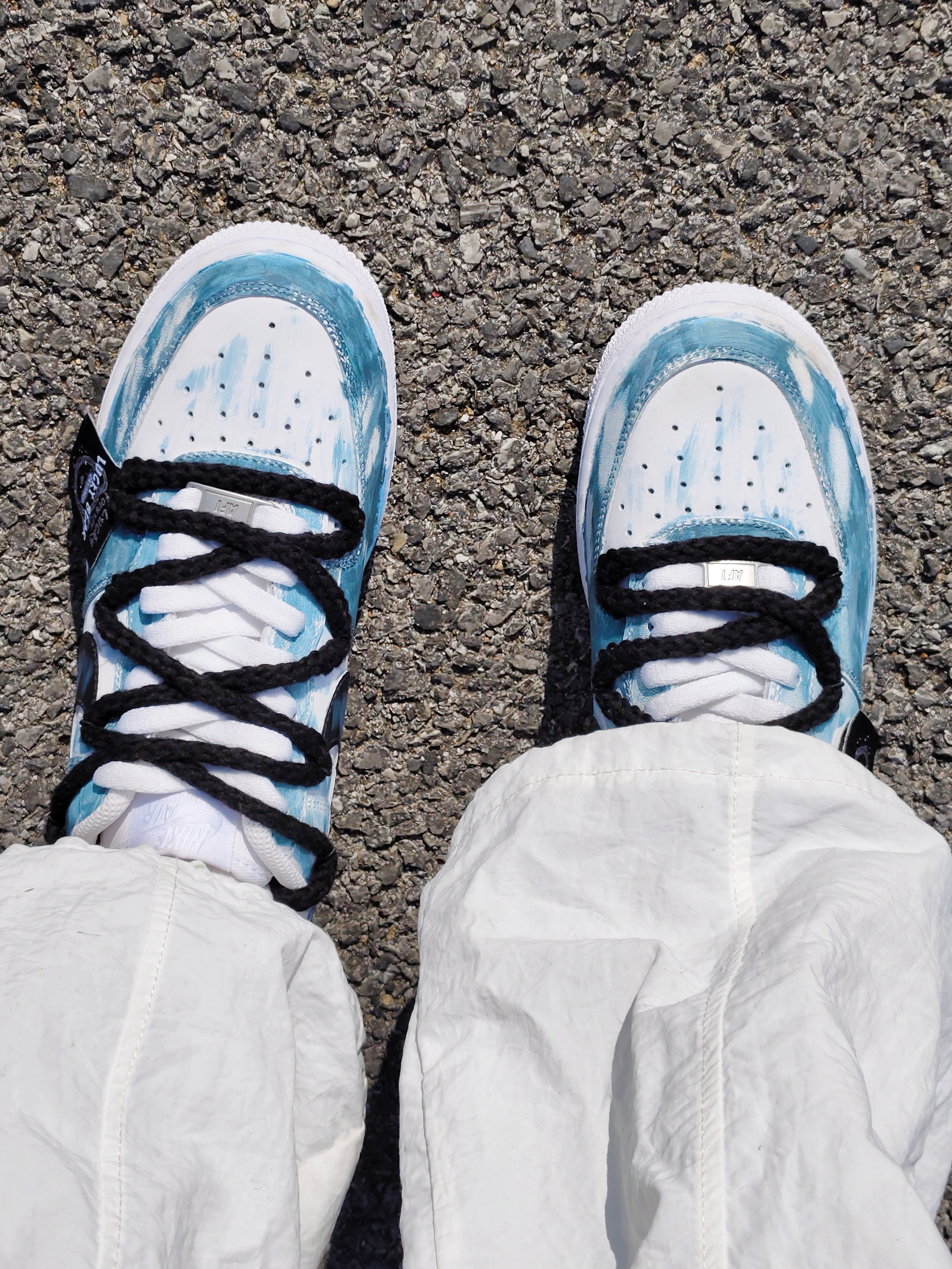 嘿!是晕晕 芥双定制空军也泰吼看啦叭 整体配色是涂鸦湖绿色的,好似国风山水 结构风双鞋带的设计,增加了层次感 刚上脚有点硬,空军的通病啦 日常搭配一条深色牛阔腿裤就挺好看的 秋冬好鞋又找到啦