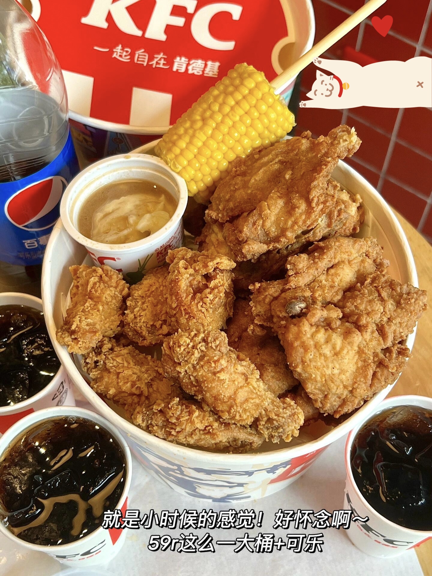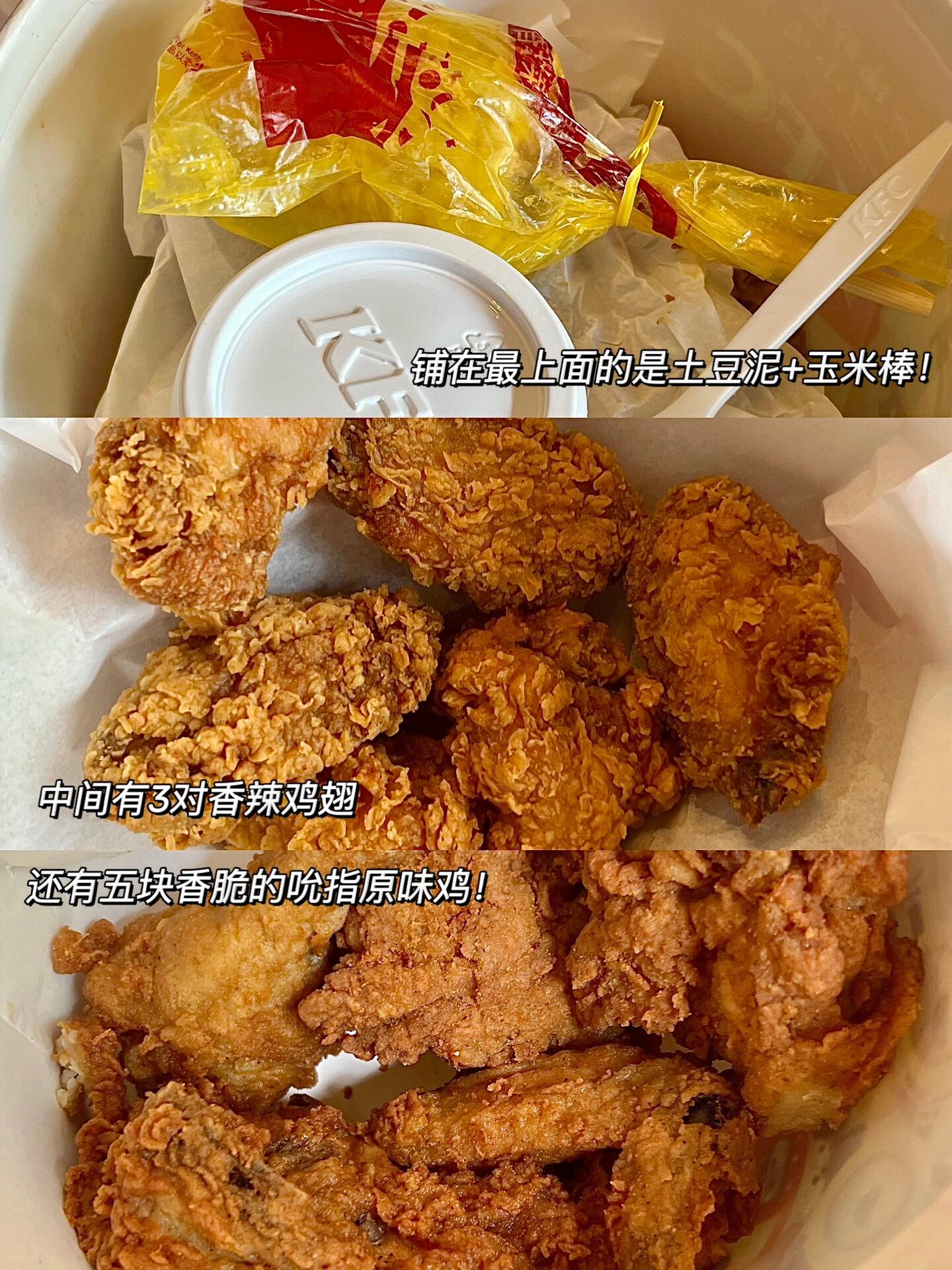 是我从小吃到大的全家桶! 过年的时候经常和哥哥姐姐一起去肯德基,抱着一大桶可劲儿吃! 简直就是小时候逢年过节必点! 甚至还是小时候的价格! 里面是三层满满的,刚拿到手就闻到飘出来的香气了哈哈哈 打开有我超喜欢的吮指原味鸡和香辣鸡翅! 原味鸡有5⃣️块呢!真的吃到爽! 还有小时候经常吃的软绵绵土豆泥~ 甜甜糯糯的玉米棒简直是我童年心中的光~ 再加上1.25L的大可乐! 分量还是很足的! (图源网络侵...