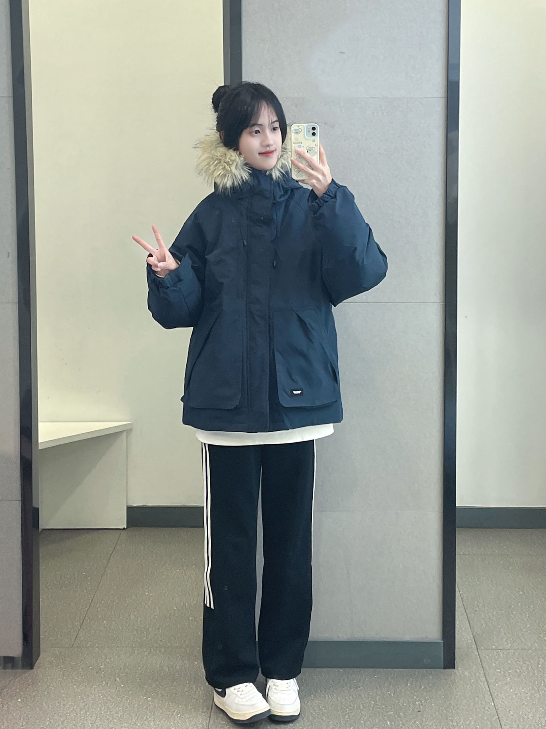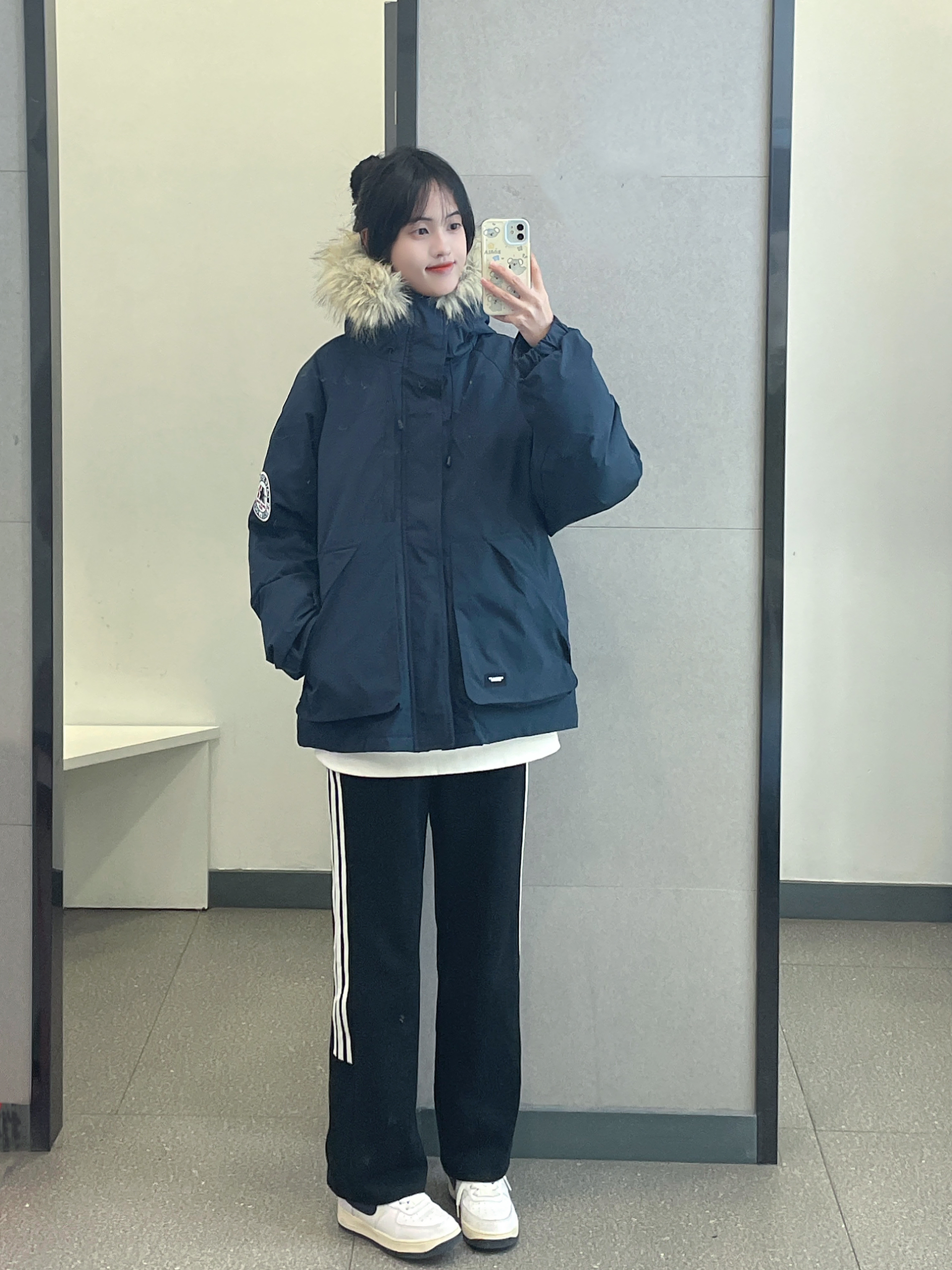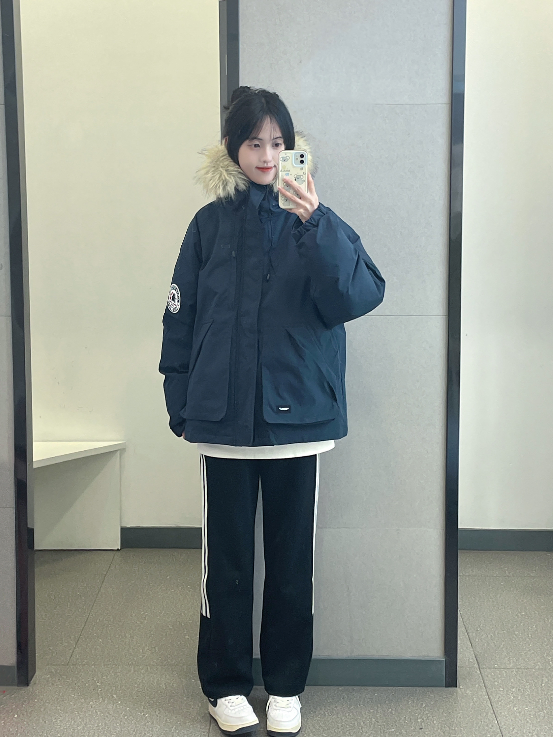 👔 :OWOX藏青色毛领羽绒服 👖 :coldstone黑白条纹裤