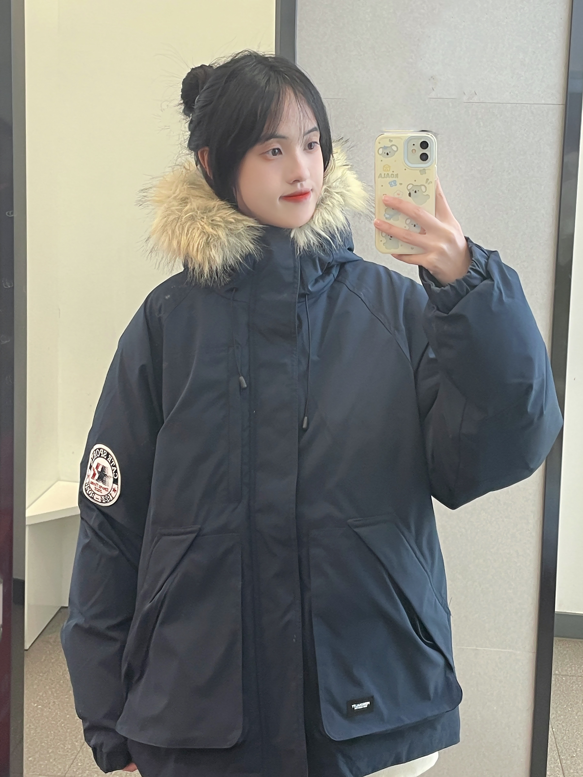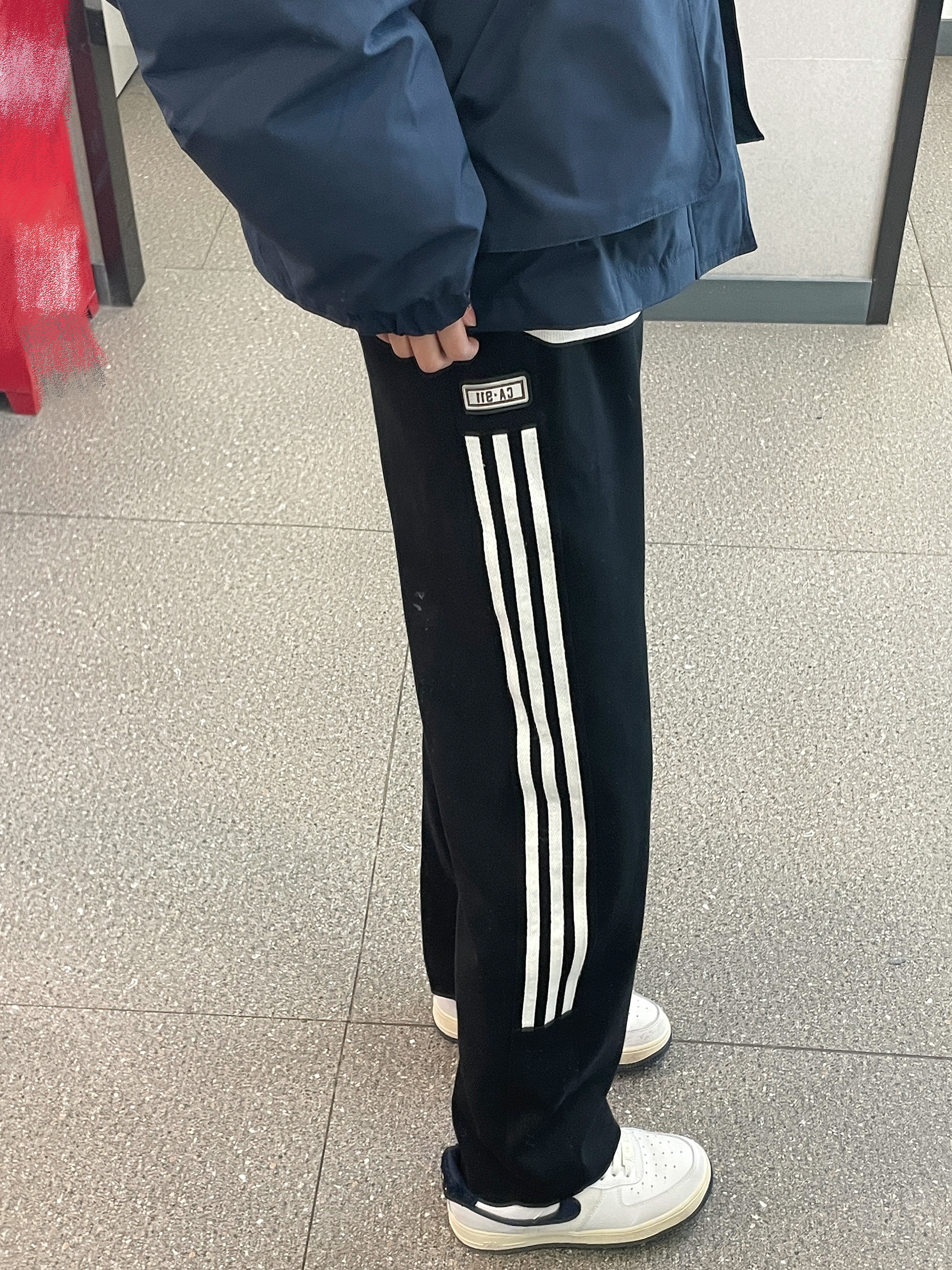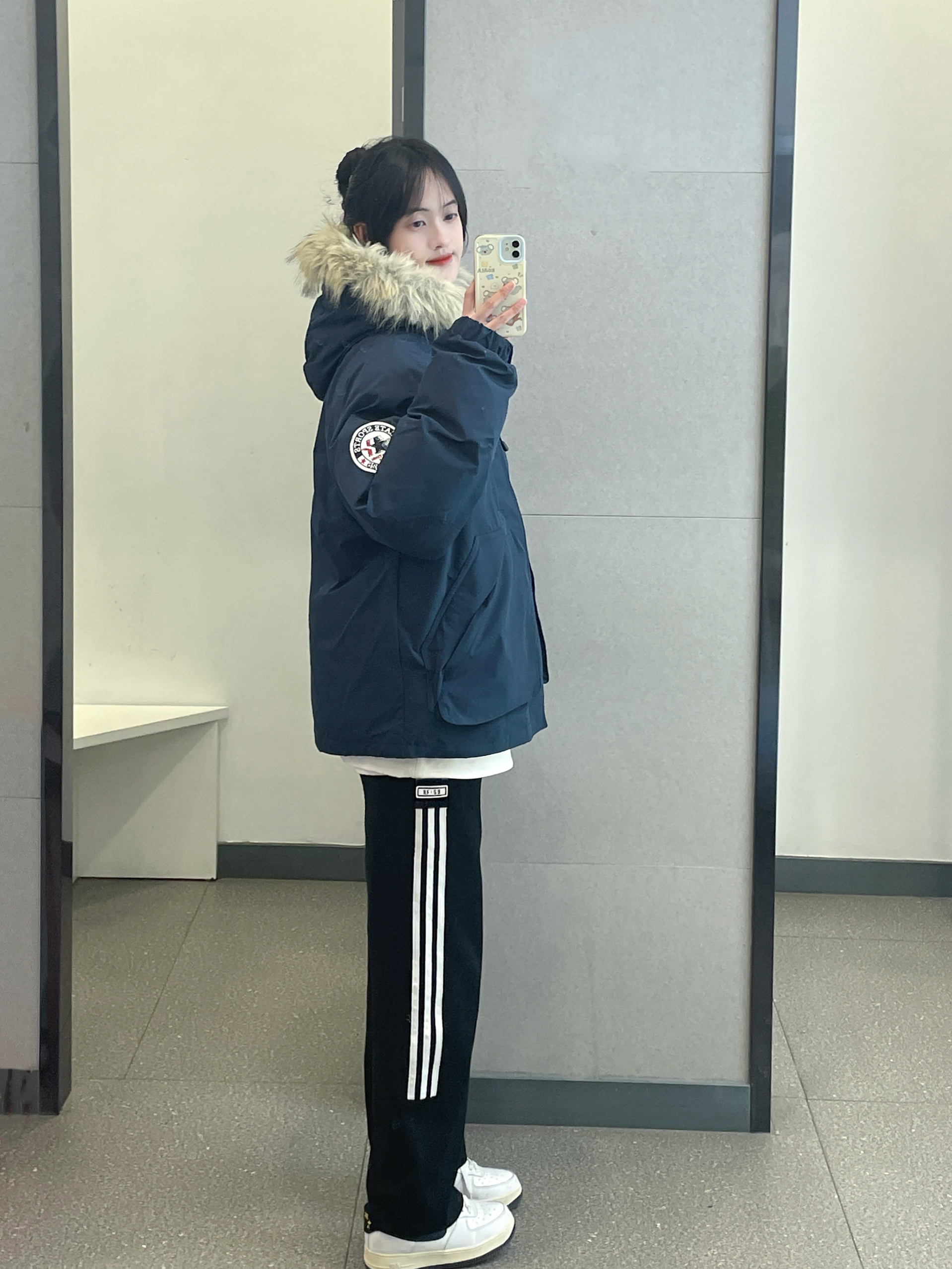 👔 :OWOX藏青色毛领羽绒服 👖 :coldstone黑白条纹裤