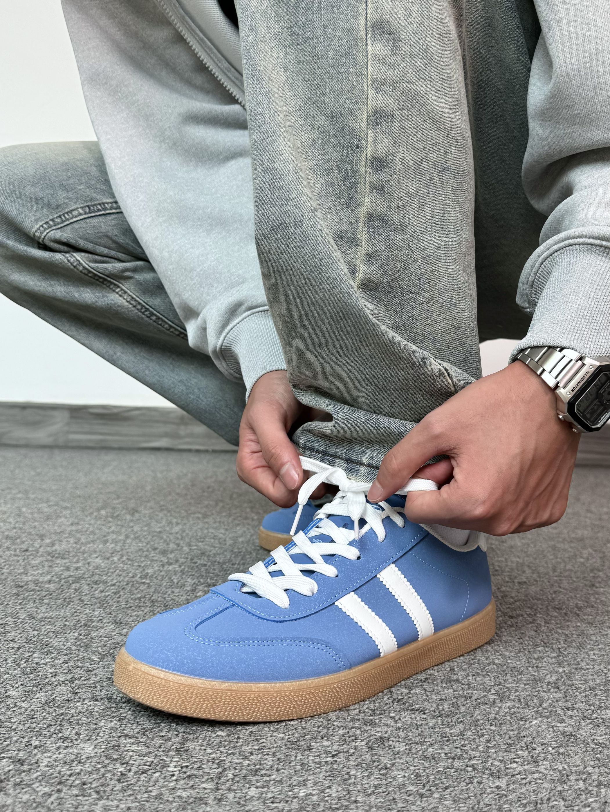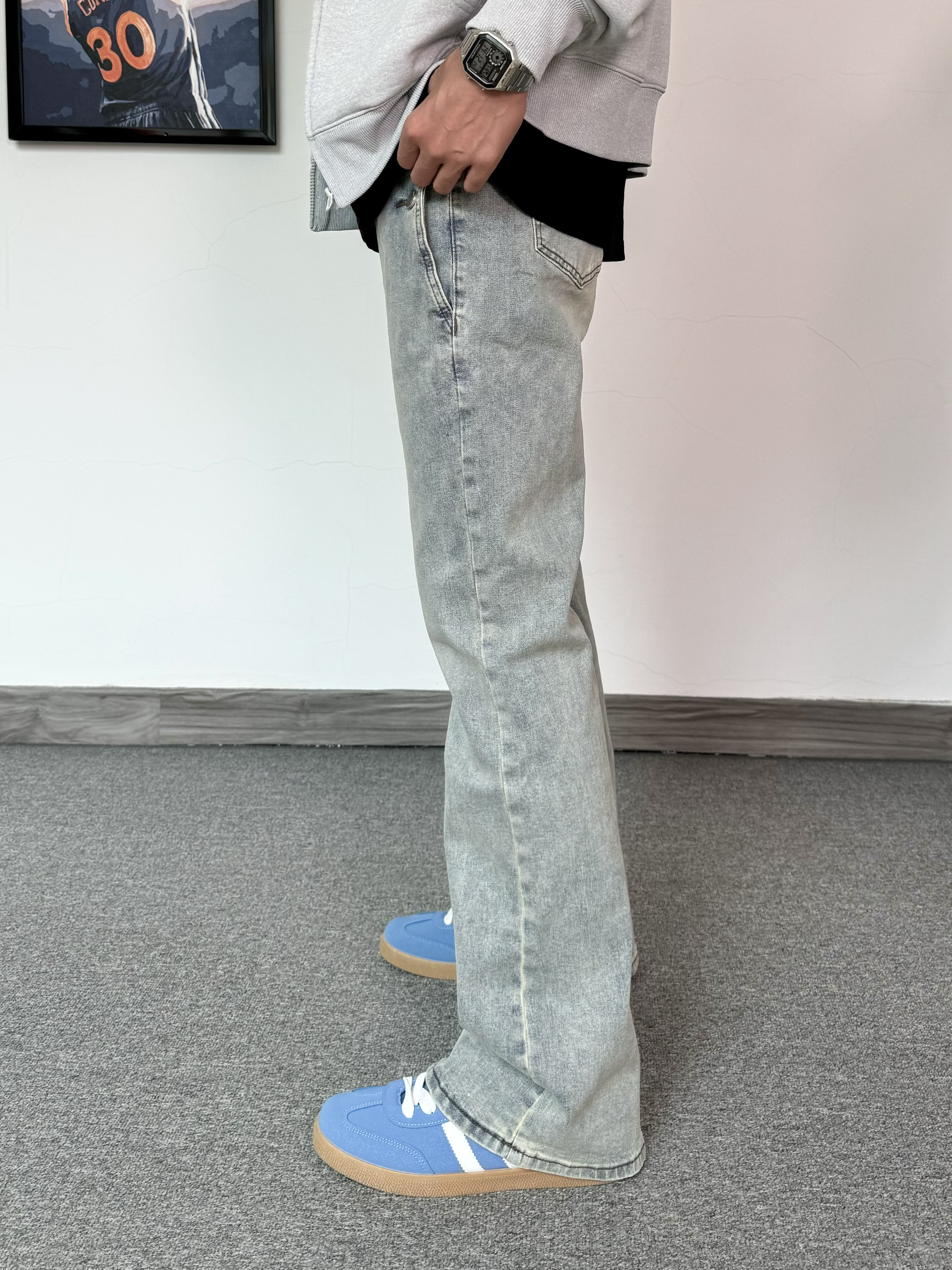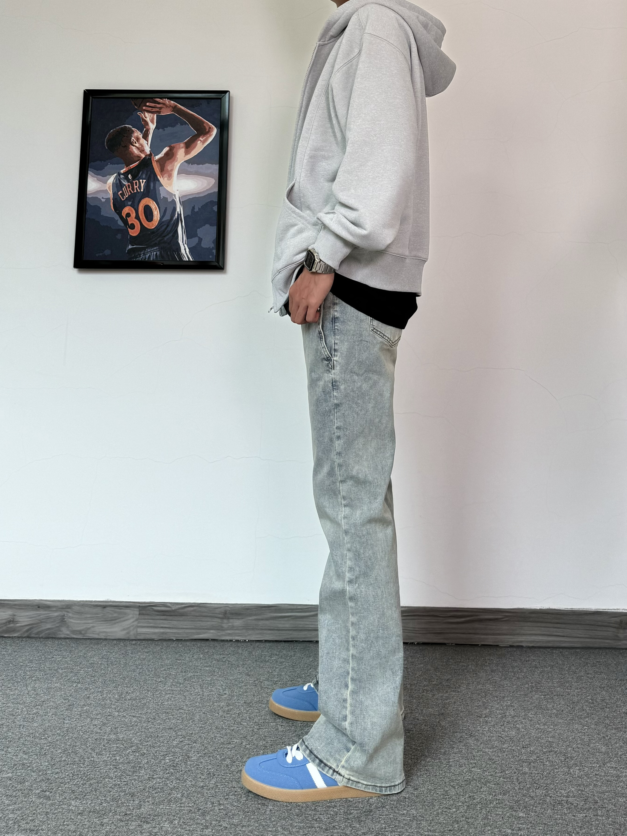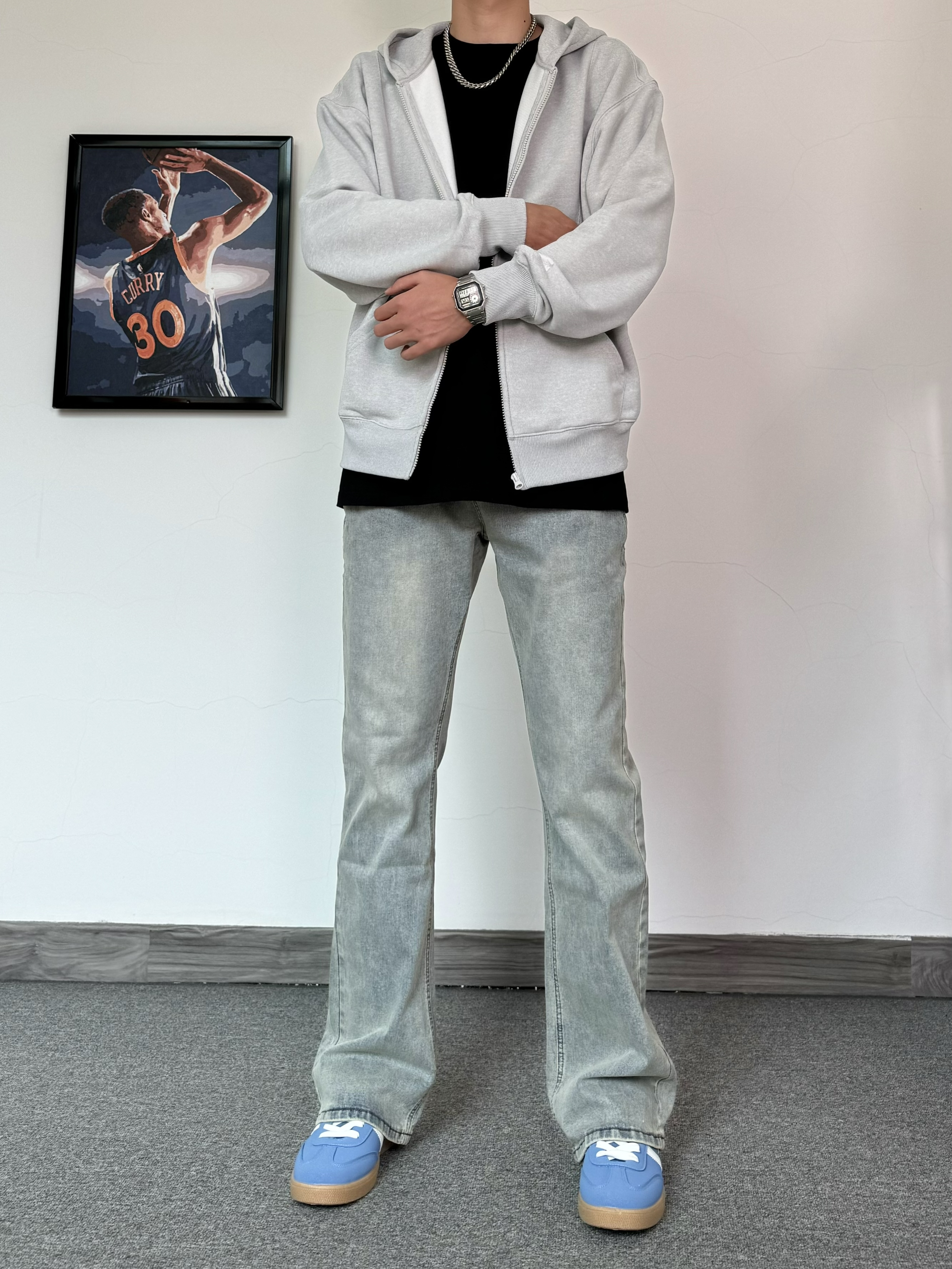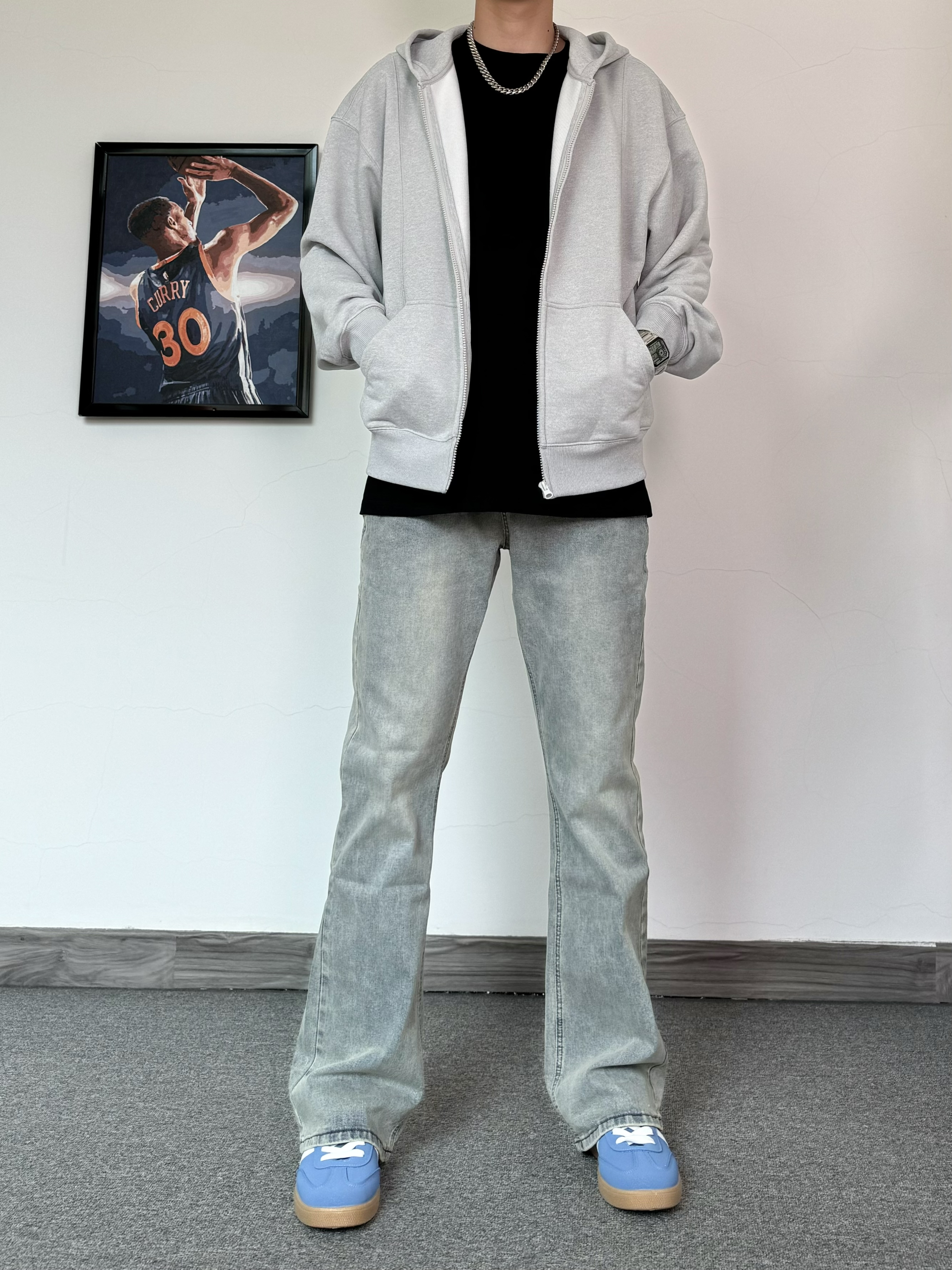 直接5G入春啦~ 穿上一件灰色连帽开衫 简约版型就是耐看! 搭配浅蓝色牛仔裤 修身款嘎嘎显瘦✨ 脚踩蓝色街头板鞋✔️ 潮流感拉满
