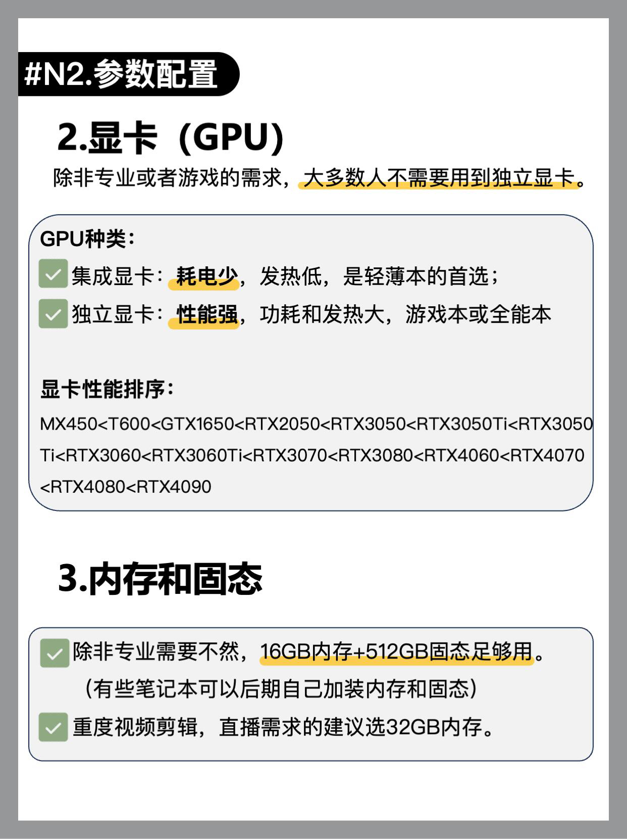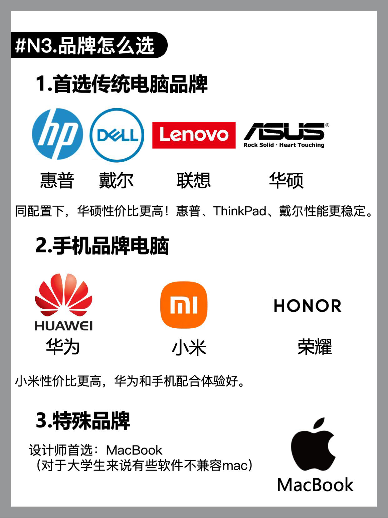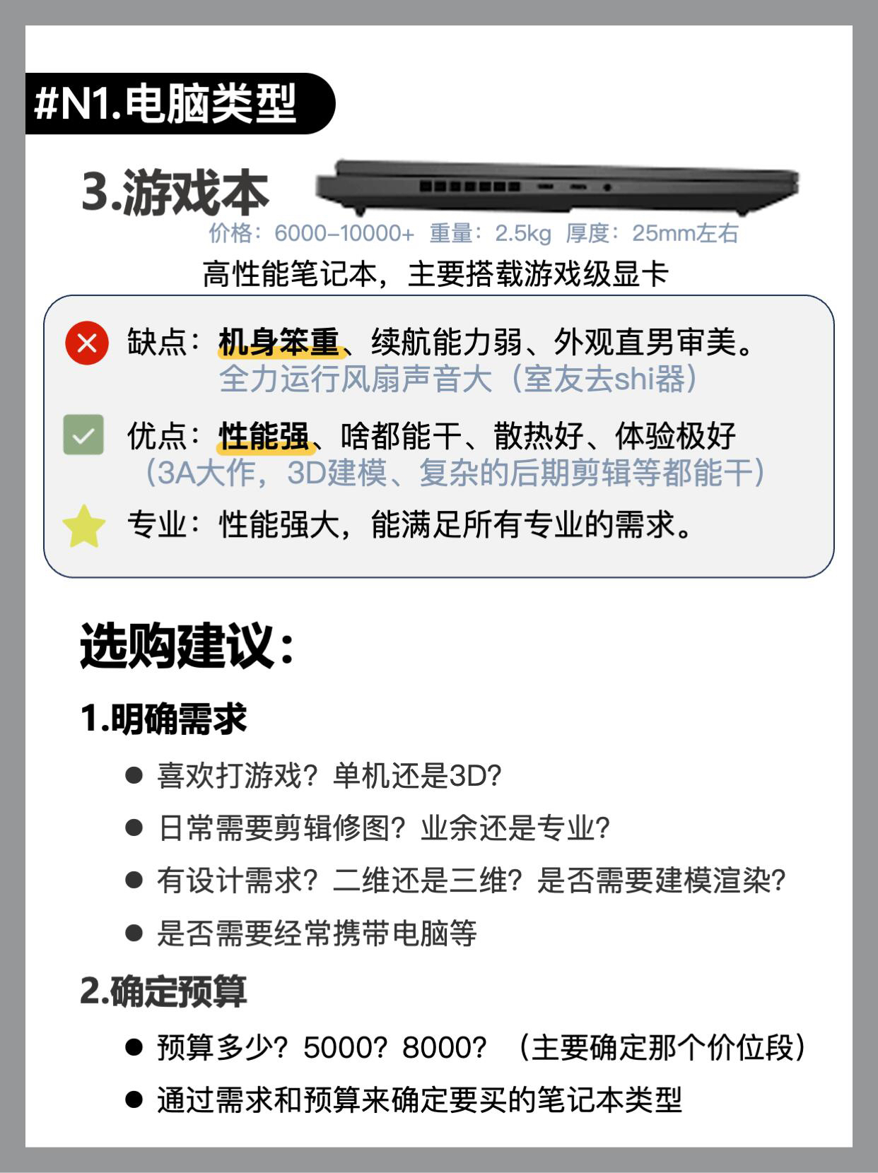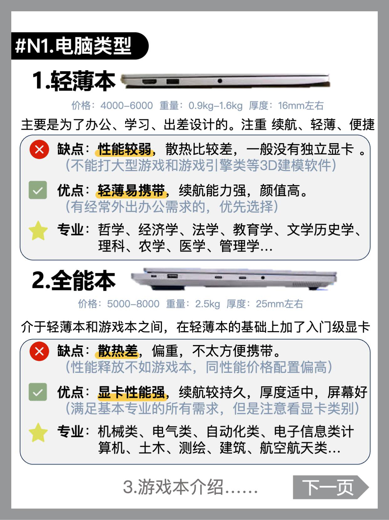 带你玩机不踩坑❗️ -新手该怎么选电脑,才能有效避坑? 看完这期笔记本选购指南你也可以选对电脑!买对不买贵 1️⃣笔记本类型及选购意见(图2-3) 轻薄本,全能本,游戏本,明确需求,确定预算 2️⃣笔记本参数怎么看(图4-7) CPU GPU 内存固态 显示屏等等… 3️⃣笔记本电脑品牌怎么选(图8) 4️⃣怎么选购电脑(怎么才能买到最优价)图9 5️⃣到手后验机指南(图10) 6️⃣不同价位...