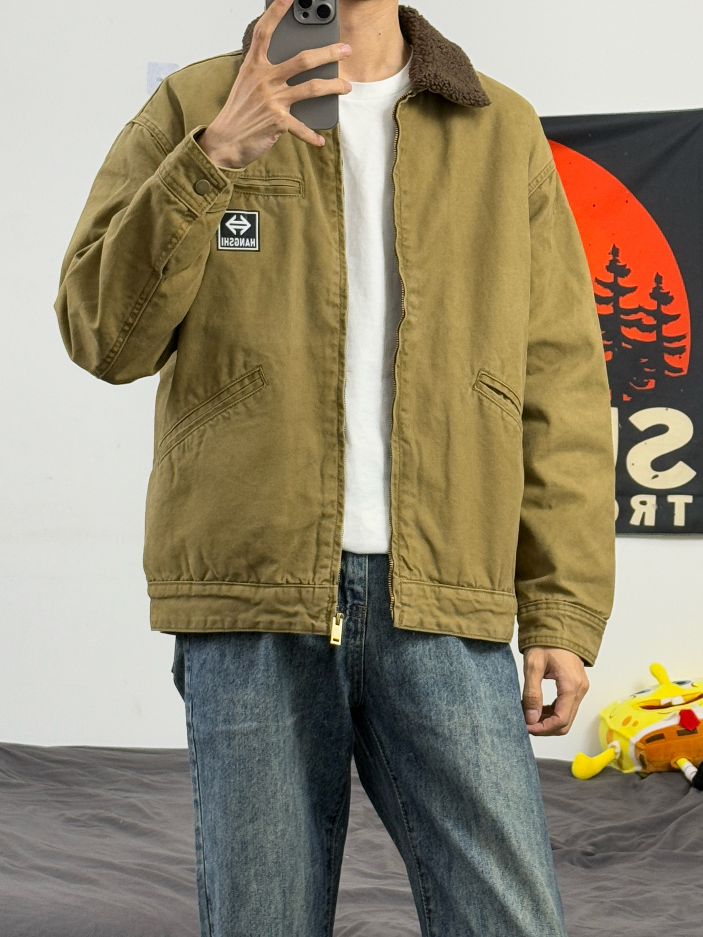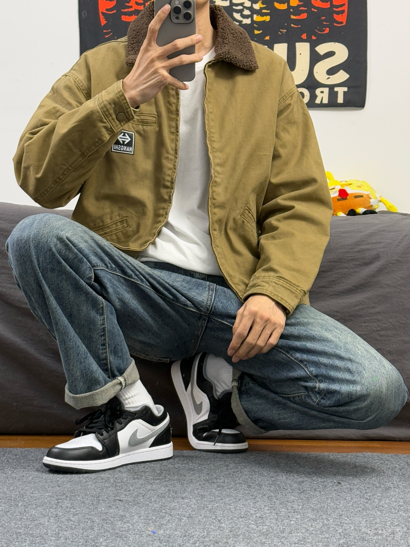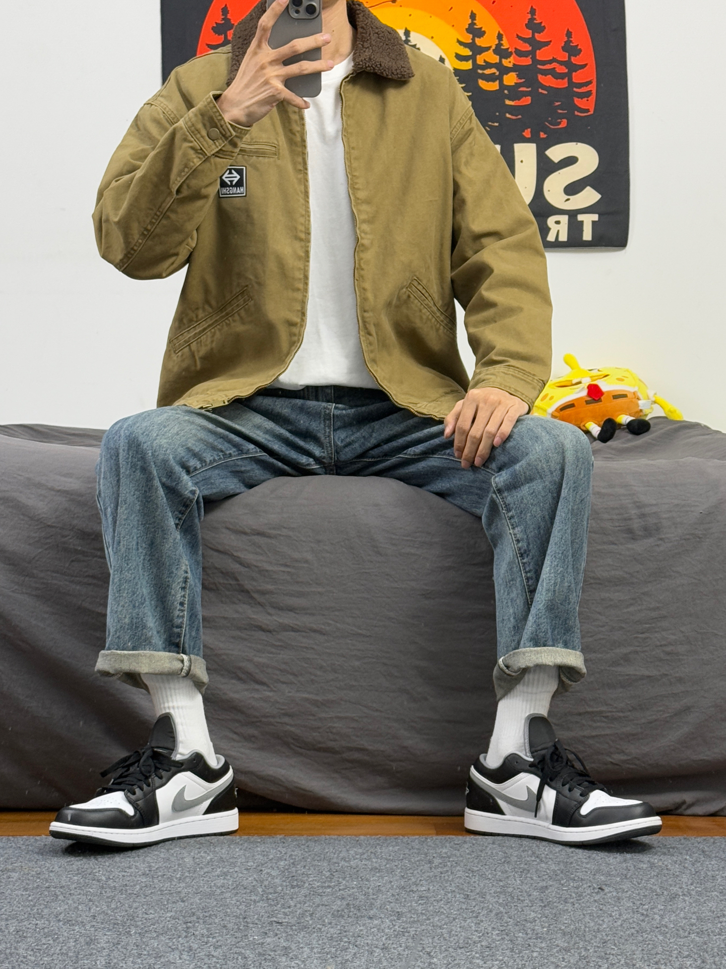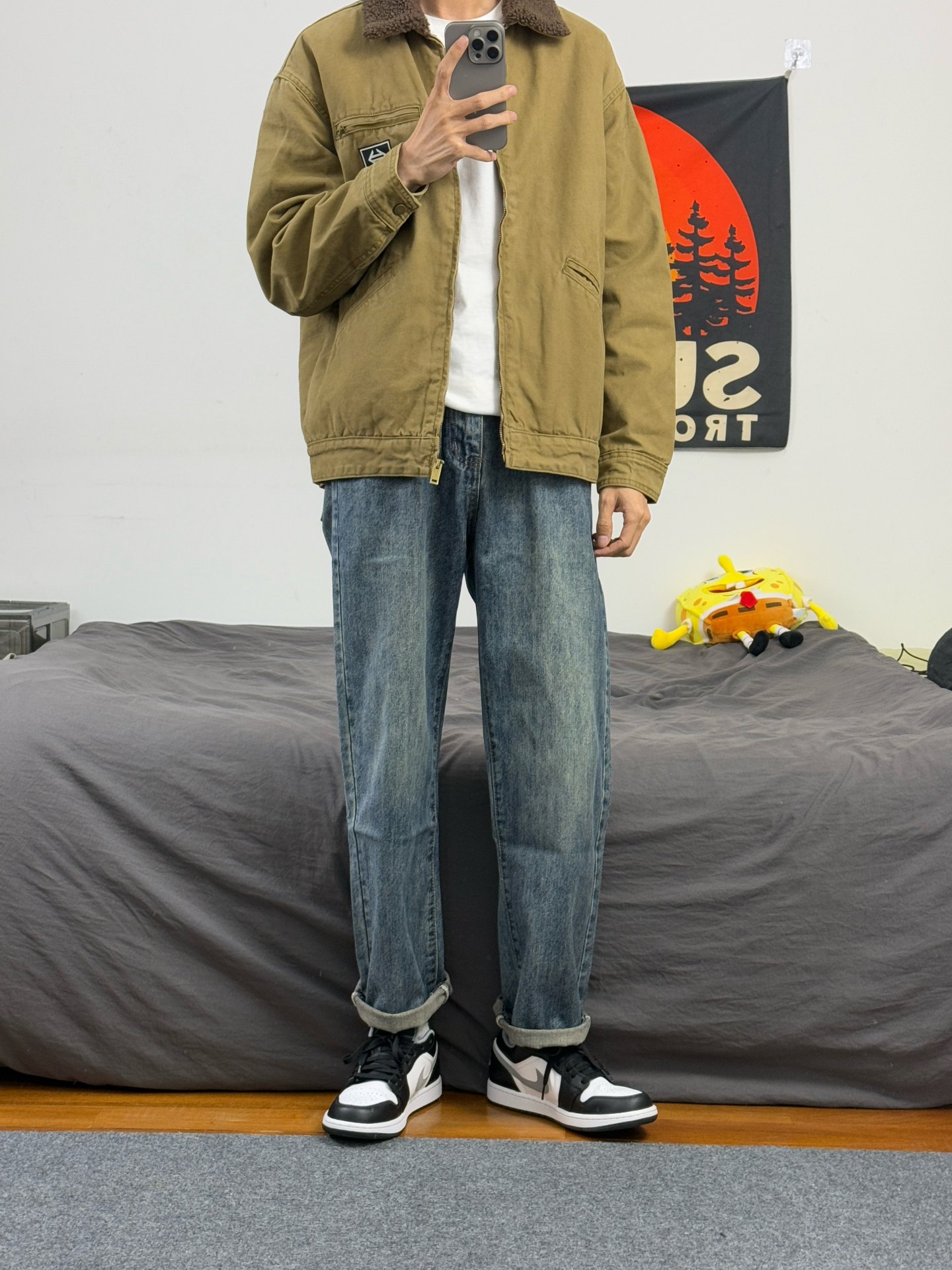 身高174体重48kg 今日上身 工装夹克+牛仔裤+aj1影子灰 👔 #HARSIINCN杭仕 家的工装夹克 美式复古风格 内里做了加厚处理 上身抗风抗冻 版型比较板正 短款的设计 上身特别能显示身材比例 瘦小个子 也能穿出硬汉风[机智_blue] 👖搭配这种直筒牛仔 整体下来显得身材比例一绝 视觉效果直接达到180 👟是aj1影子灰 怎么搭都不易过时 #男生冬季穿搭OOTD #顶男约会穿搭 ...
